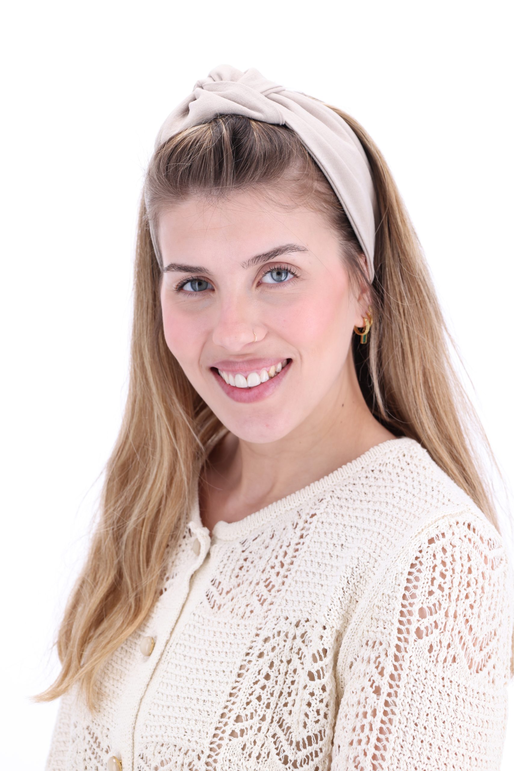 סרט לשיער עם חוט ברזל תפור בפנים ליצירת קשירות מגוונות ופשוטות, מבד כותנה איכותי בצבע אבן