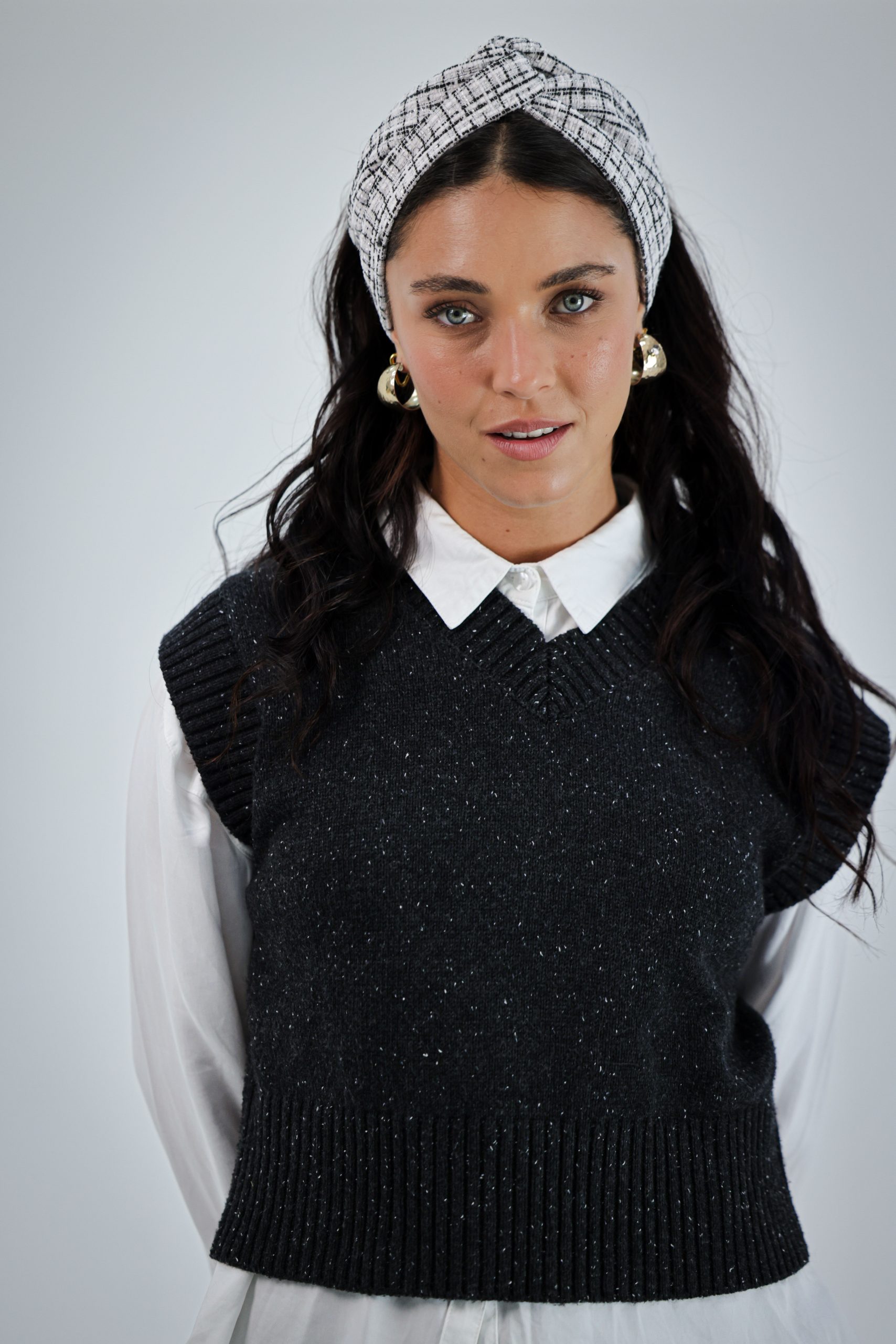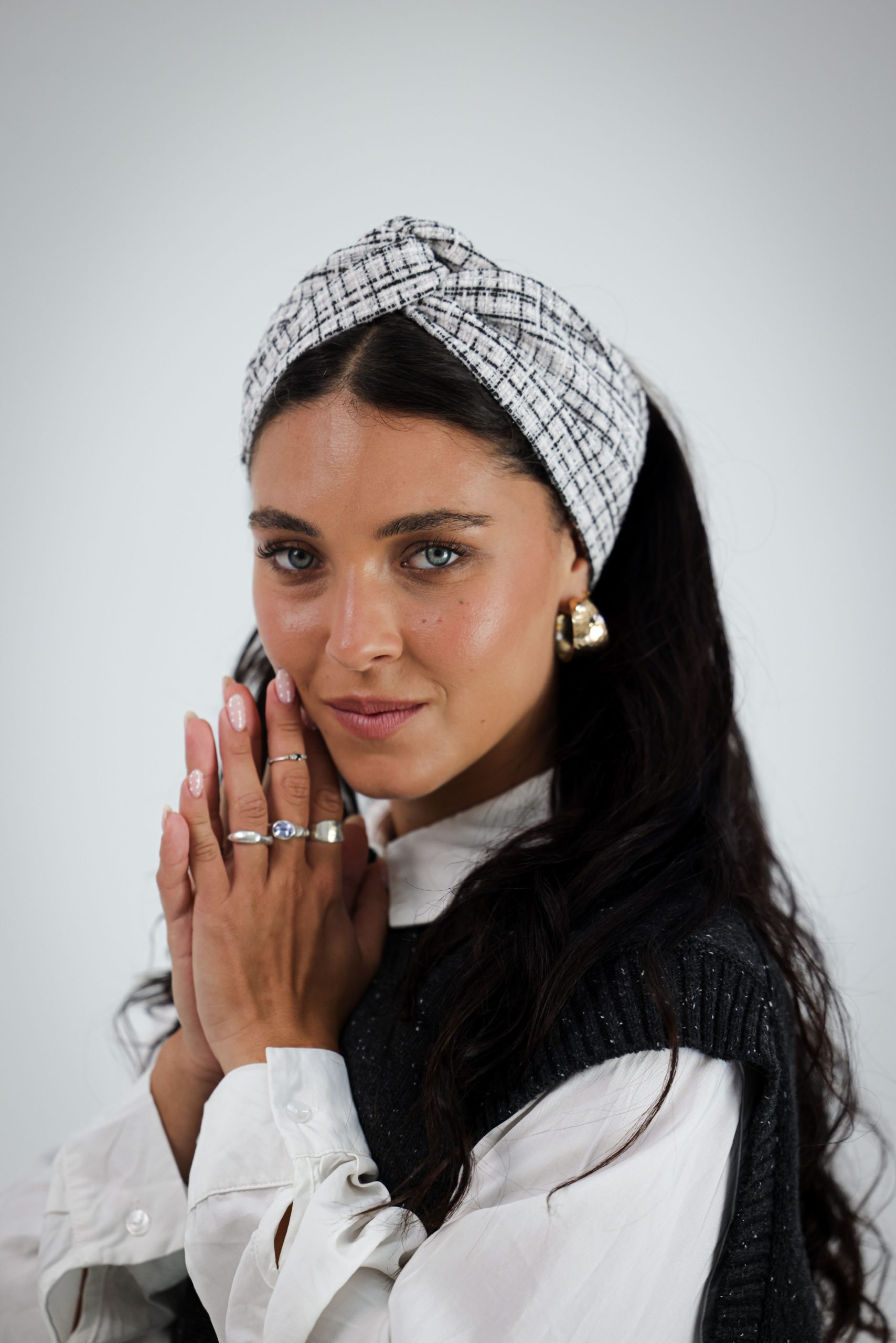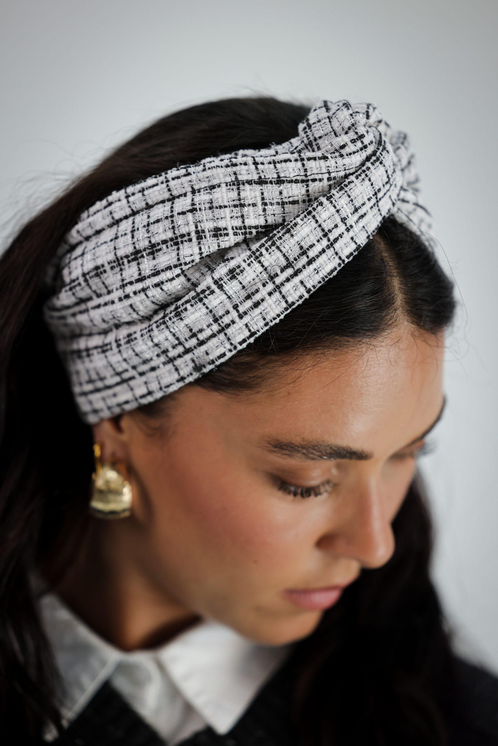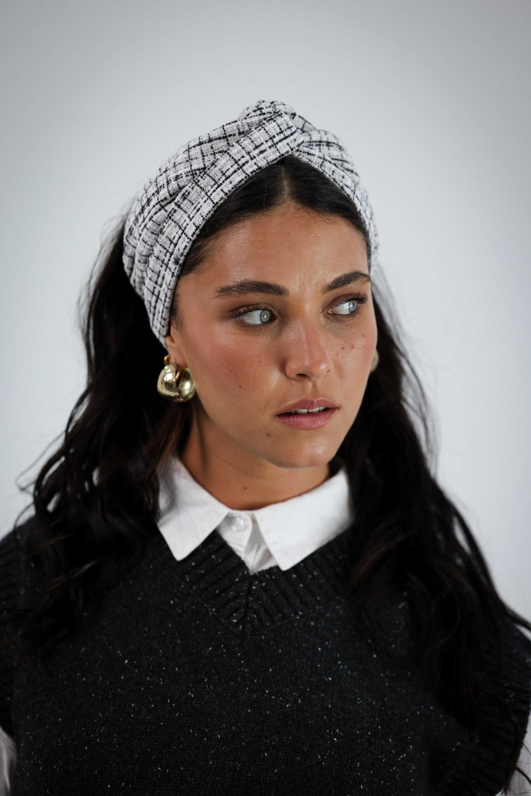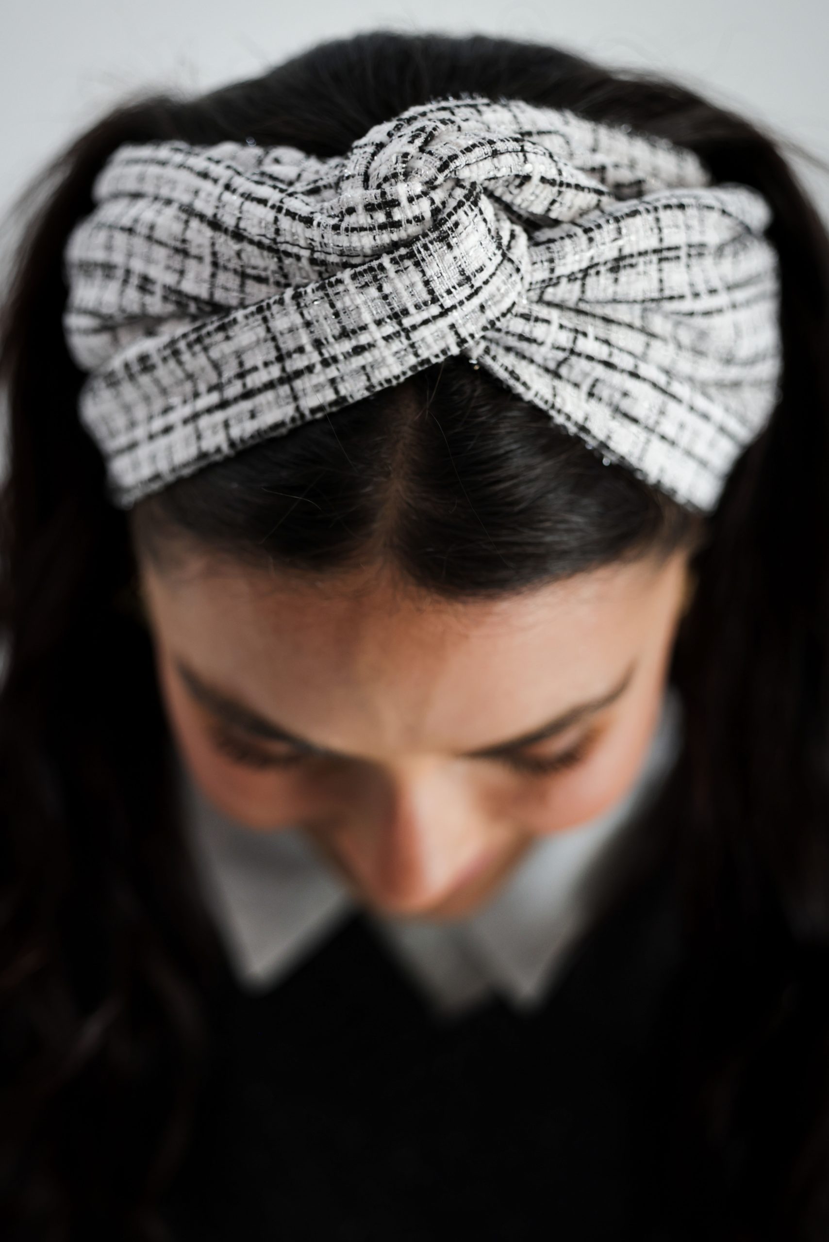 סרט לשיער עם חוט ברזל תפור בפנים ליצירת קשירות מגוונות ופשוטות, בד באריגת שתי ועבר בגווני שחור לבן מנצנץ.