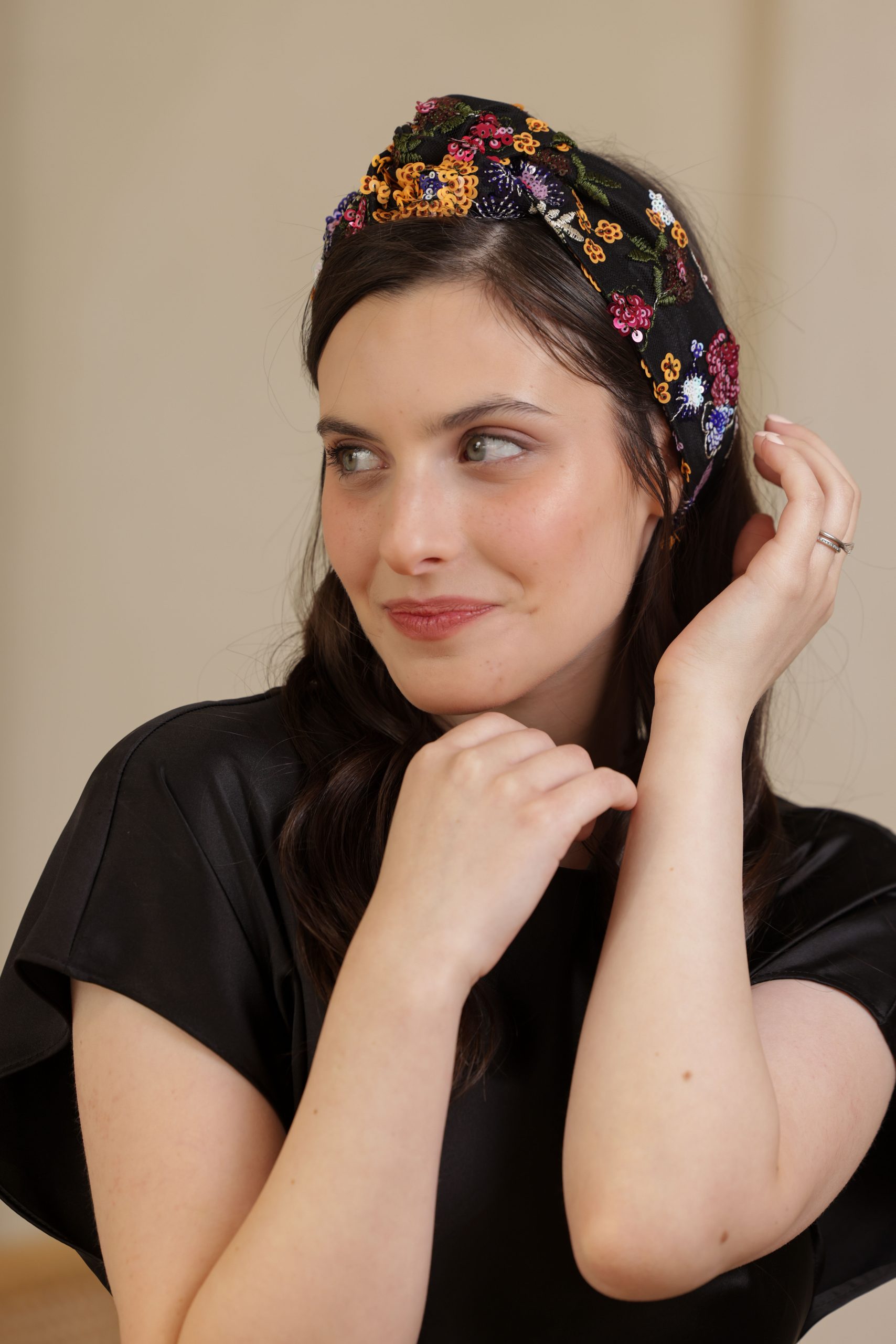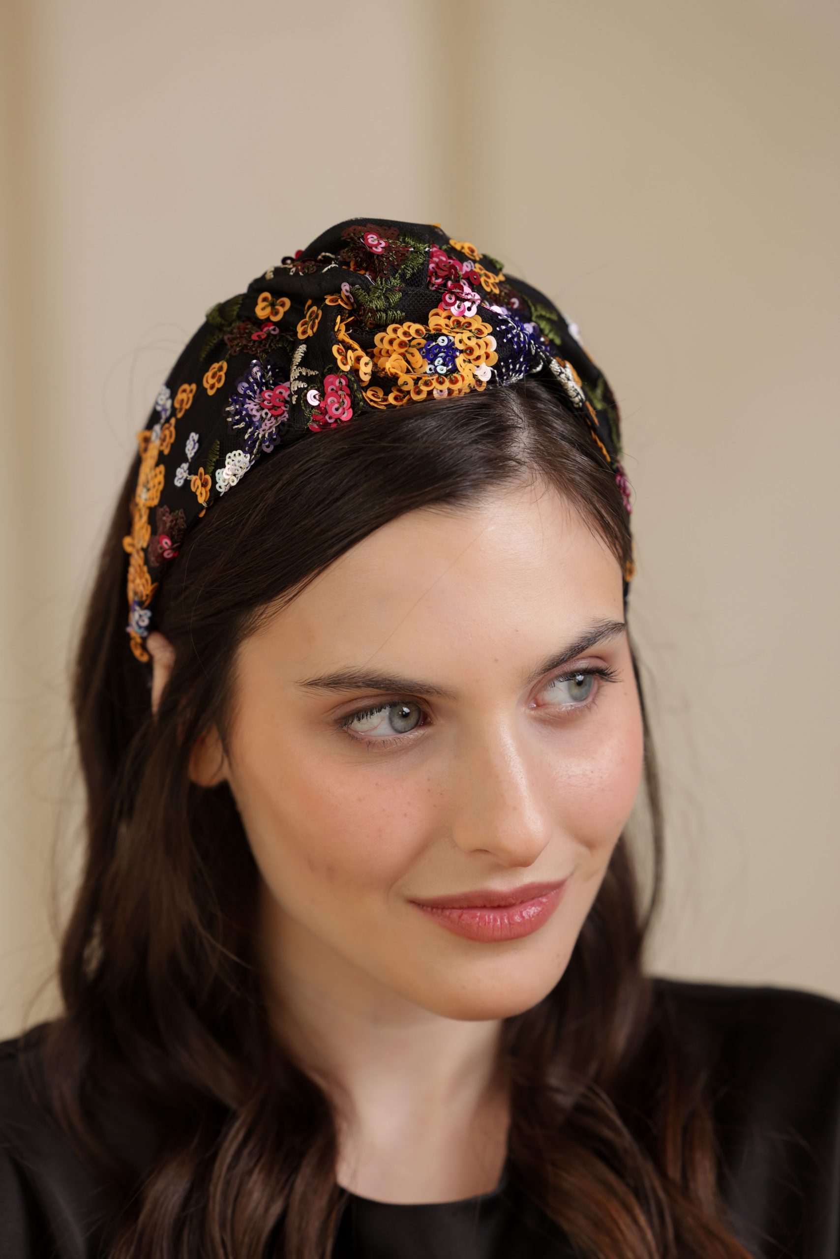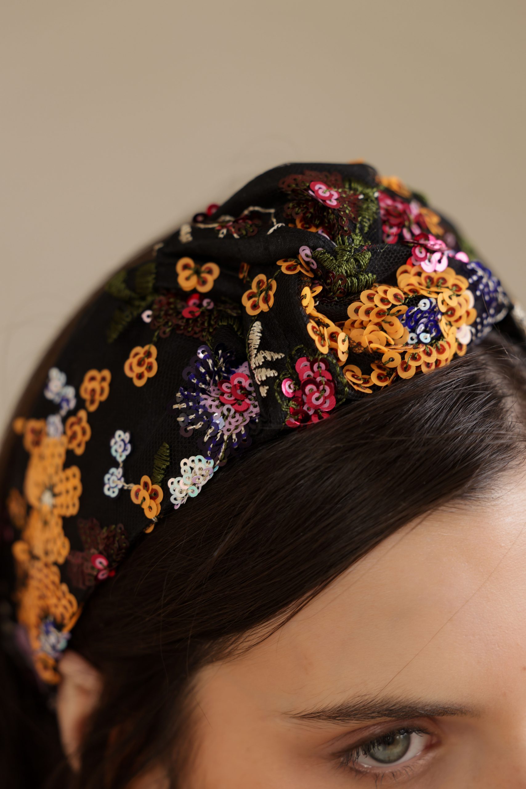 סרט לשיער עם חוט ברזל תפור בפנים עם שתי חוטי גומי בקצה לקשירה קלה, מבד טול ברקמת פייטים חגיגית בטקסטורה פרחונית בגווני כתום, אדום, שמנת, סגול ועוד