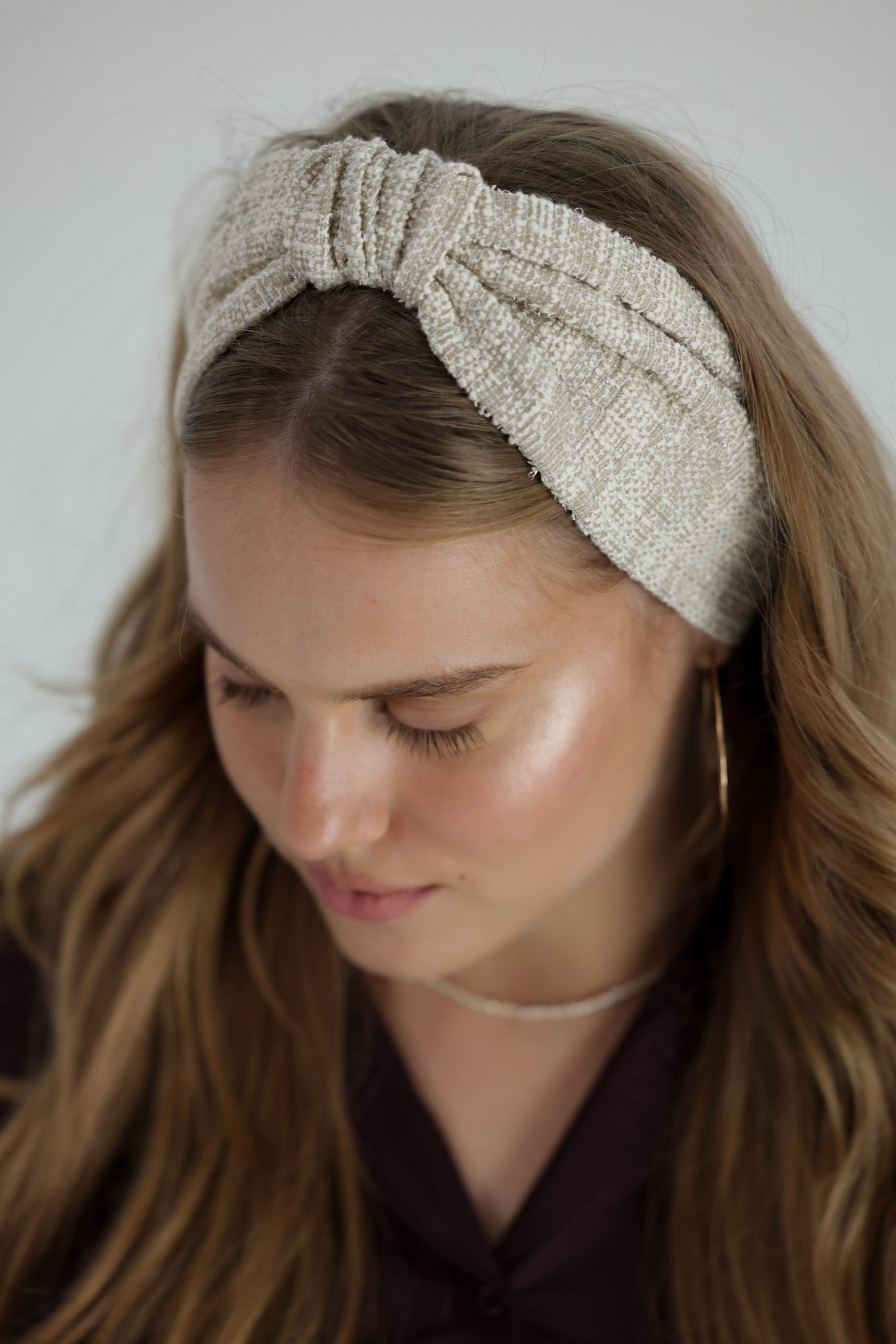 סרט לשיער עם חוט ברזל תפור בפנים ליצירת קשירות מגוונות ופשוטות, בד באריגת שתי ועבר בגווני בז' לבן.