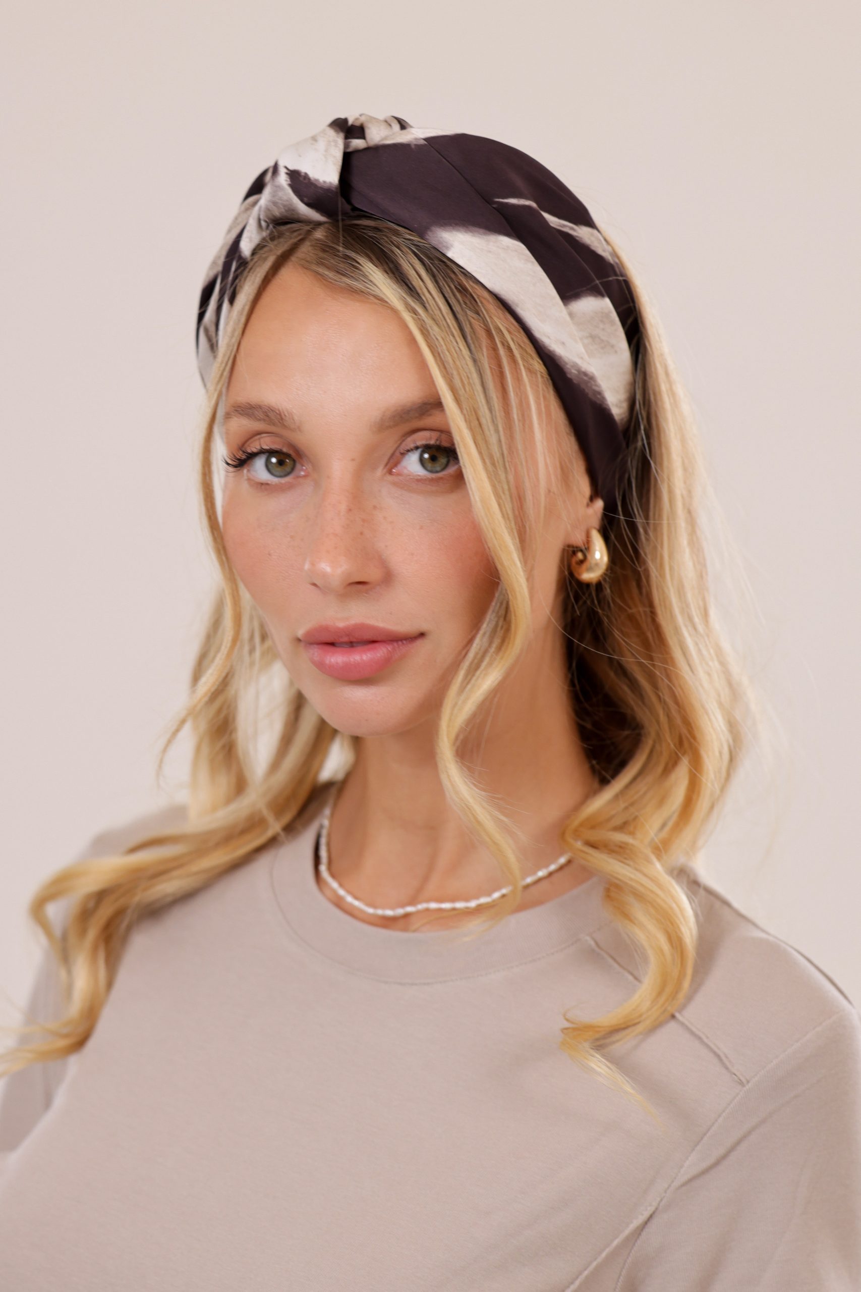 סרט לשיער עם חוט ברזל תפור בפנים ליצירת קשירות מגוונות ופשוטות, מבד סאטן בהדפס מהמם בגווני חום ושמנת.