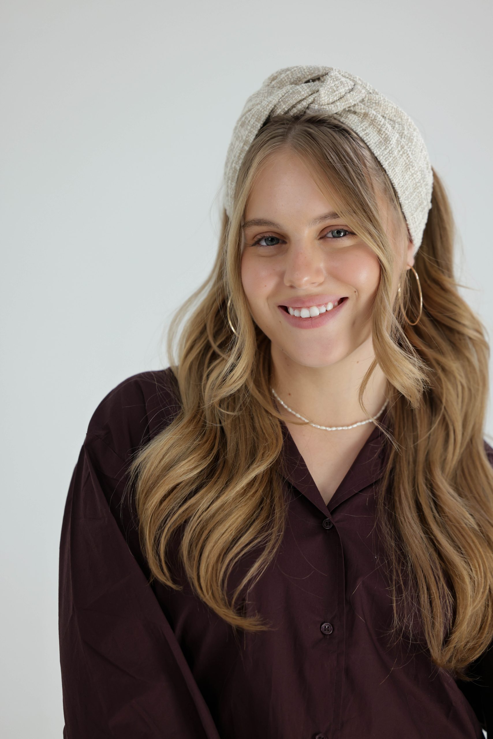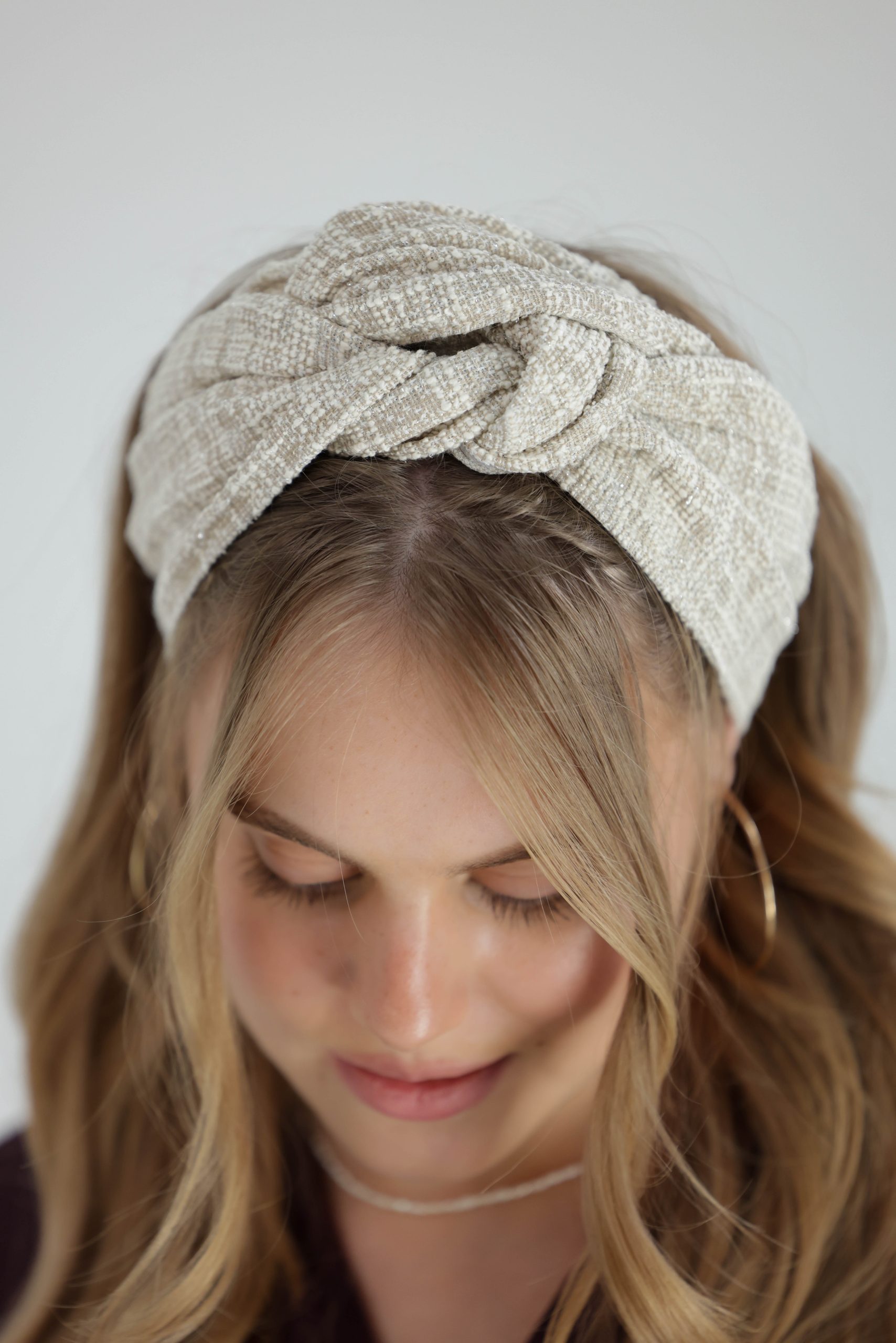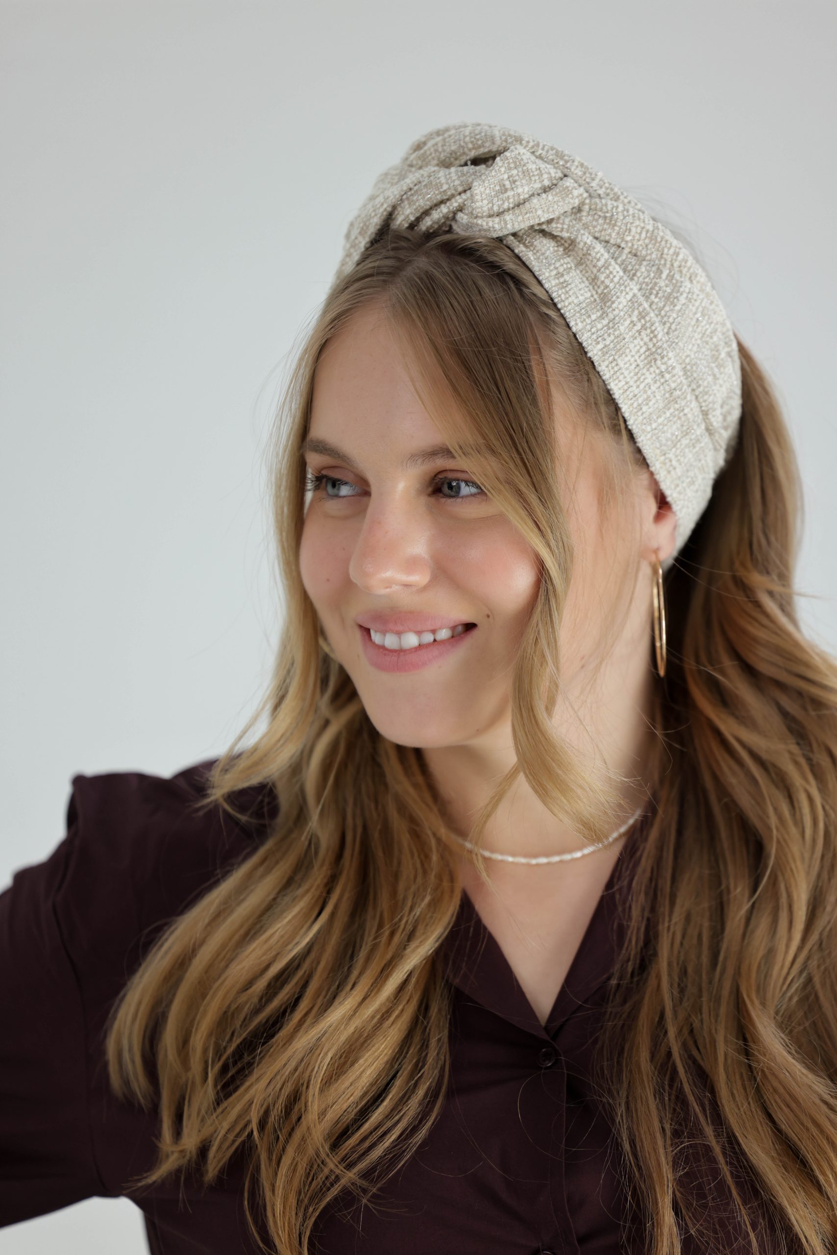 סרט לשיער עם חוט ברזל תפור בפנים ליצירת קשירות מגוונות ופשוטות, בד באריגת שתי ועבר בגווני בז' לבן.