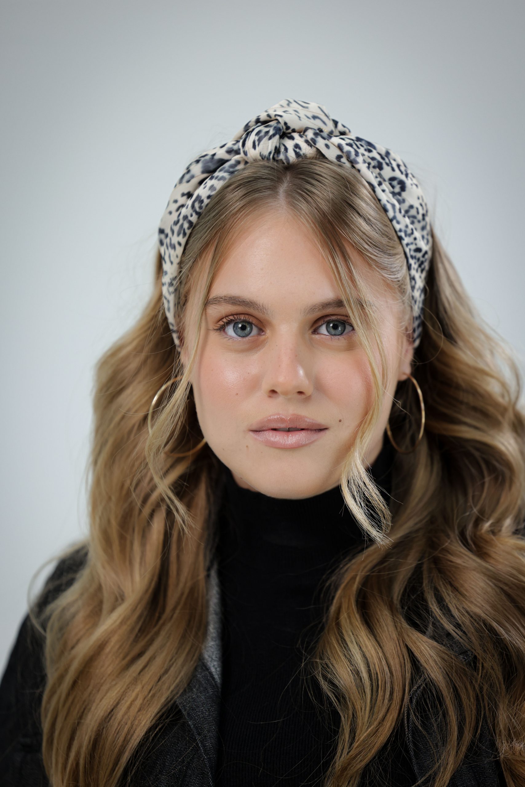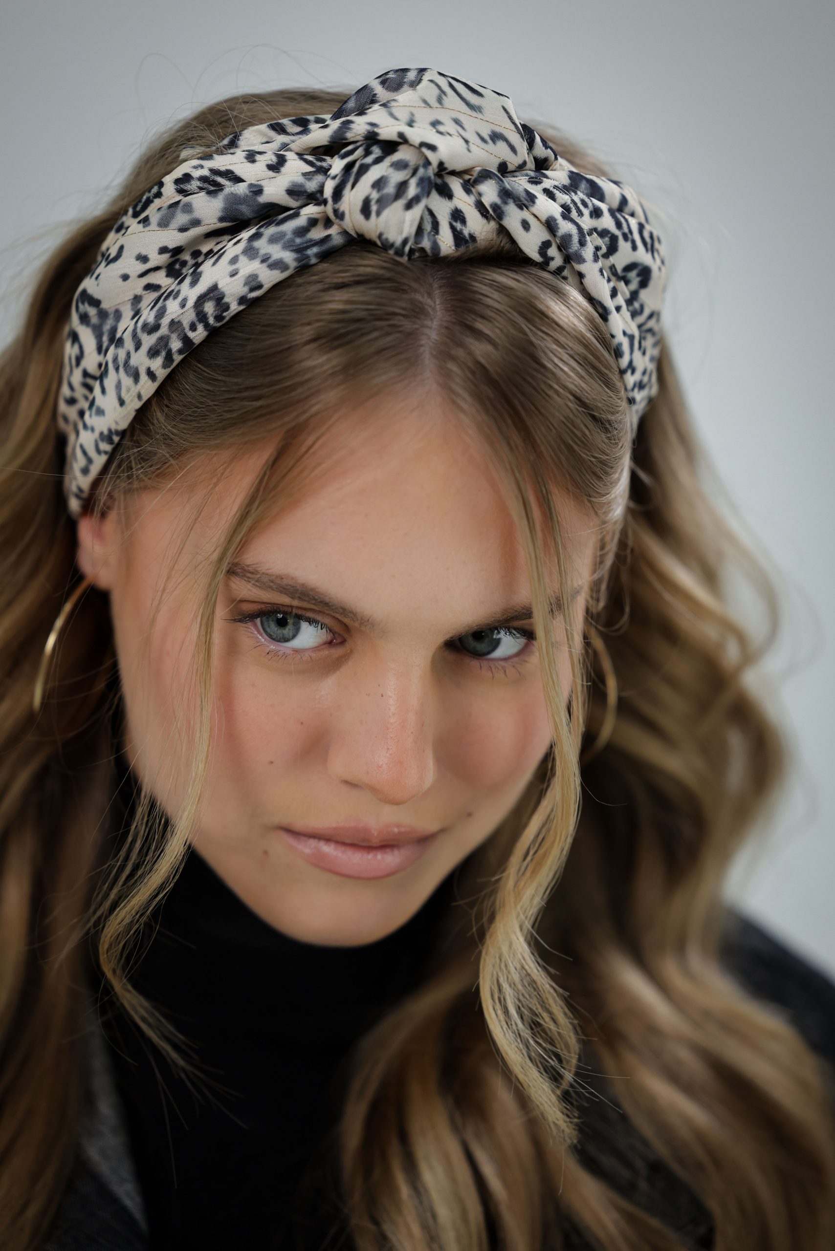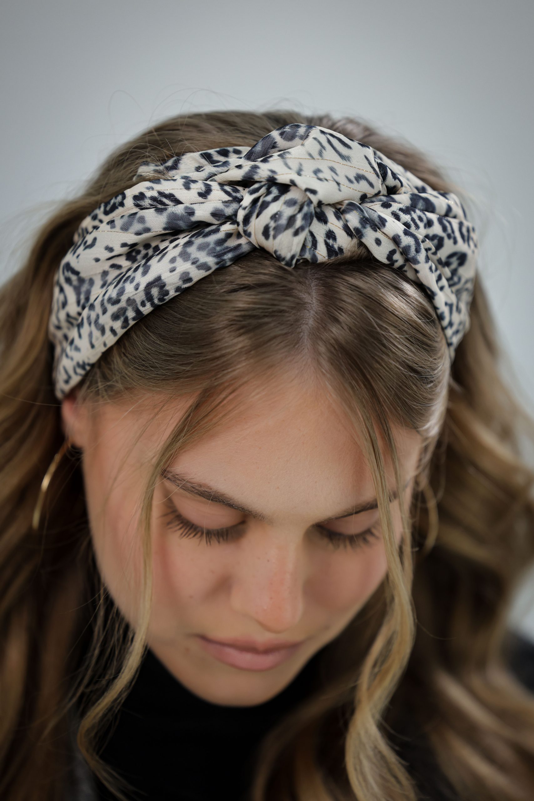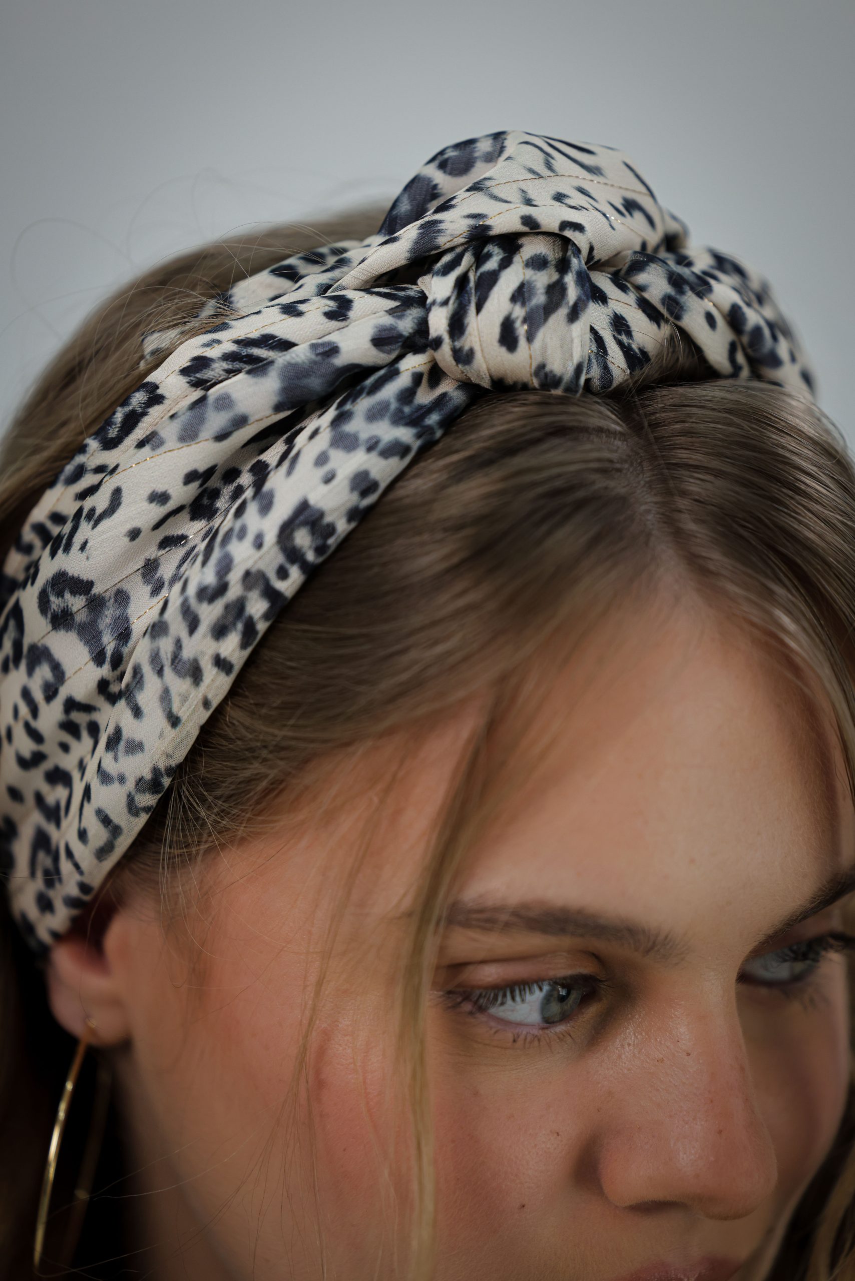 סרט לשיער עם חוט ברזל תפור בפנים ליצירת קשירות מגוונות ופשוטות, מבד שיפון שזור חוטי זהב בהדפס מנומר בגווני שמנת שחור ואפור.