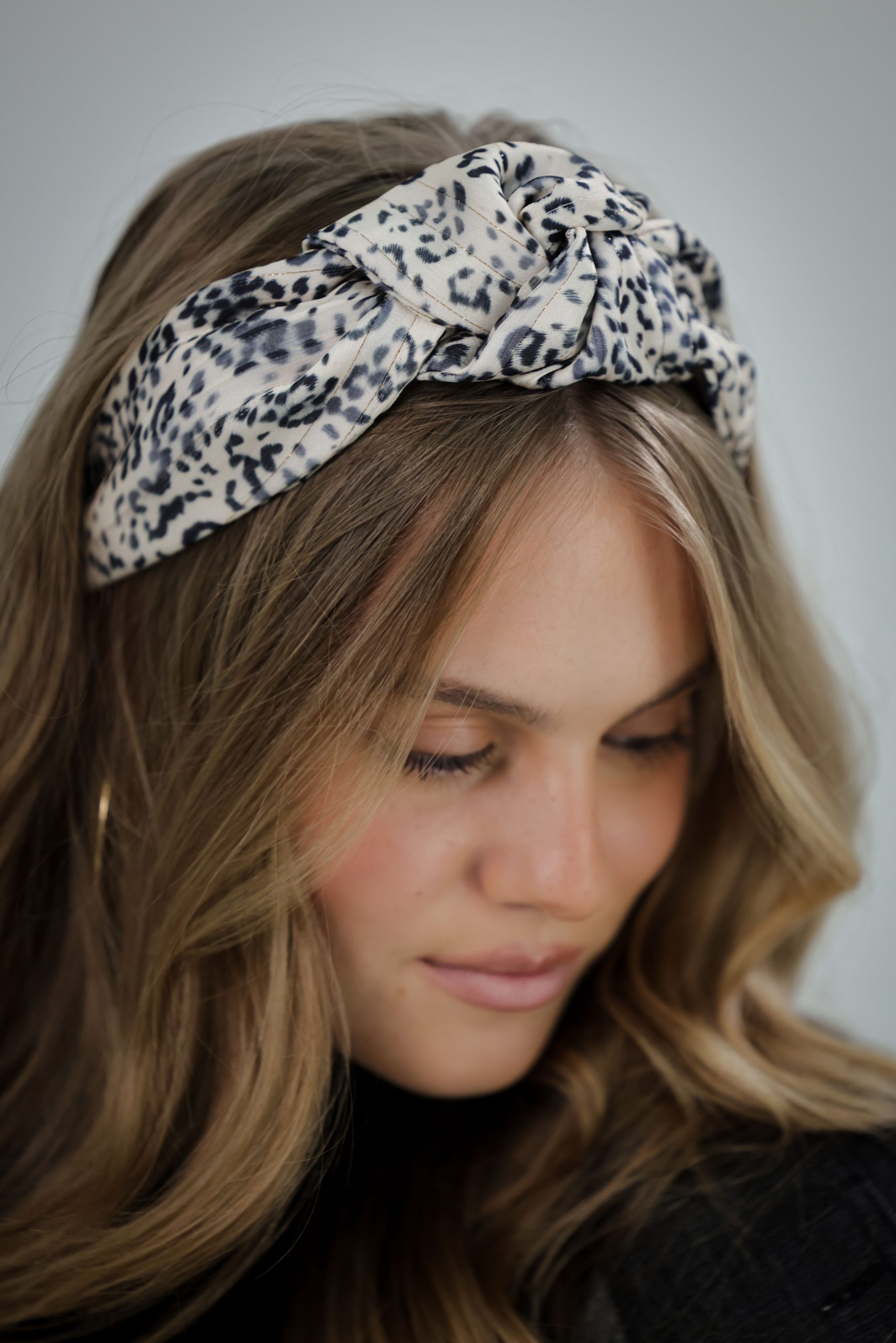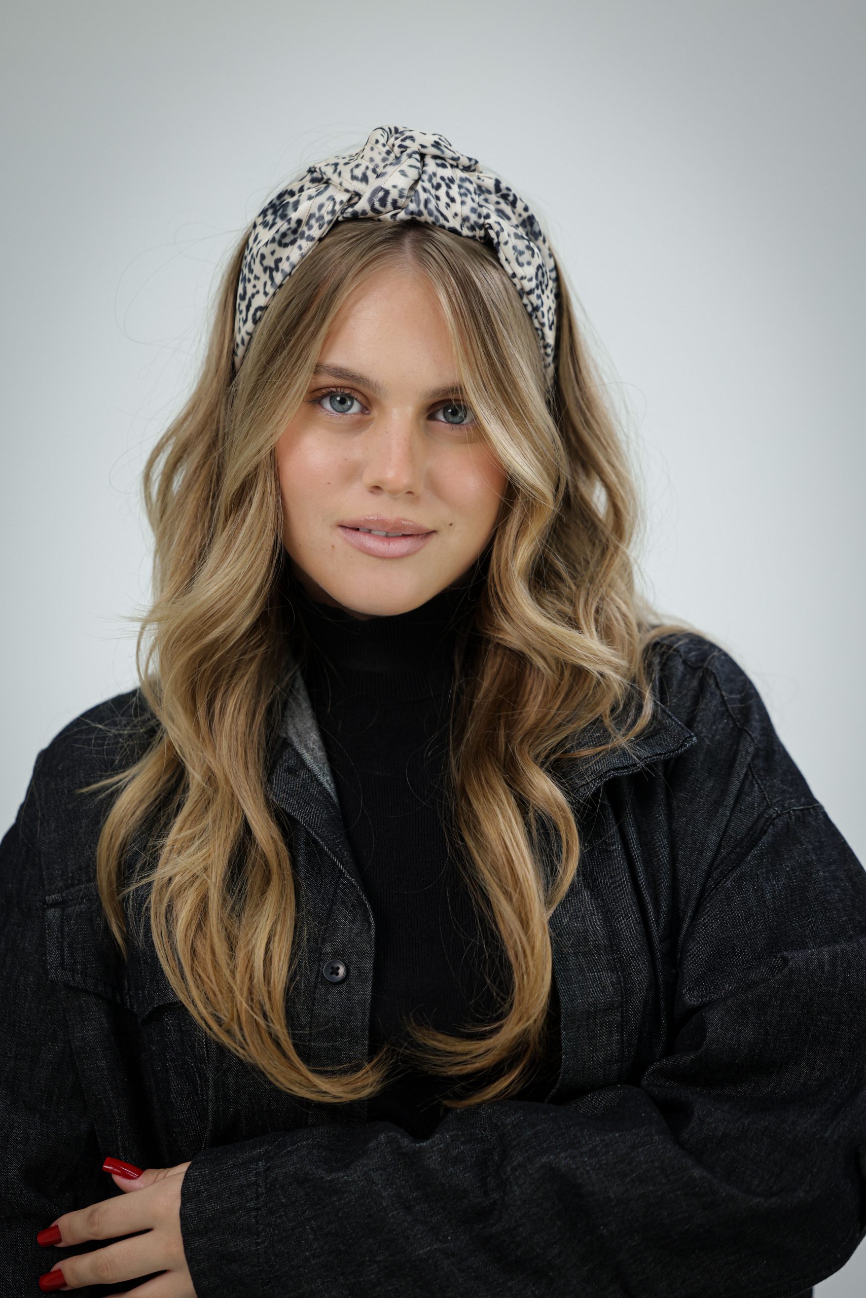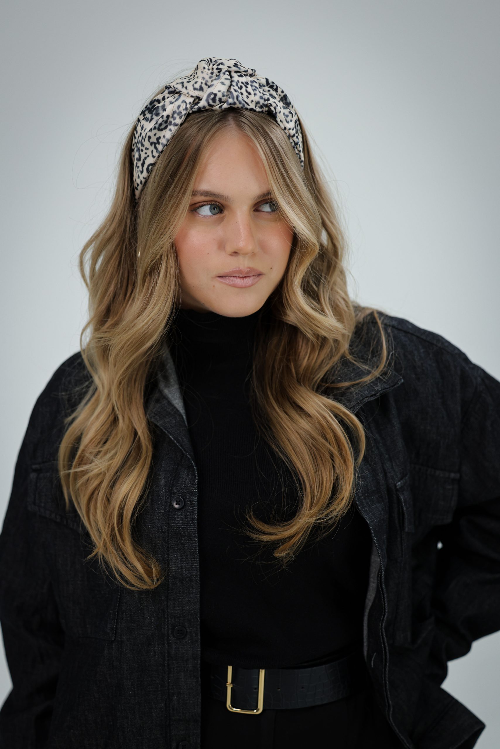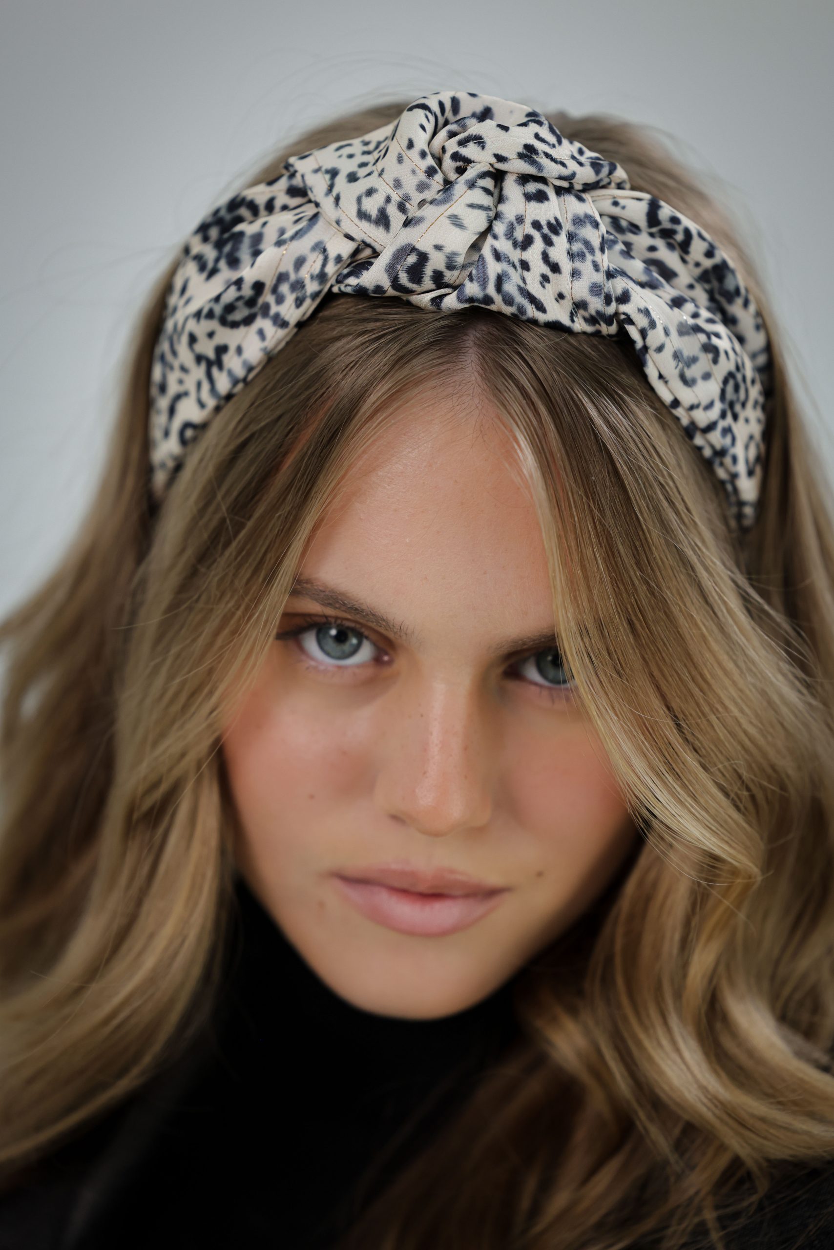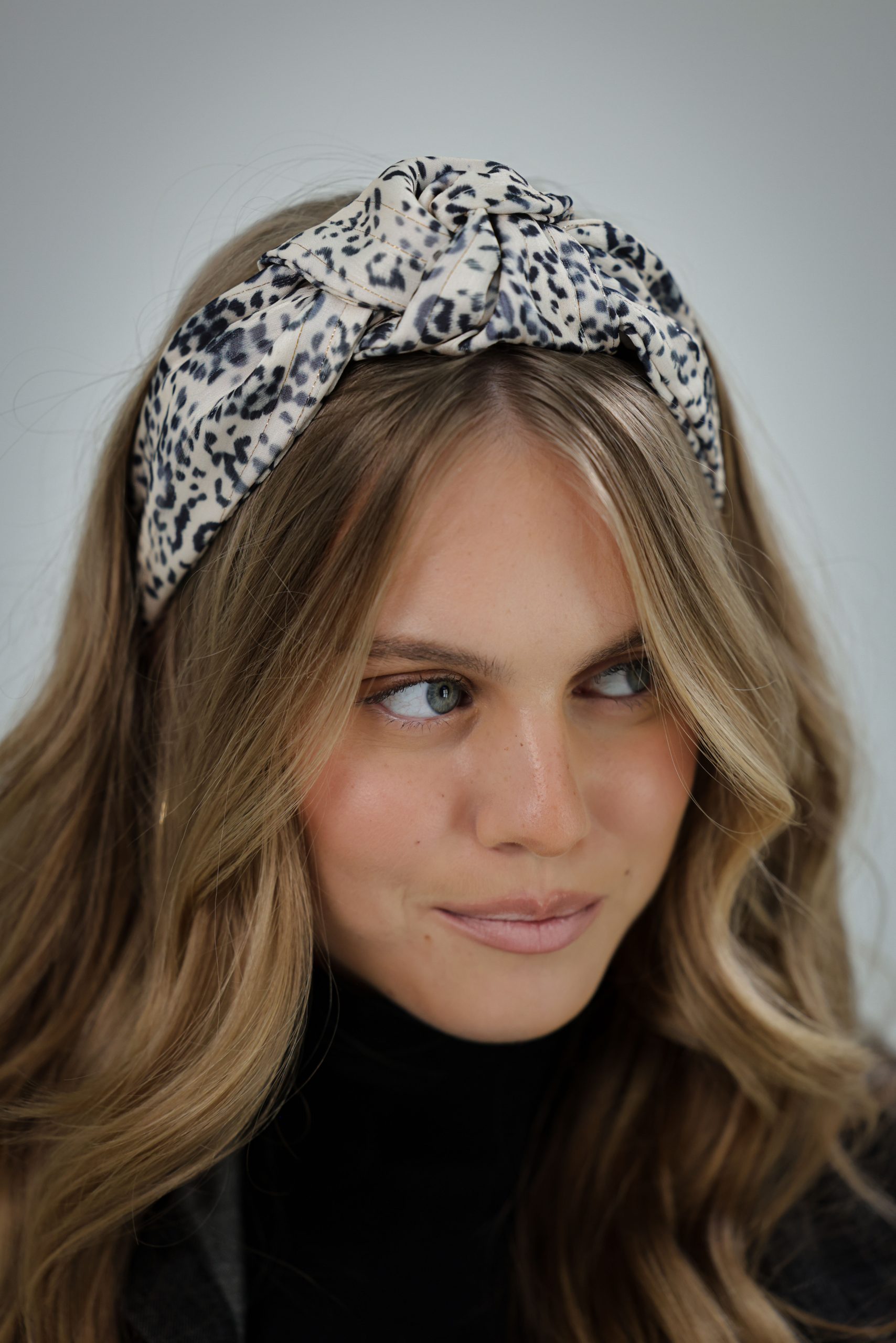 קשת לשיער עם חוט ברזל תפור בפנים ליצירת משחק עם הנפח והקשר שבמרכז הקשת. מבד שיפון שזור חוטי זהב בהדפס מנומר בגווני שמנת שחור ואפור.