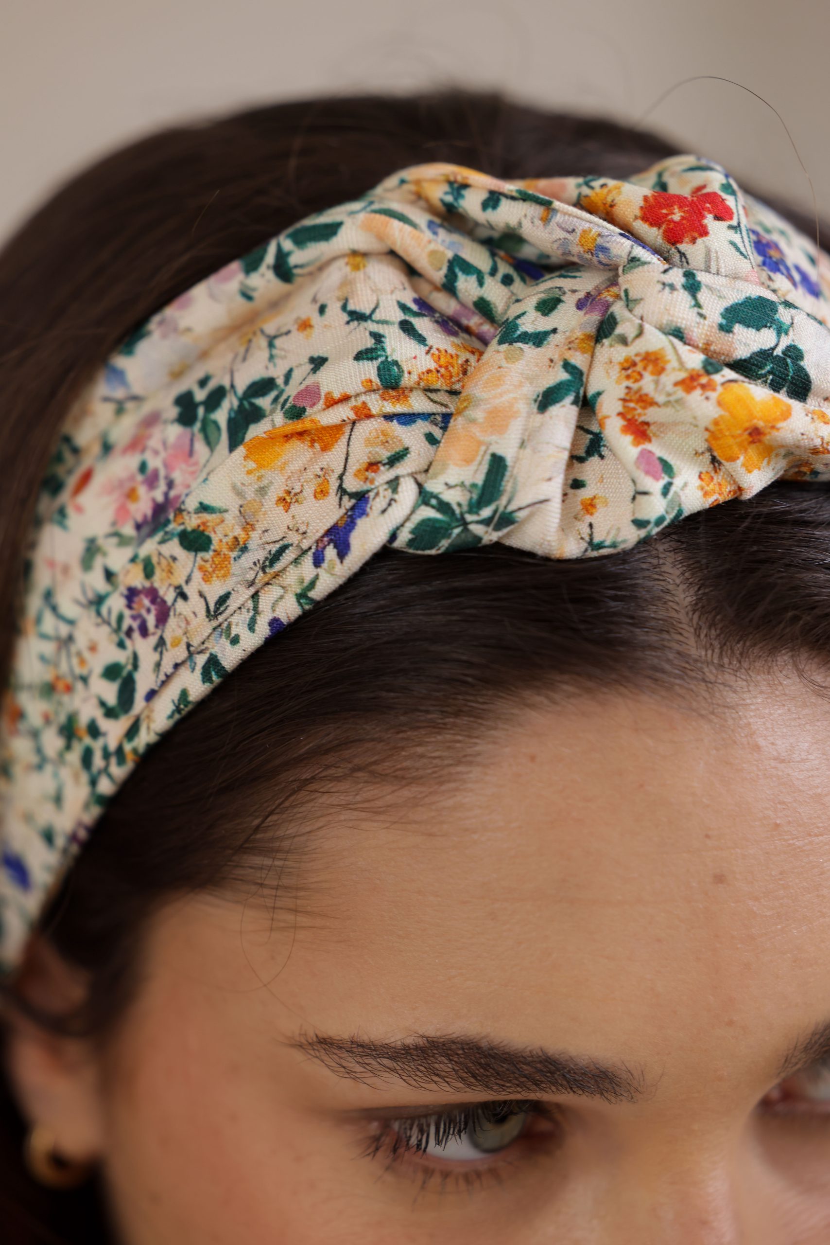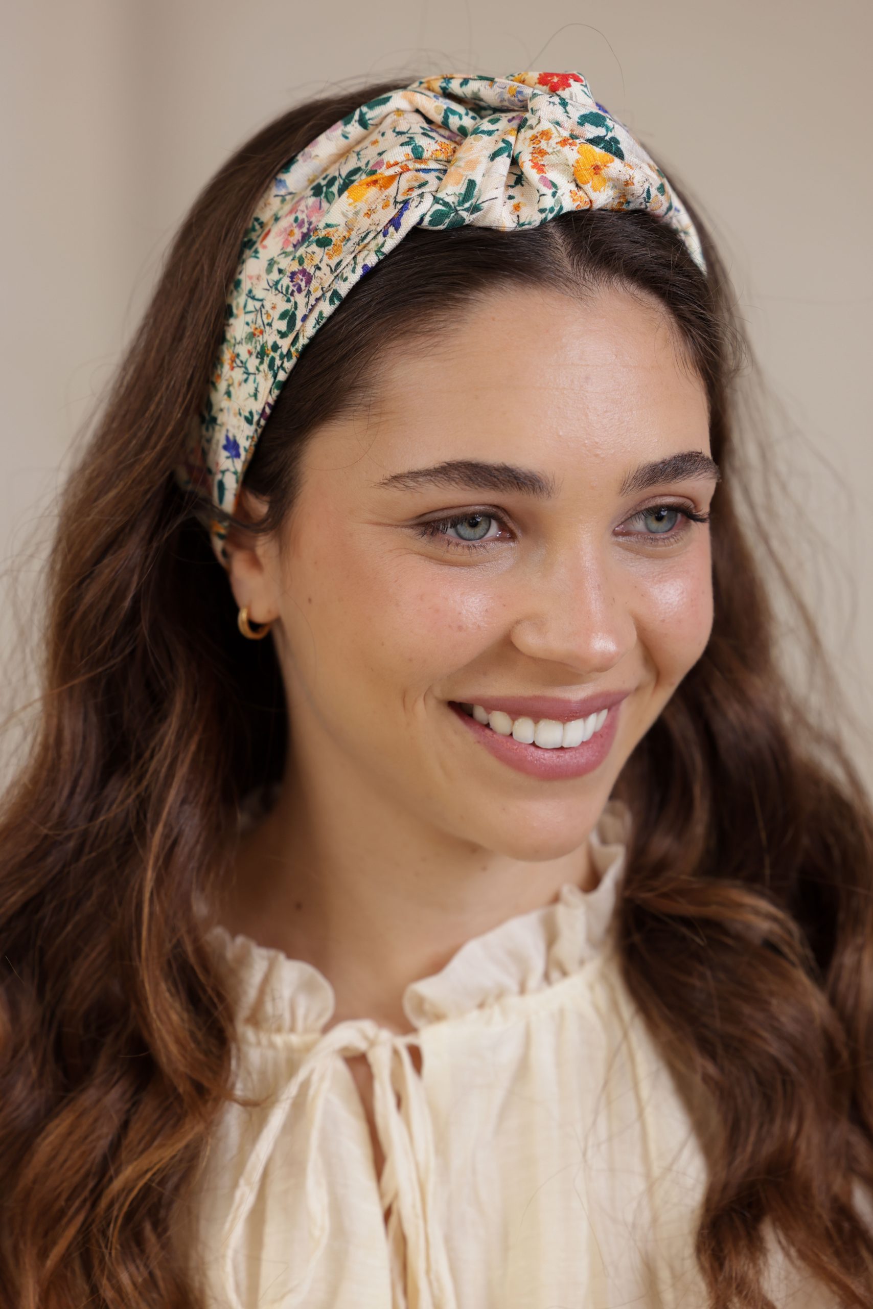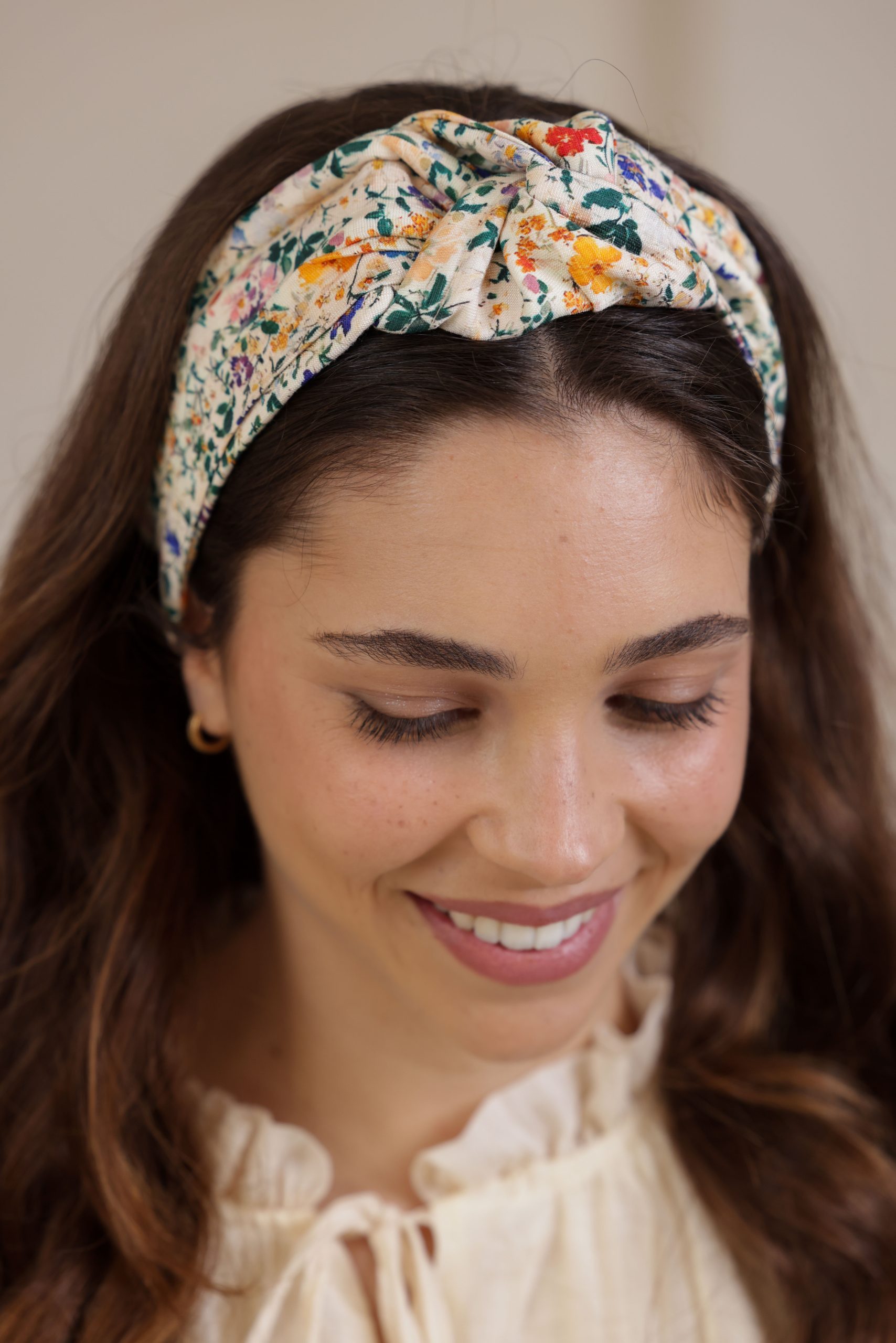 סרט לשיער עם חוט ברזל תפור בפנים עם שתי חוטי גומי בקצה לקשירה קלה, מבד כותנה איכותי עם הדפס פרחוני בשלל צבעים