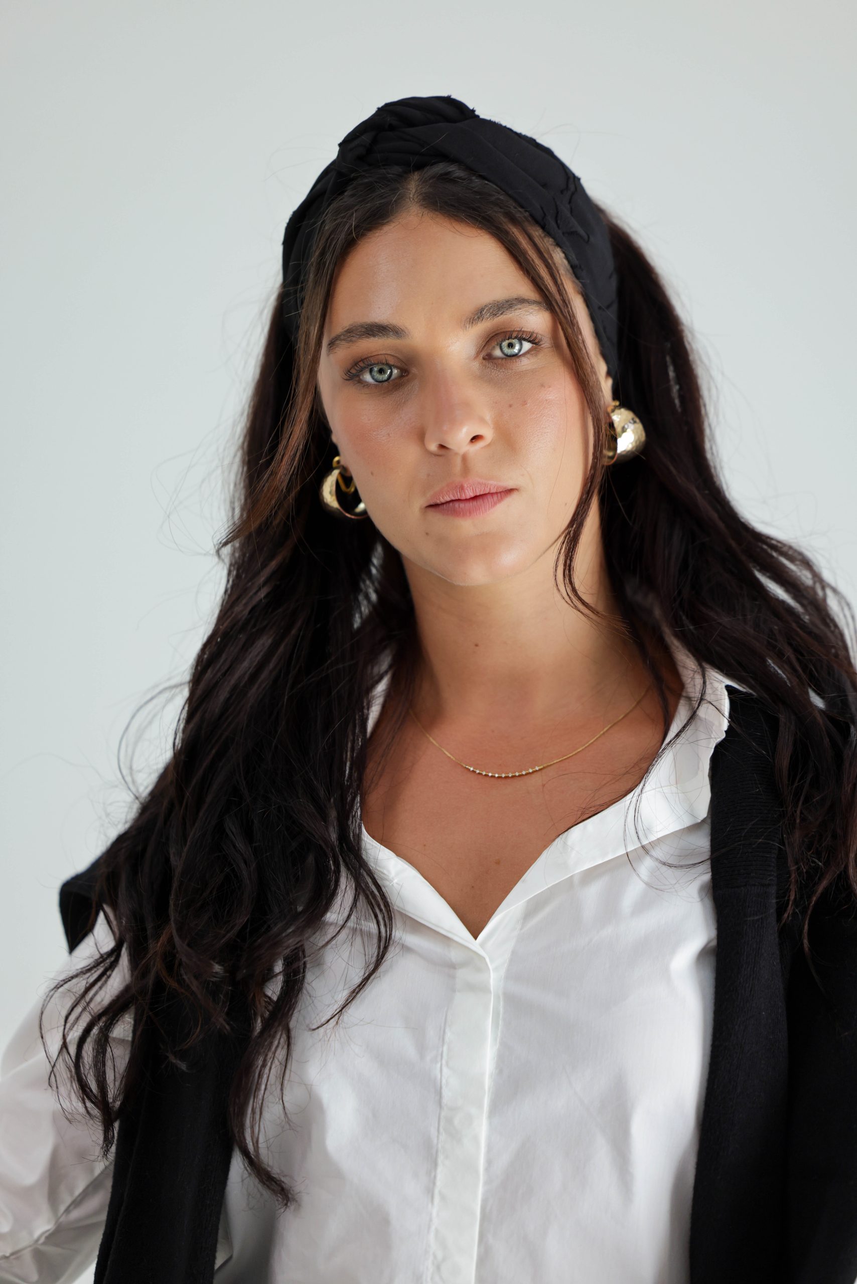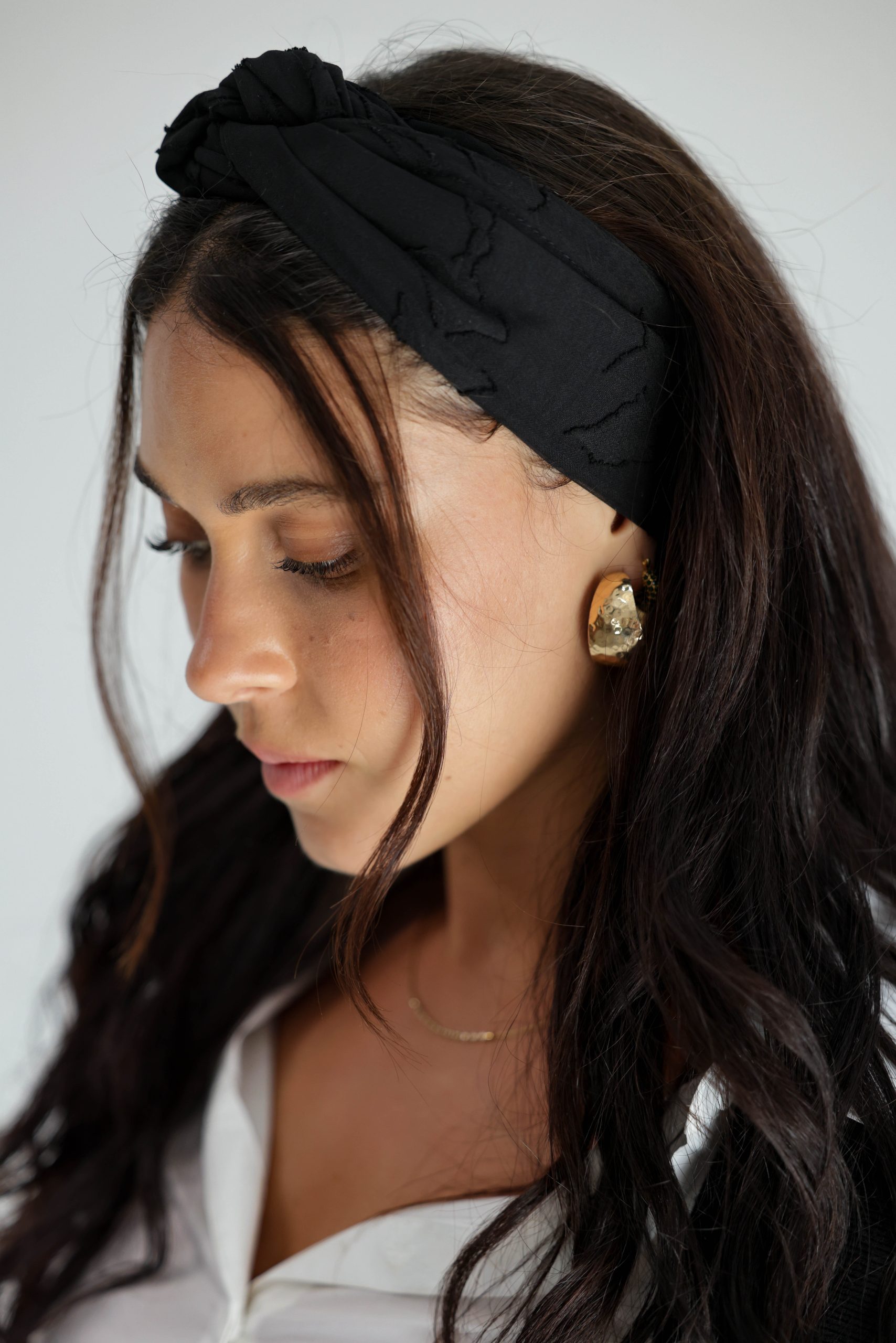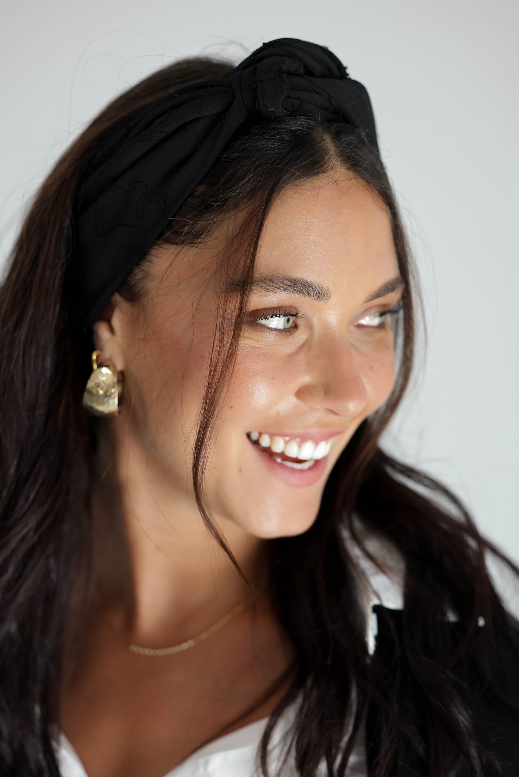 סרט לשיער עם חוט ברזל תפור בפנים ליצירת קשירות מגוונות ופשוטות, מבד שיפון בטקסטורת פרחים בצבע שחור.
