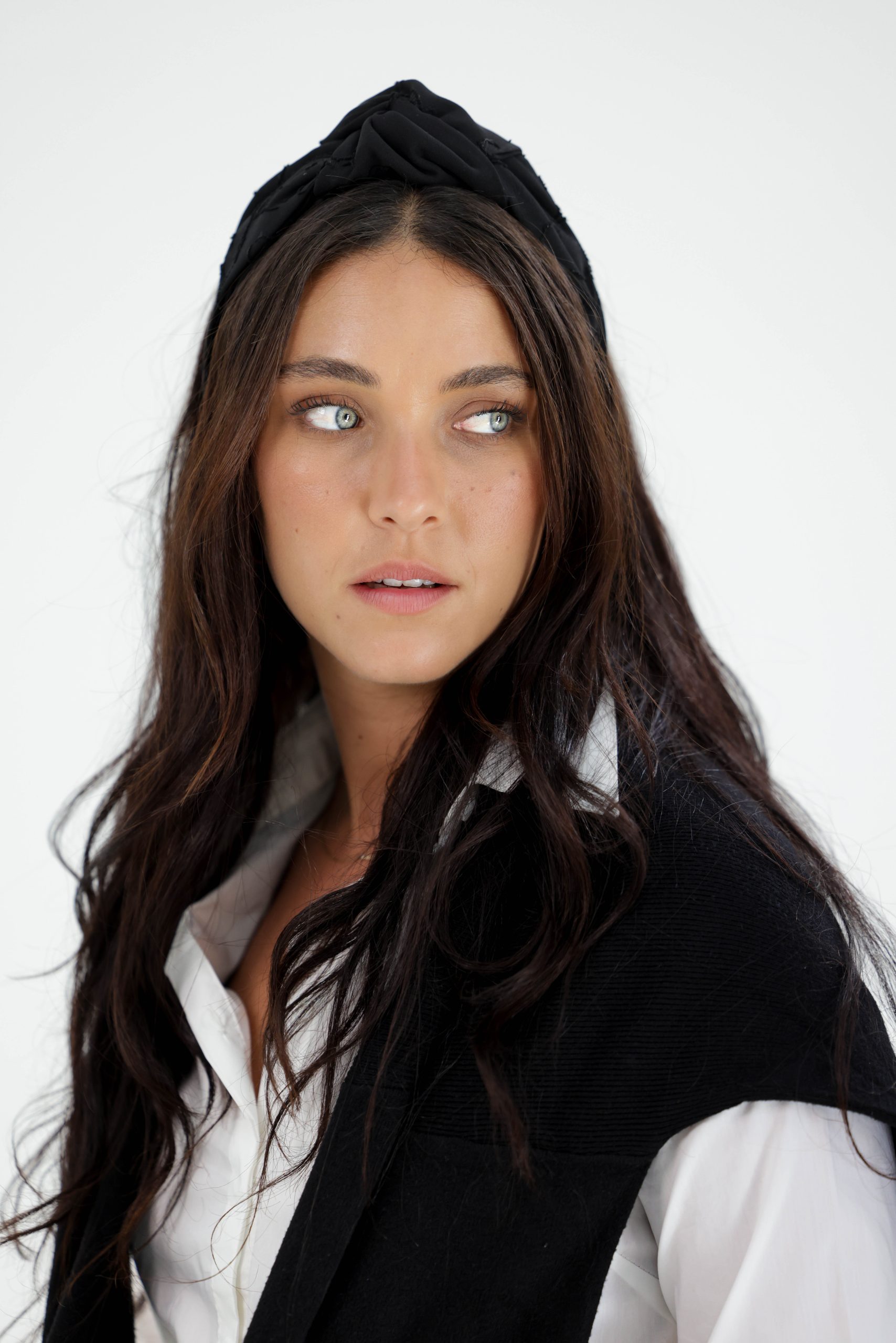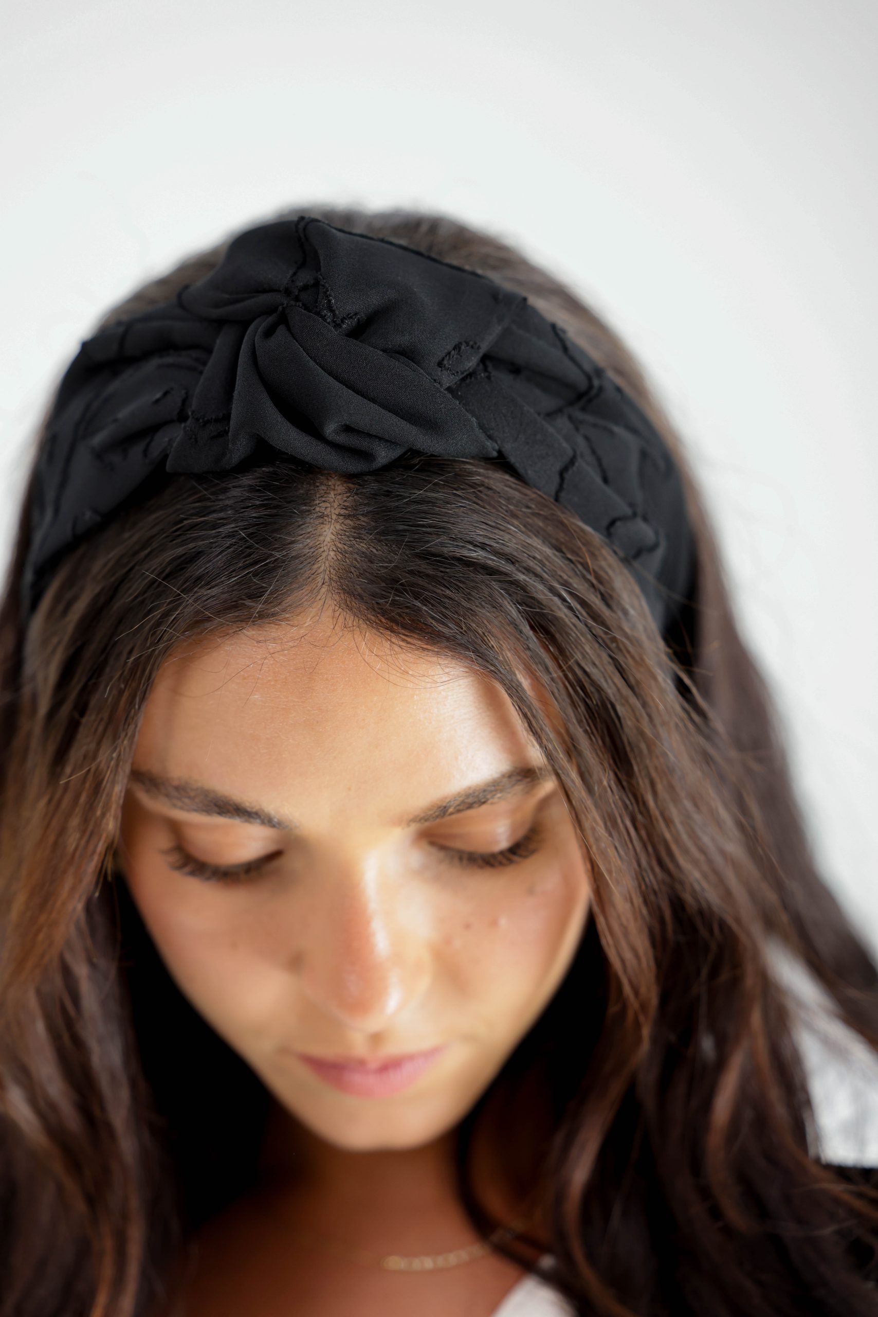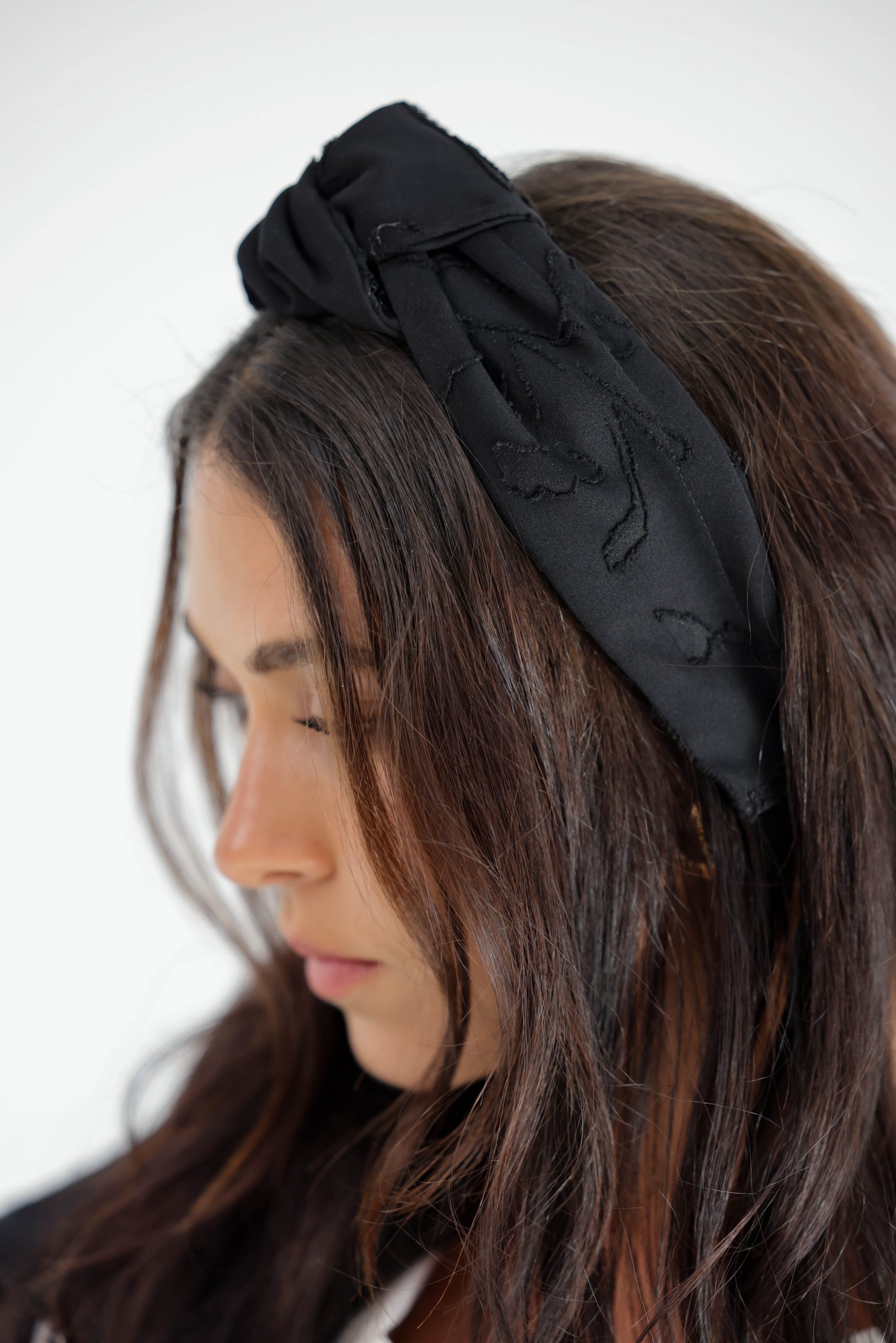 קשת לשיער עם חוט ברזל תפור בפנים ליצירת קשירות מגוונות ופשוטות, מבד שיפון בטקסטורת פרחים בצבע שחור.