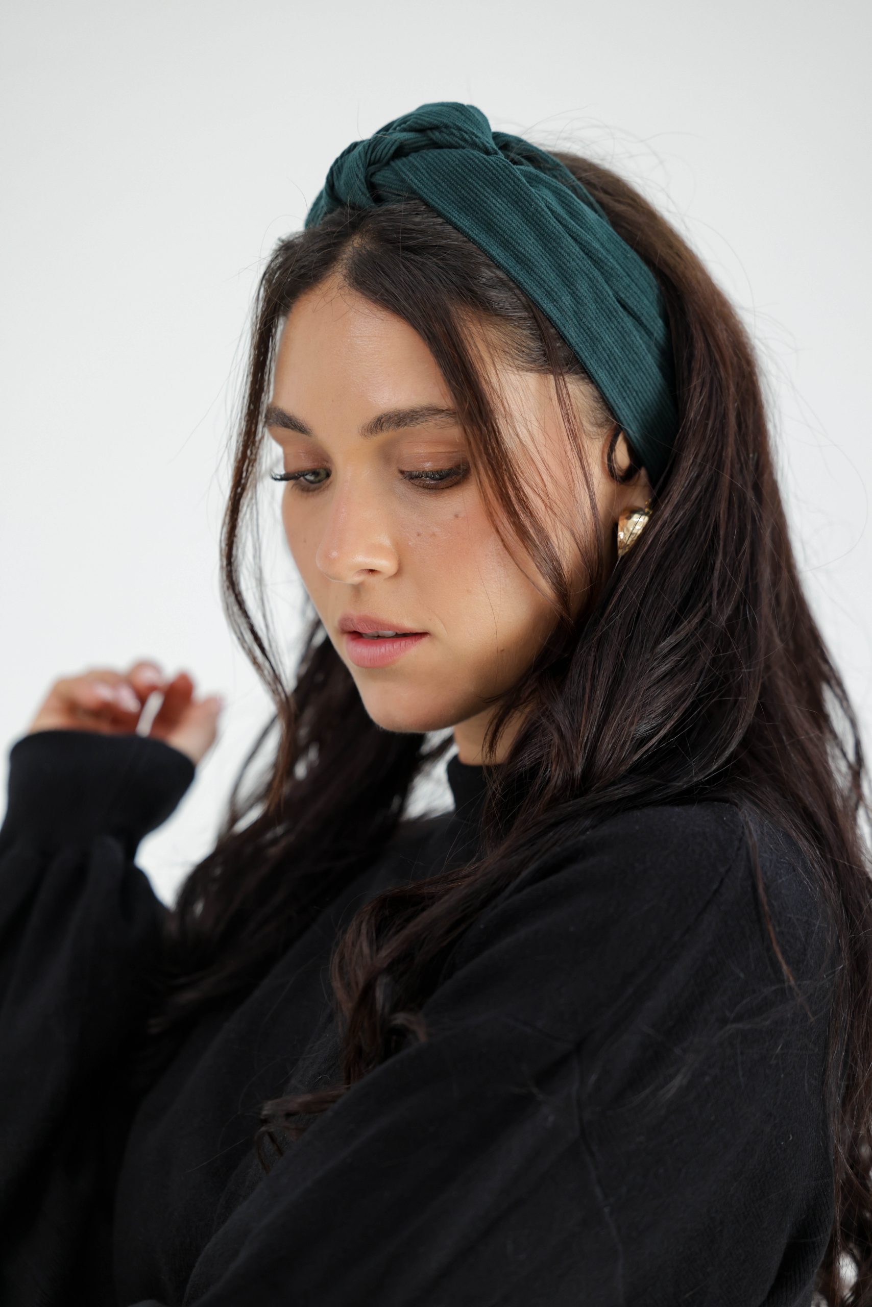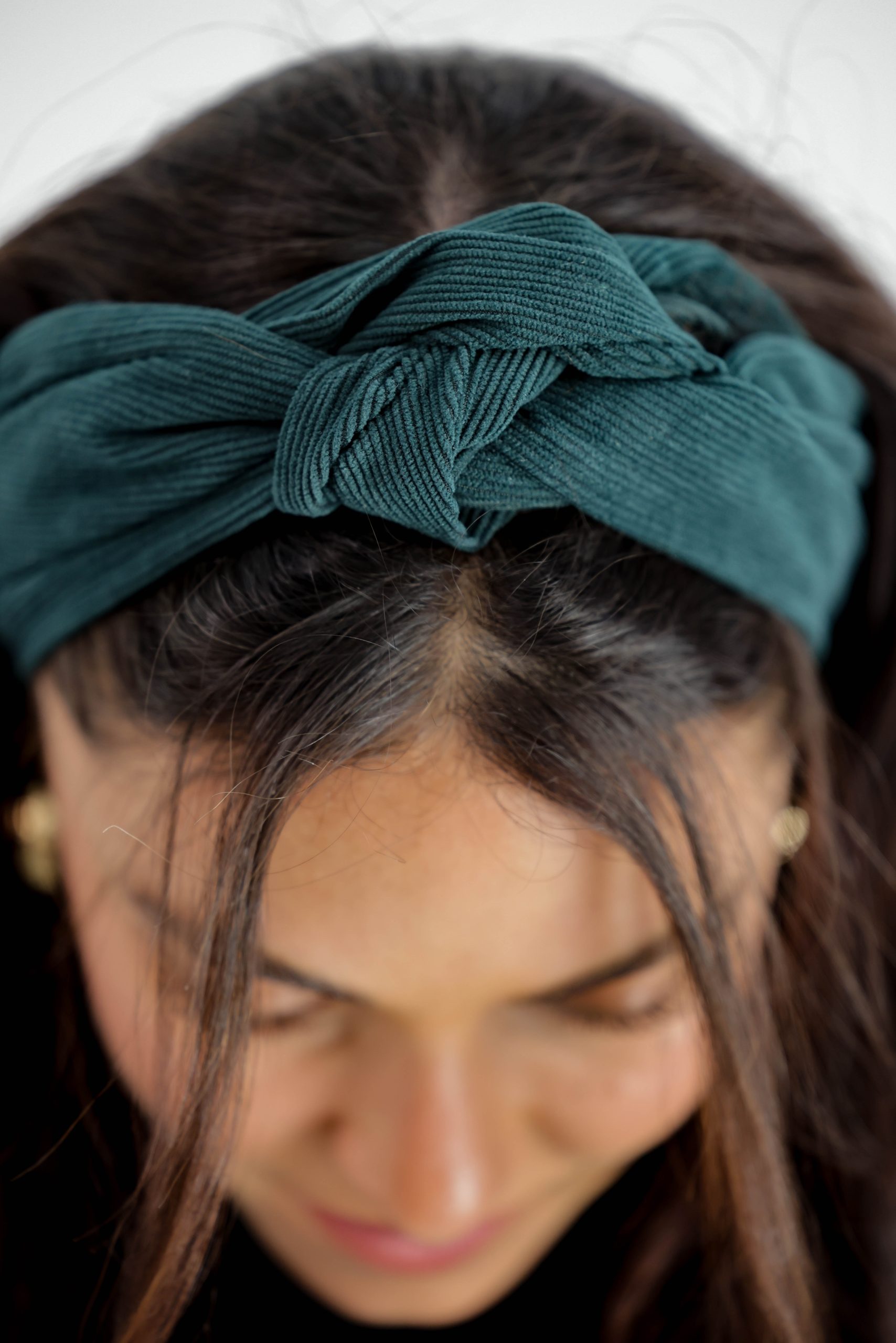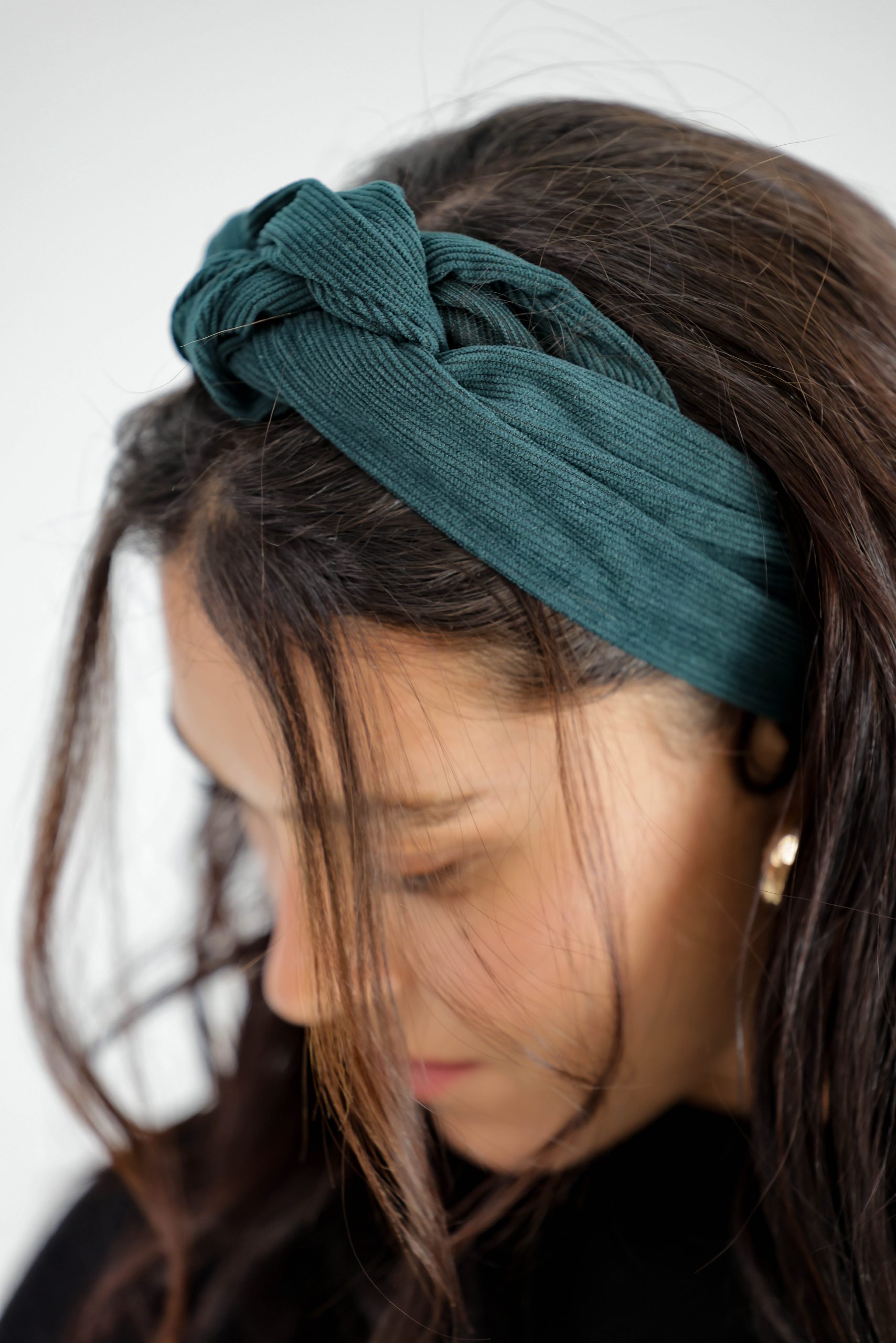 סרט לשיער עם חוט ברזל תפור בפנים ליצירת קשירות מגוונות ופשוטות, בד קורדרוי בגוון ירוק בקבוק עמוק.