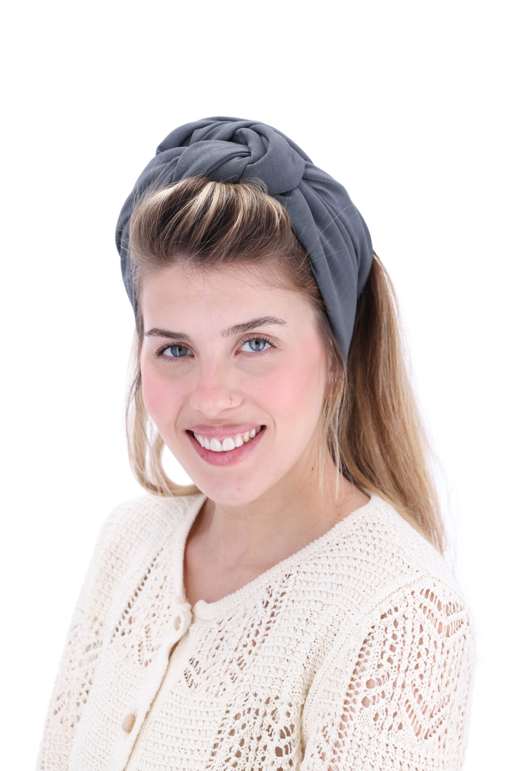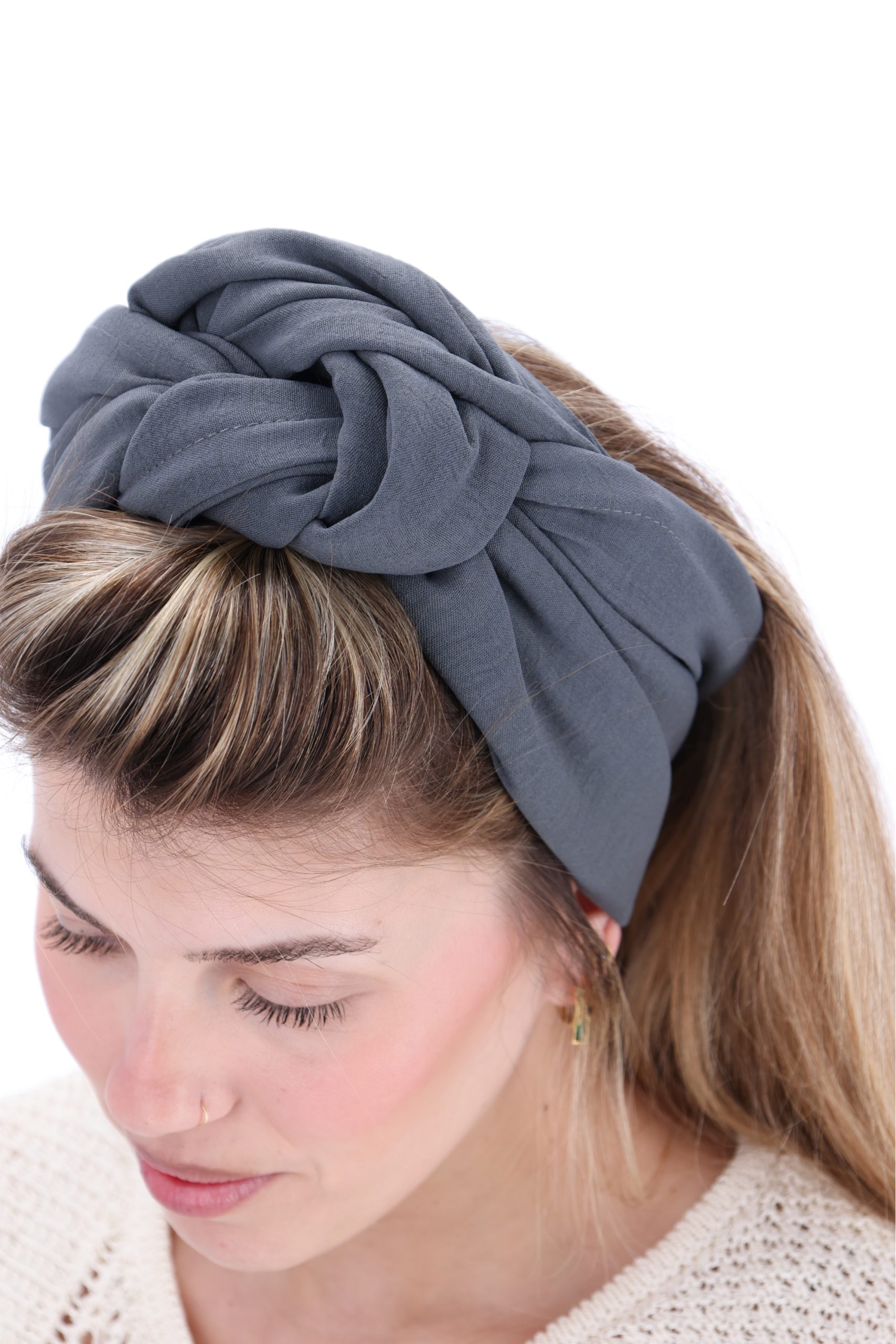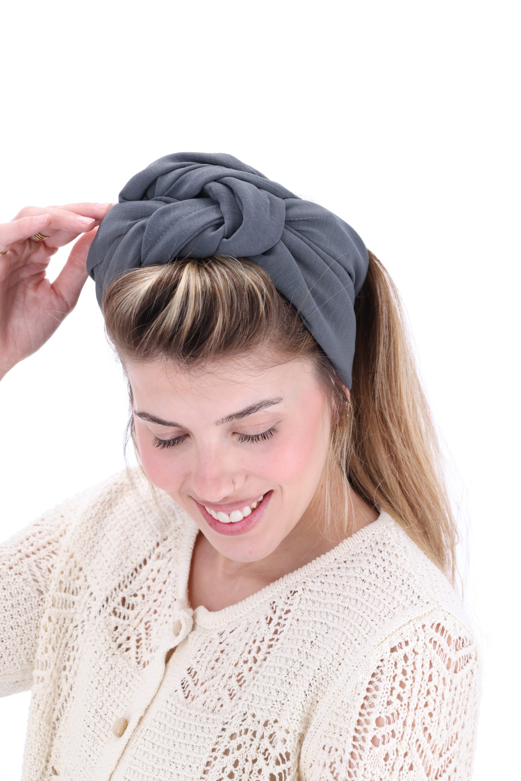סרט לשיער עם חוט ברזל תפור בפנים ליצירת קשירות מגוונות ופשוטות, מבד כותנה איכותי בצבע אפור