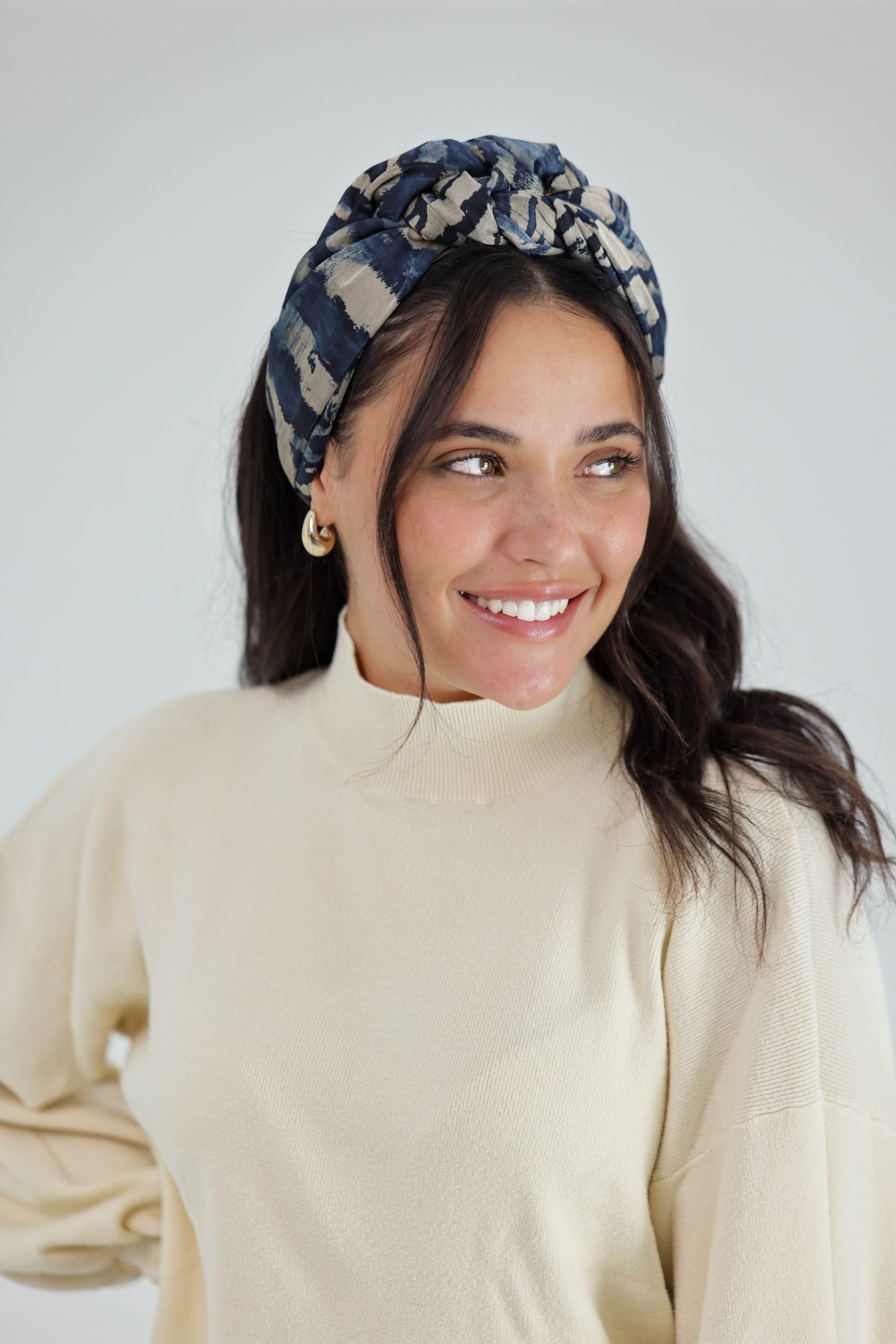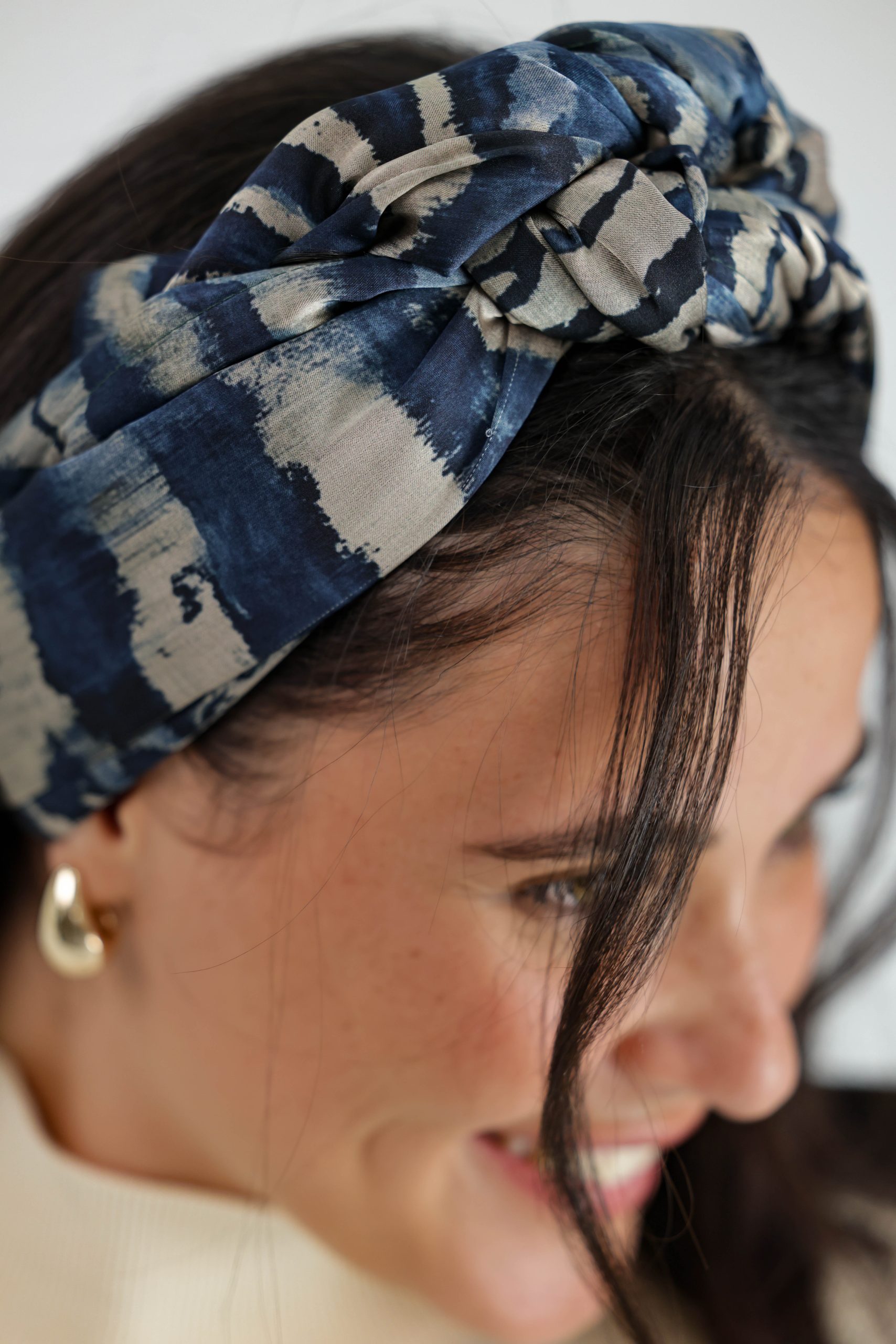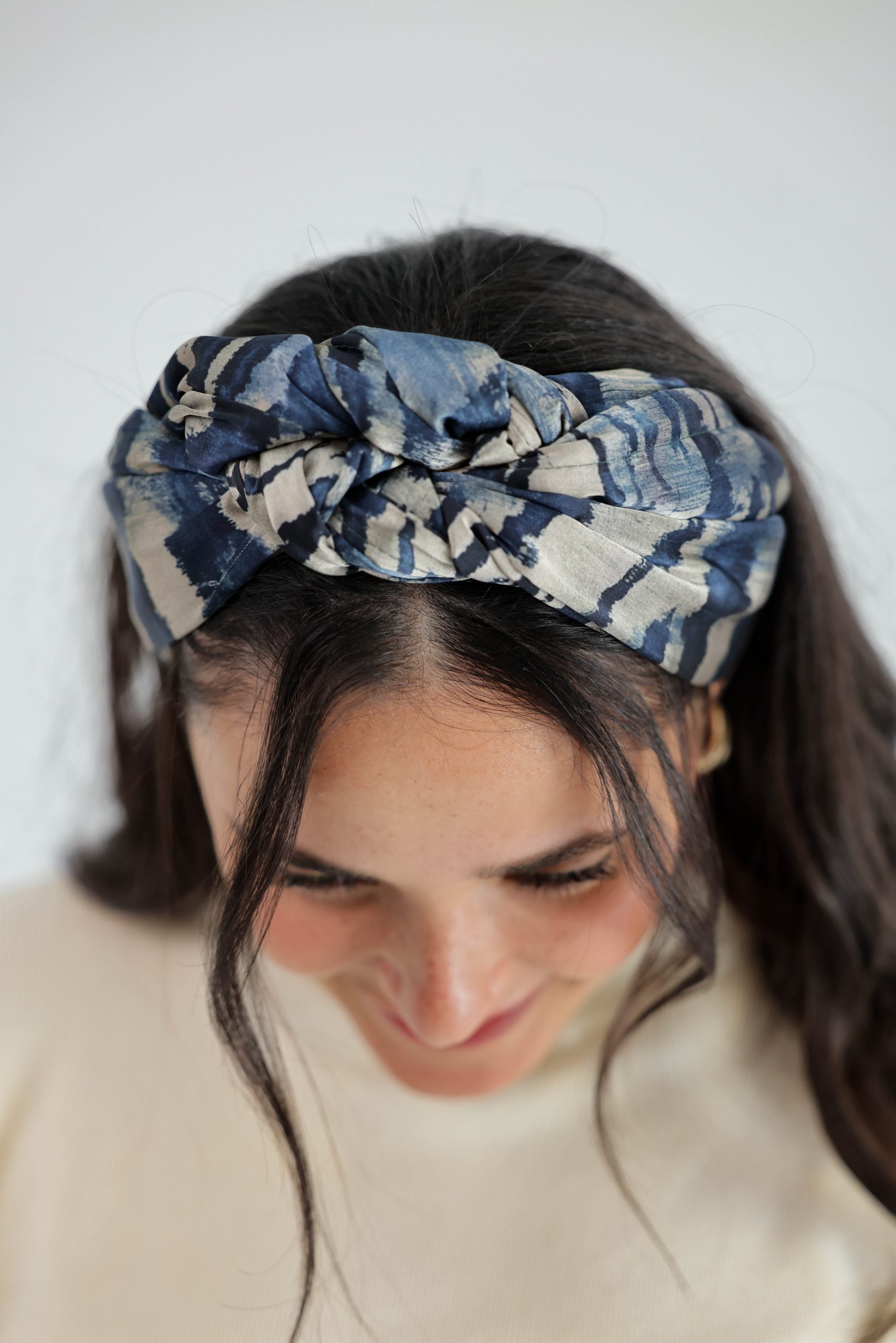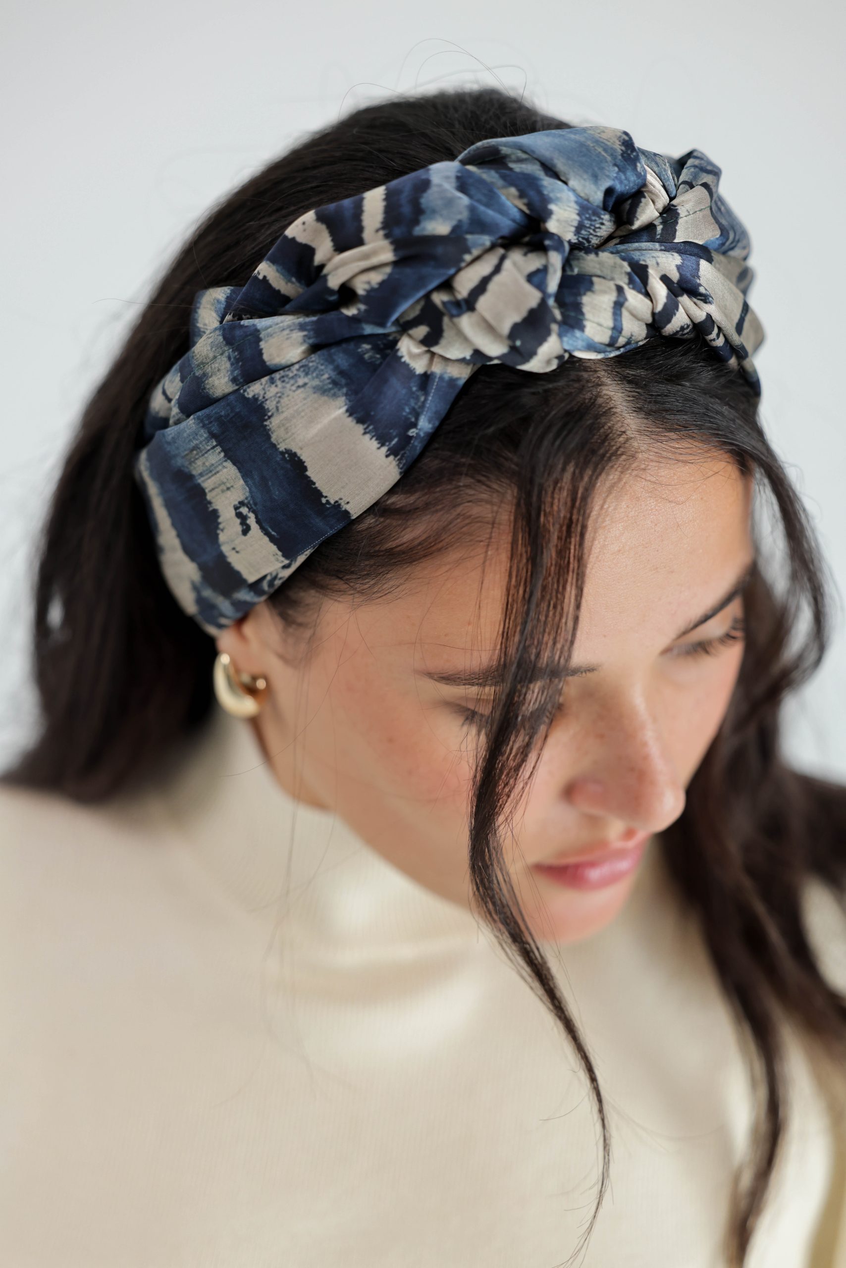 סרט לשיער עם חוט ברזל תפור בפנים ליצירת קשירות מגוונות ופשוטות, בד סאטן בהדפס מזובר בגווני כחול ובז'.