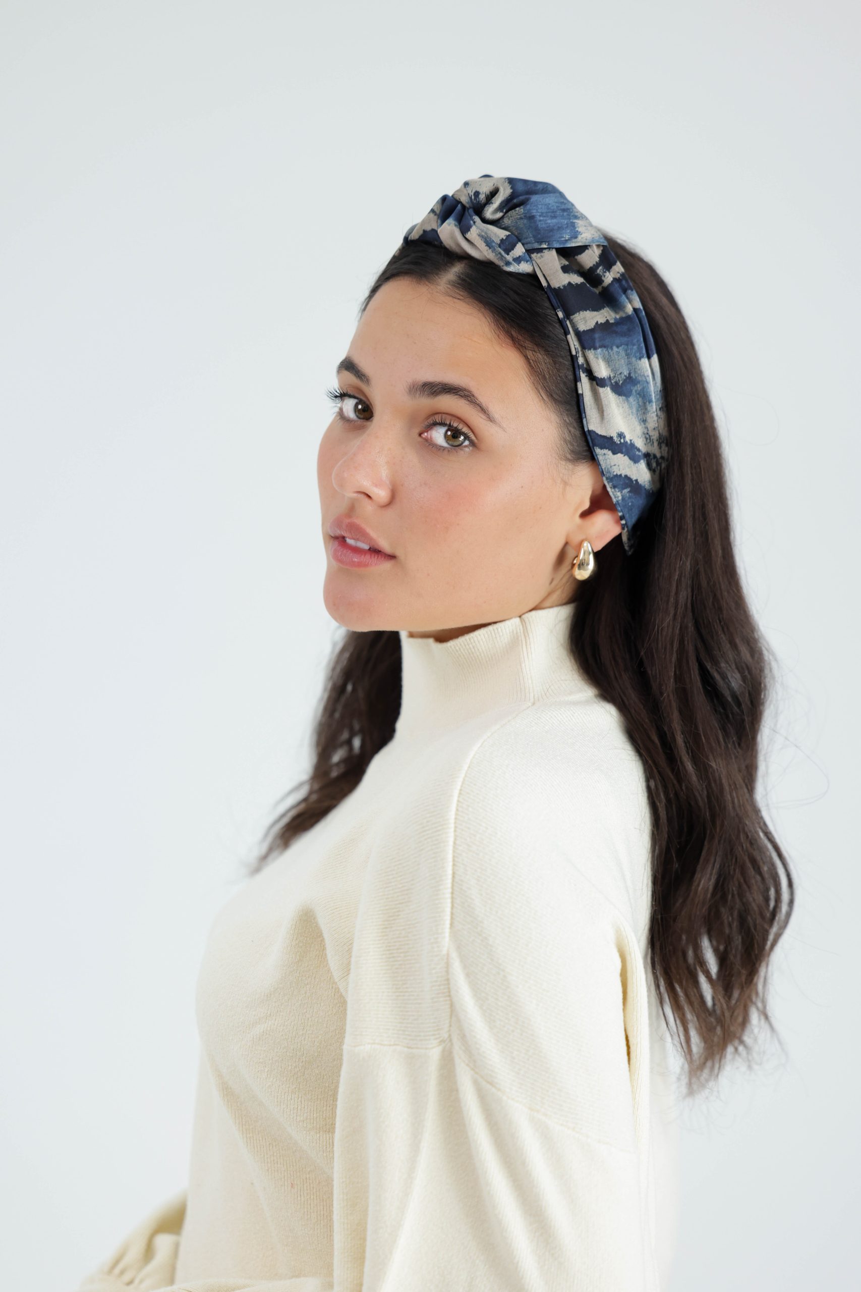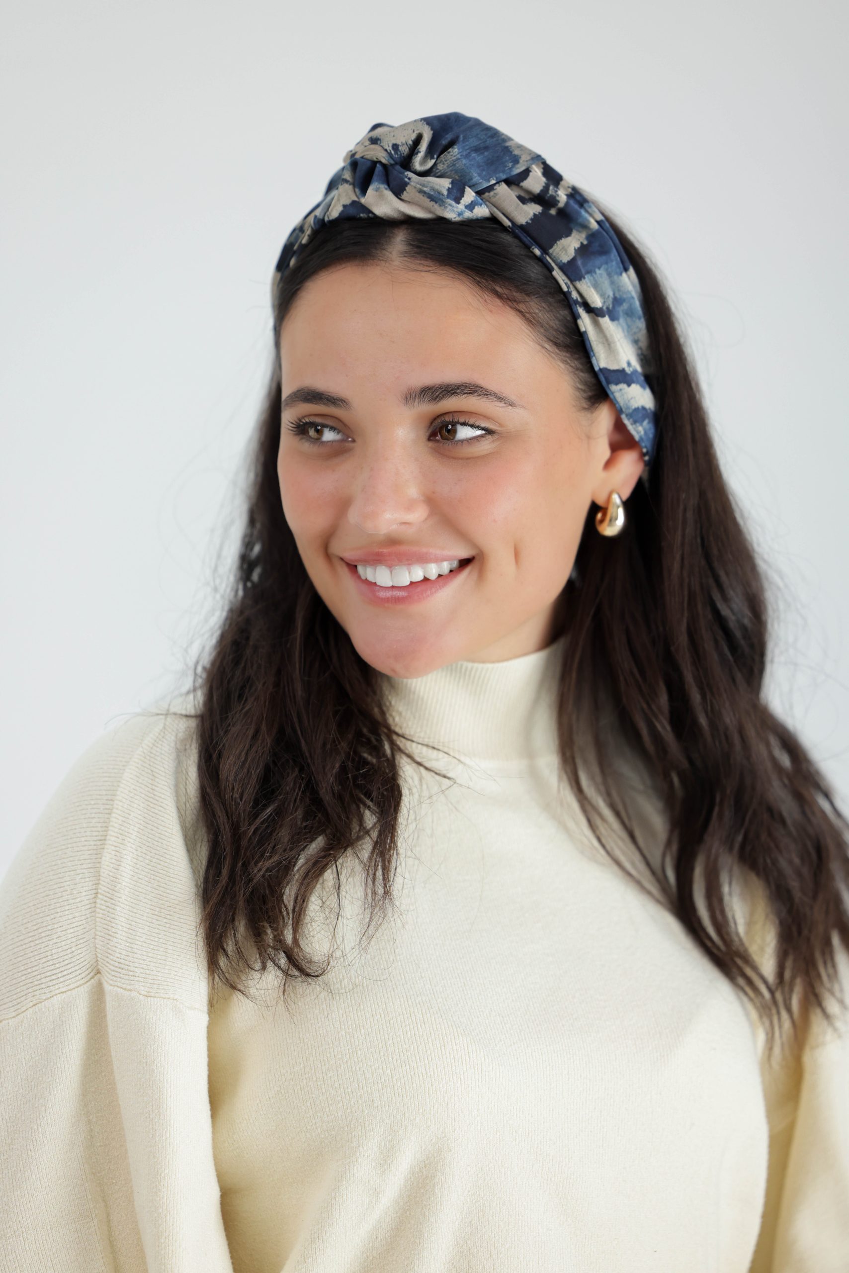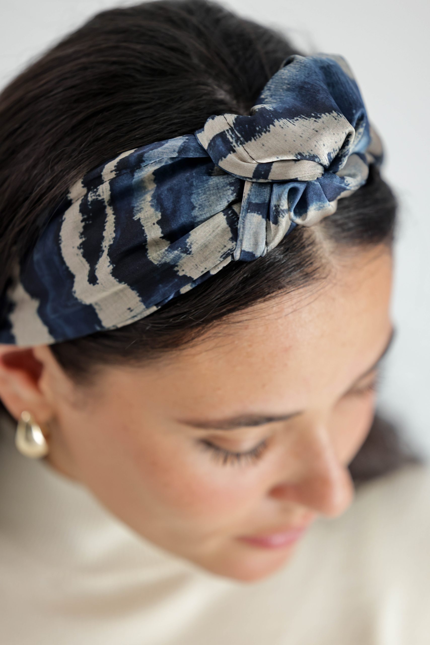 קשת לשיער עם חוט ברזל תפור בפנים ליצירת קשירות מגוונות ופשוטות, בד סאטן בהדפס מזובר בגווני כחול ובז'.