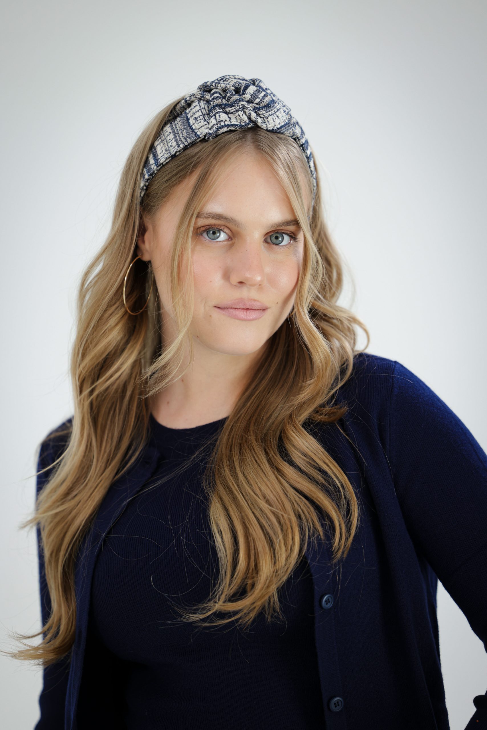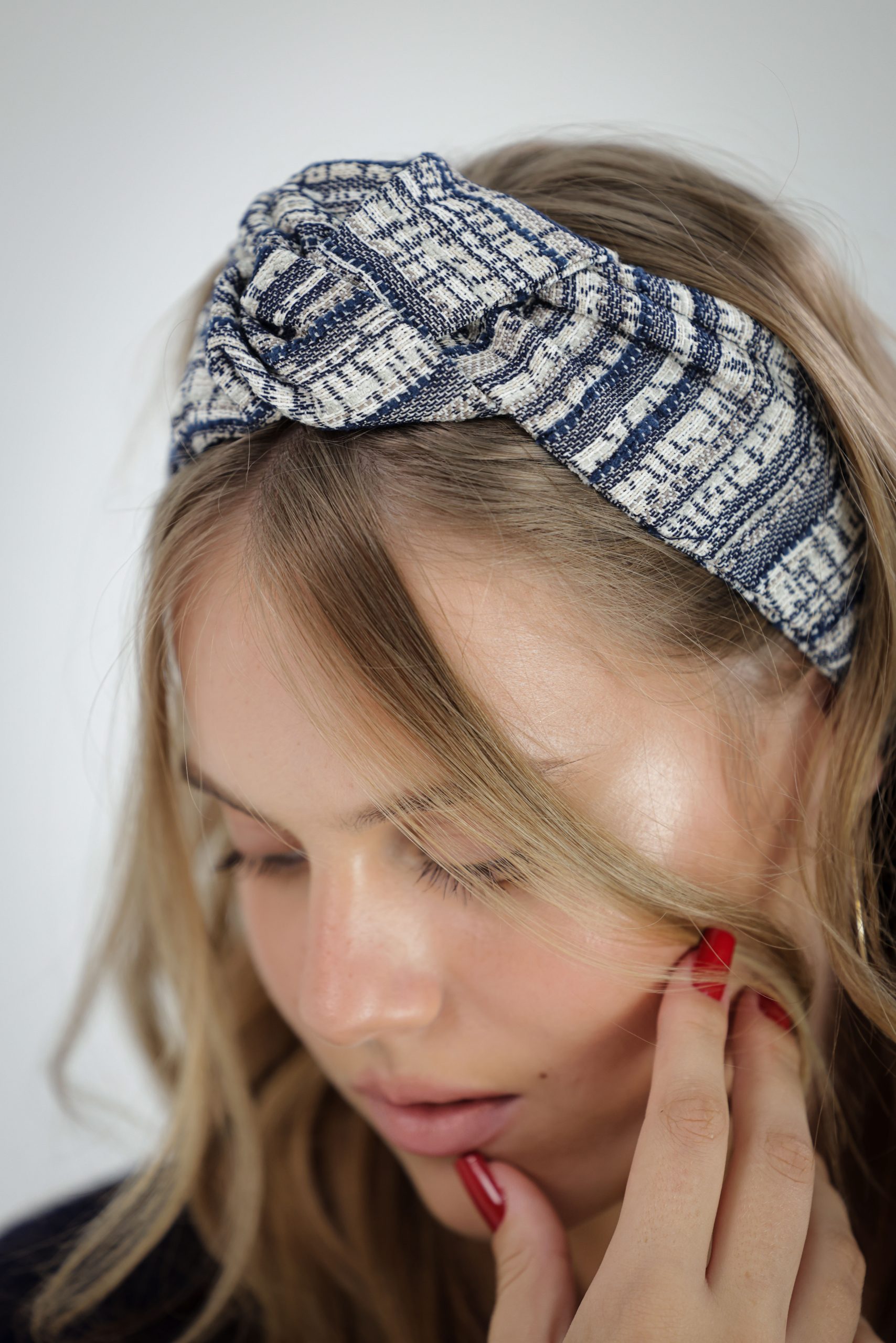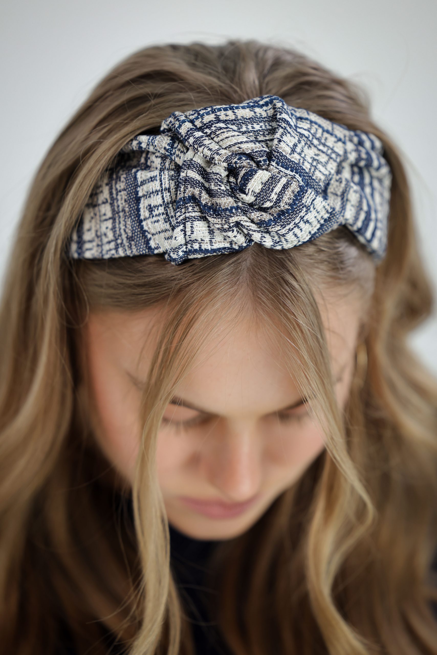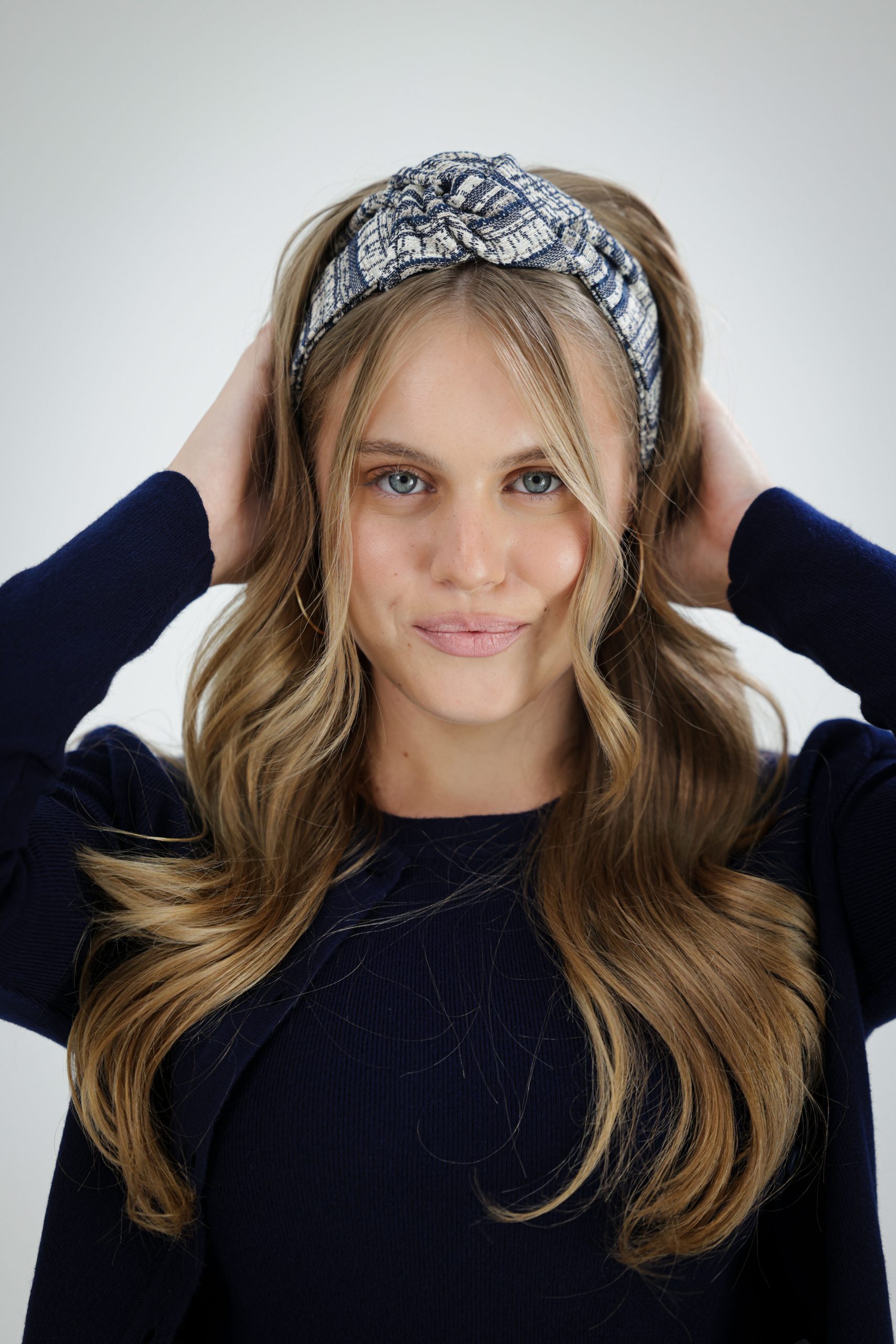 סרט לשיער שמגיע מוכן ונשאר לקשור אותו מתחת לשיער בעזרת הסרטים השחורים שבקצה. בתוך הסרט תפור חוט ברזל תפור ליצירת משחק עם הנפח של הסרט . מבד אריג עבה בטקסטורת פסים בגווני כחול שמנת ובז