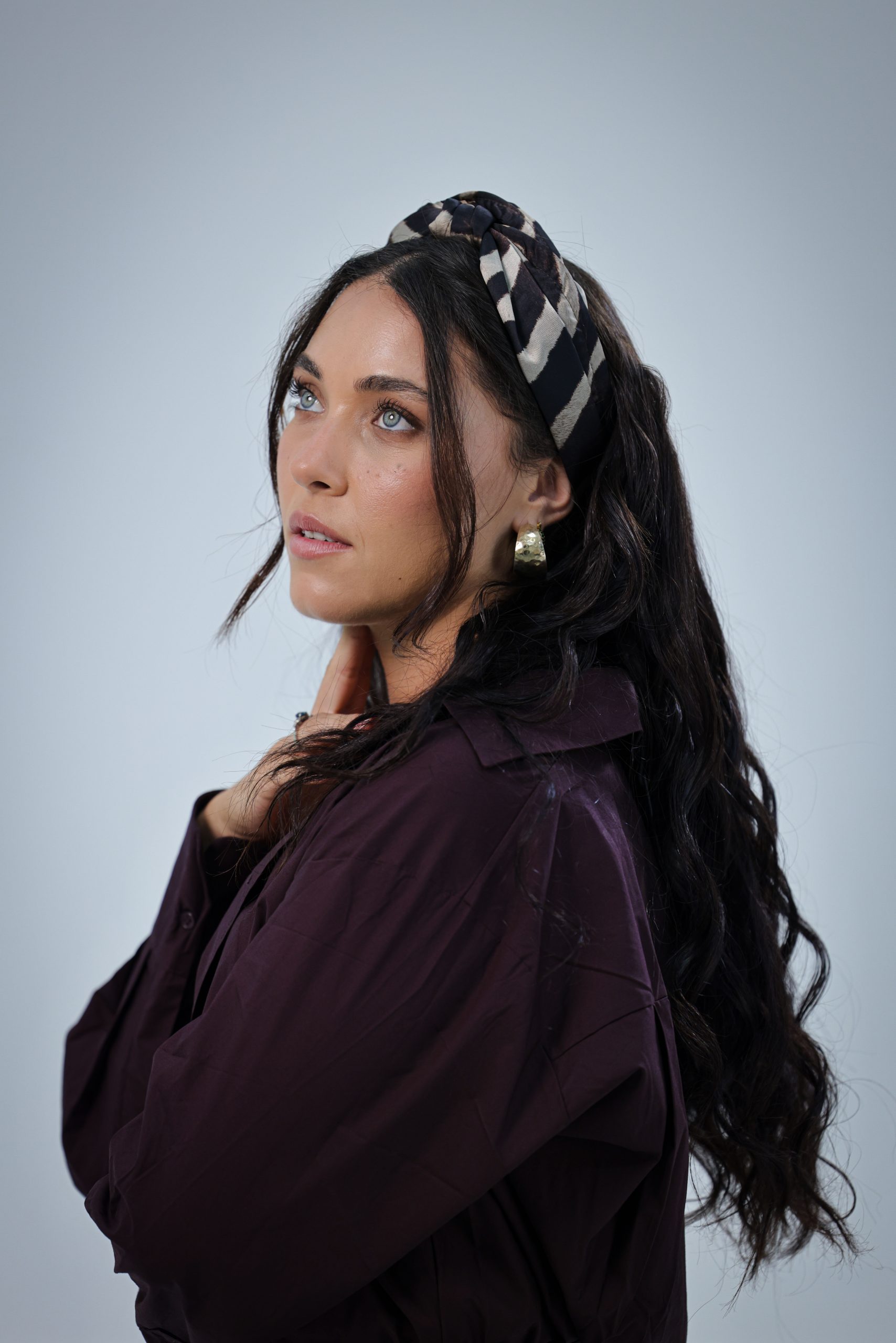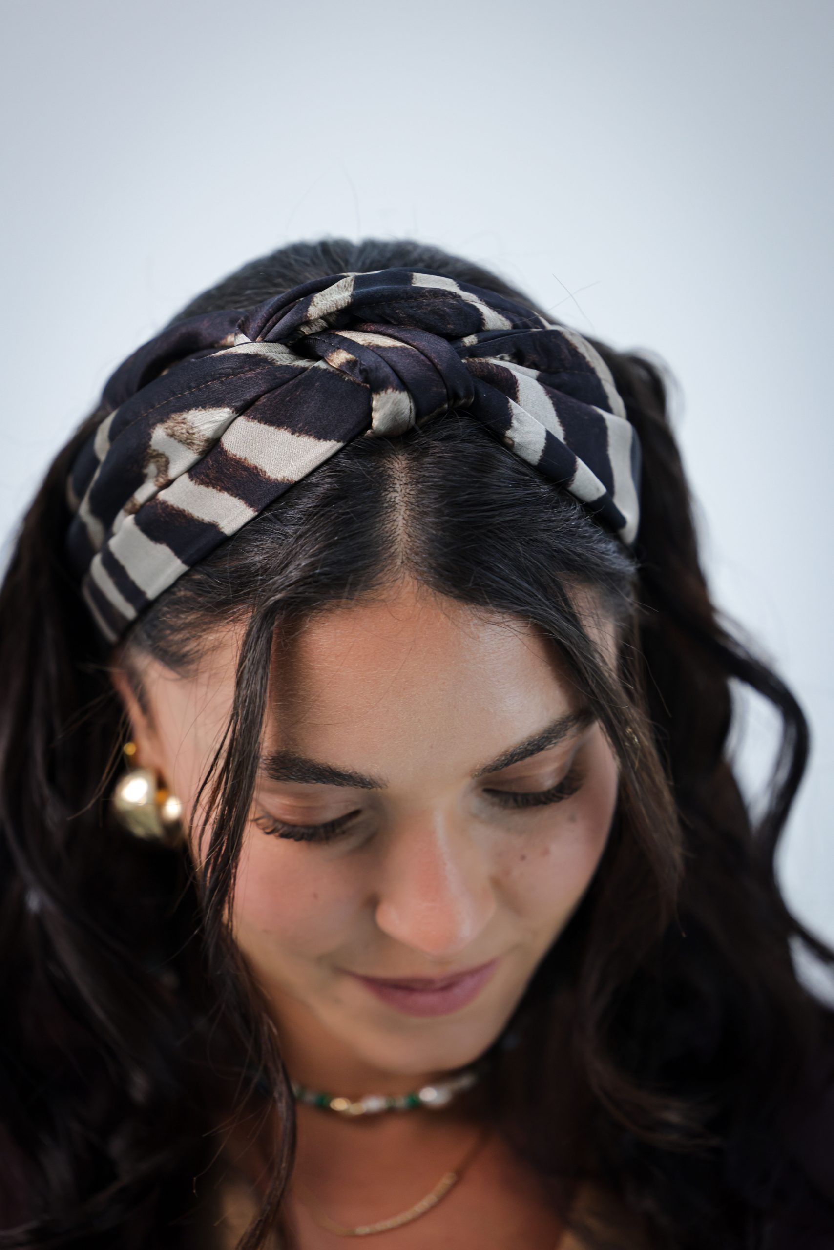 סרט לשיער עם חוט ברזל תפור בפנים ליצירת קשירות מגוונות ופשוטות, בד סאטן בהדפס מזובר בגווני חום בז ושחור.