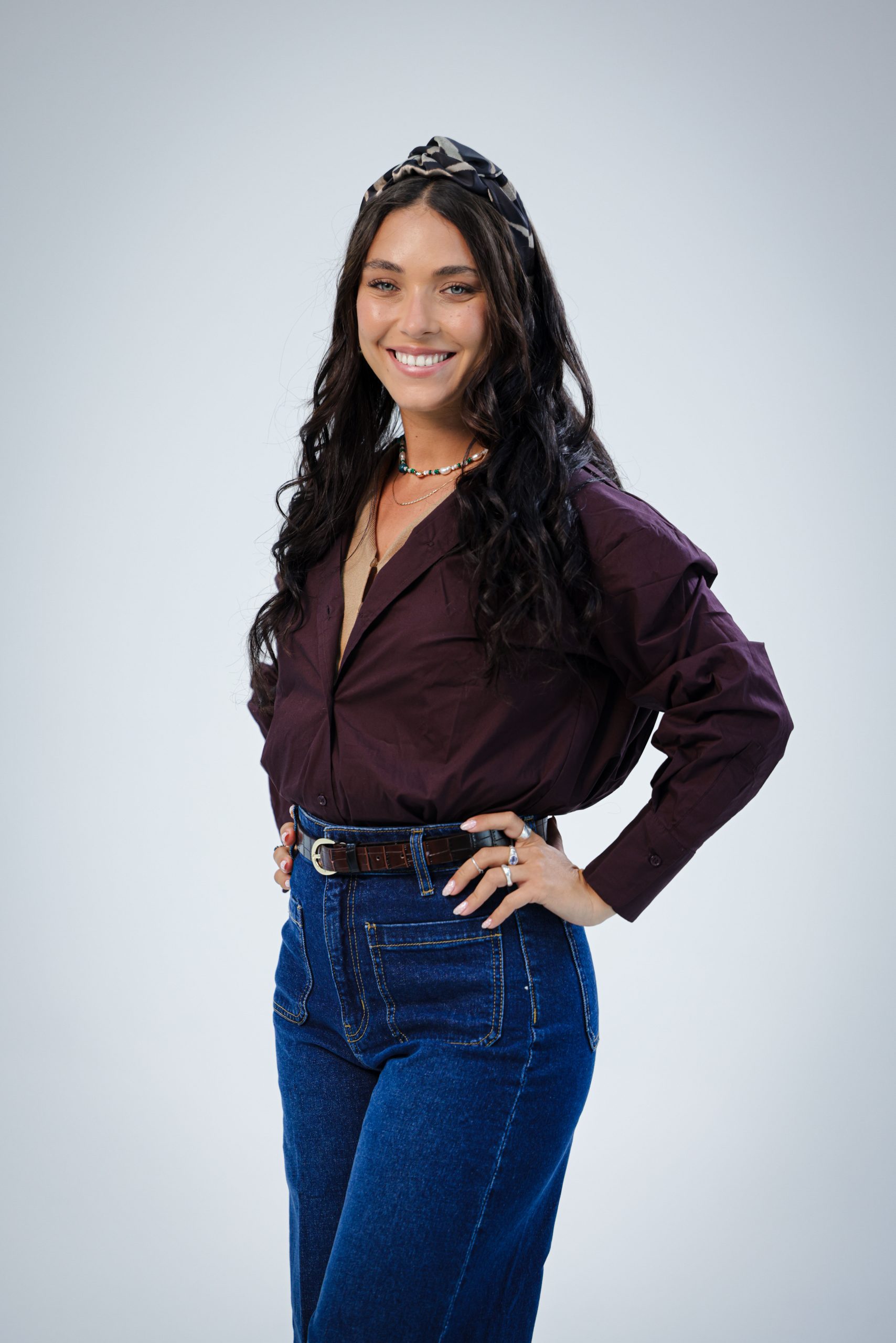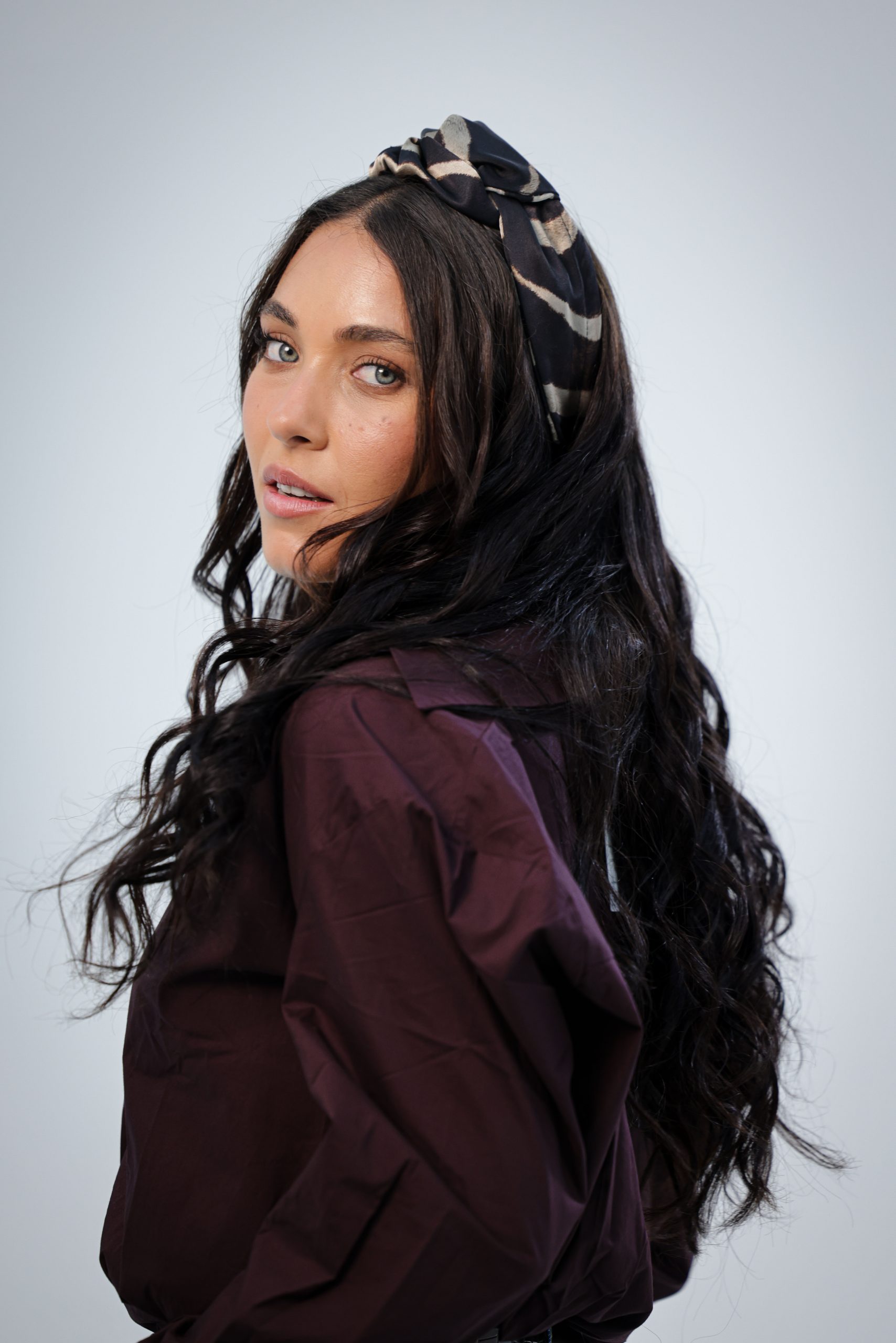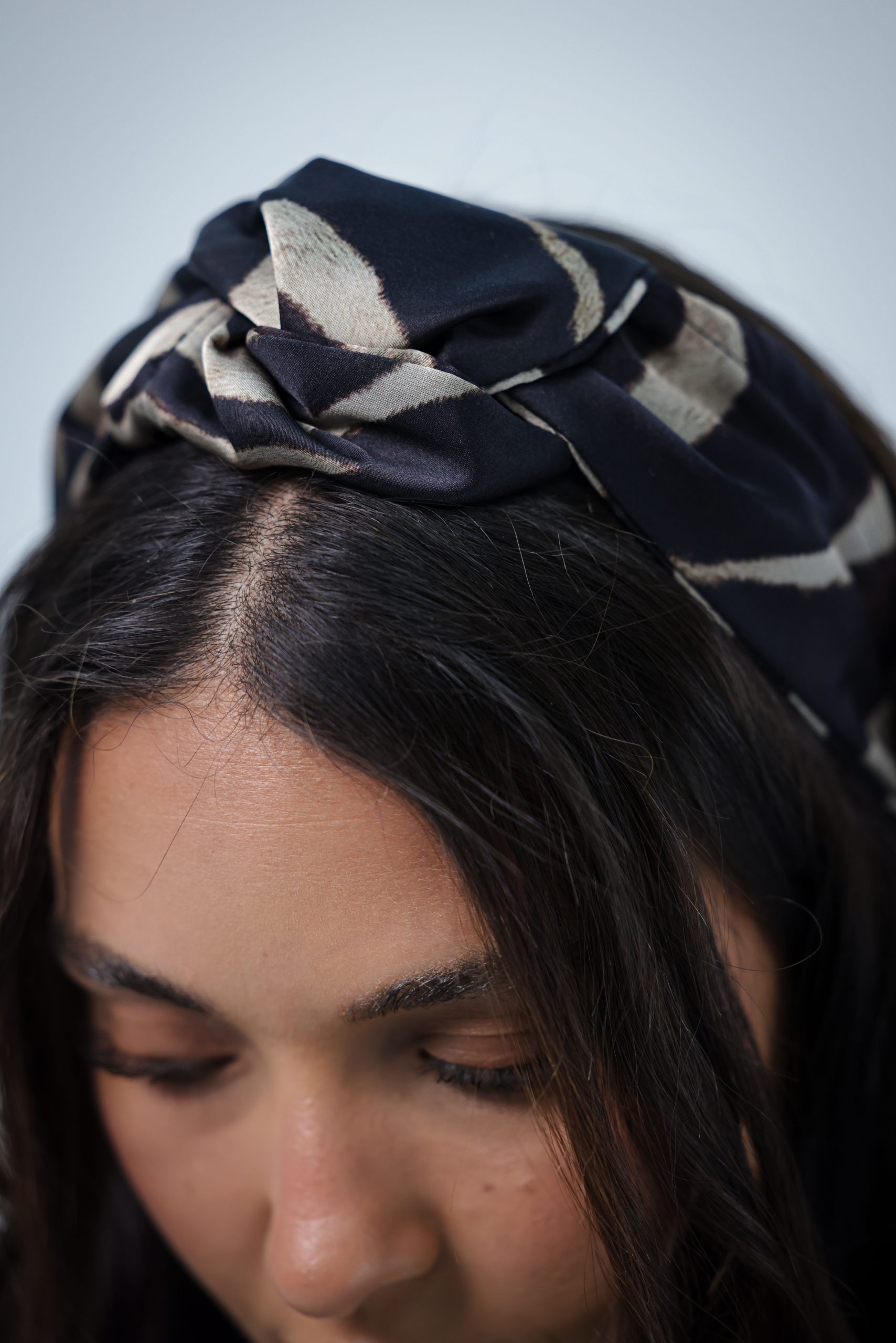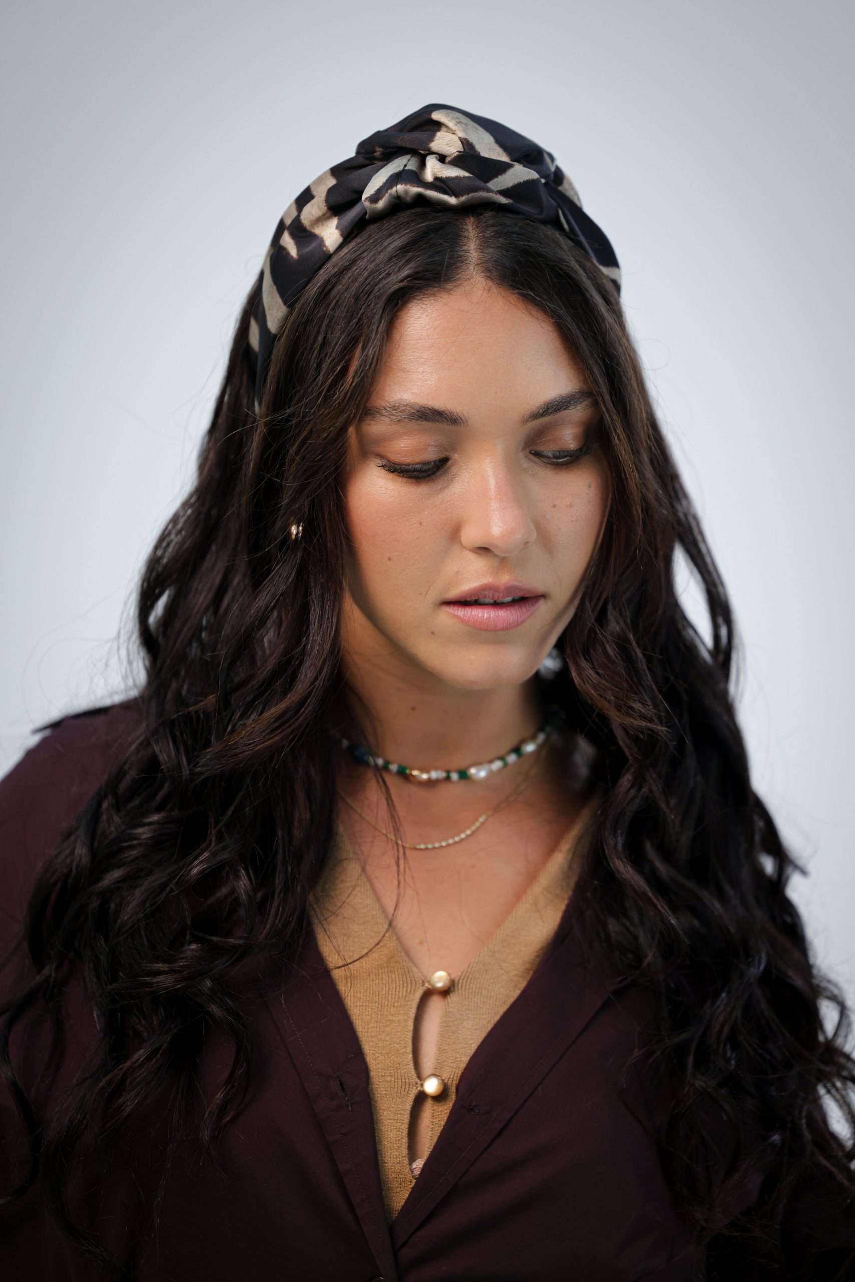 קשת לשיער עם חוט ברזל תפור בפנים ליצירת משחק עם הנפח והקשר שבמרכז הקשת. בד סאטן בהדפס מזובר בגווני חום בז ושחור.