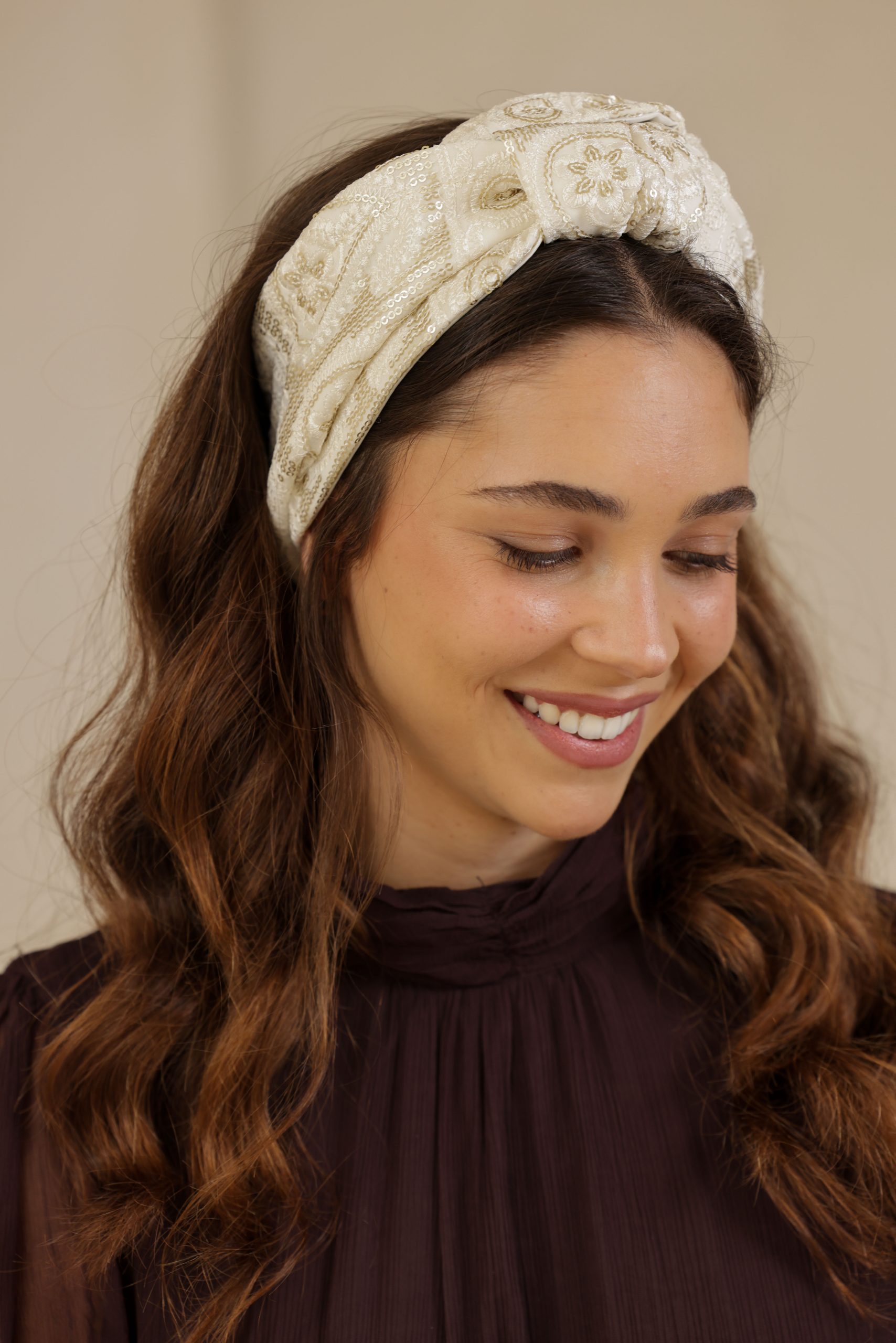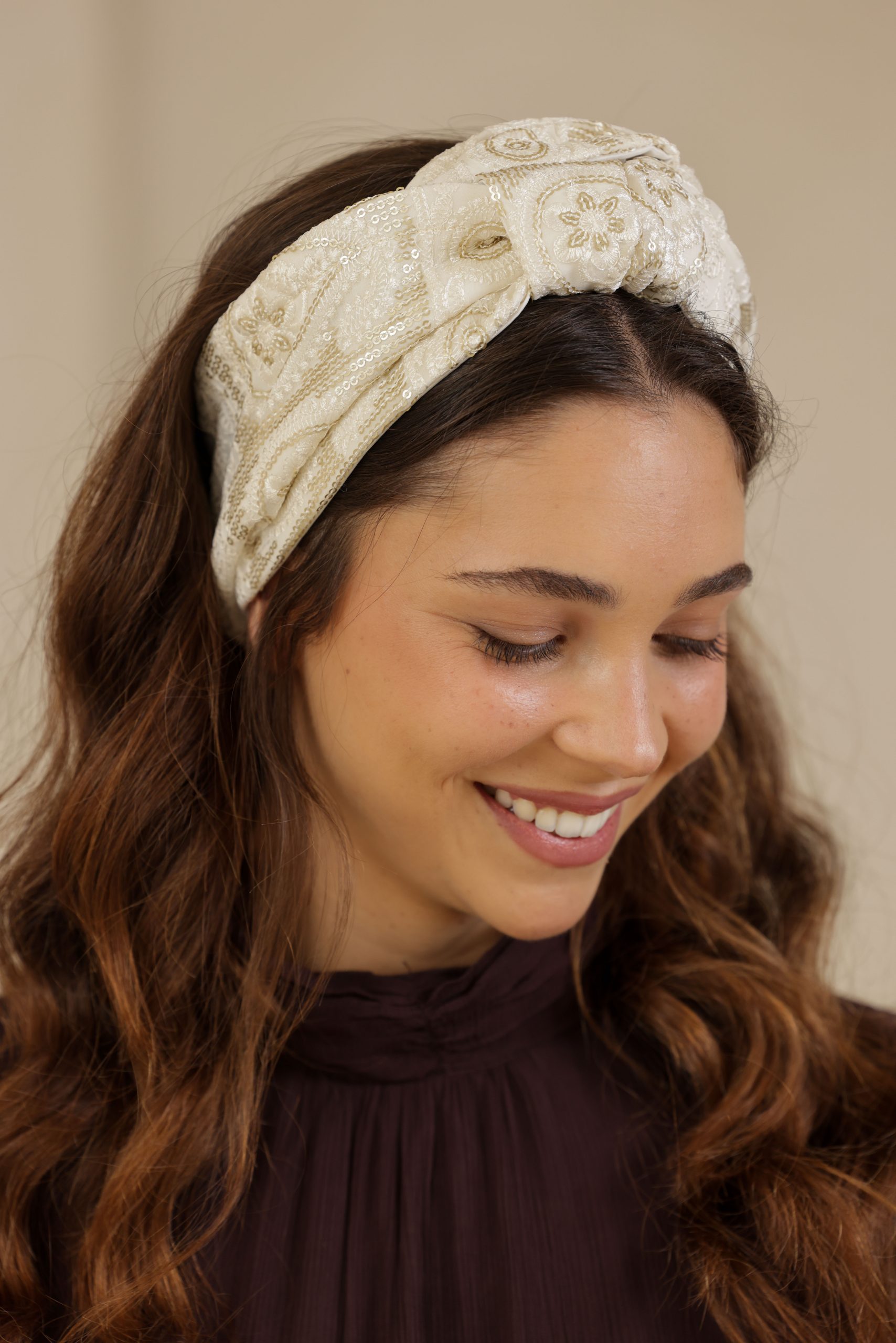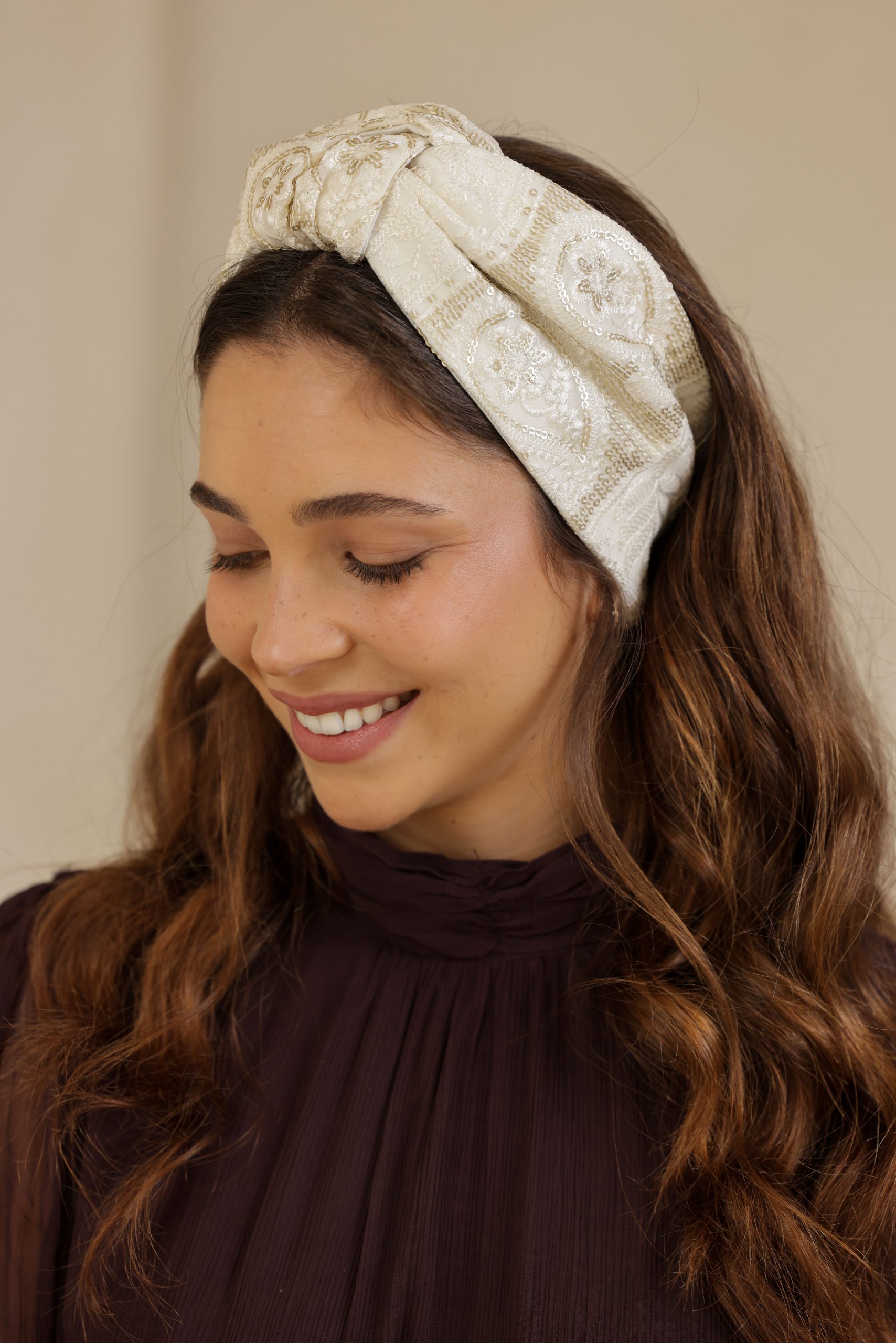 סרט לשיער עם חוט ברזל תפור בפנים ליצירת קשירות מגוונות ופשוטות, מבד שיפון עם ריקמת זהב עדינה בשילוב פייטים.