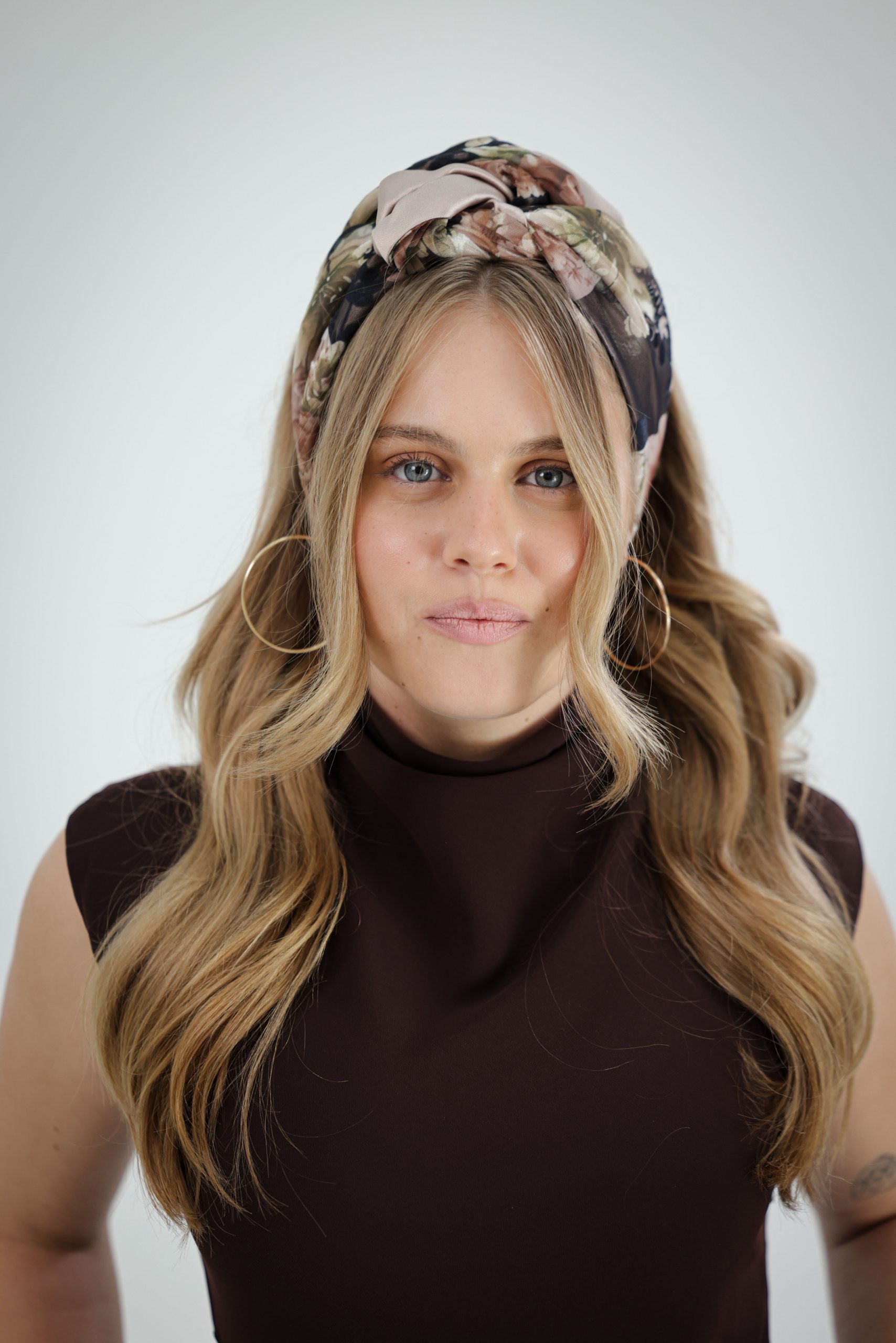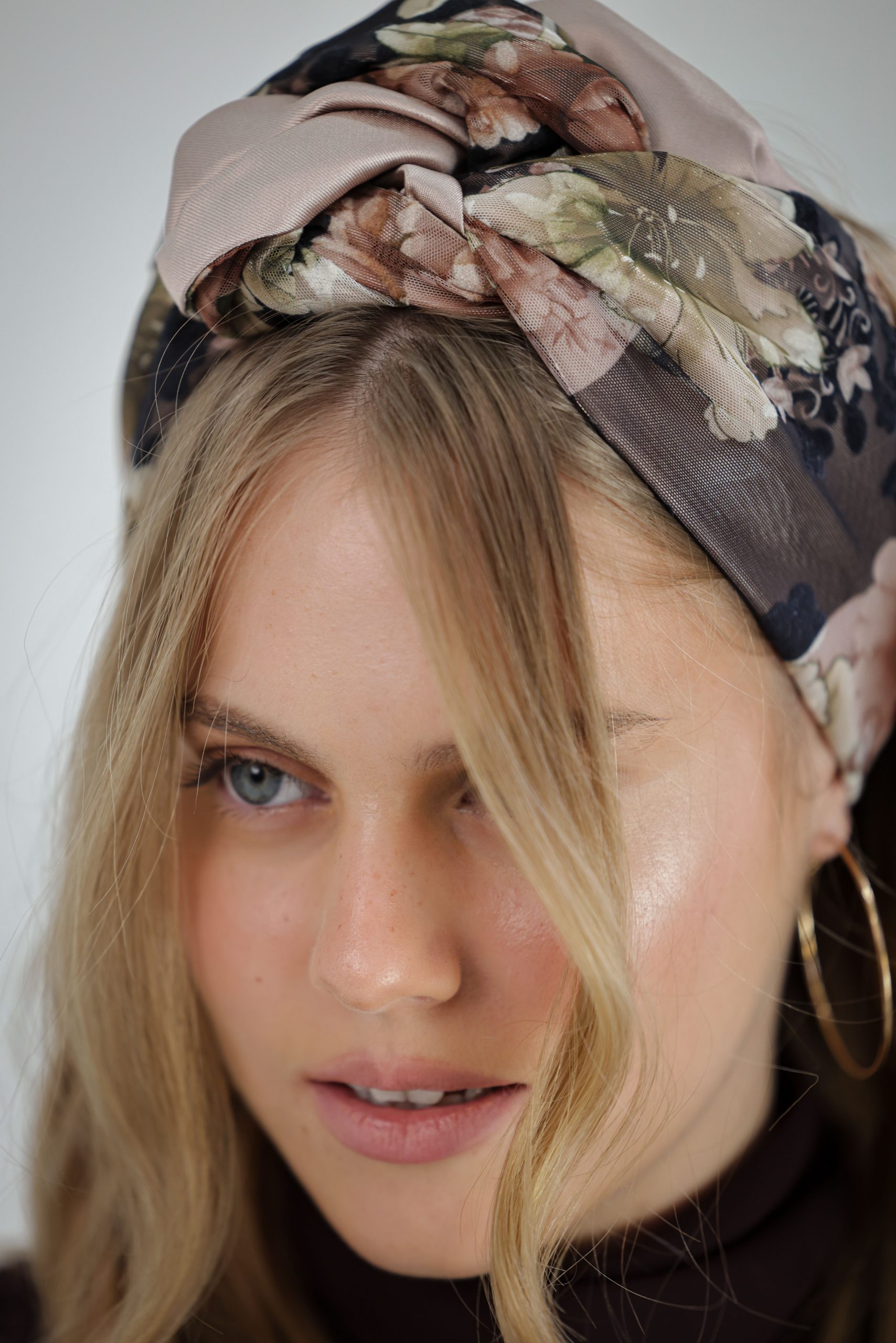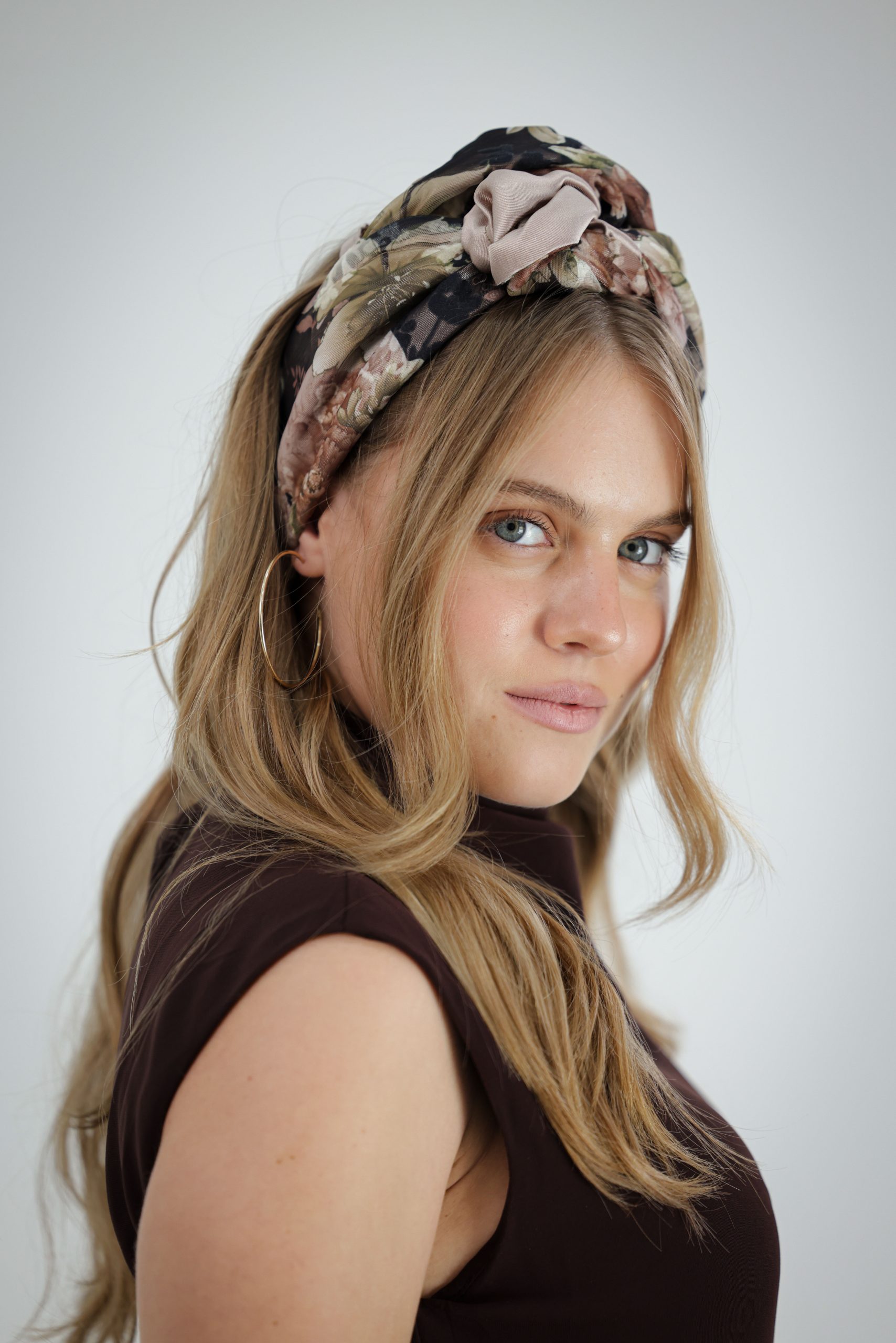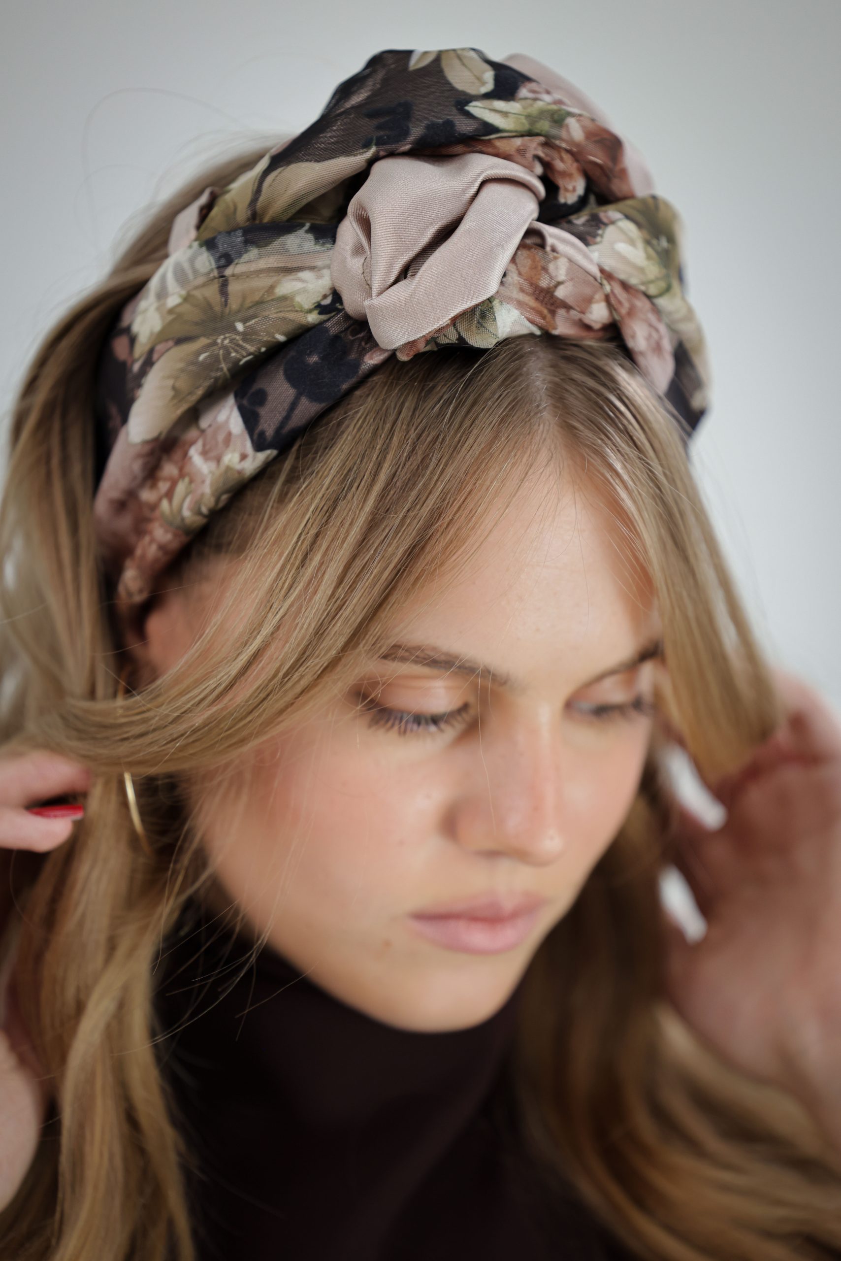 סרט לשיער עם חוט ברזל תפור בפנים ליצירת קשירות מגוונות ופשוטות, קטיפה צרובה בטקסטורת עלים בגווני ירוק שחוק חום ובז ומצידו השני בד בגוון בז' מבריק.