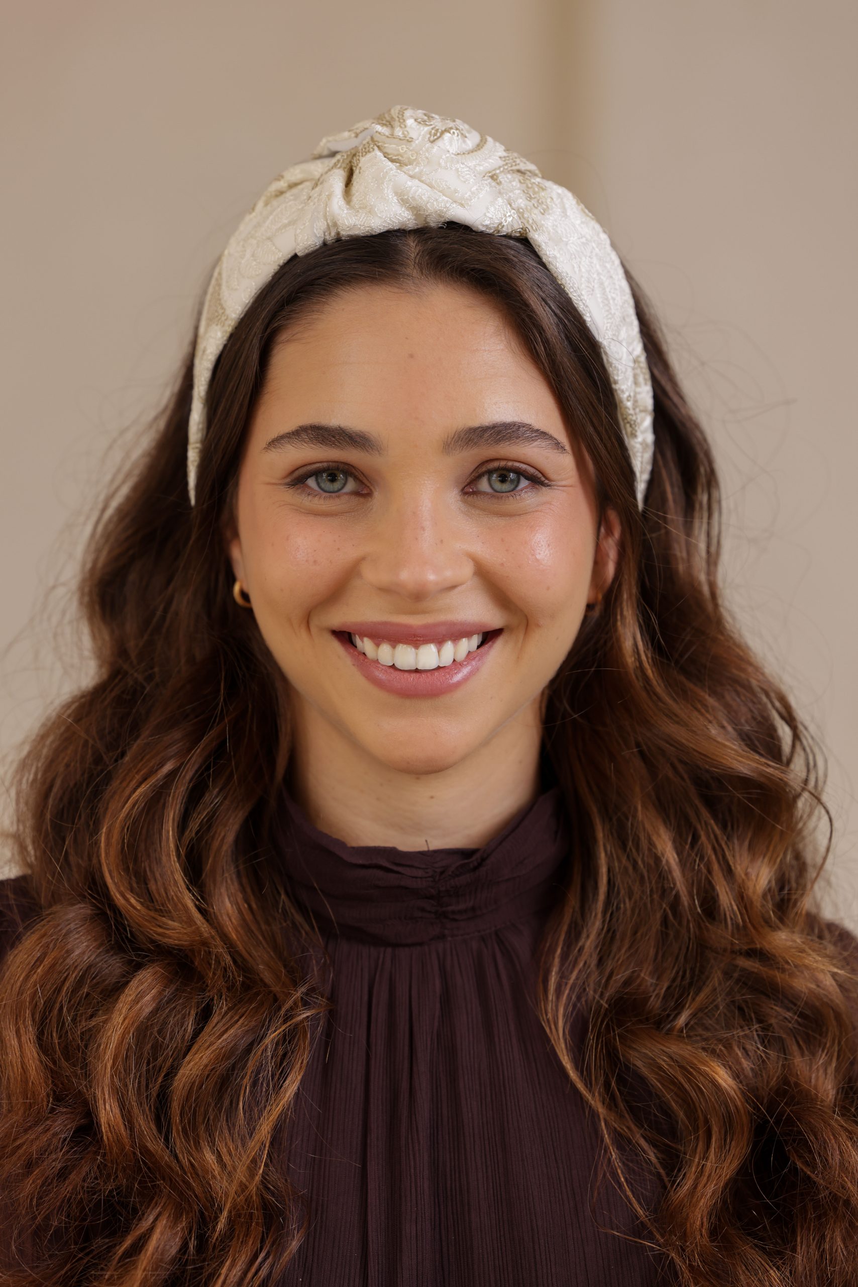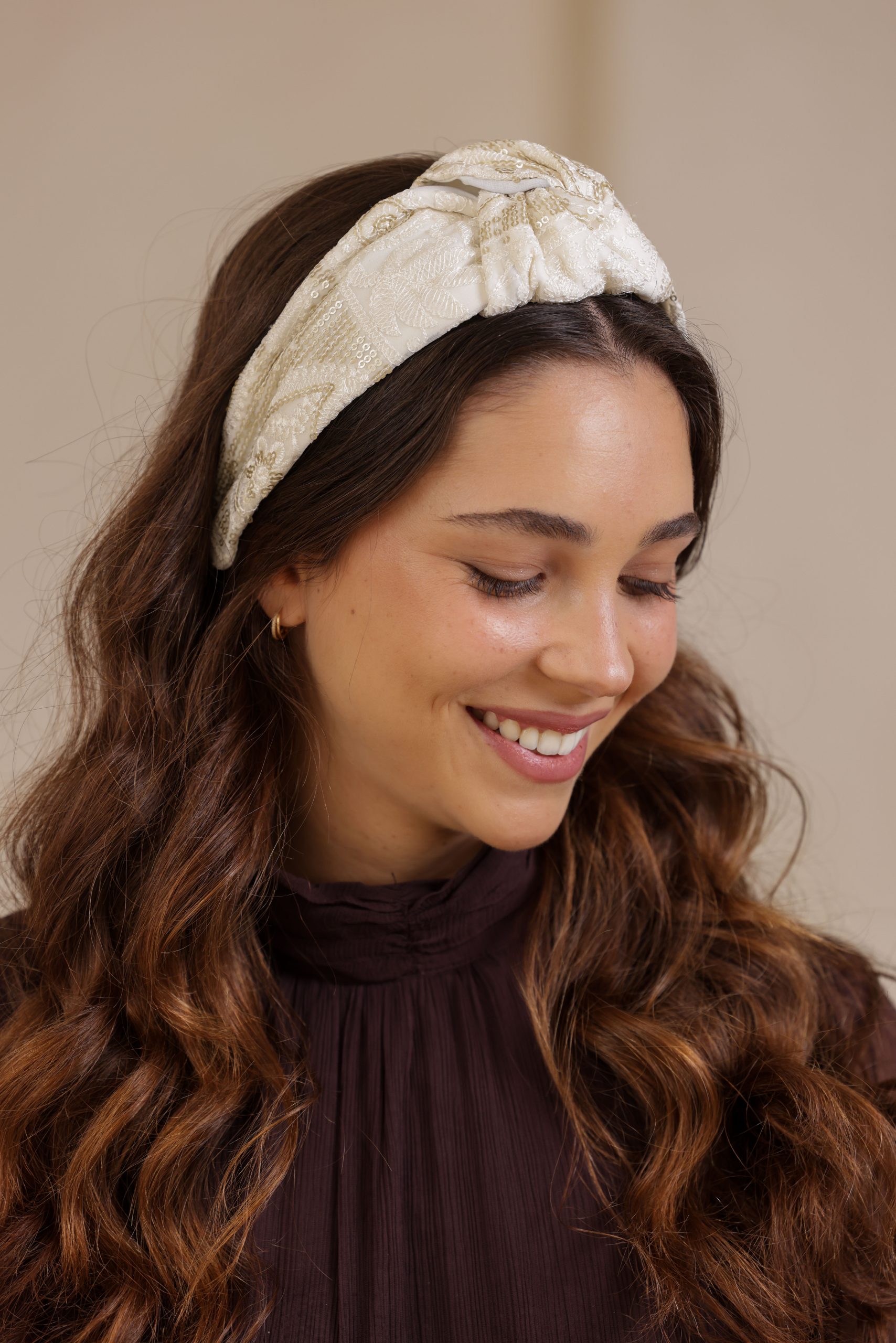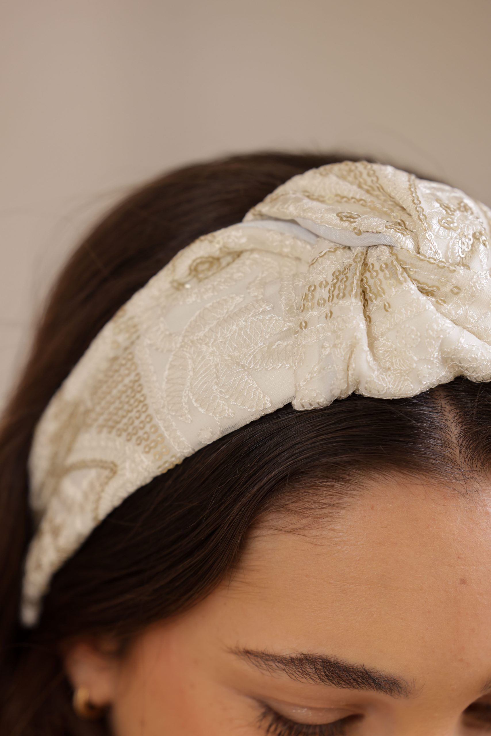 קשת לשיער עם חוט ברזל תפור בפנים, מבד שיפון עם ריקמת זהב עדינה בשילוב פייטים.