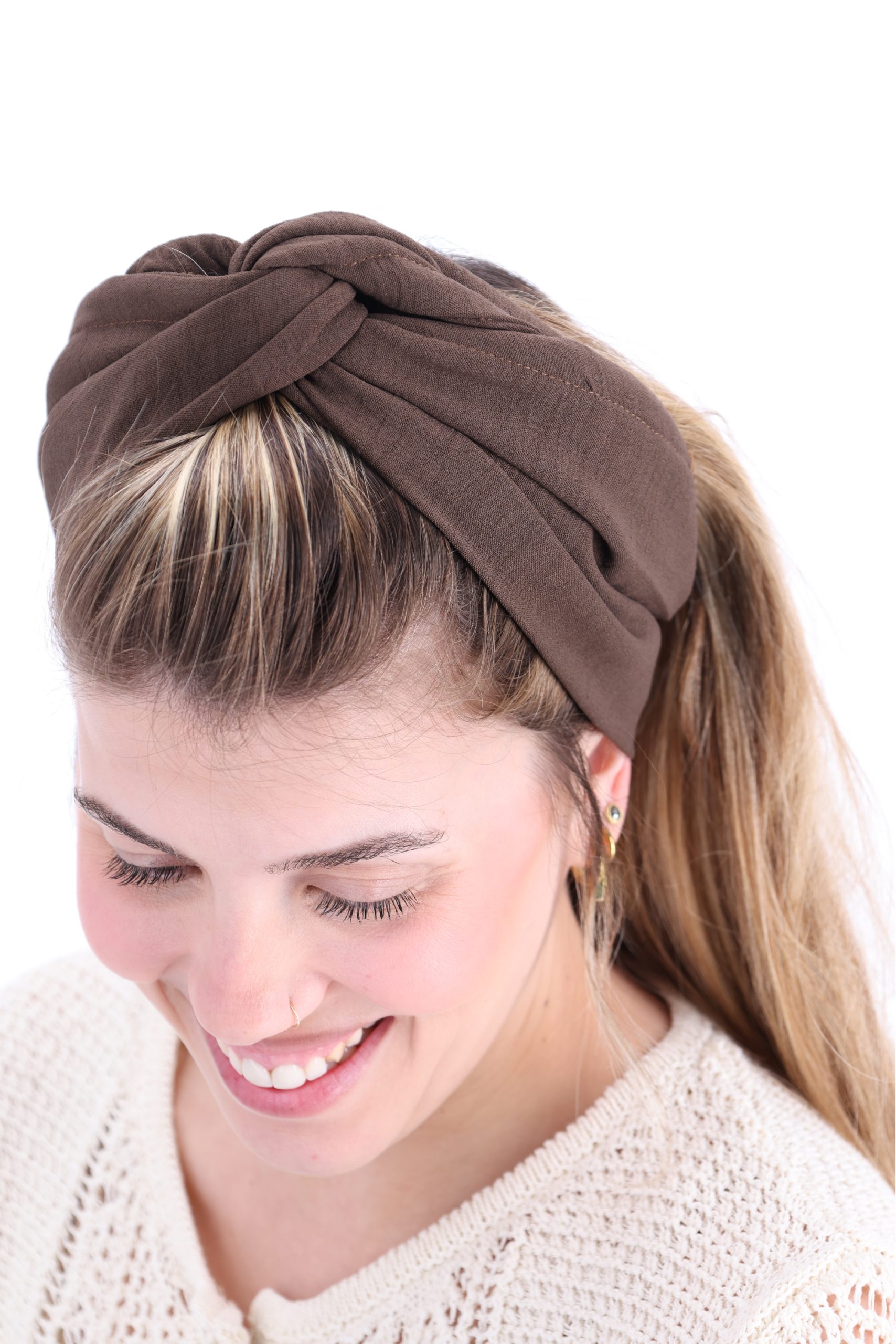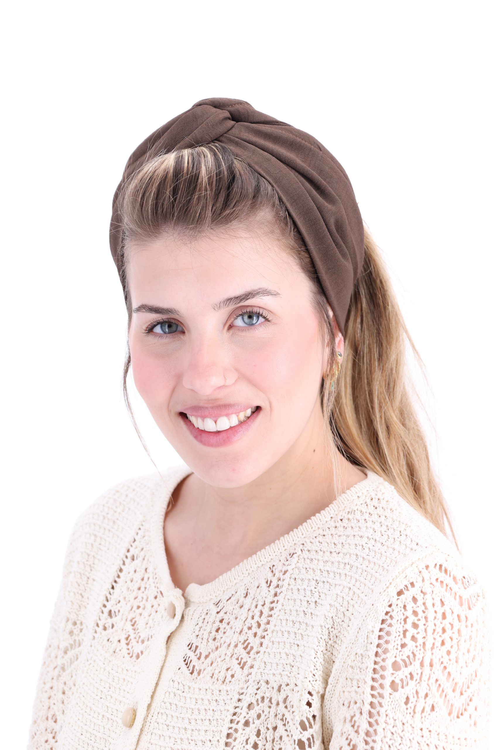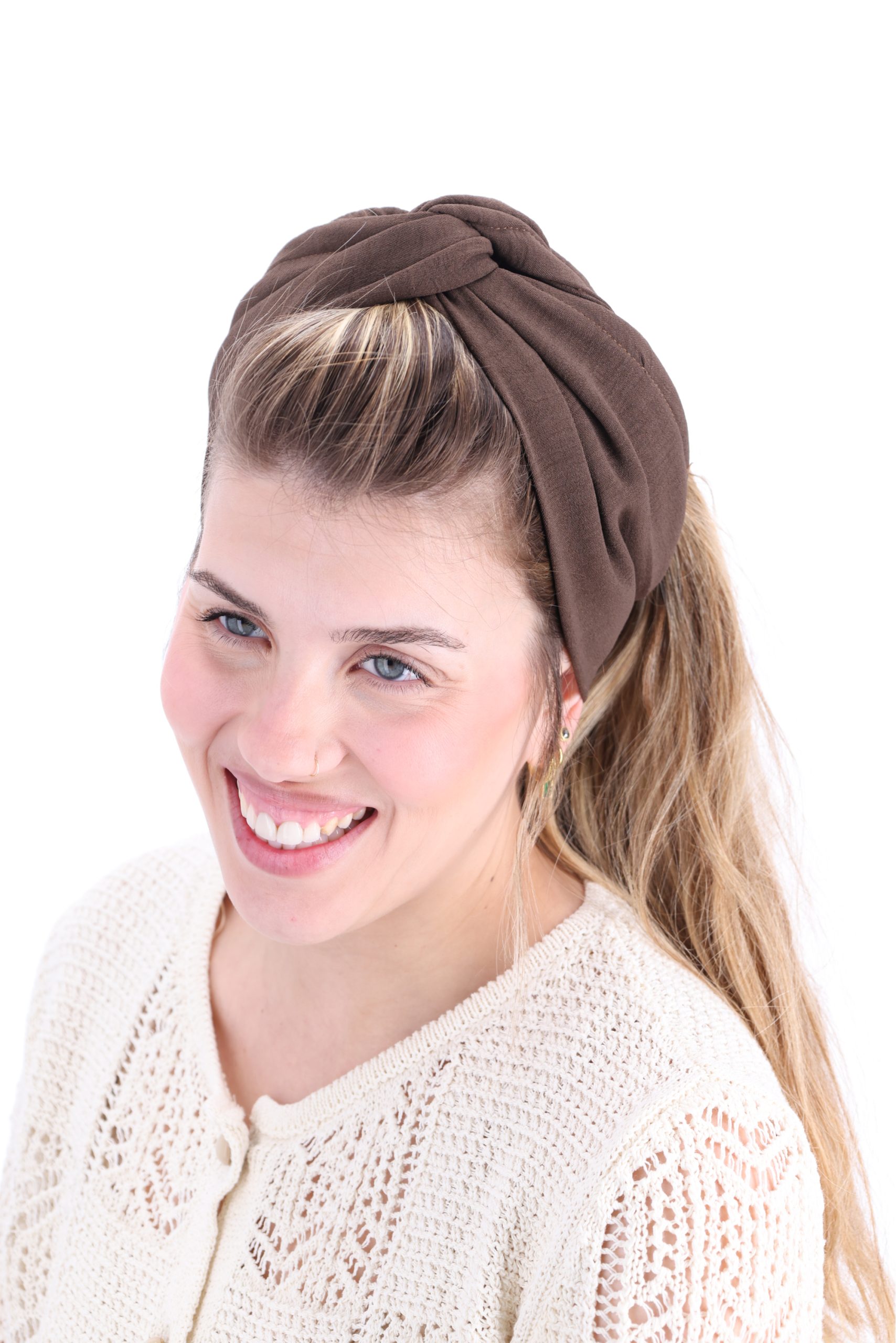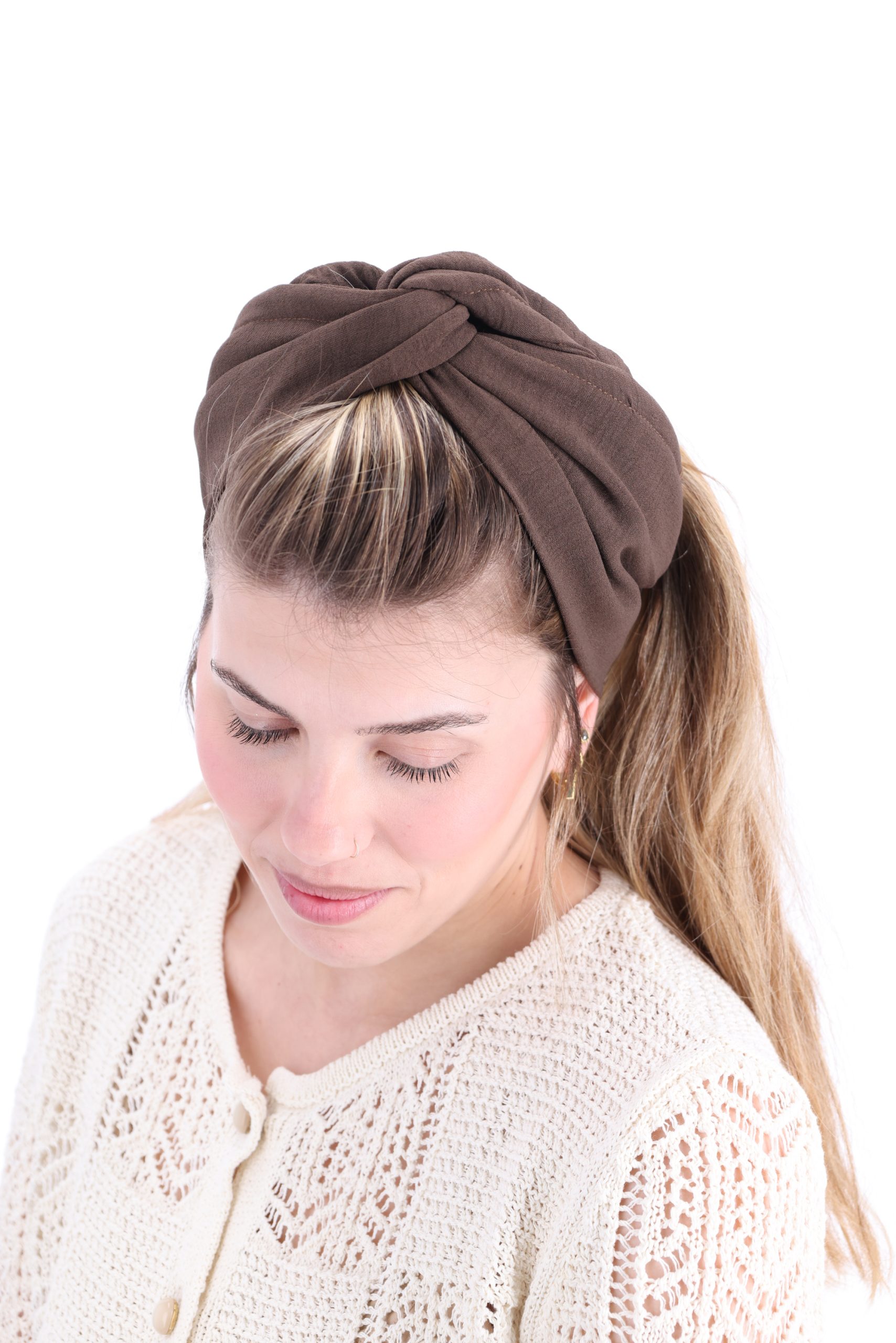 סרט לשיער עם חוט ברזל תפור בפנים ליצירת קשירות מגוונות ופשוטות, מבד כותנה איכותי בצבע חום עמוק