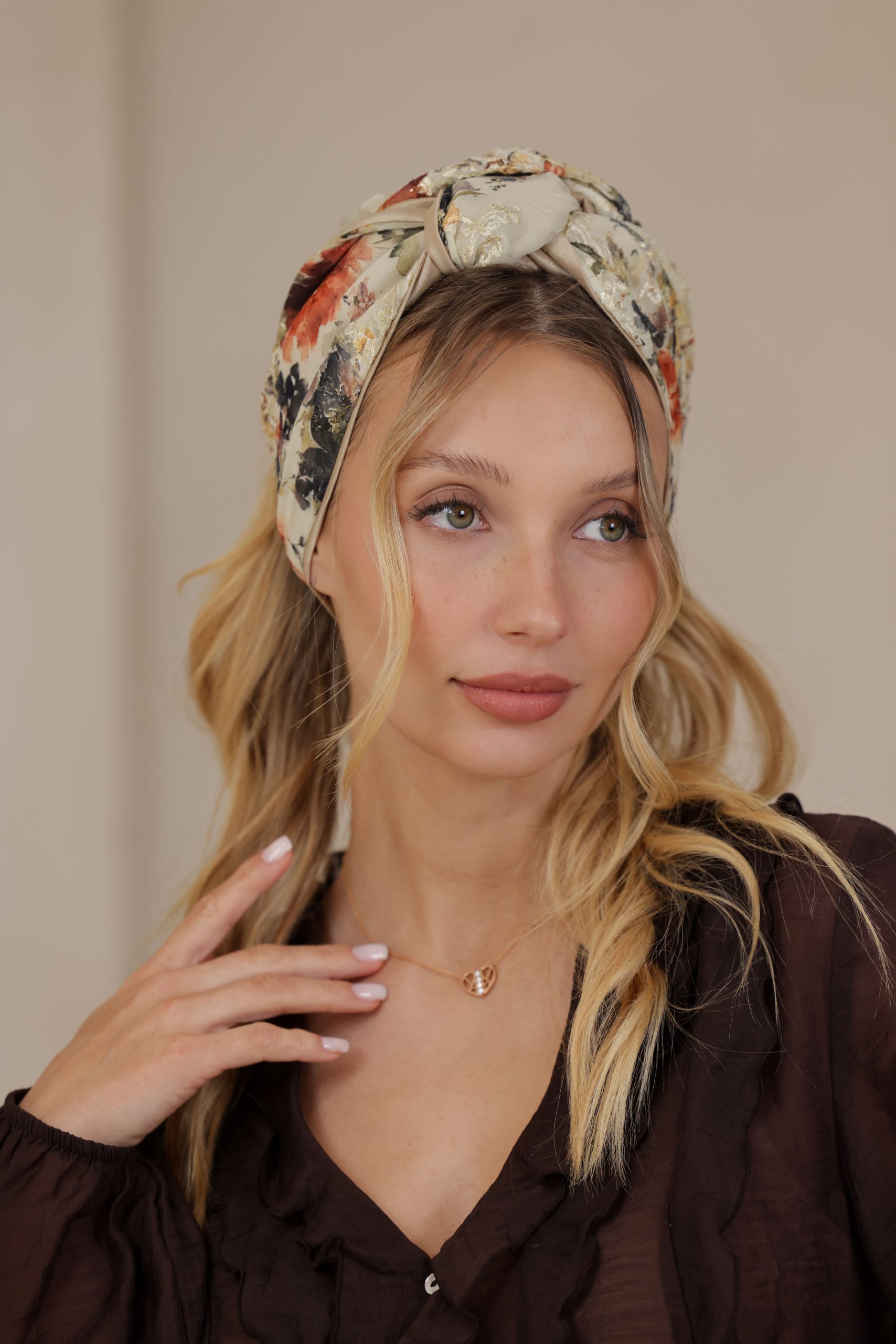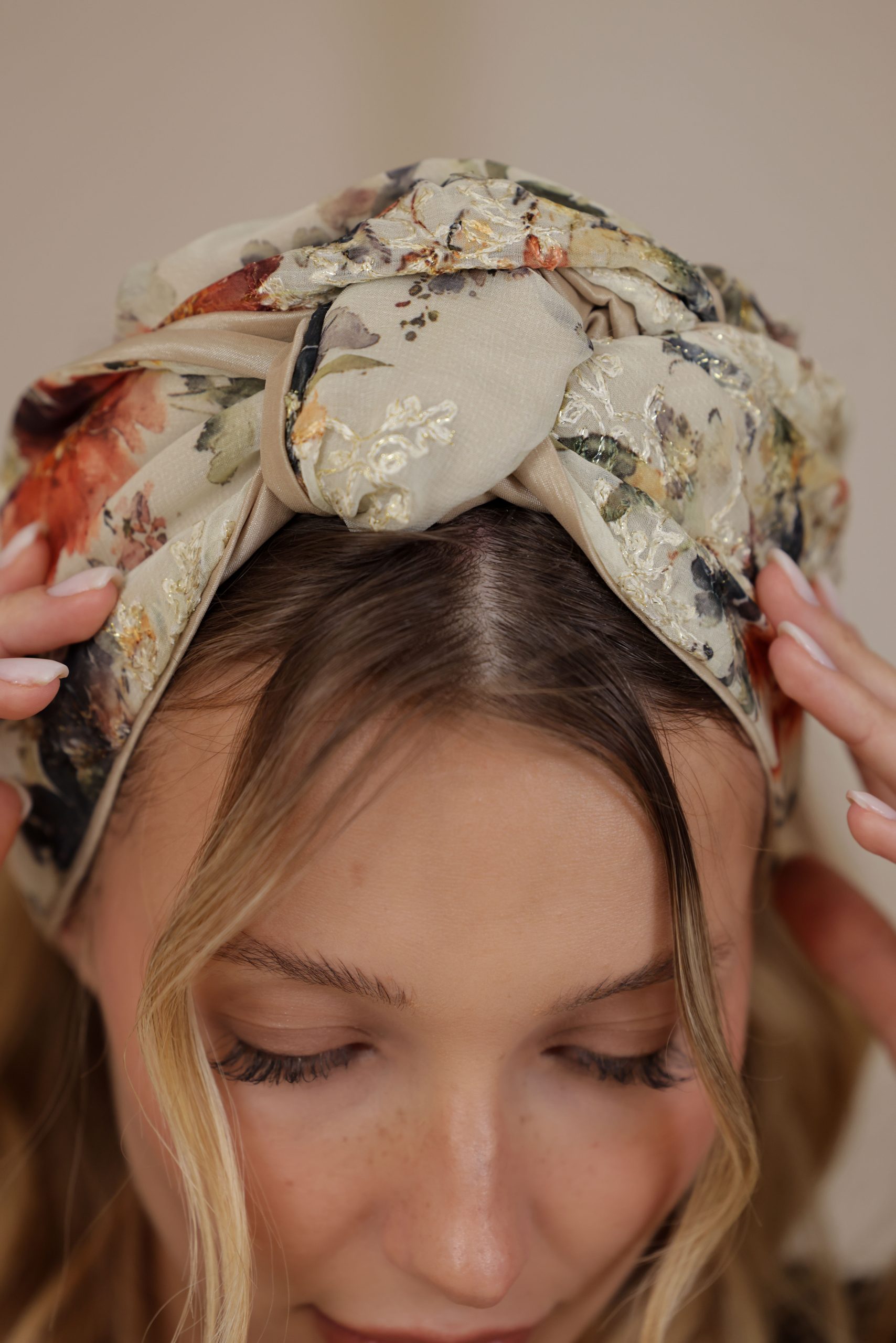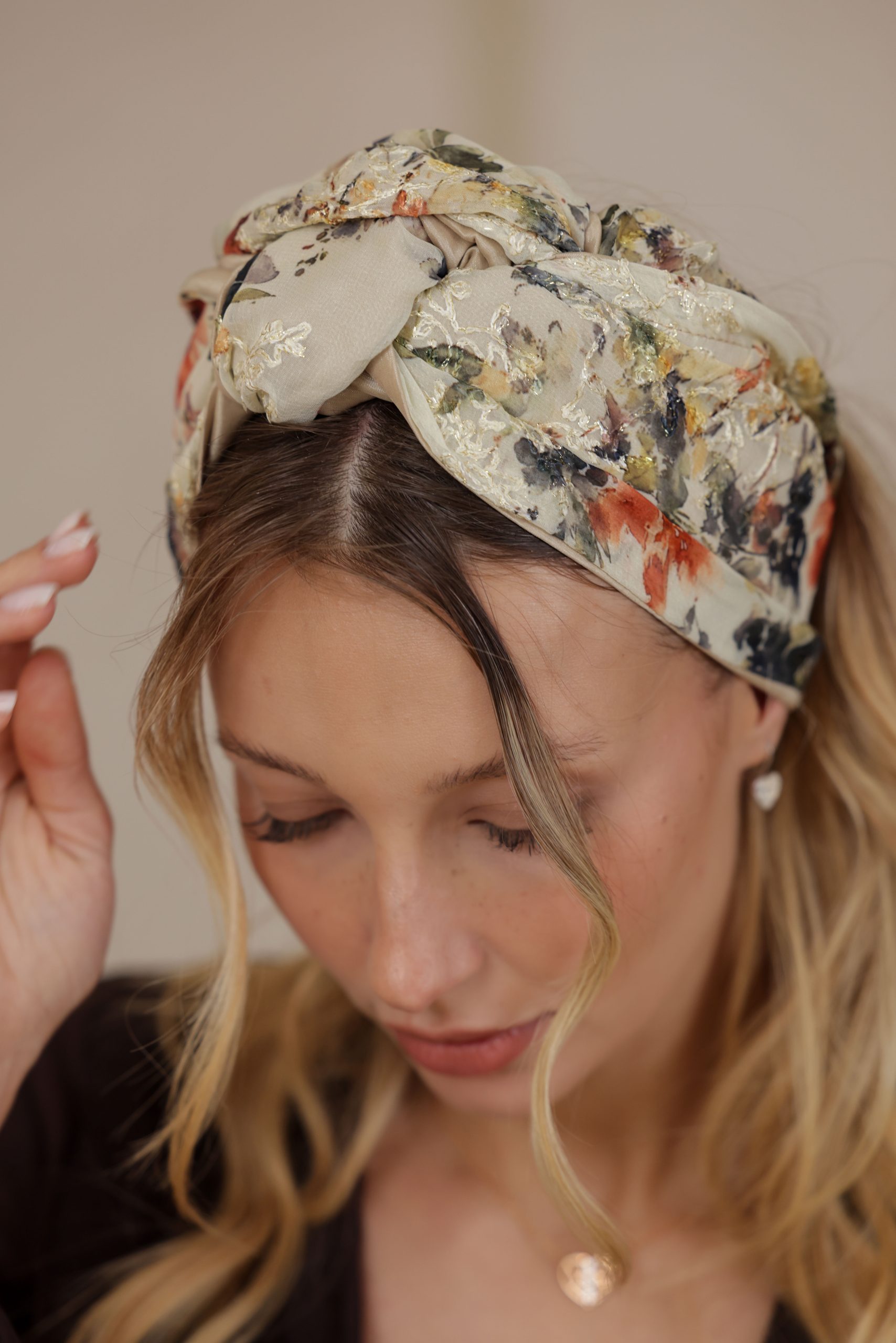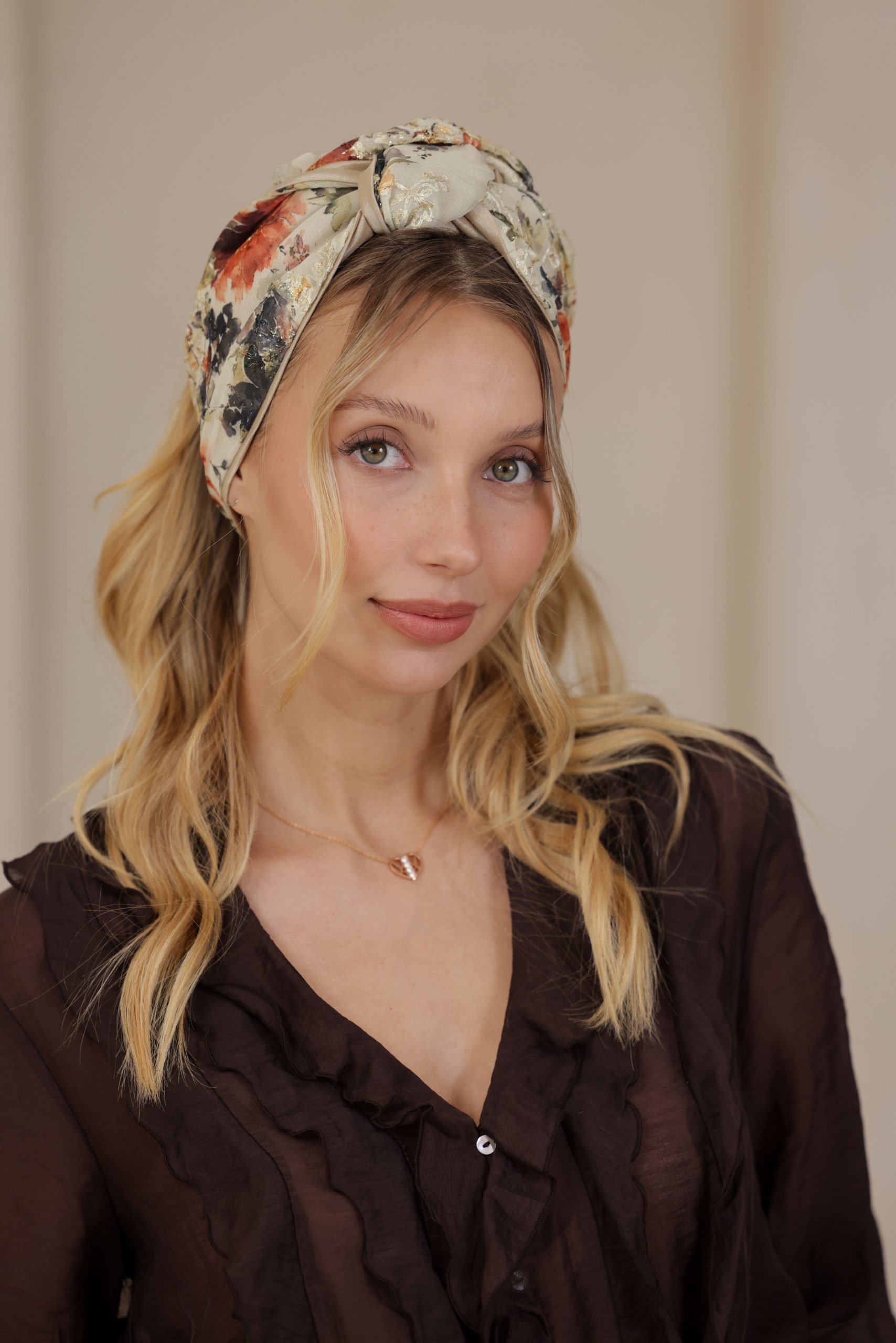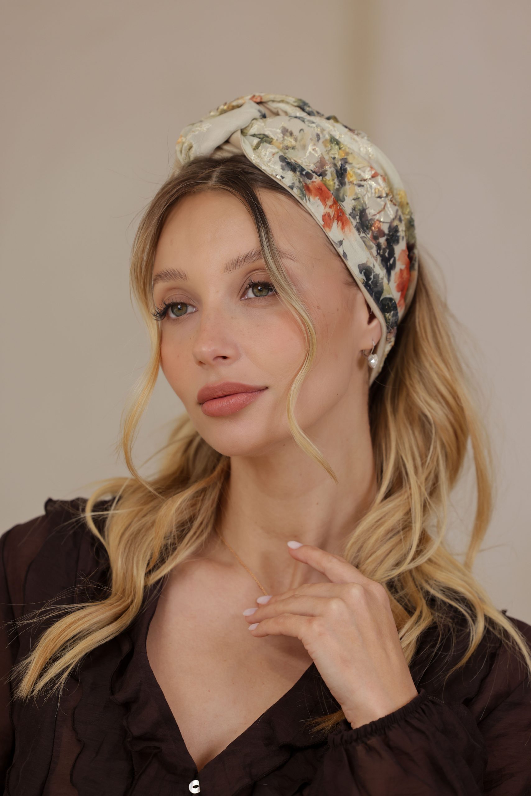 סרט לשיער עם חוט ברזל תפור בפנים ליצירת קשירות מגוונות ופשוטות, משני בדים יחודיים מצד אחד בד שיפון בהדפס פרחונים עם רקמה מחוט זהב ומהצד השני בד טפט בגוון זהב עדין