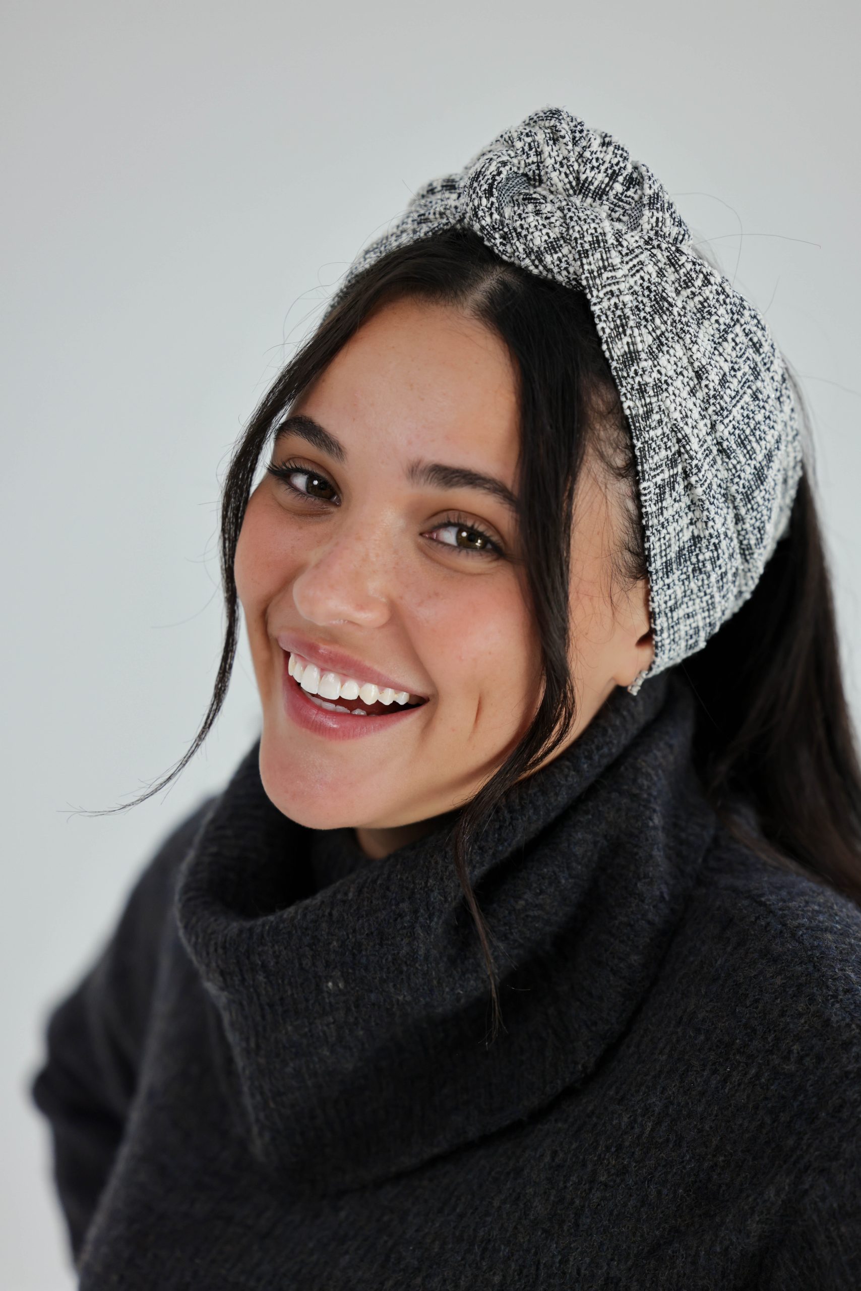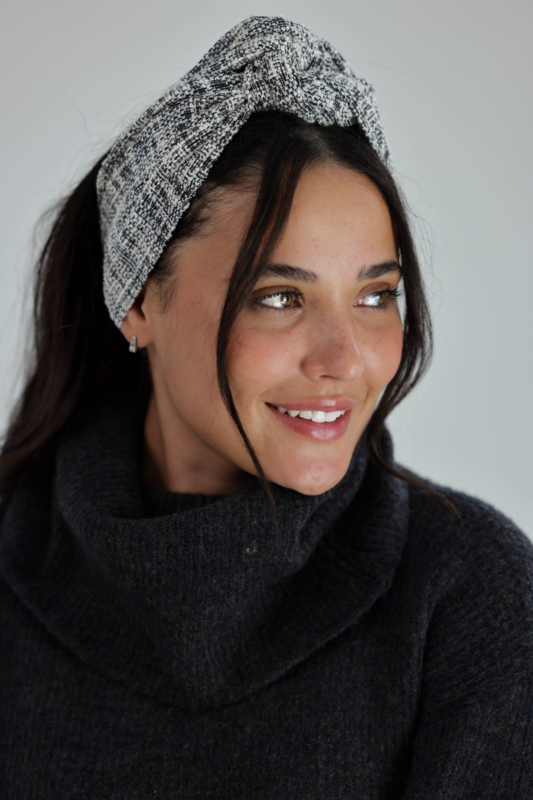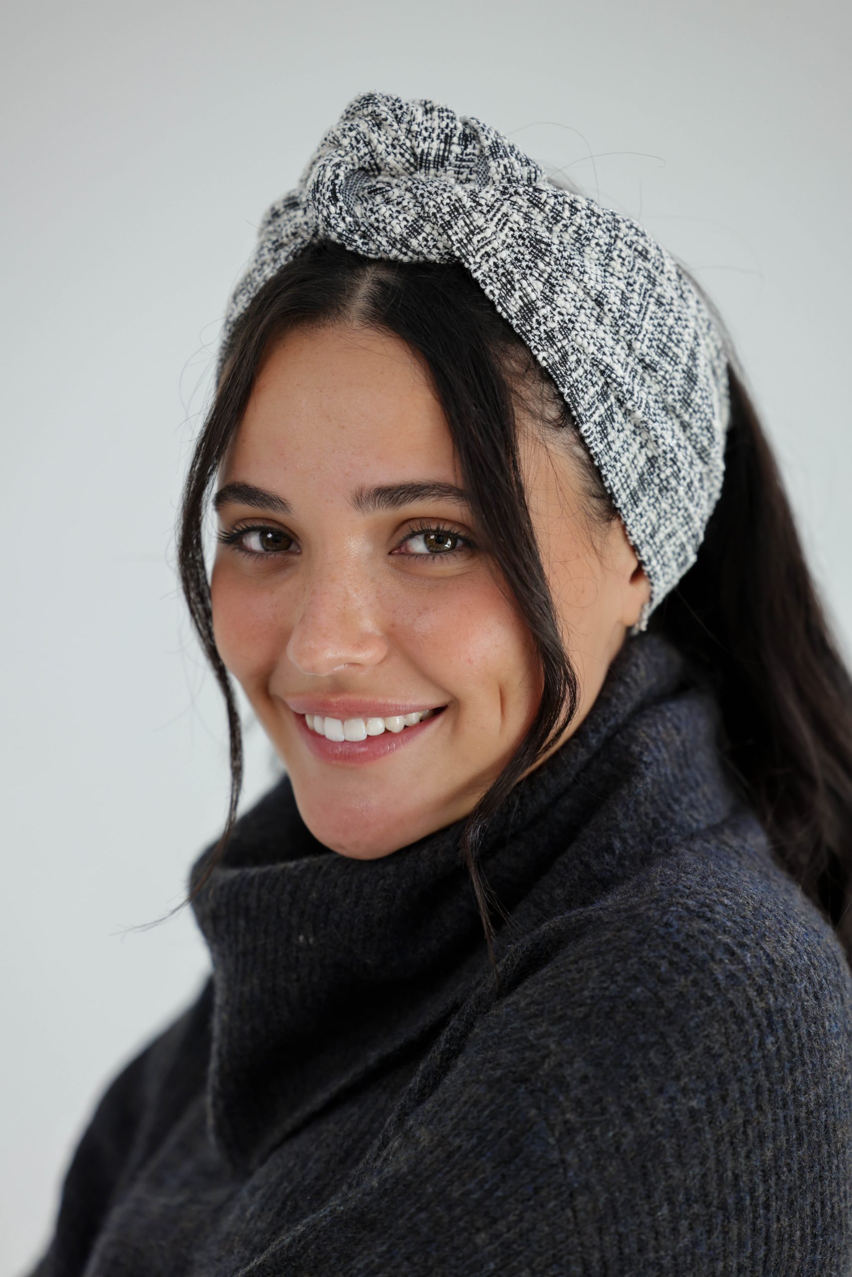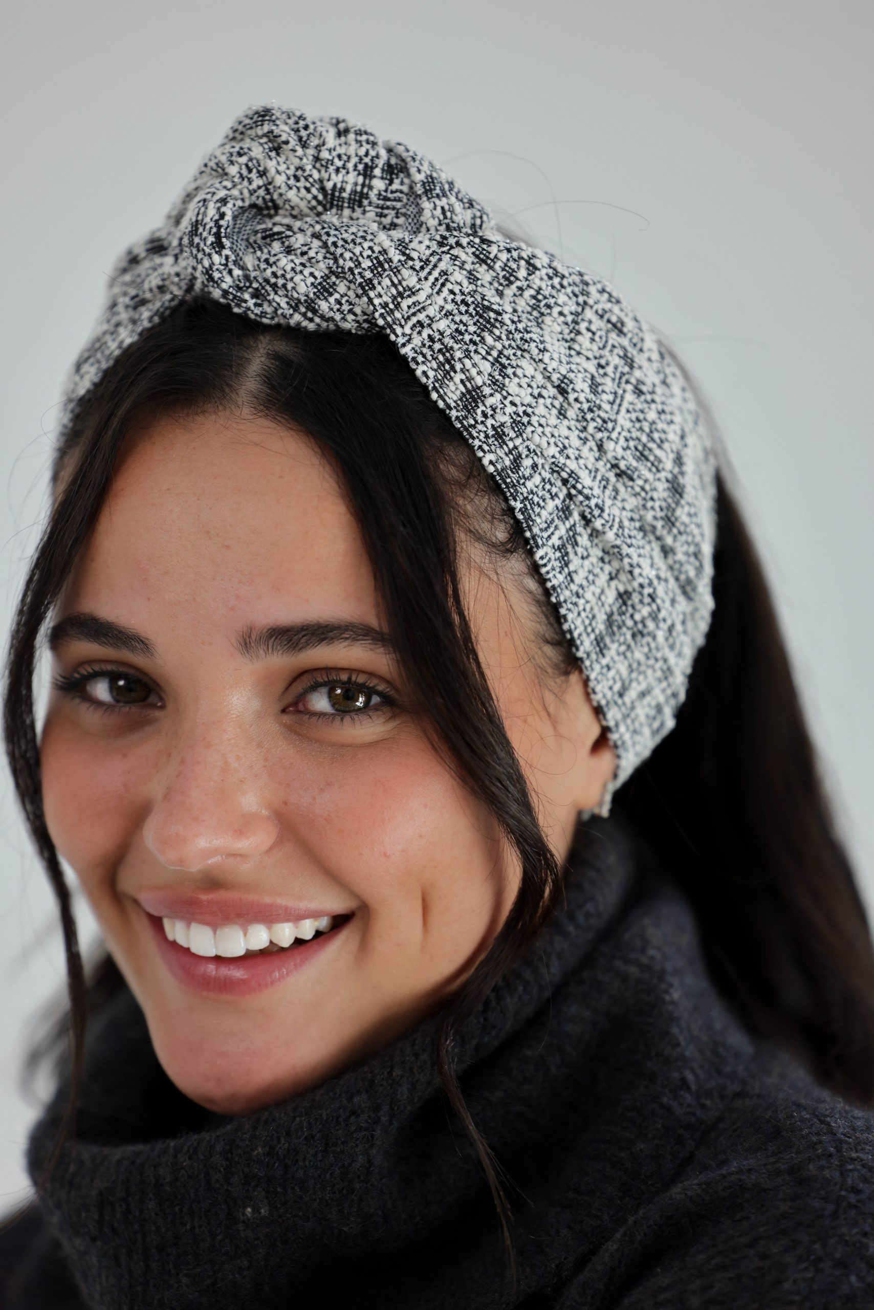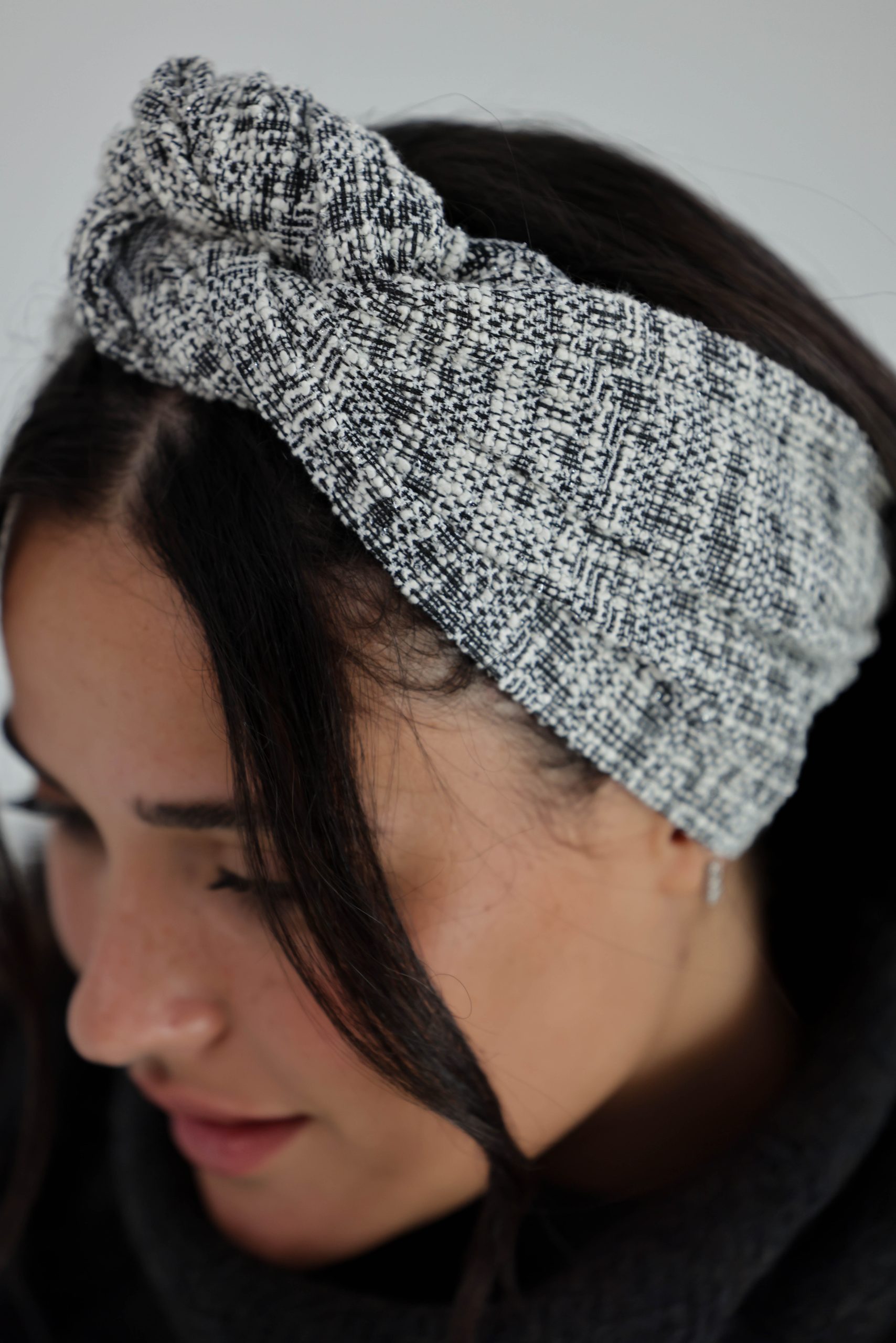סרט לשיער עם חוט ברזל תפור בפנים ליצירת קשירות מגוונות ופשוטות, בד באריגת שתי ועבר בגווני שחור לבן.