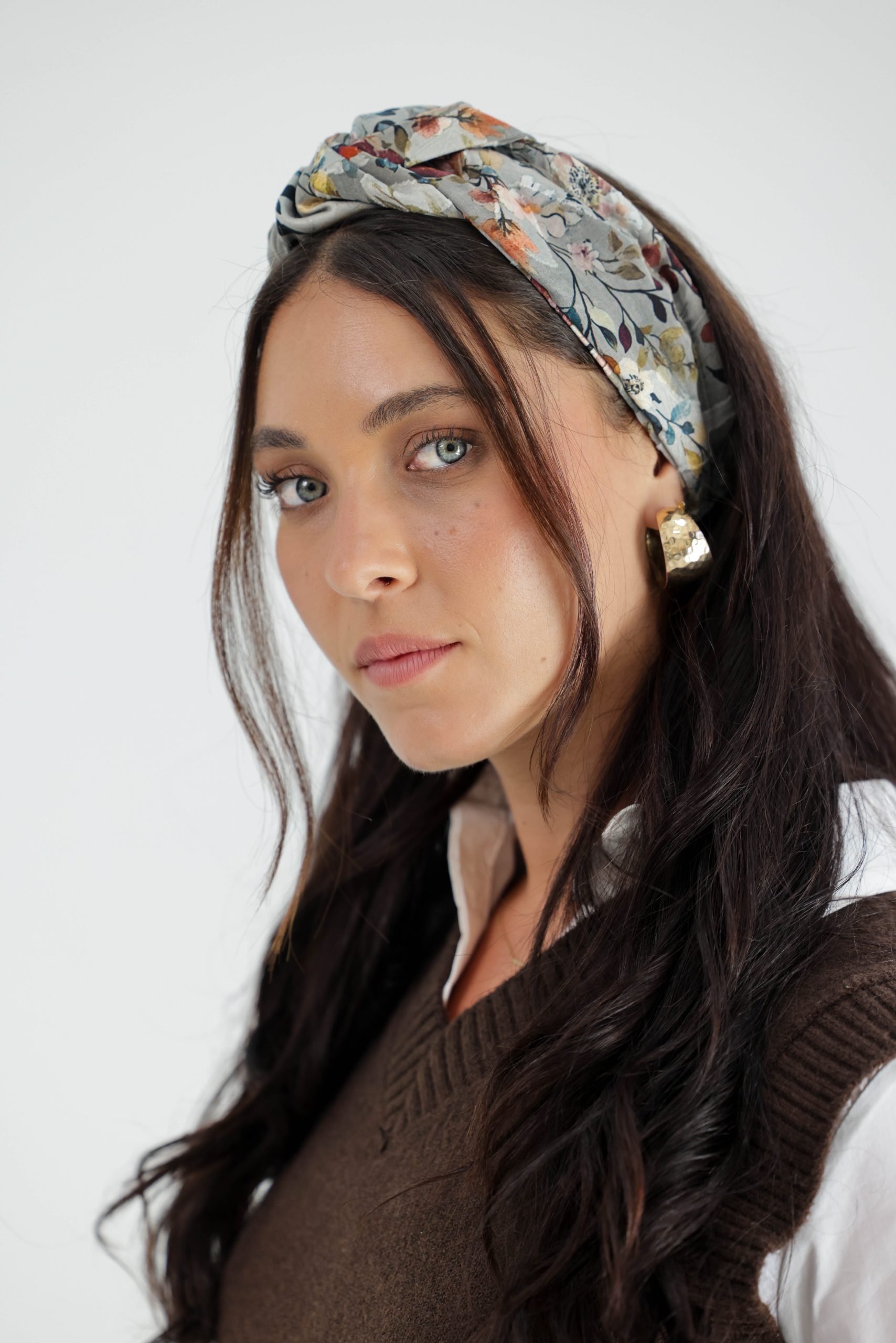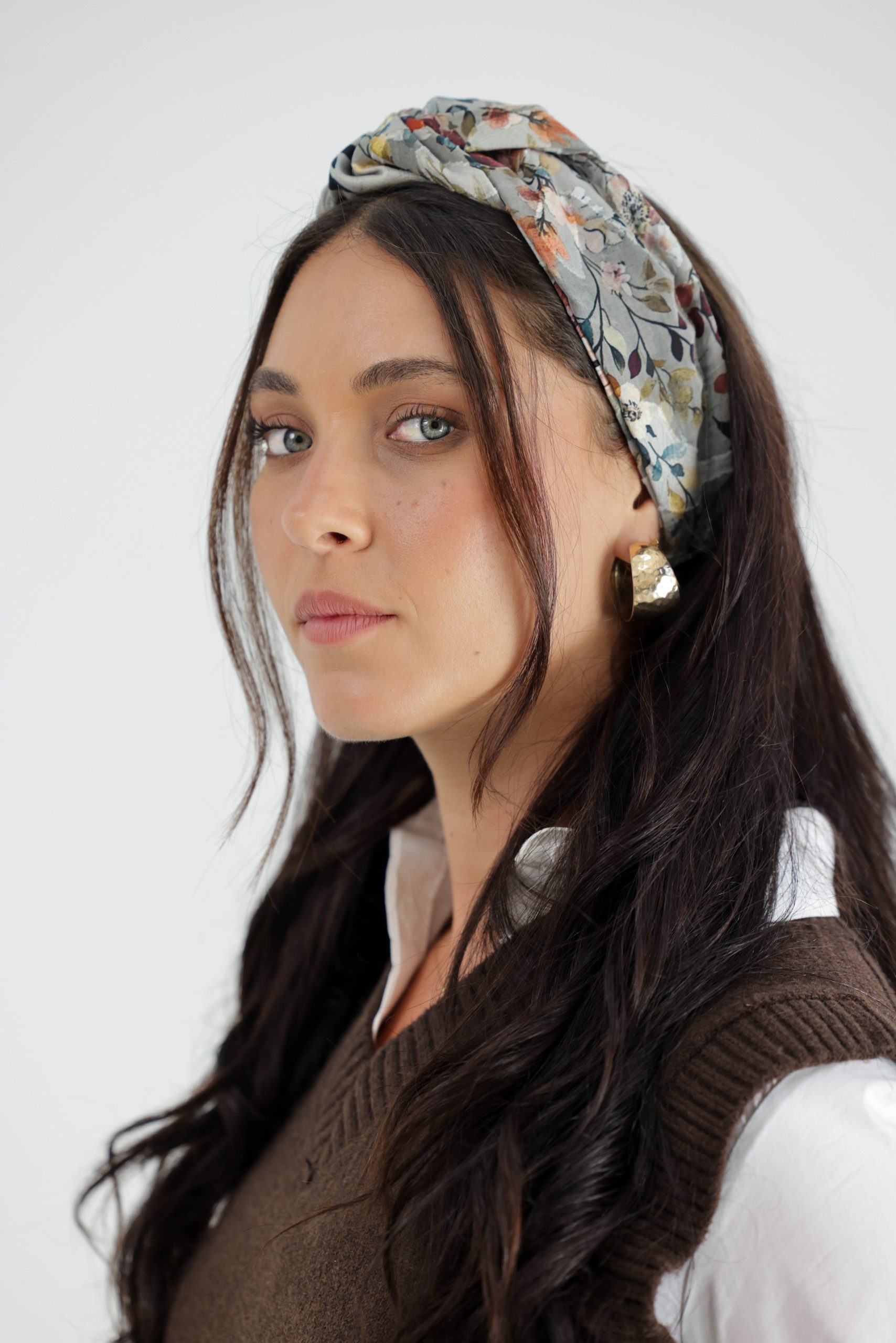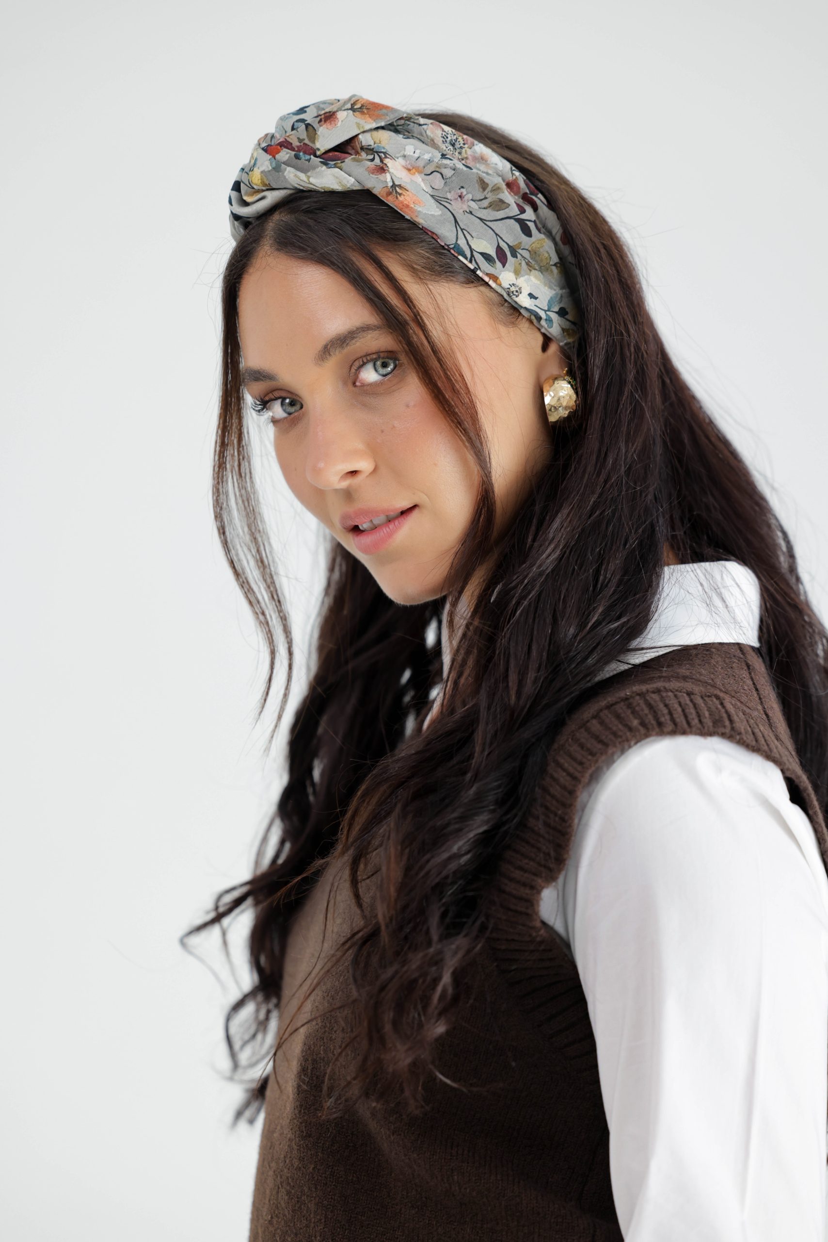 סרט לשיער עם חוט ברזל תפור בפנים ליצירת קשירות מגוונות ופשוטות, מבד שיפון בטקסטורת עלים לבנים עם הדפס פרחים סגול ירוק וורוד צהוב.