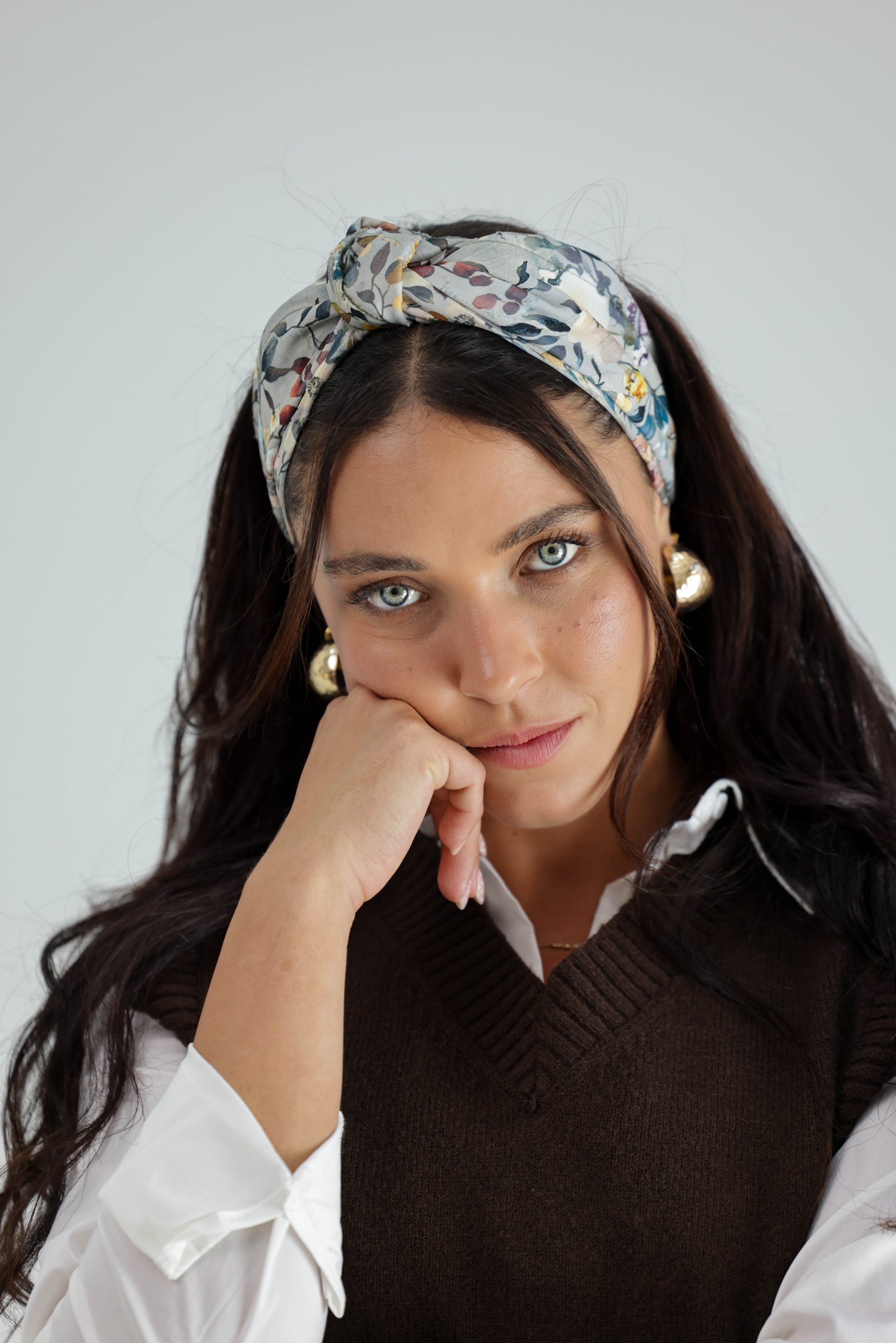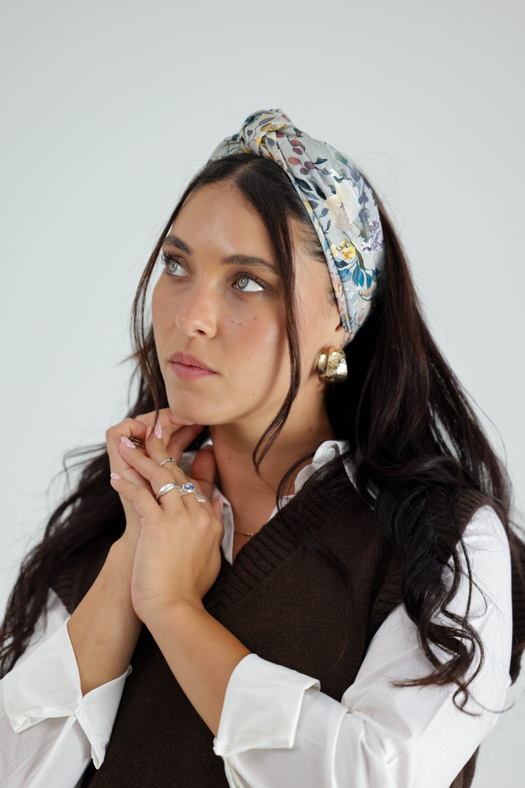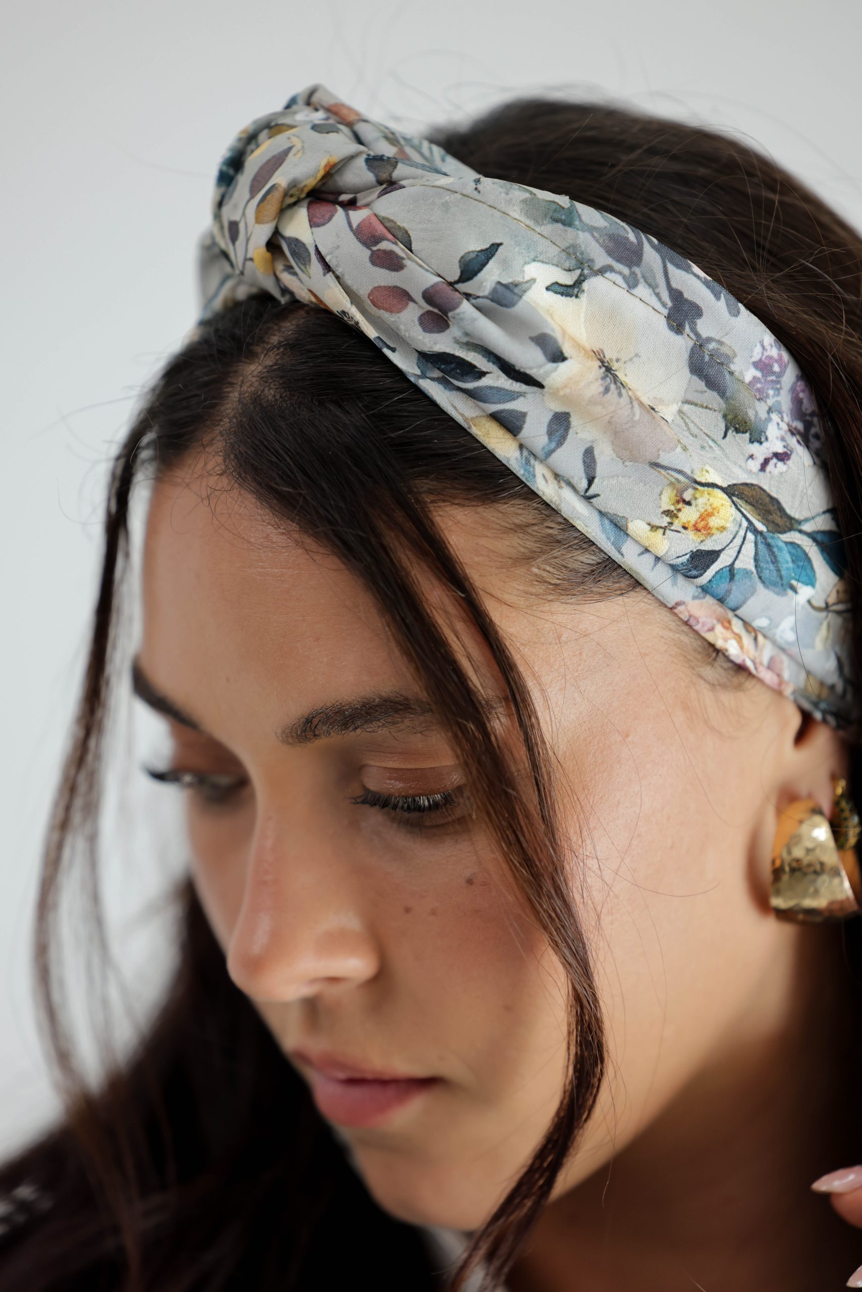 סרט לשיער עם חוט ברזל תפור בפנים ליצירת קשירות מגוונות ופשוטות, מבד שיפון בטקסטורת עלים לבנים עם הדפס פרחים סגול ירוק וורוד צהוב.