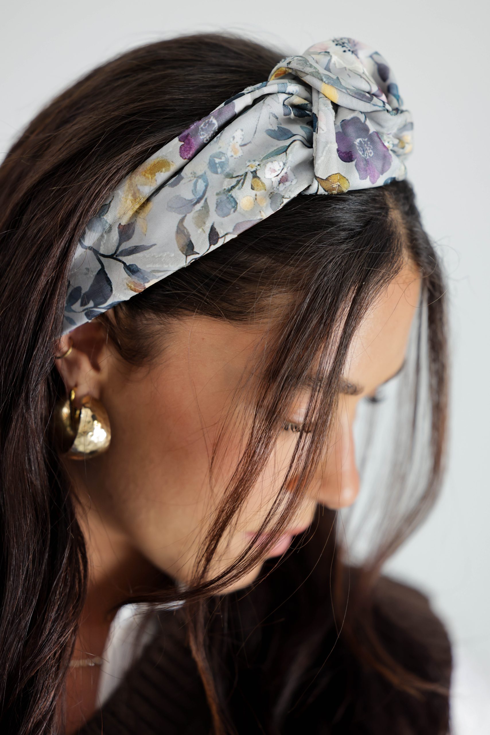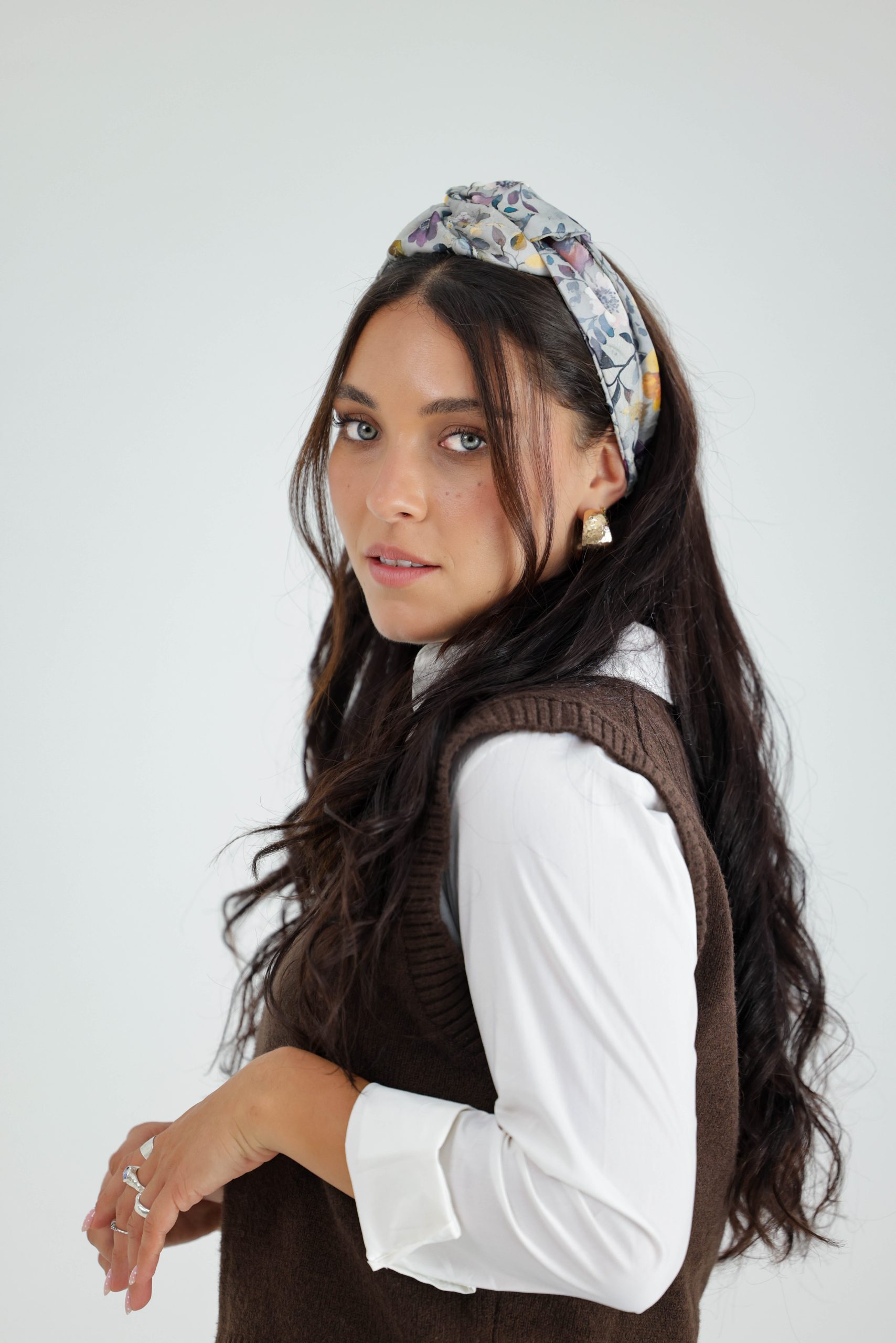 קשת לשיער עם חוט ברזל תפור בפנים ליצירת קשירות מגוונות ופשוטות, מבד שיפון בטקסטורת עלים לבנים עם הדפס פרחים סגול ירוק וורוד צהוב.