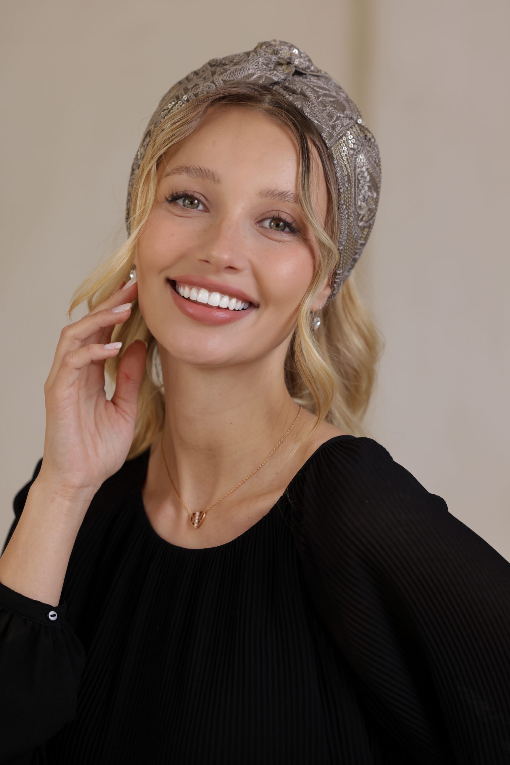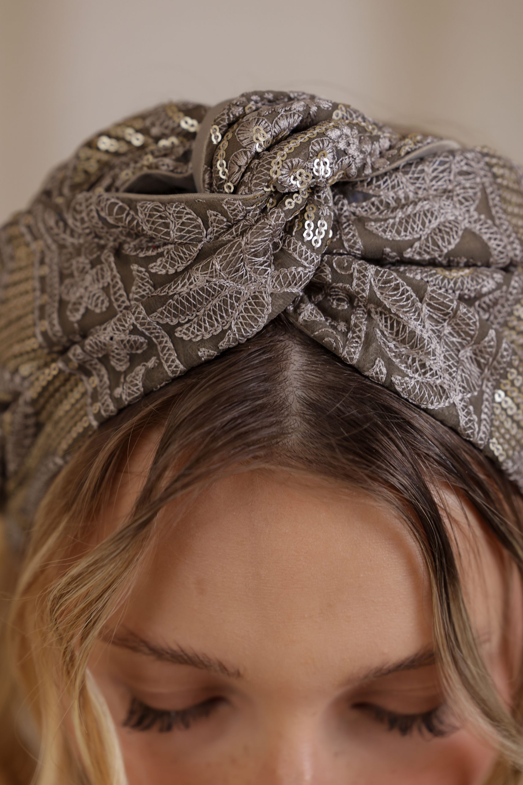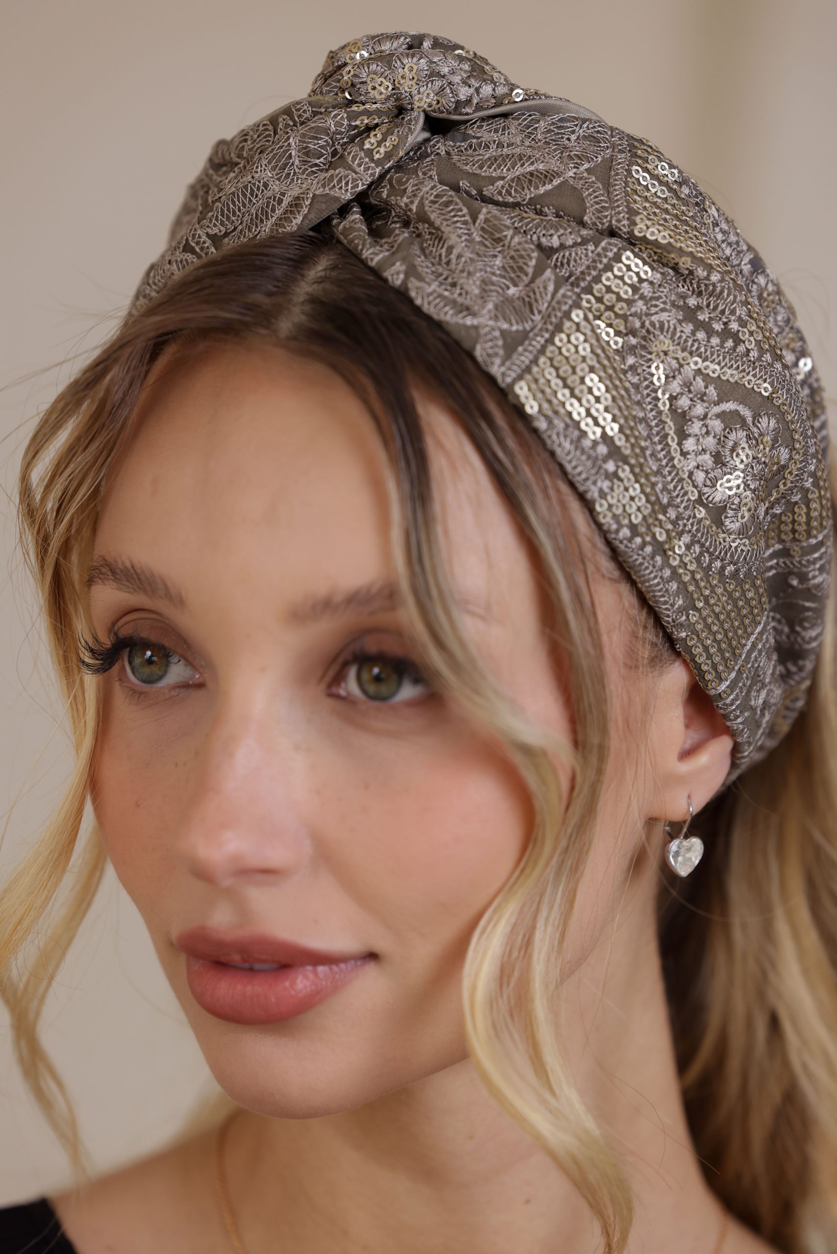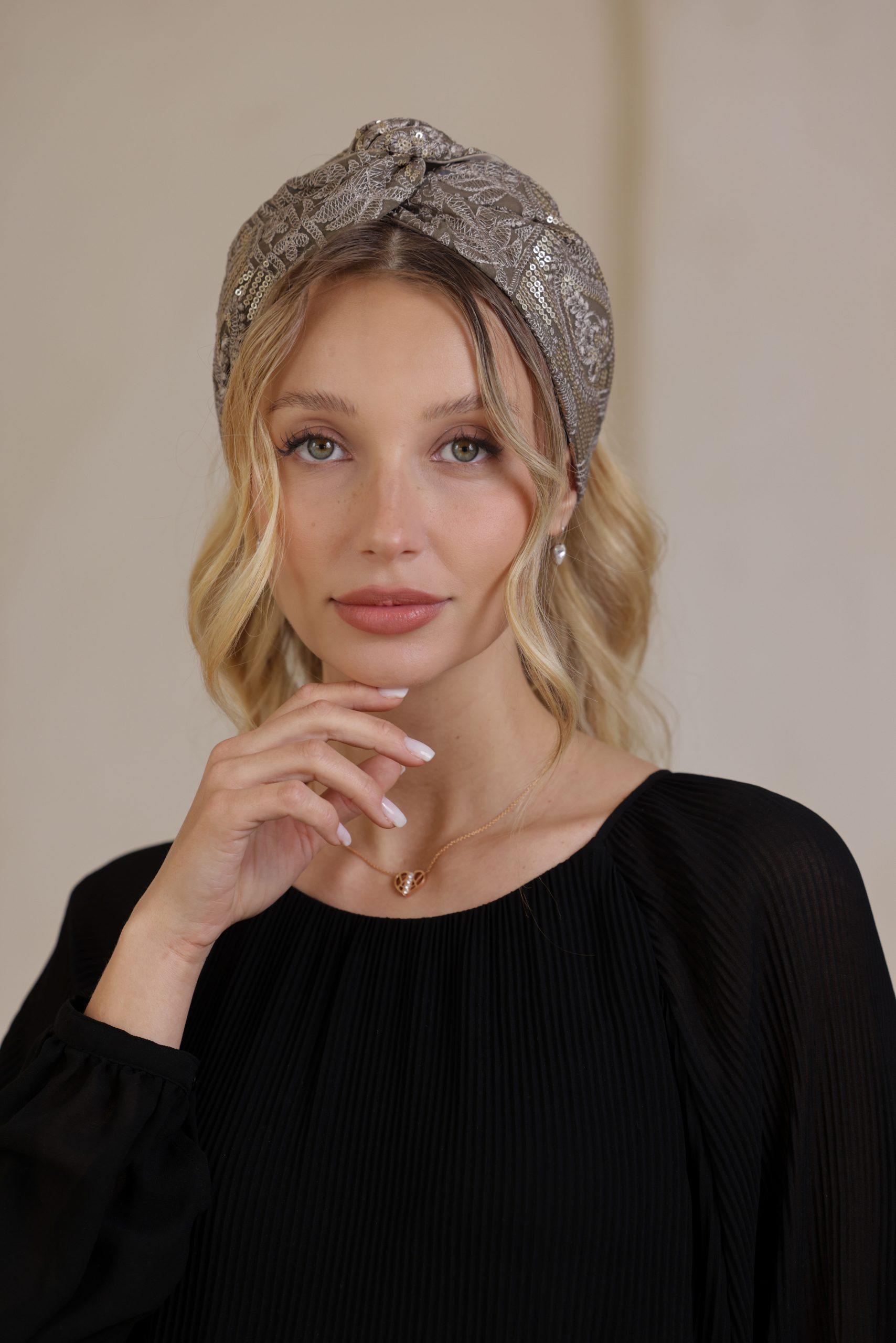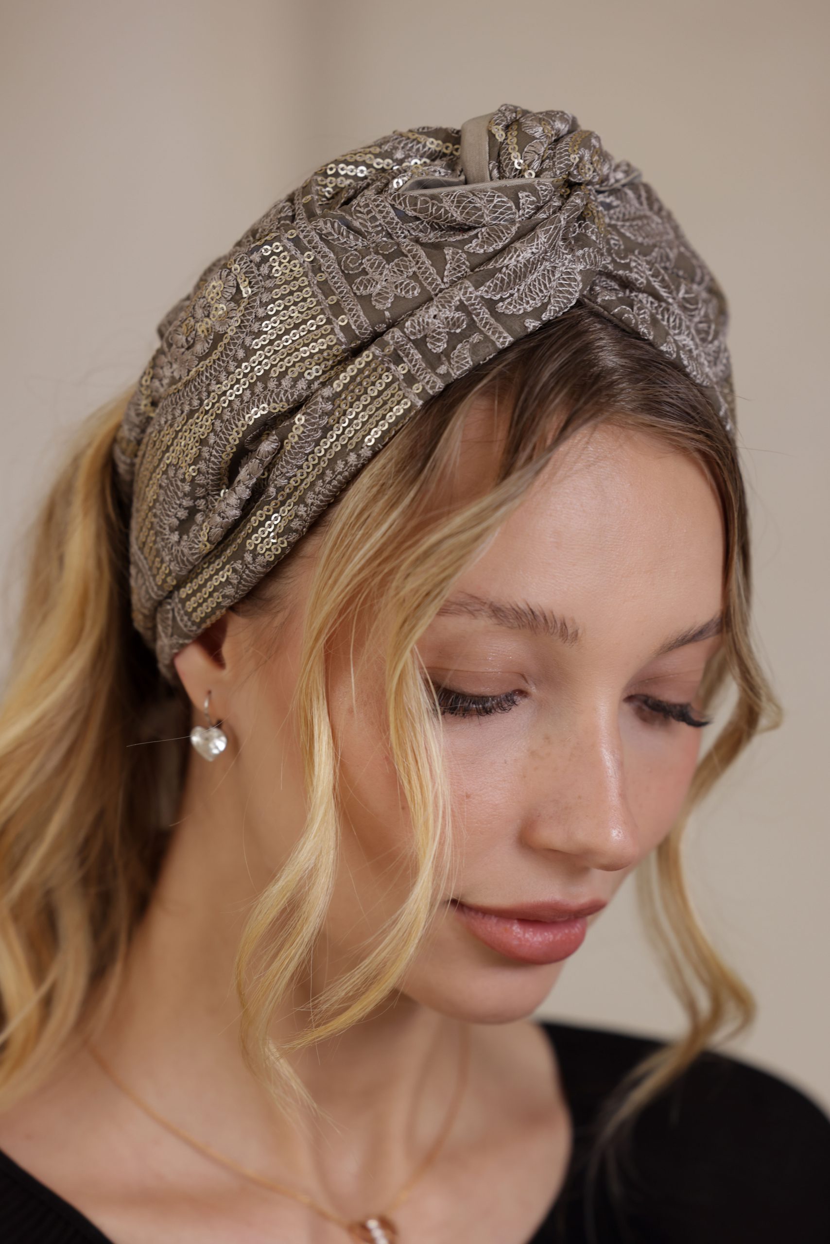 סרט לשיער עם חוט ברזל תפור בפנים ליצירת קשירות מגוונות ופשוטות, מבד שיפון עם ריקמת זהב עדינה בשילוב פייטים.