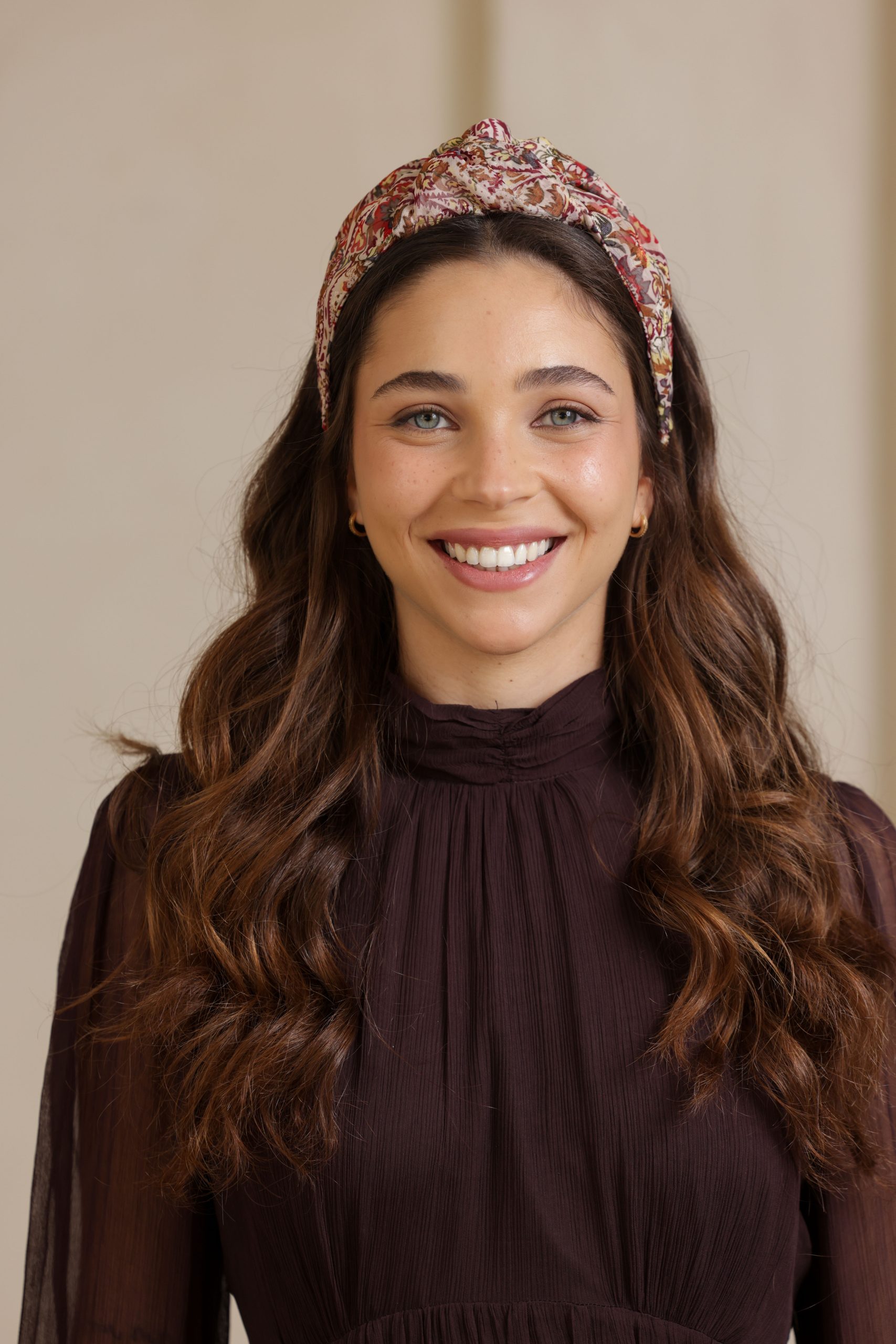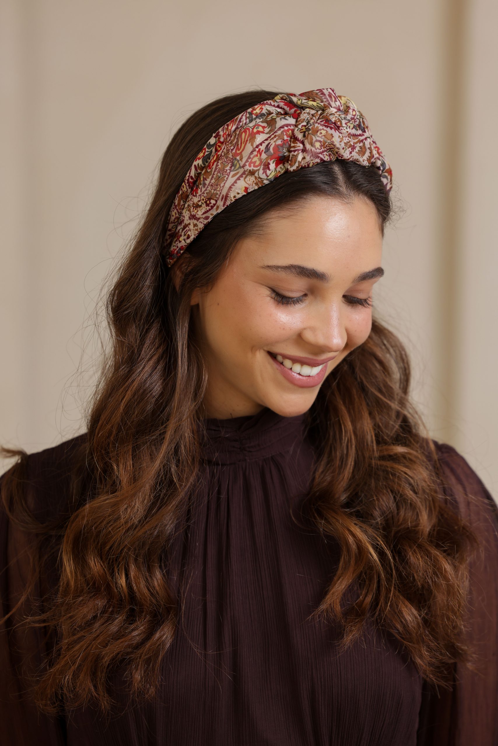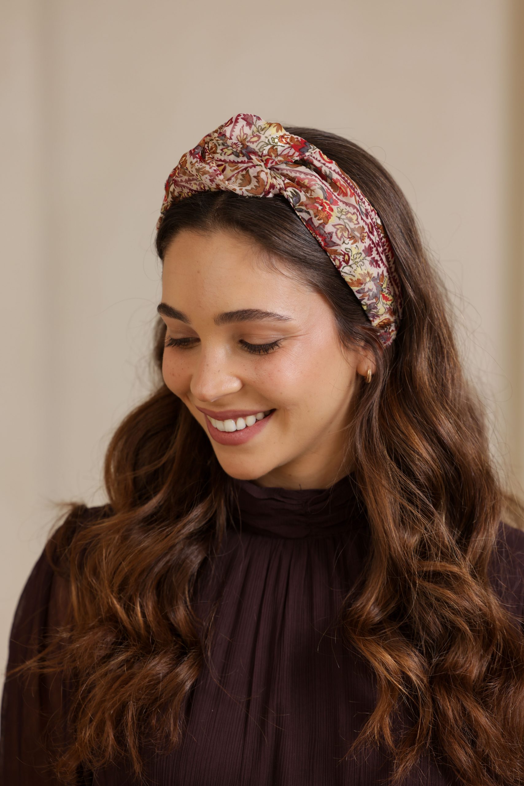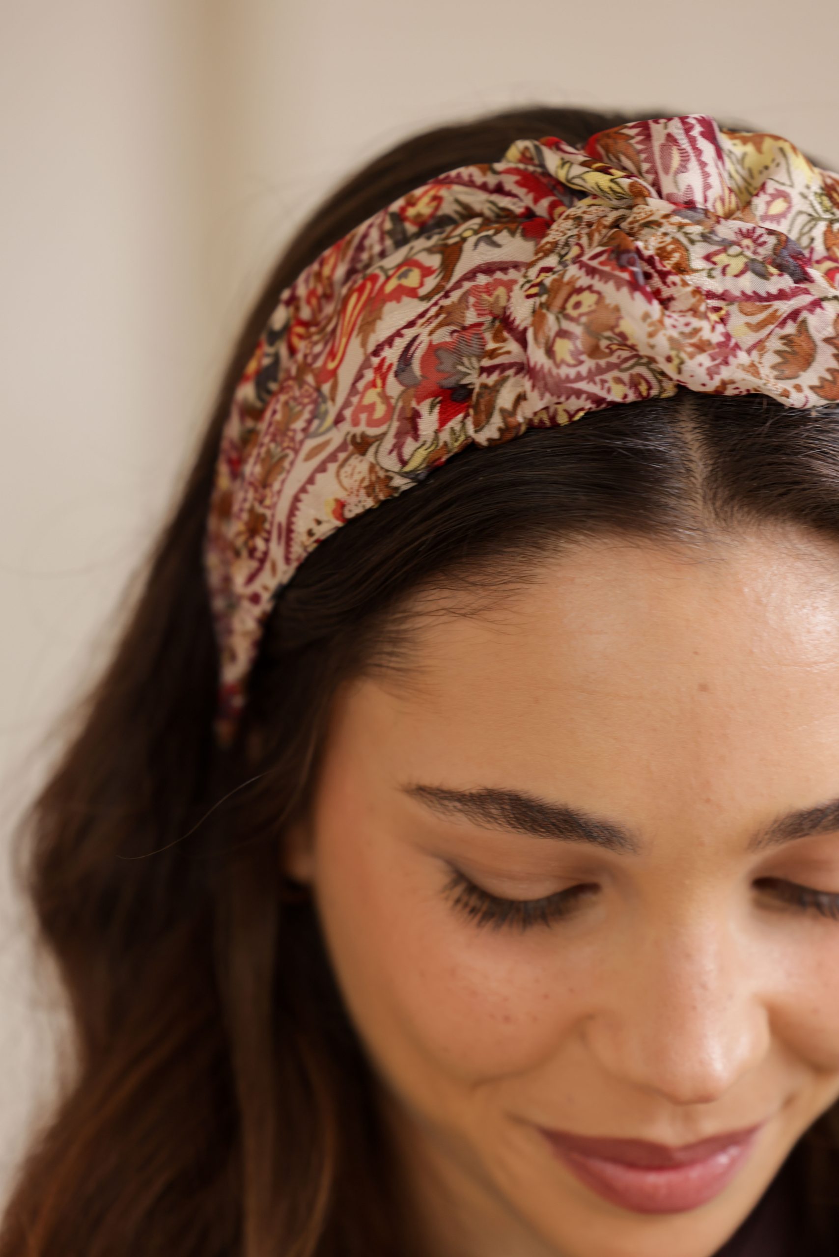 קשת לשיער עם חוט ברזל תפור בפנים, מבד שיפון בהדפס עם עיטורים בשלל צבעים