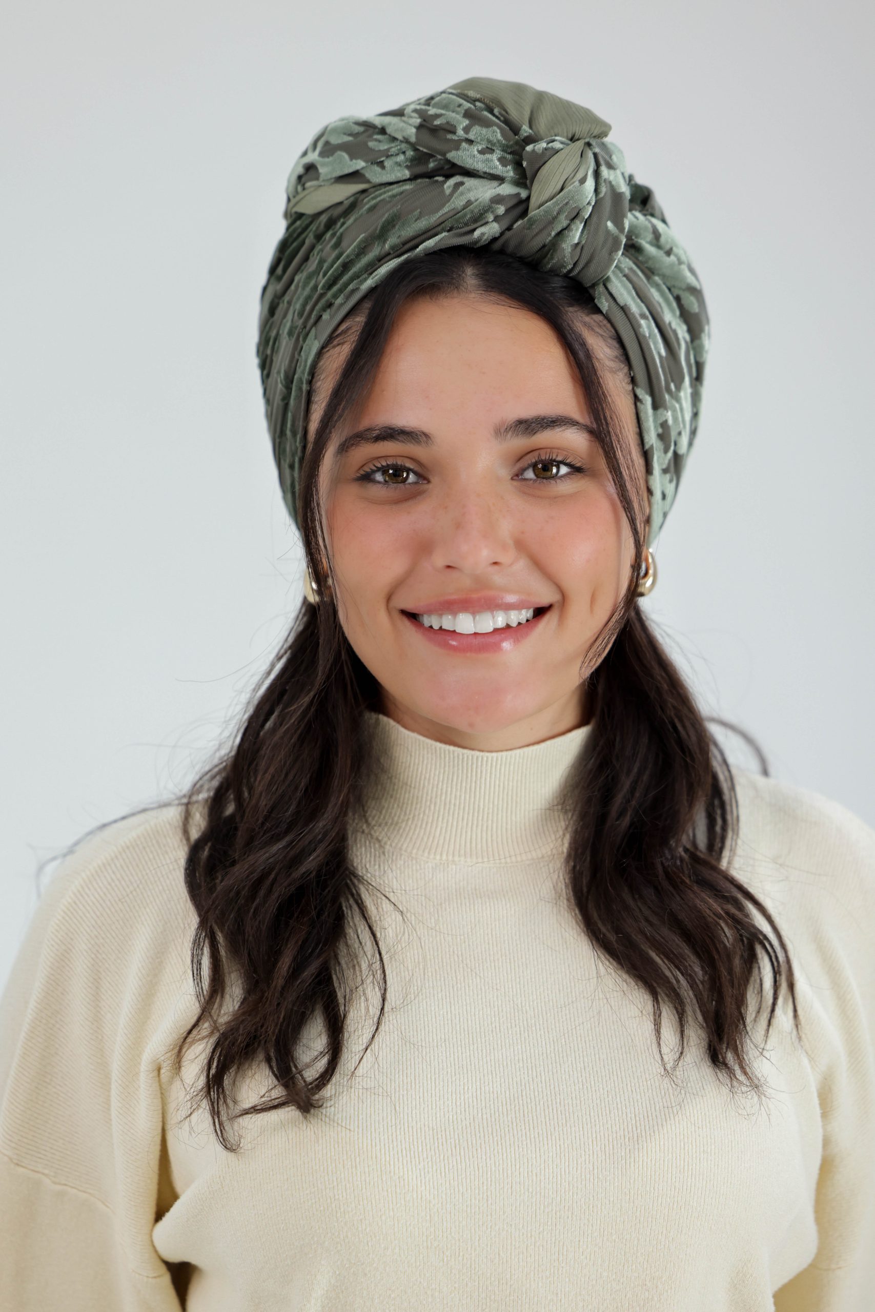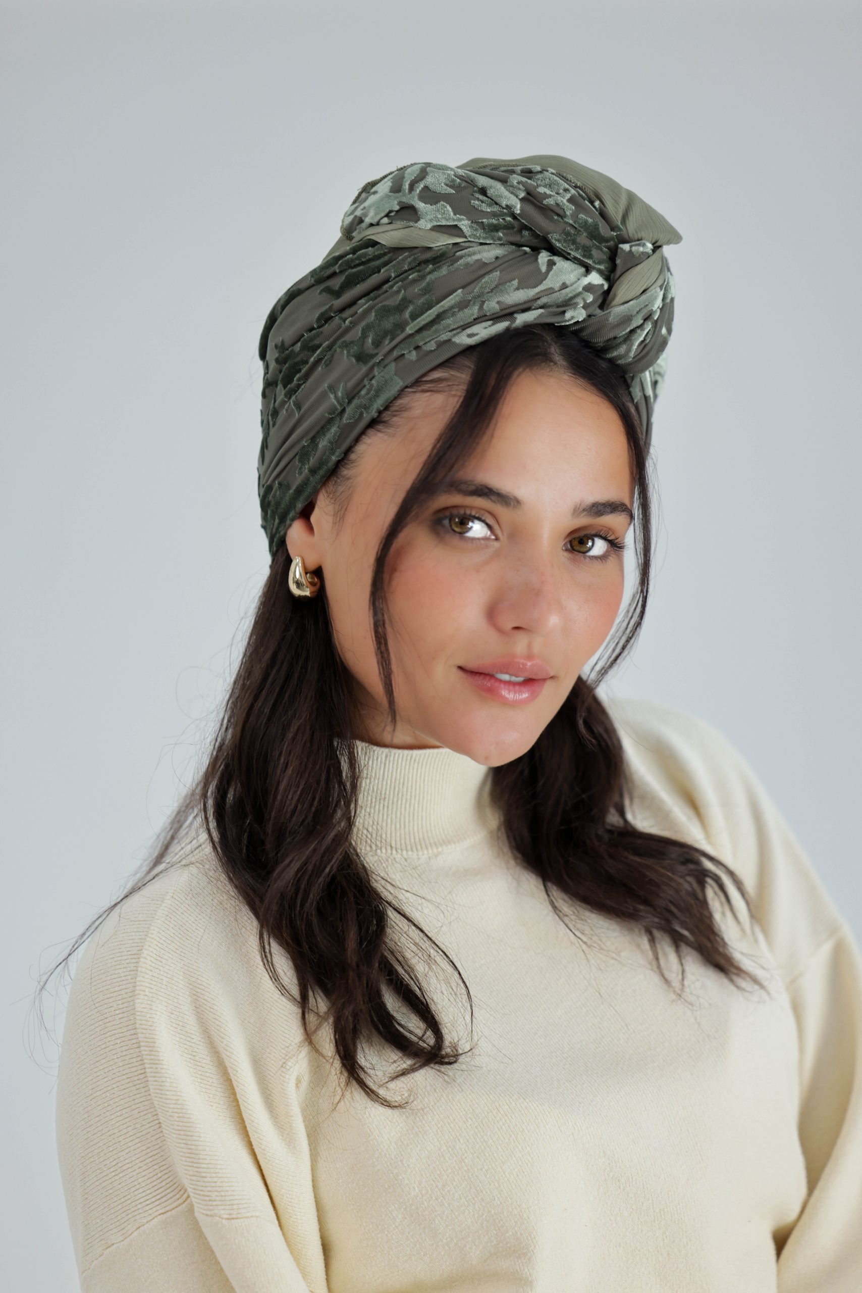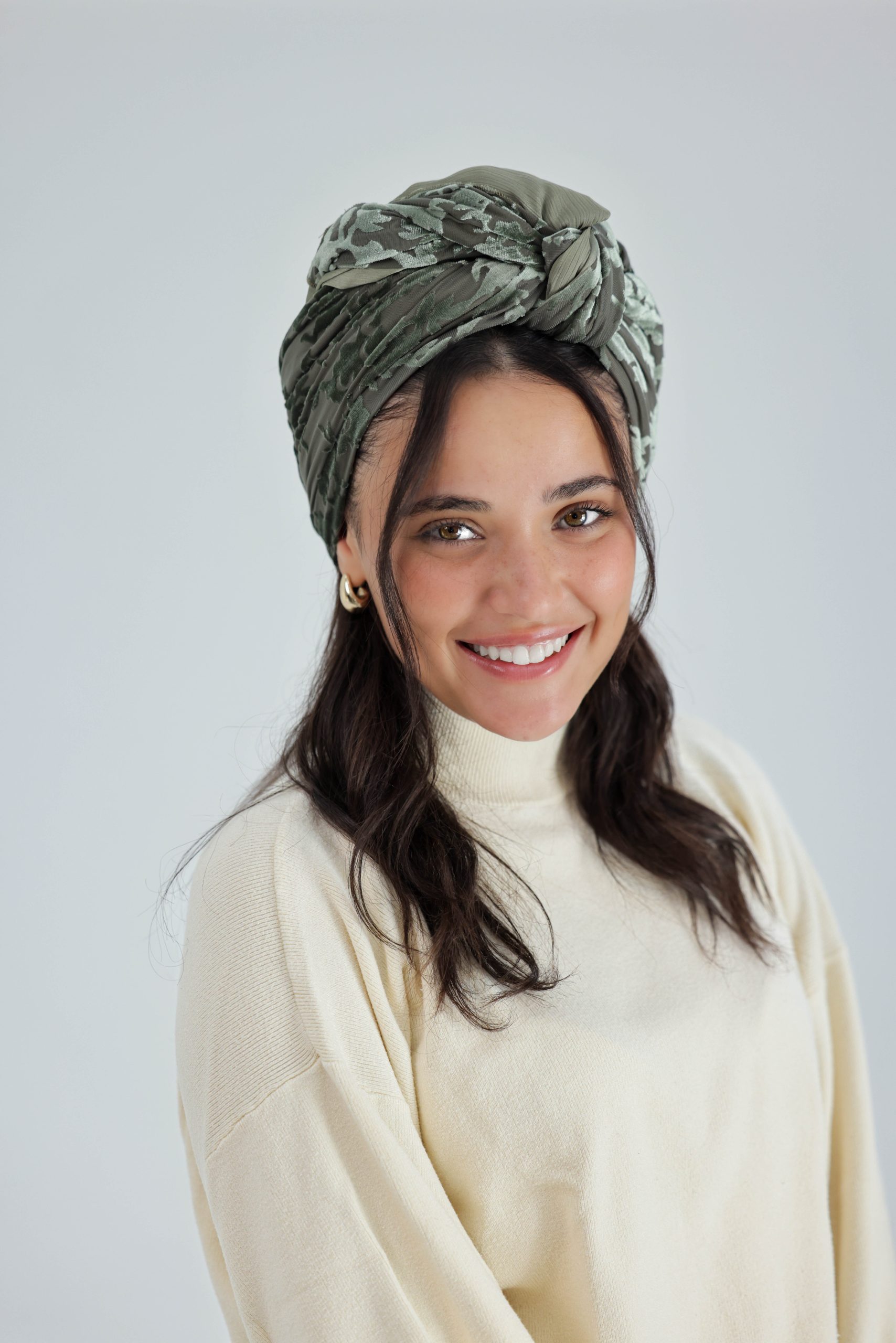 מטפחת לשיער עם חוט ברזל תפור בפנים ליצירת קשירות מגוונות ופשוטות, מקטיפה צרובה בטקסטורת עלים בגוון ירוק זית ומהצד השני בד שיפון בגוון ירוק זית.