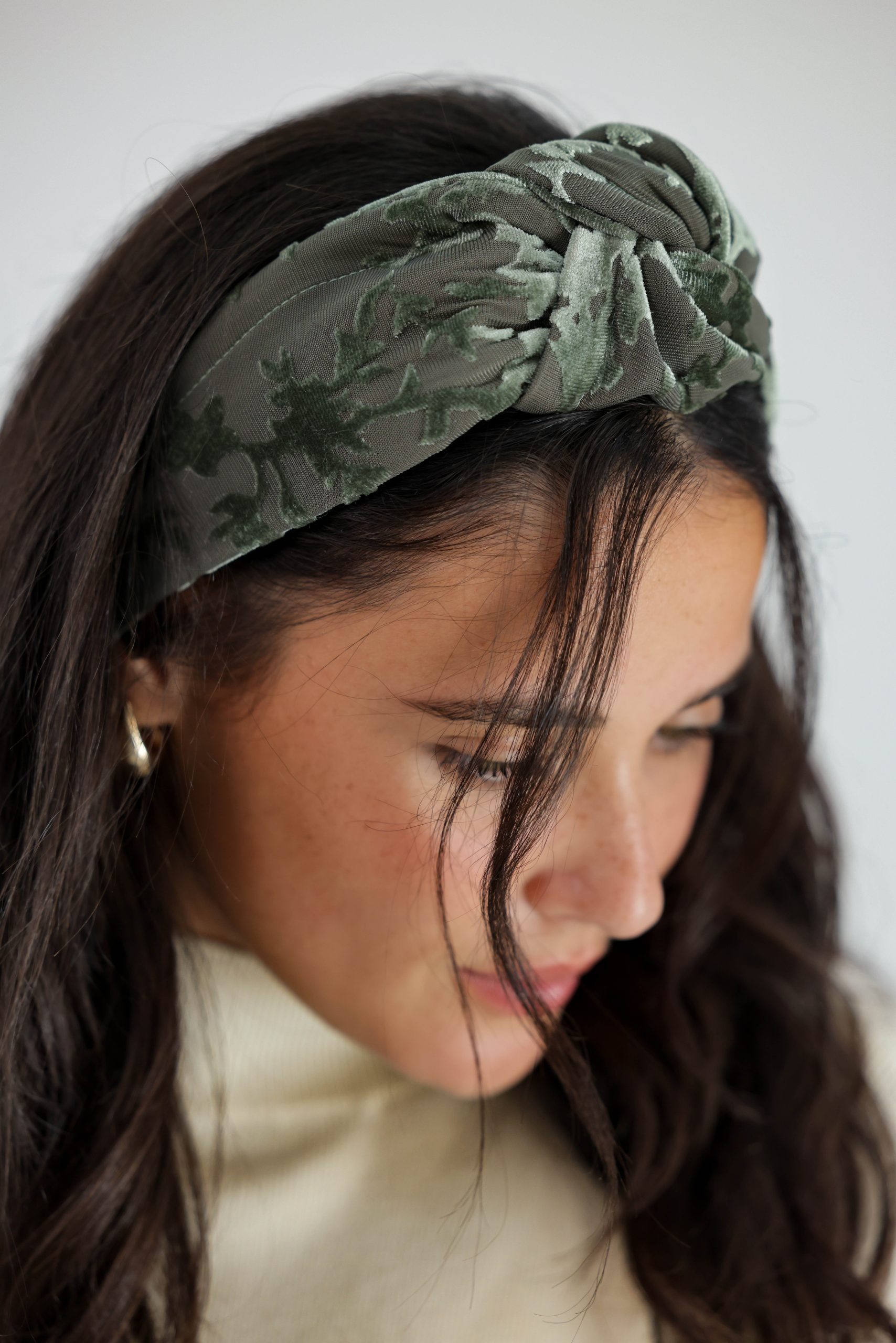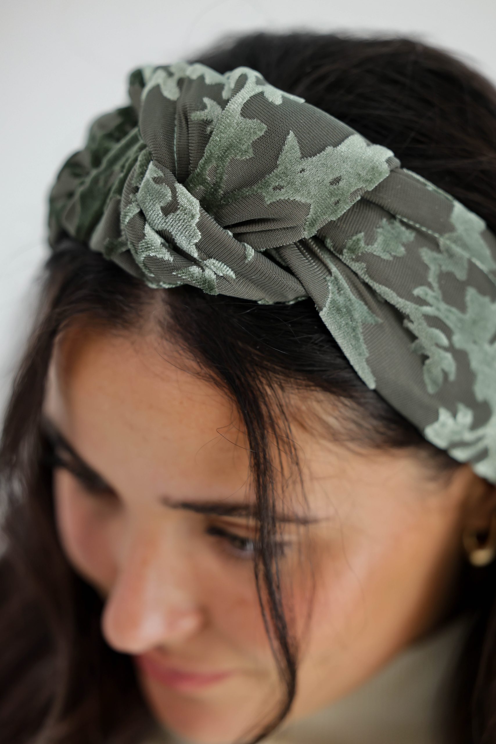 קשת לשיער עם חוט ברזל תפור בפנים ליצירת קשירות מגוונות ופשוטות, מקטיפה צרובה בטקסטורת עלים בגוון ירוק זית.