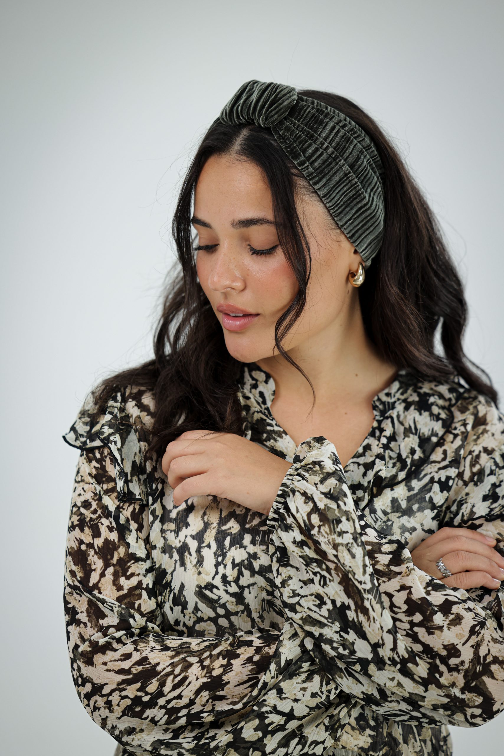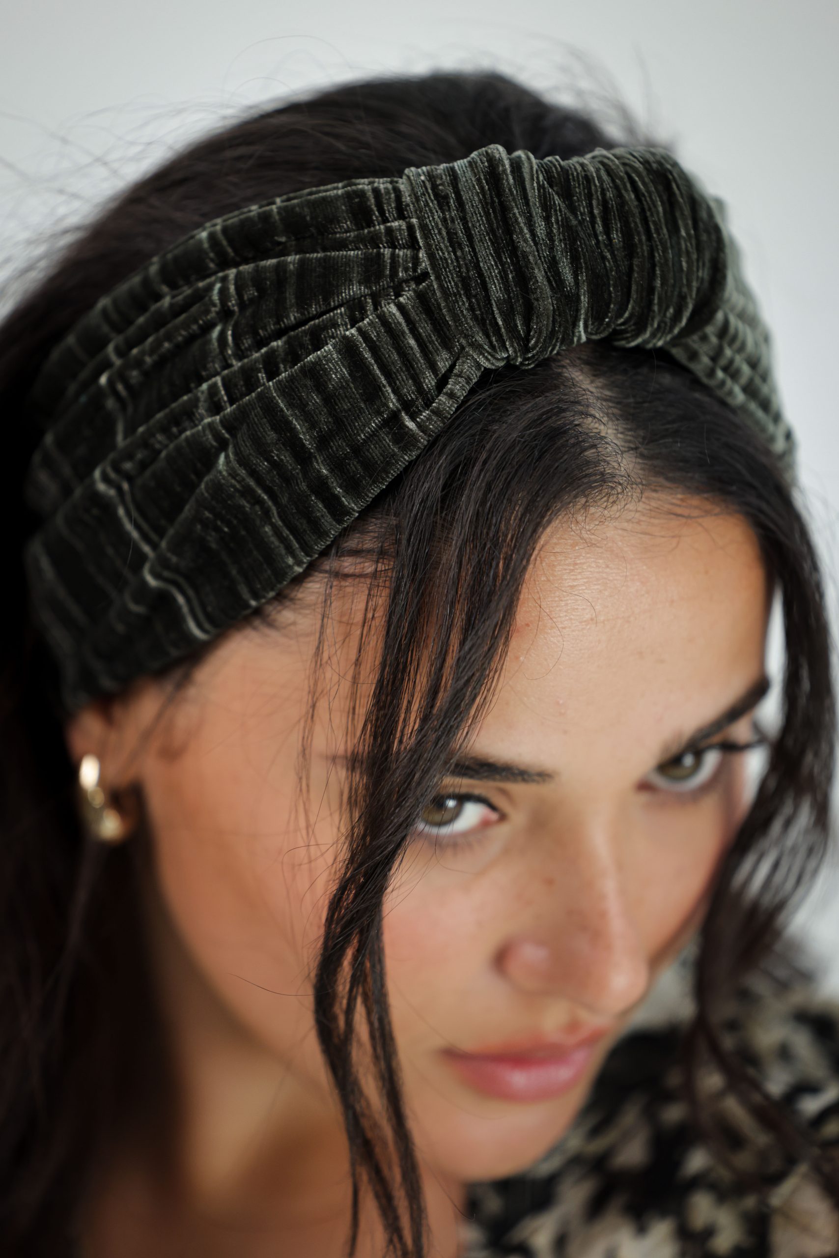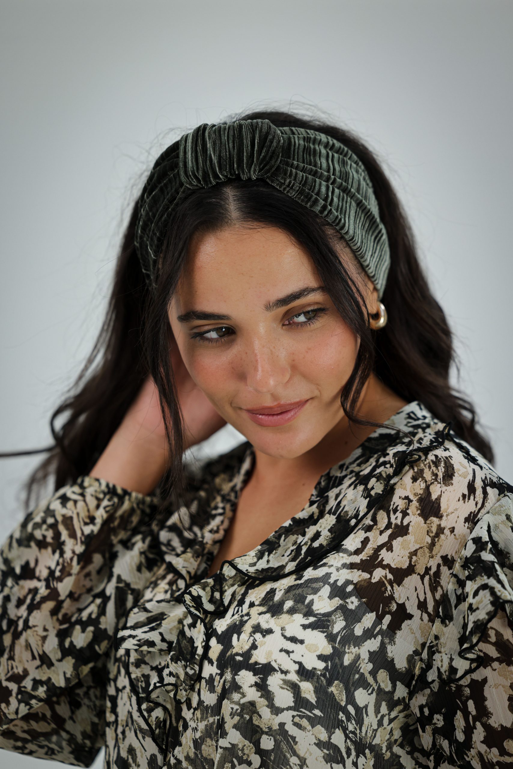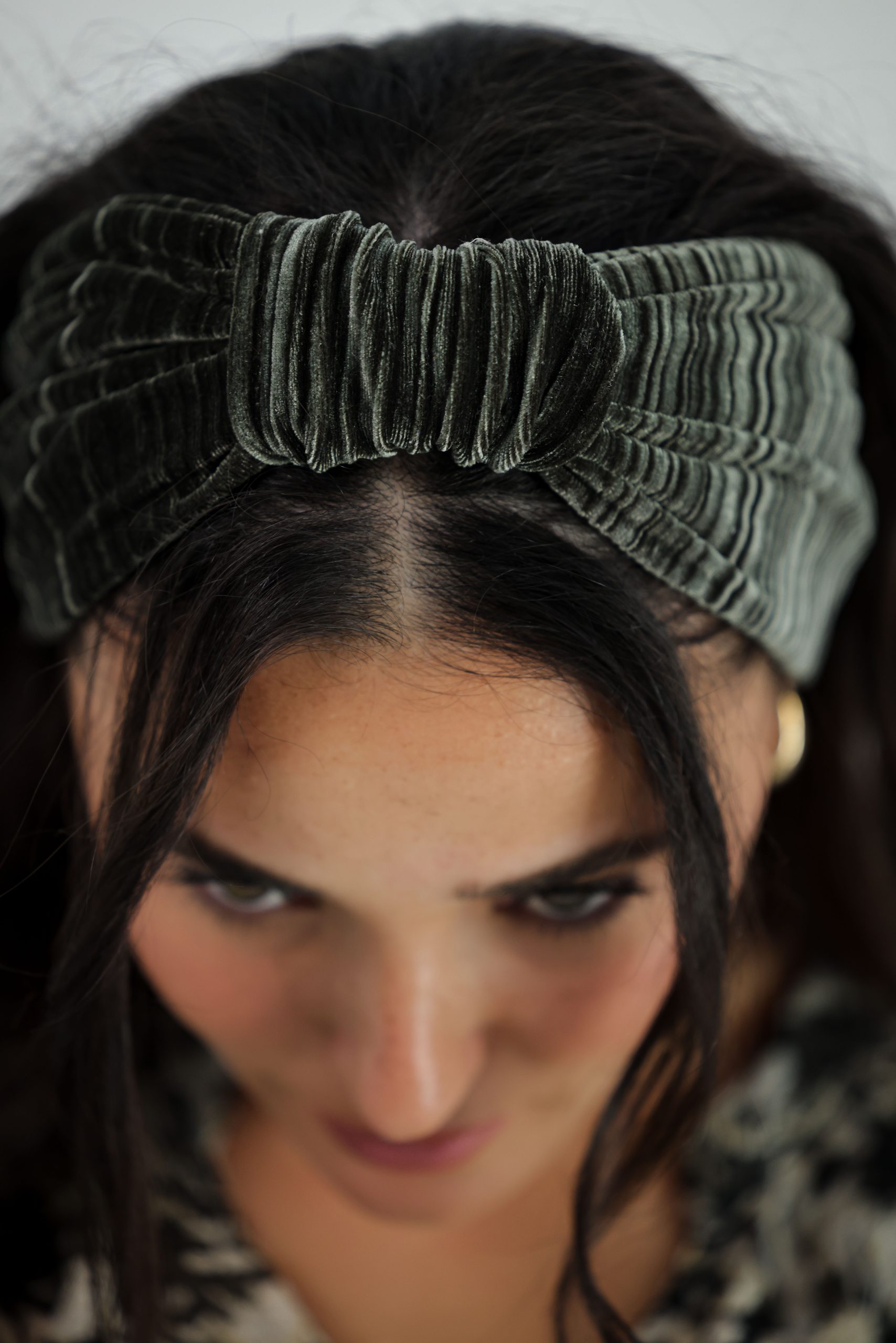 סרט לשיער שמגיע מוכן ונשאר לקשור אותו מתחת לשיער בעזרת סרטי הגומי שבקצה. בתוך הסרט תפור חוט ברזל תפור ליצירת משחק עם הנפח של הסרט. מבד קטיפה פליסה זית.