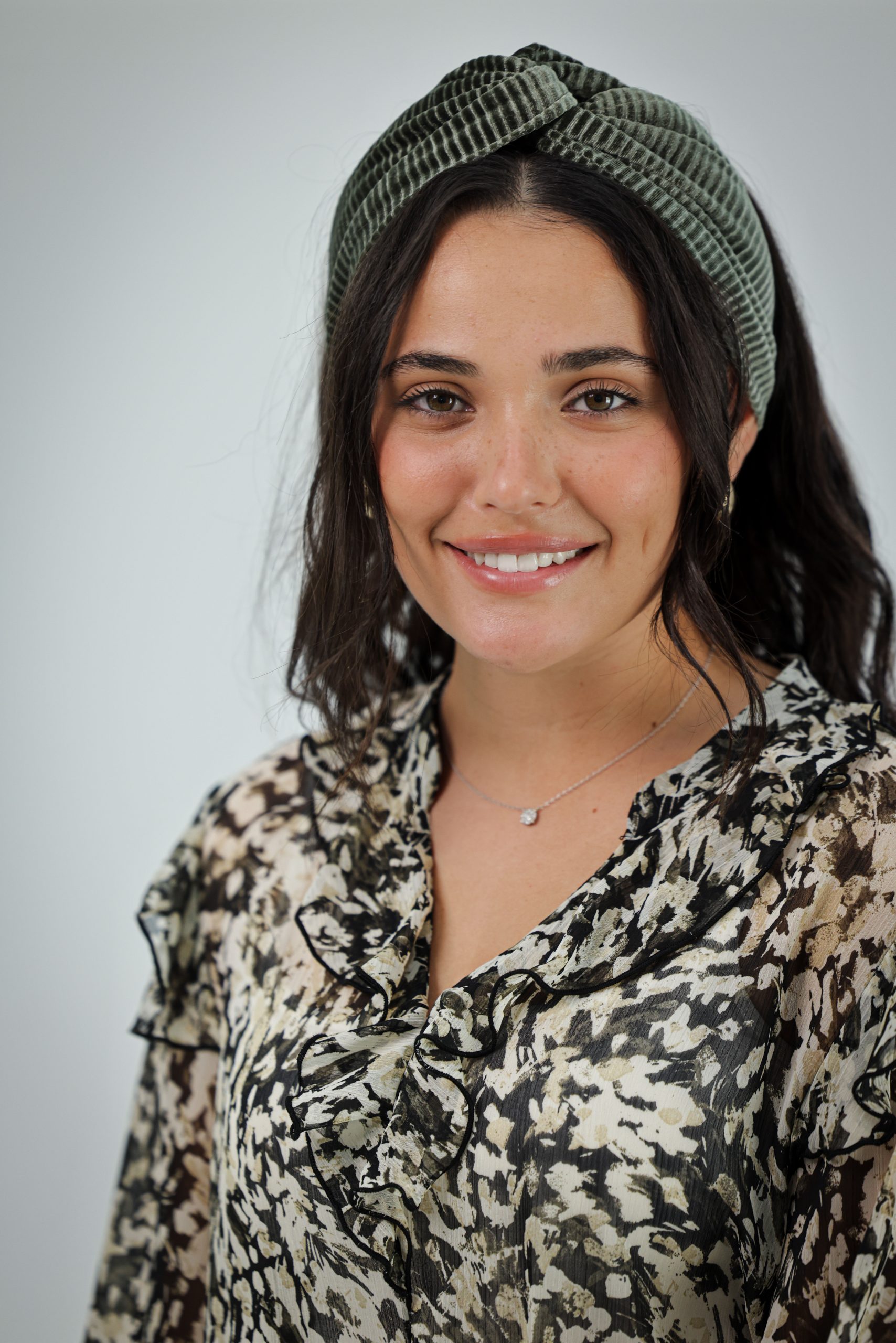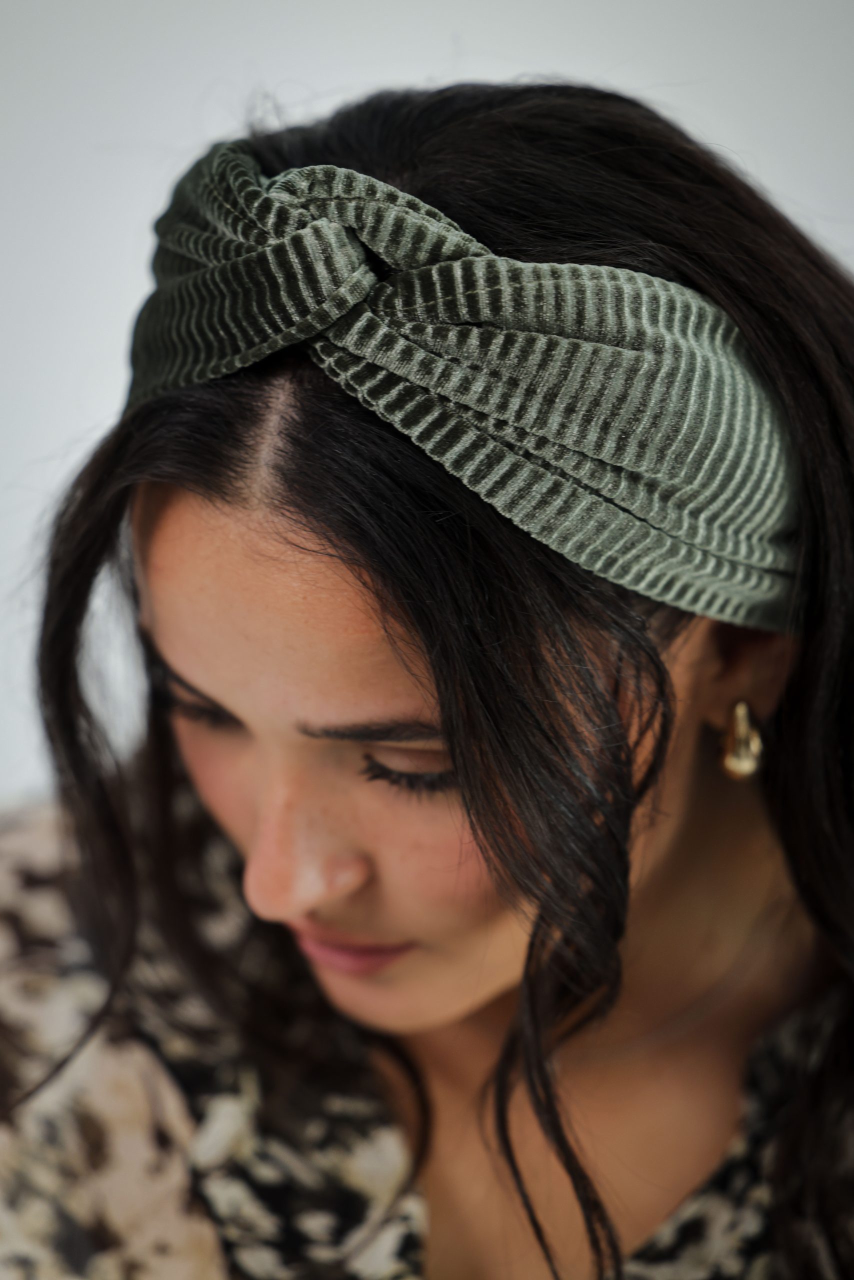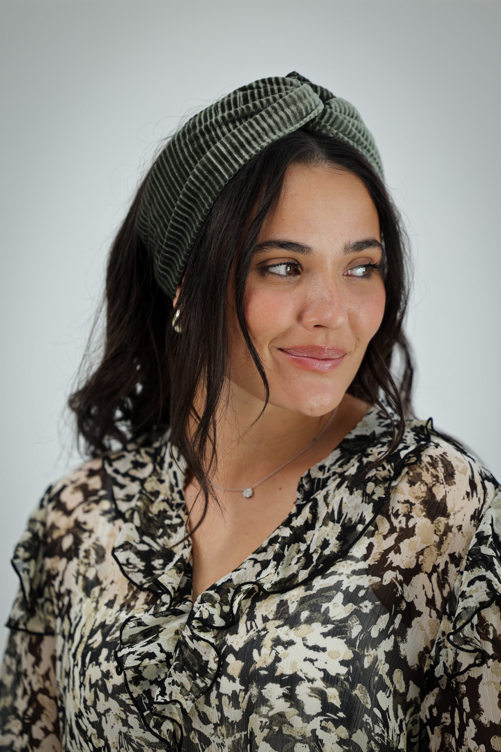 סרט לשיער עם חוט ברזל תפור בפנים ליצירת קשירות מגוונות ופשוטות, מבד קטיפה פליסה זית.