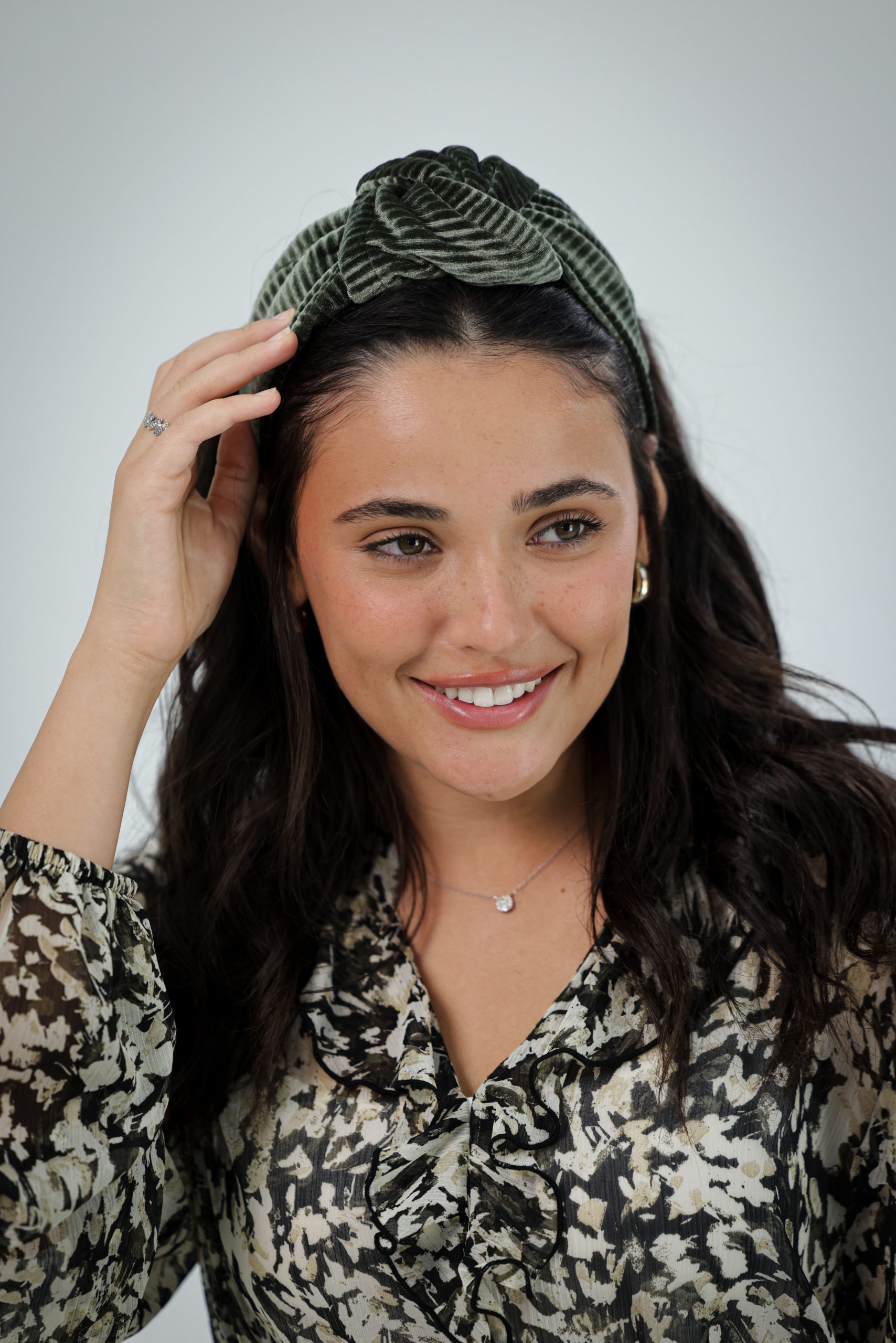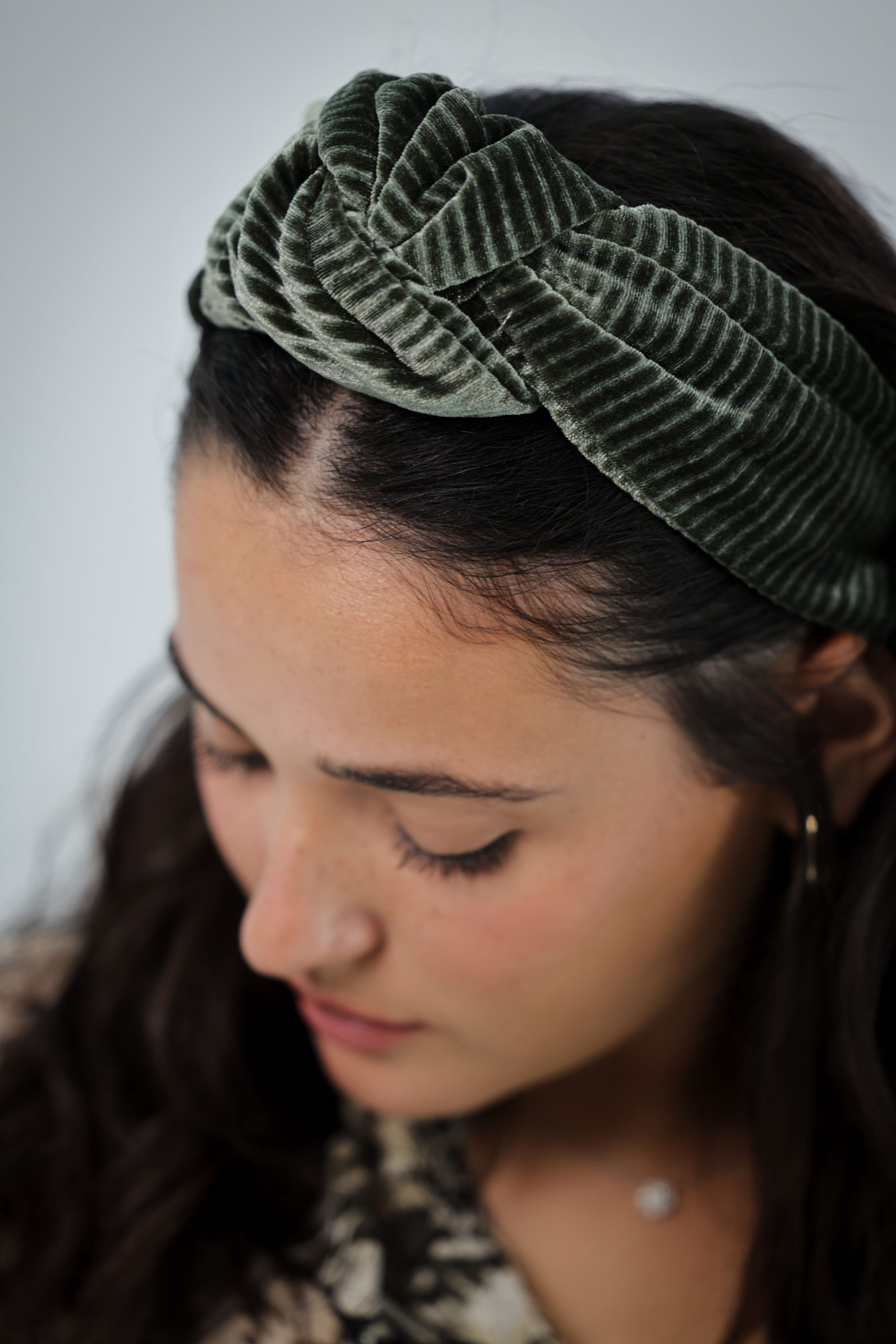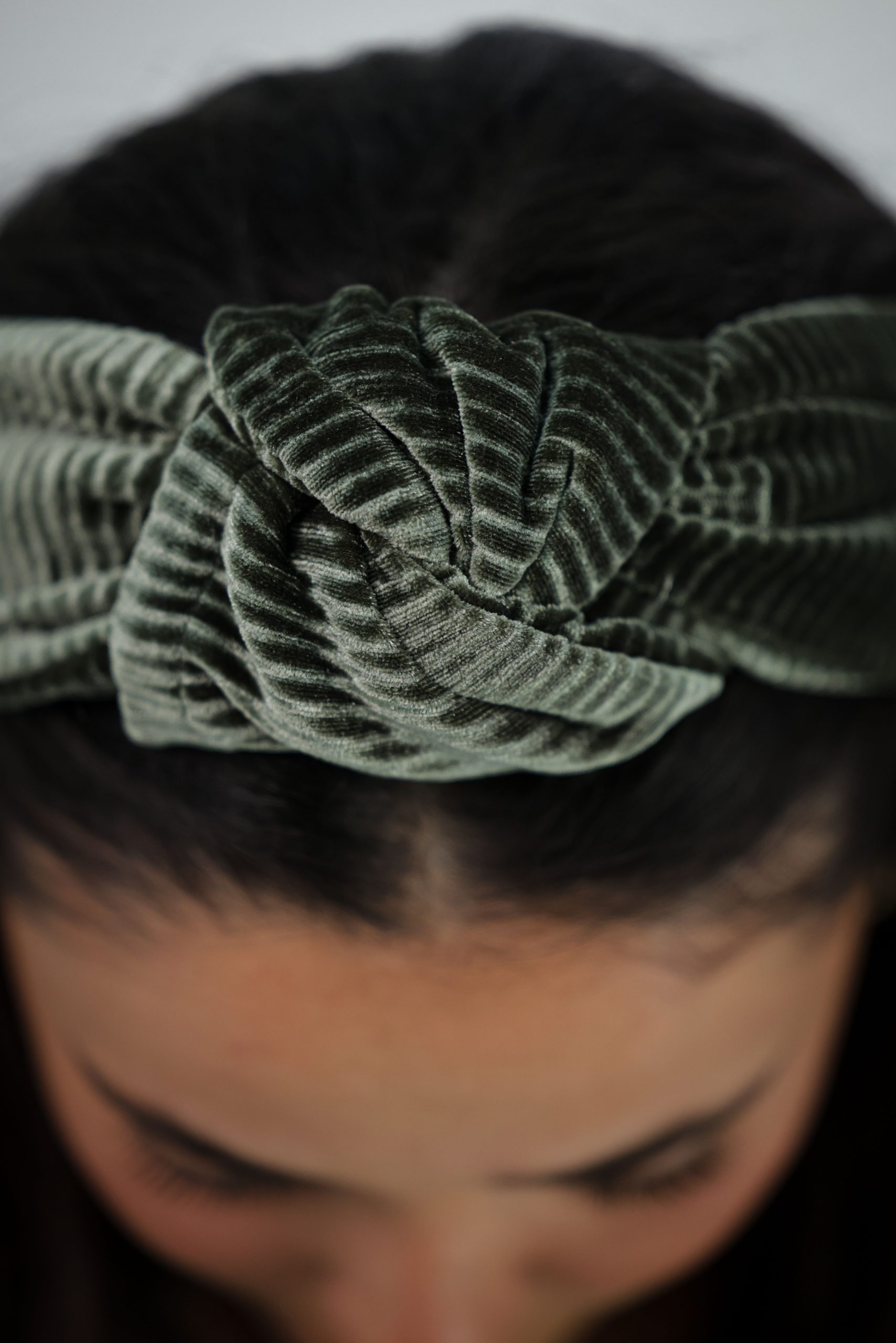 קשת לשיער עם חוט ברזל תפור בפנים ליצירת משחק עם הנפח והקשר שבמרכז הקשת. מבד קטיפה פליסה זית.