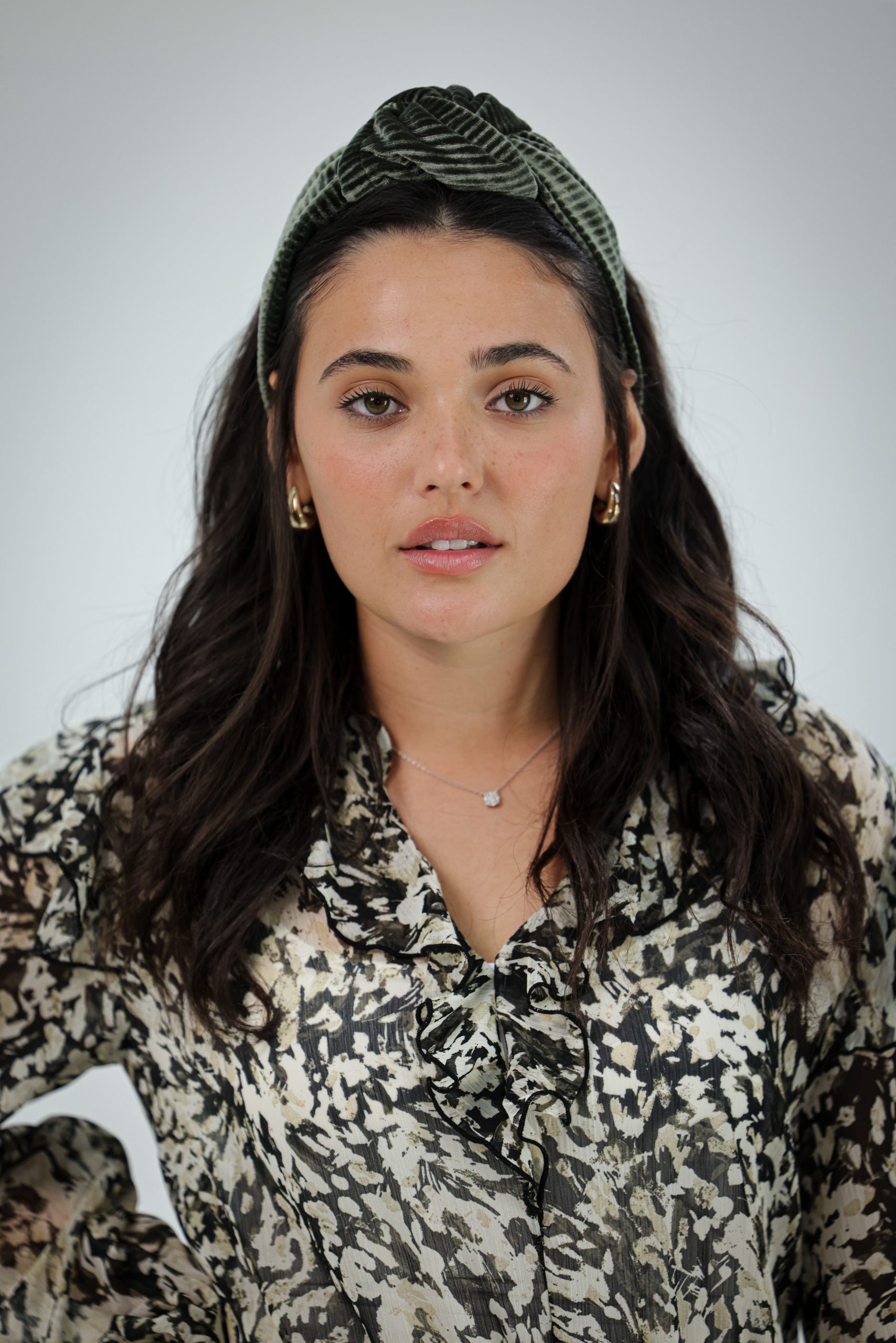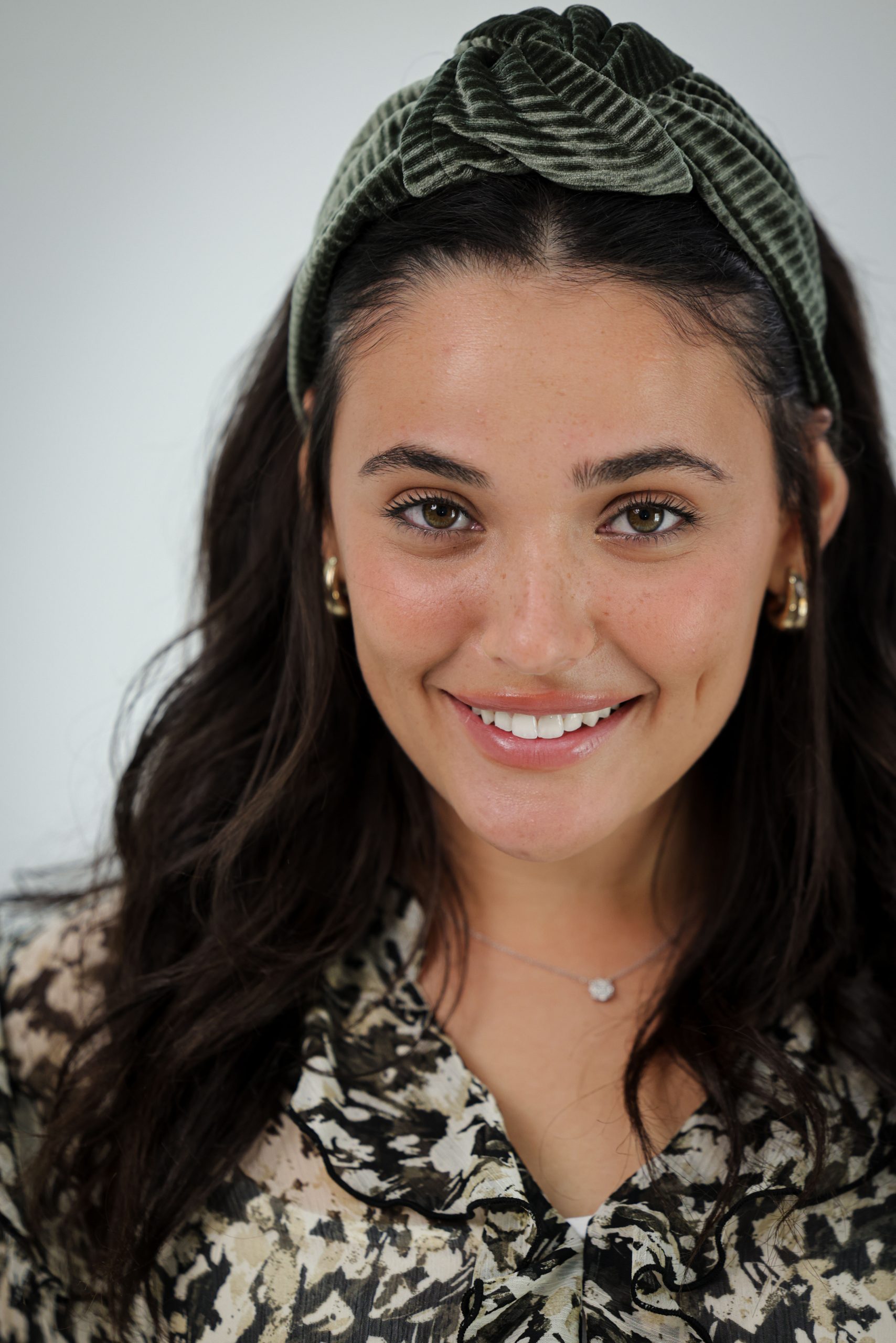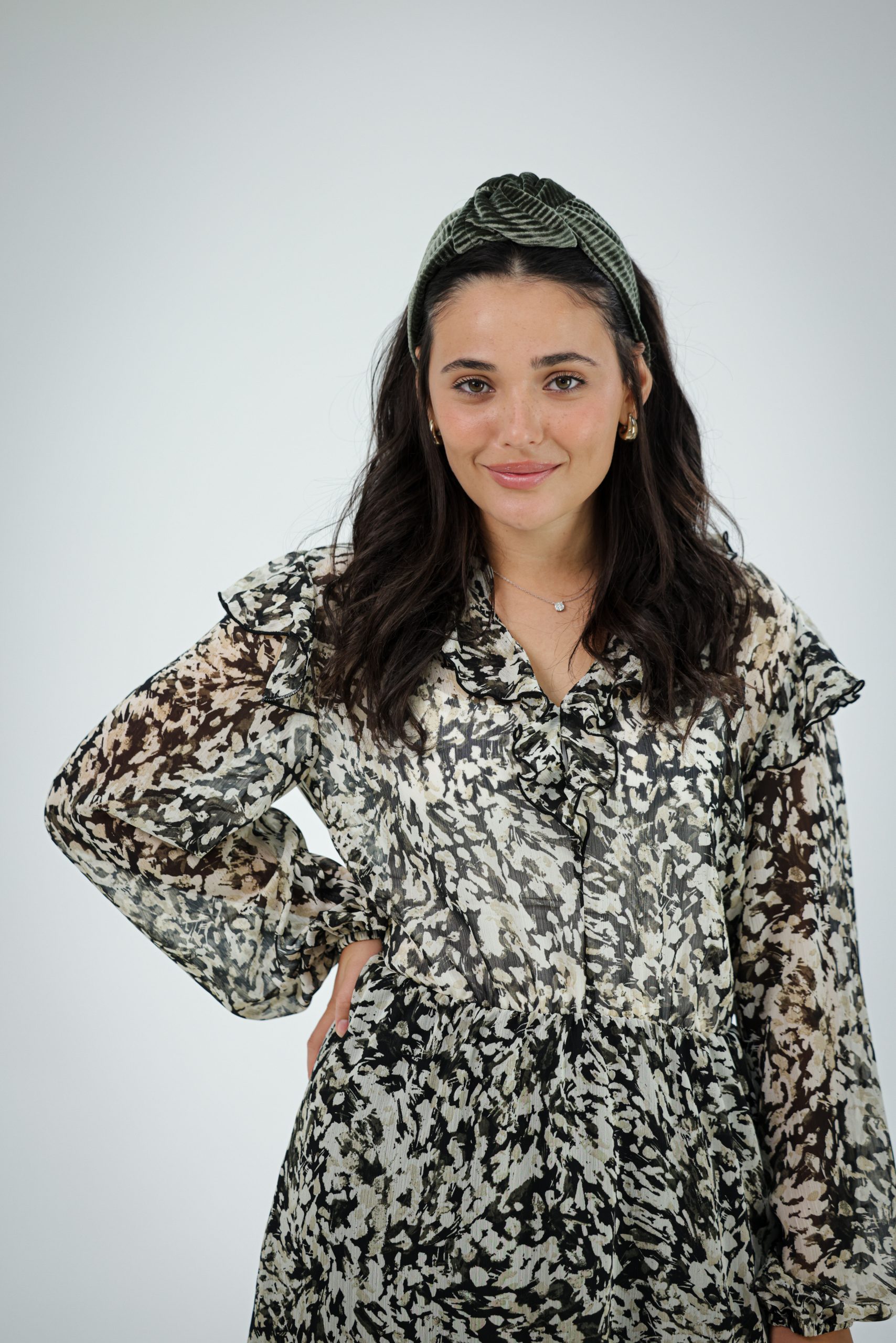 קשת לשיער עם חוט ברזל תפור בפנים ליצירת משחק עם הנפח והקשר שבמרכז הקשת. מבד קטיפה פליסה זית.