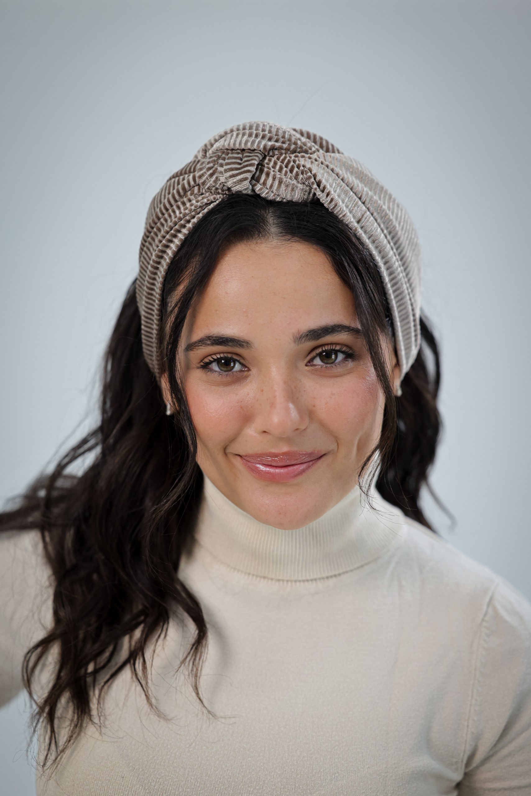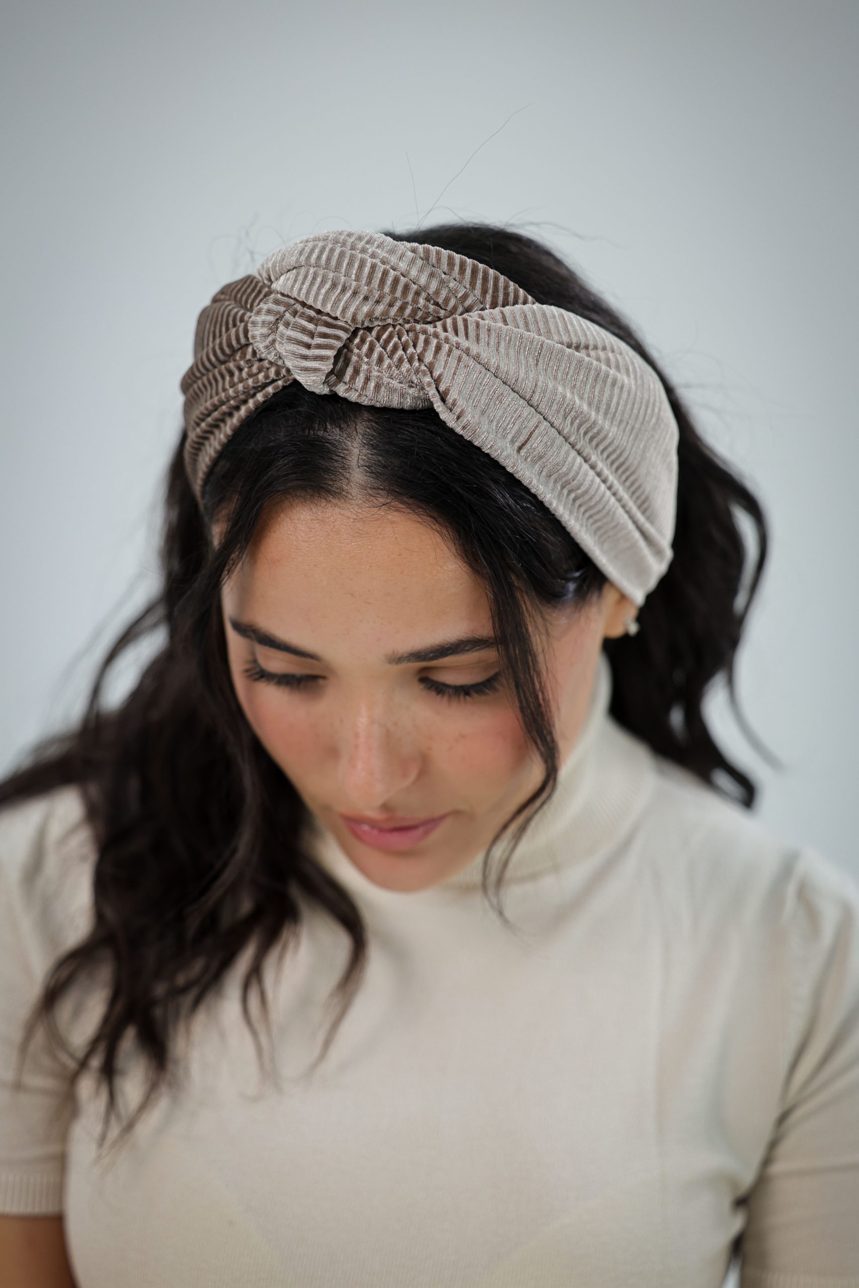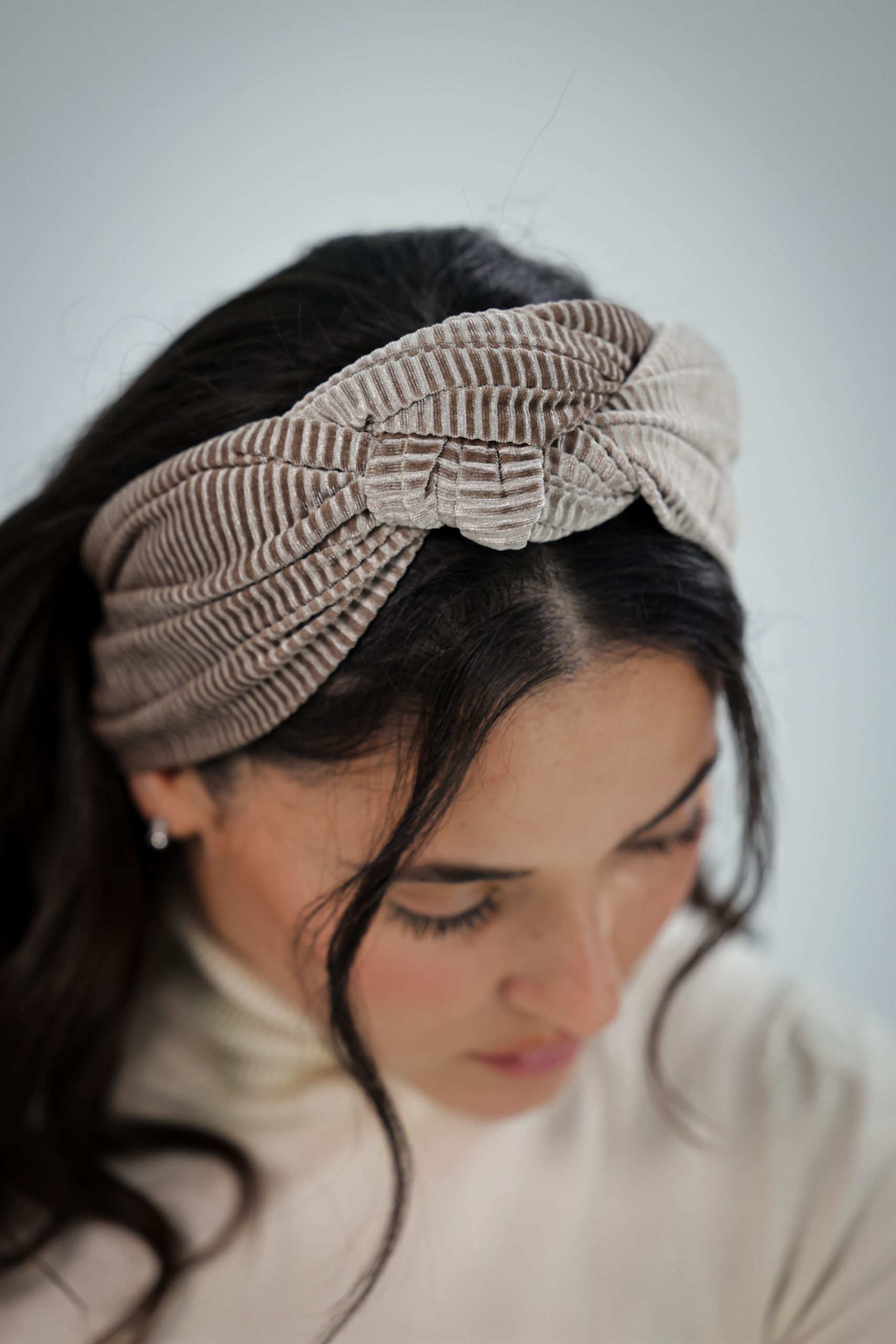 סרט לשיער עם חוט ברזל תפור בפנים ליצירת קשירות מגוונות ופשוטות, מבד קטיפה פליסה שמפניה.