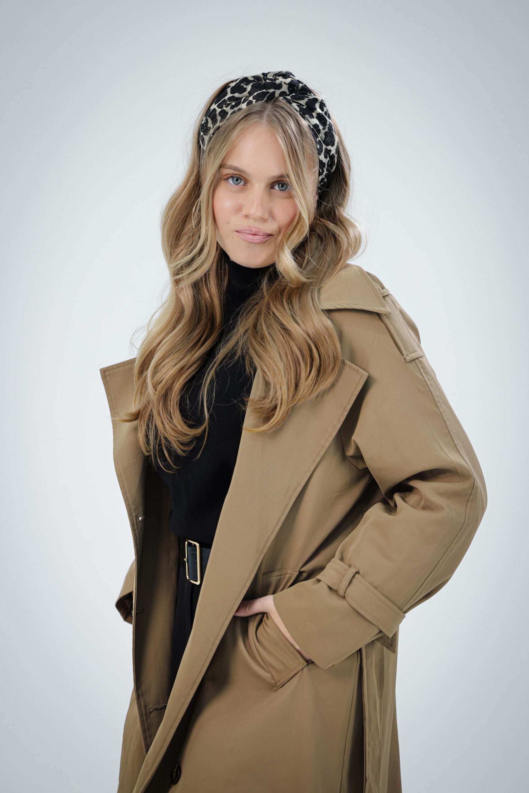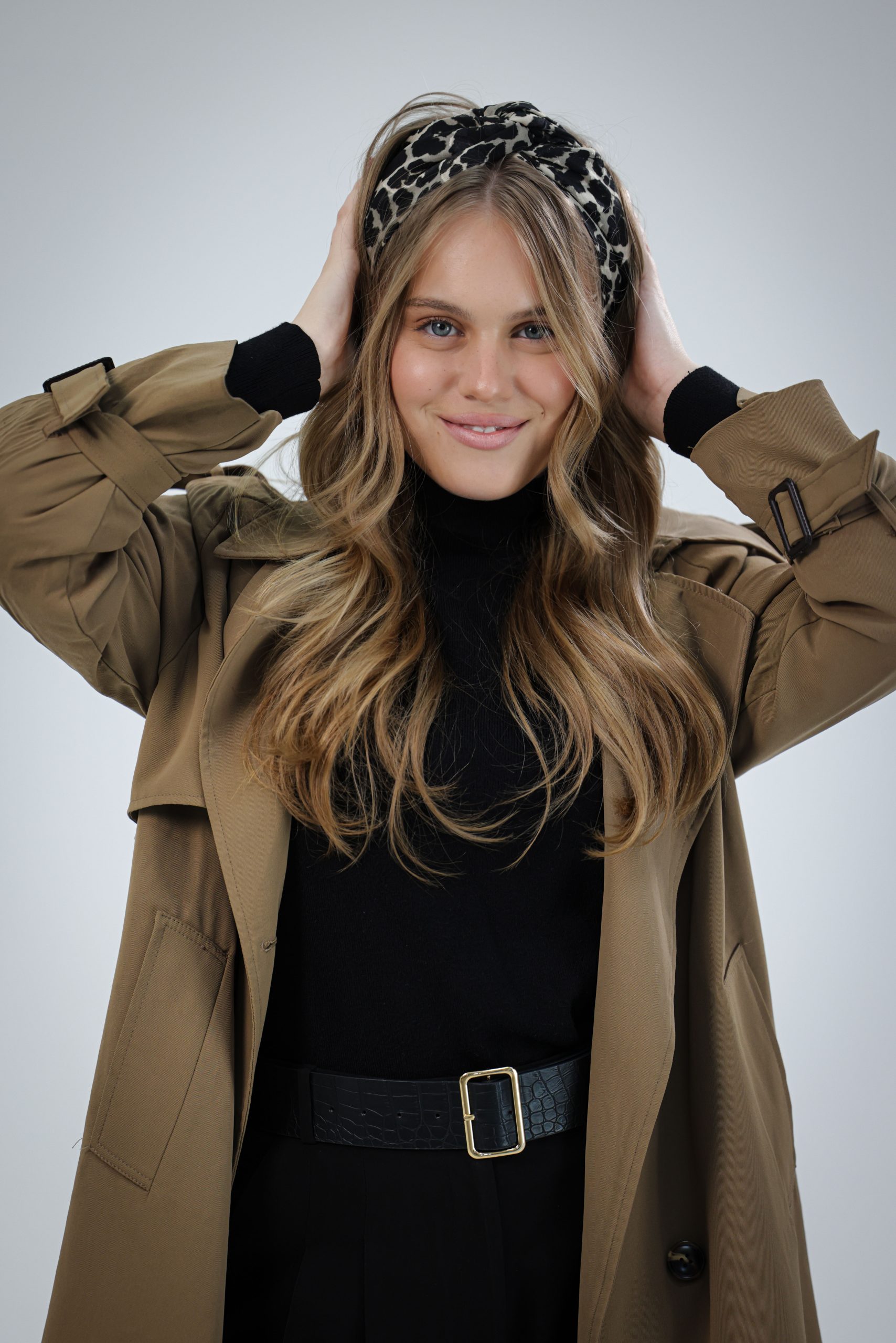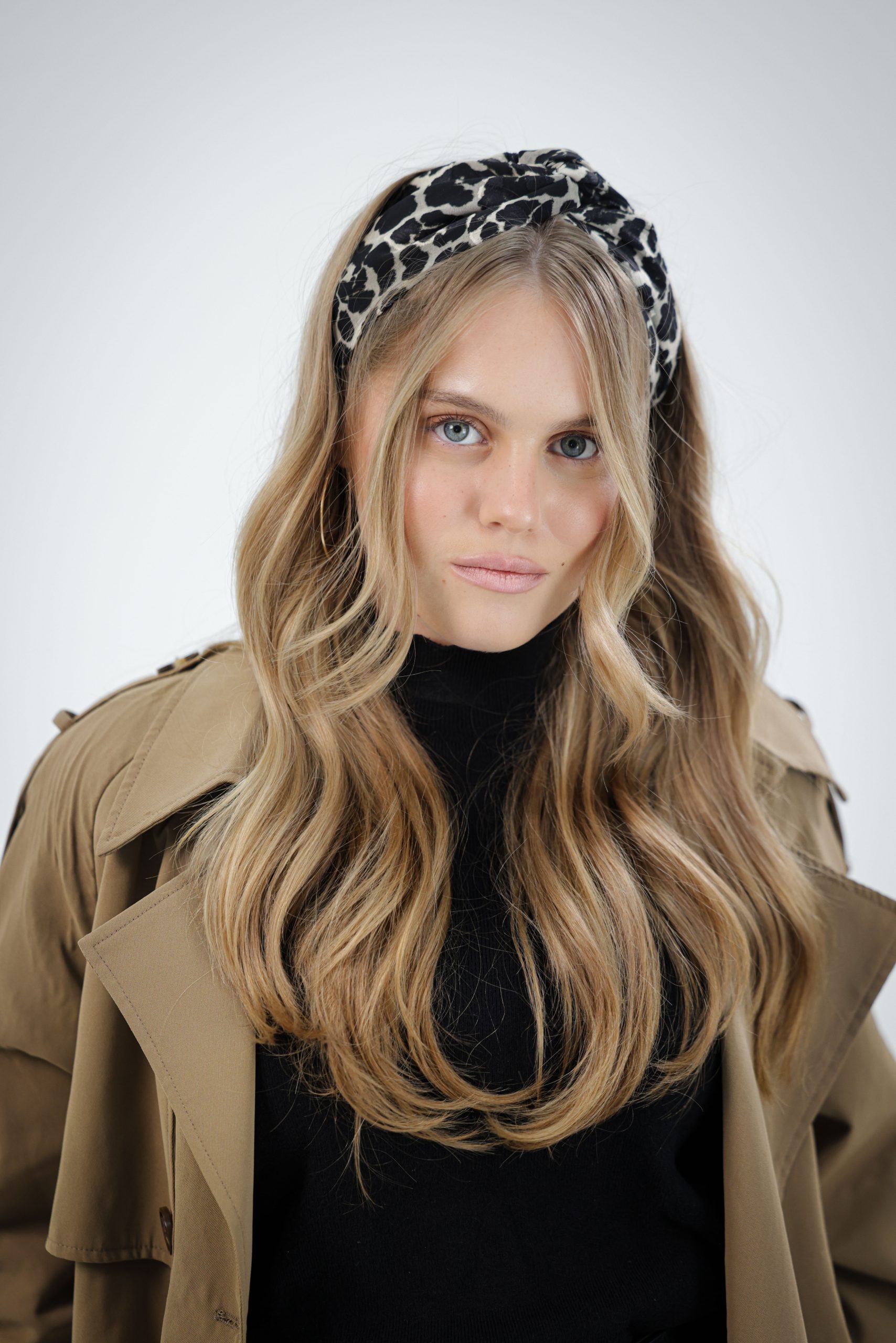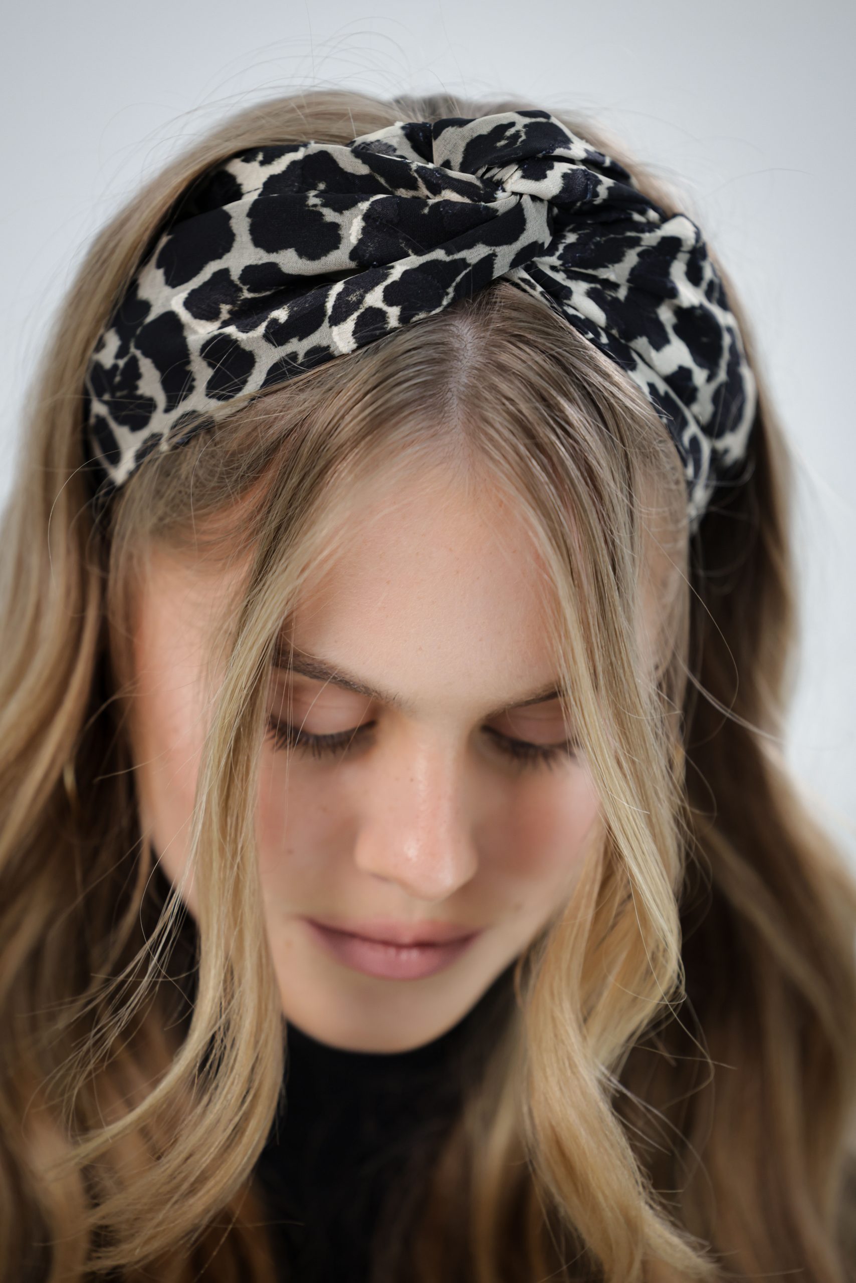 סרט לשיער עם חוט ברזל תפור בפנים ליצירת קשירות מגוונות ופשוטות, מבד שיפון בהדפס מנומר יפיפה.