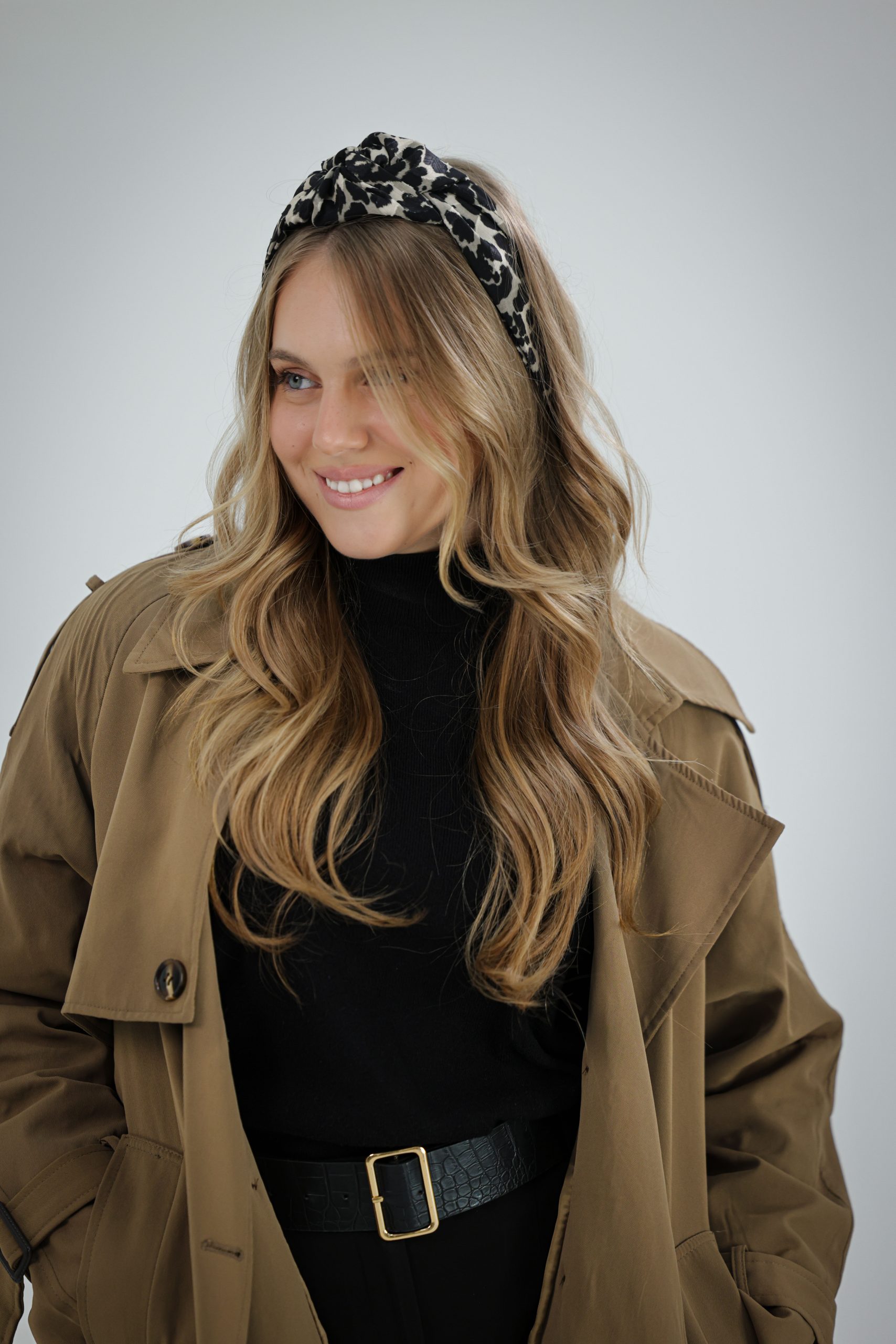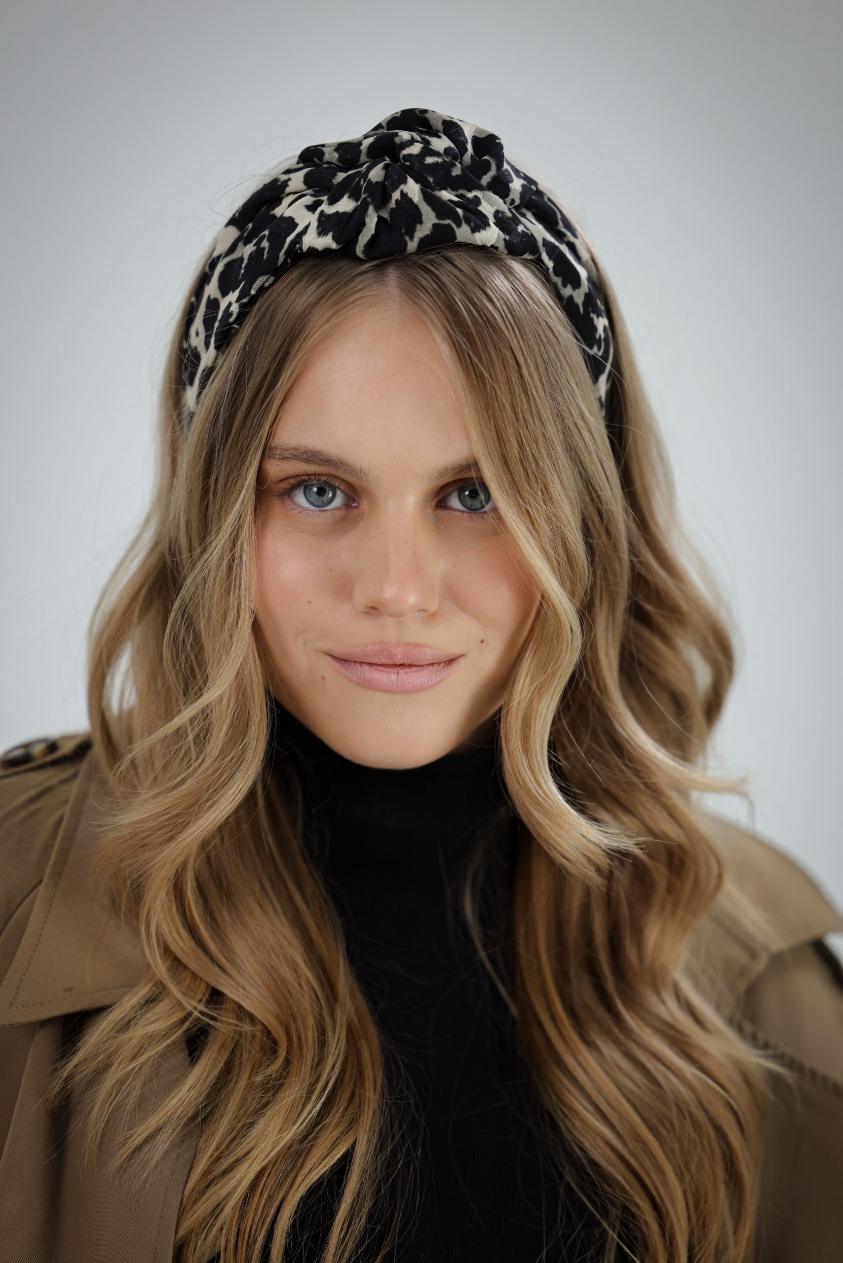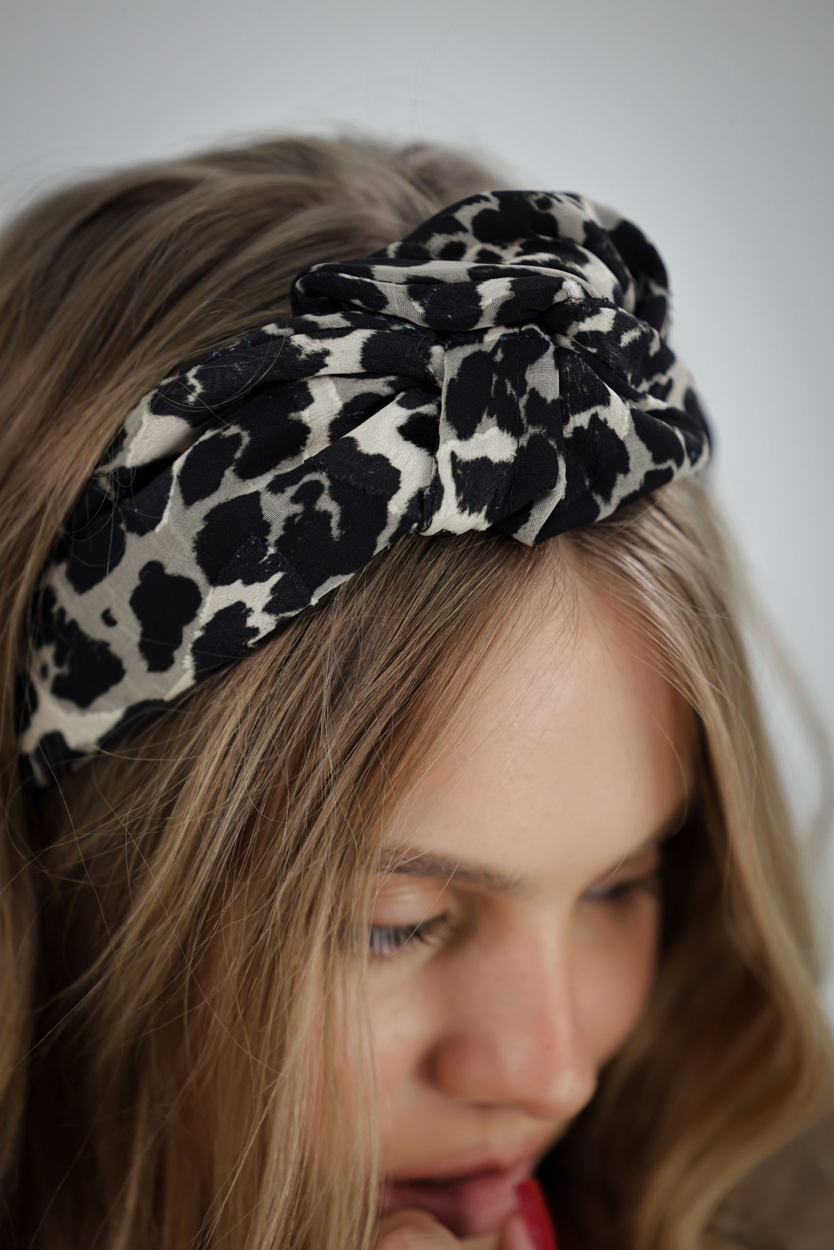 קשת לשיער עם חוט ברזל תפור בפנים ליצירת משחק עם הנפח והקשר שבמרכז הקשת. מבד שיפון בהדפס מנומר יפיפה.