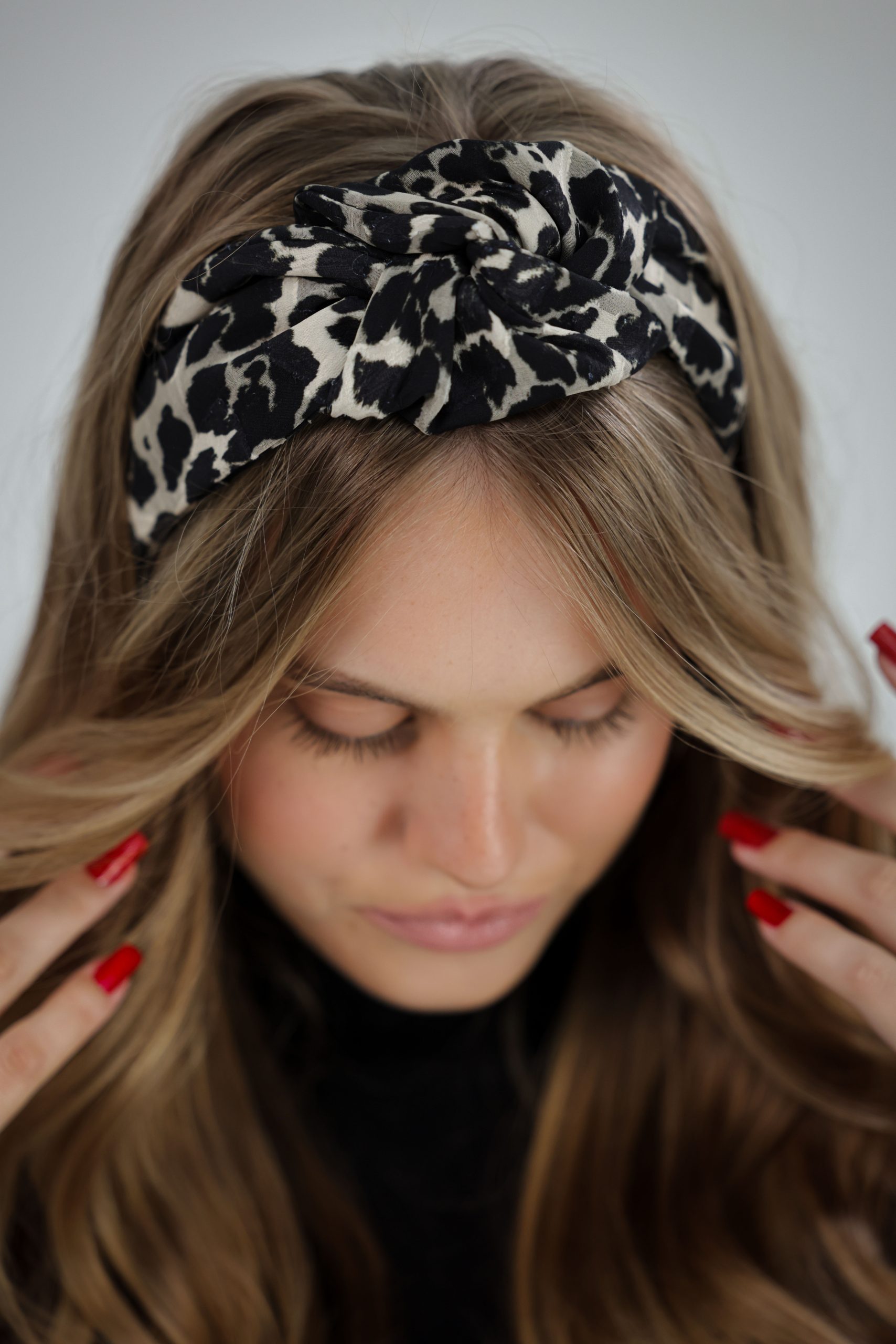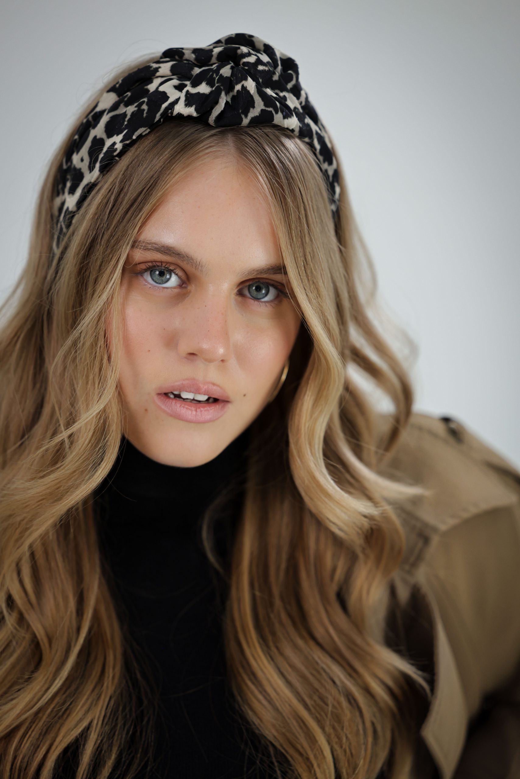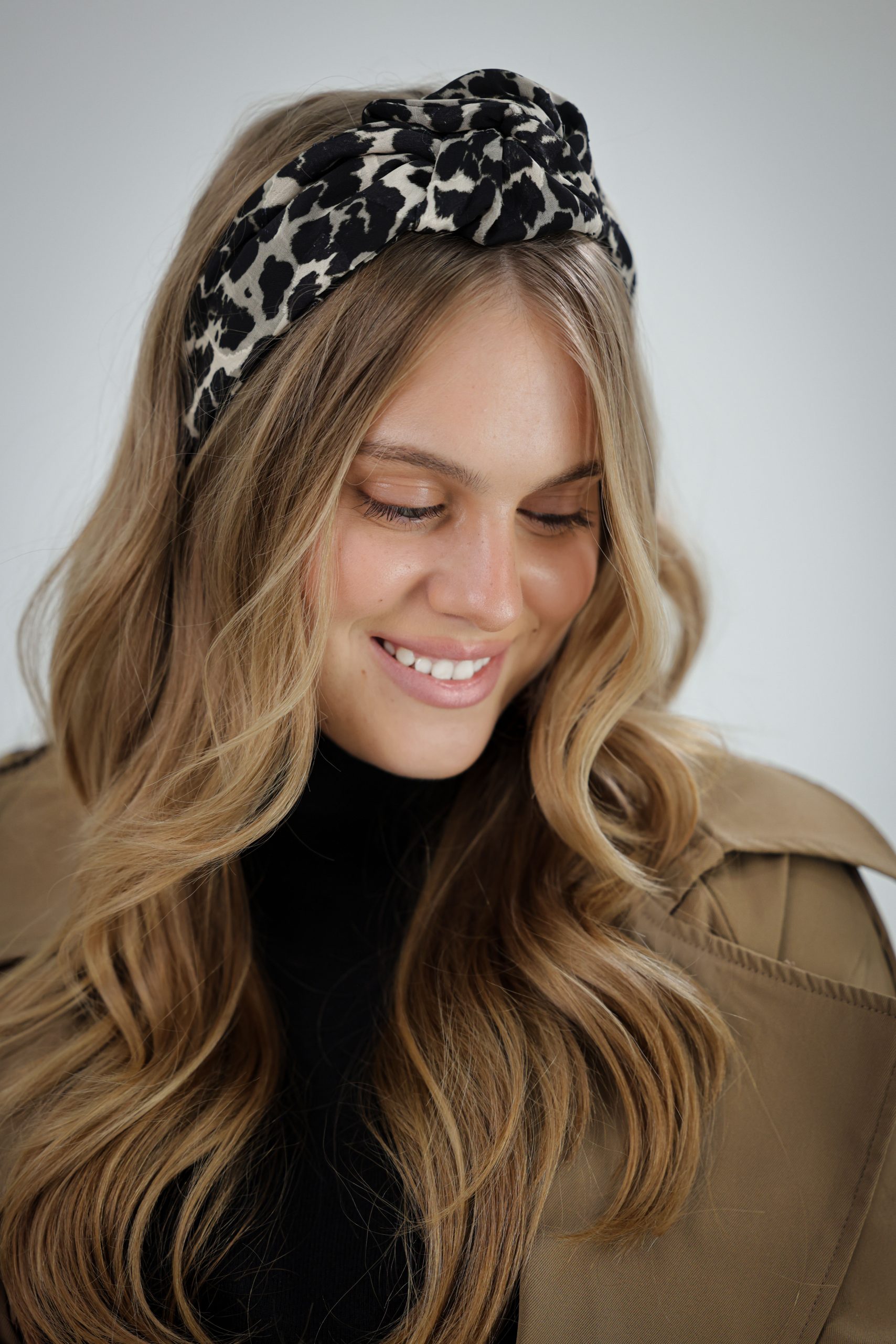 קשת לשיער עם חוט ברזל תפור בפנים ליצירת משחק עם הנפח והקשר שבמרכז הקשת. מבד שיפון בהדפס מנומר יפיפה.