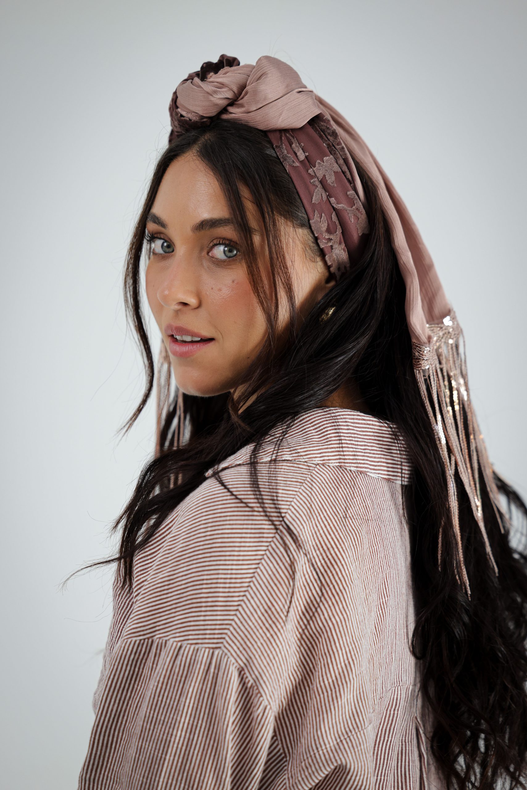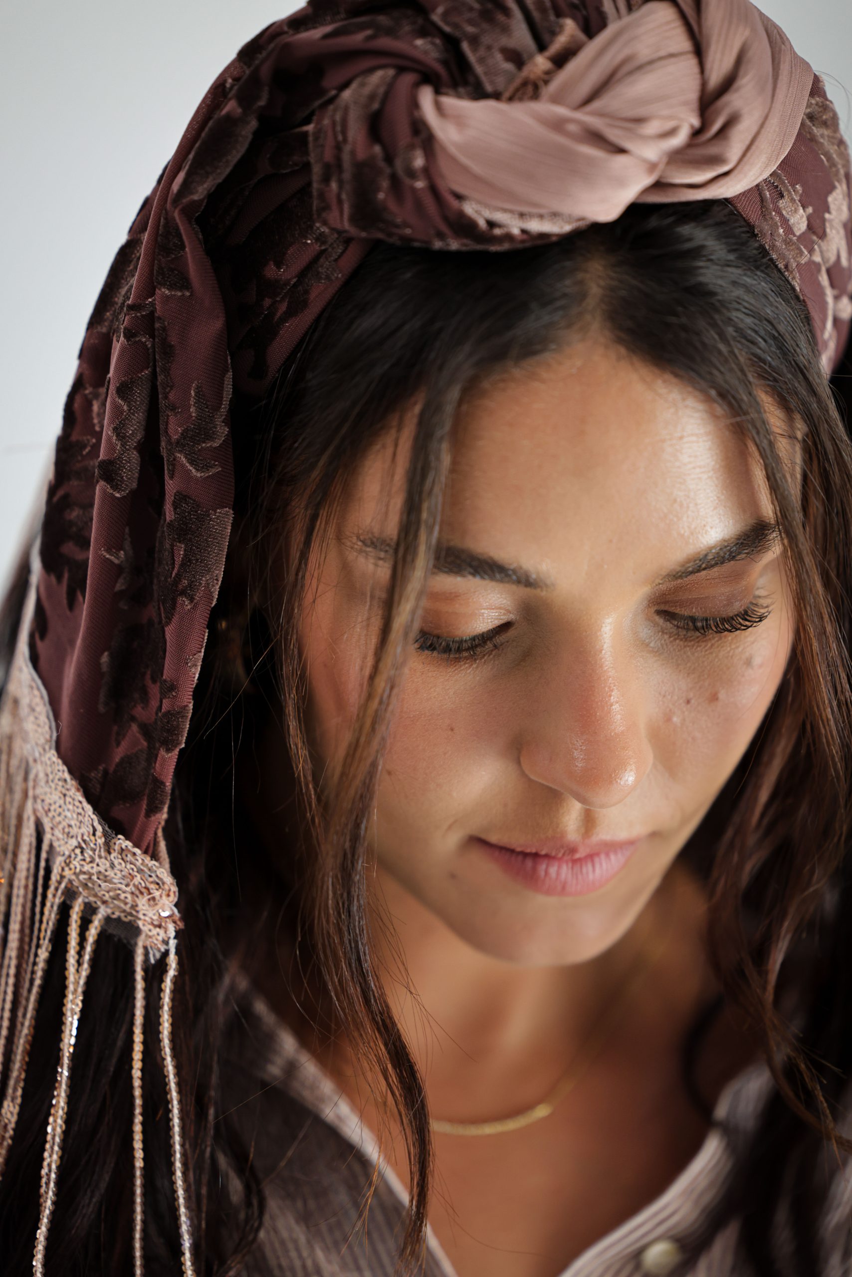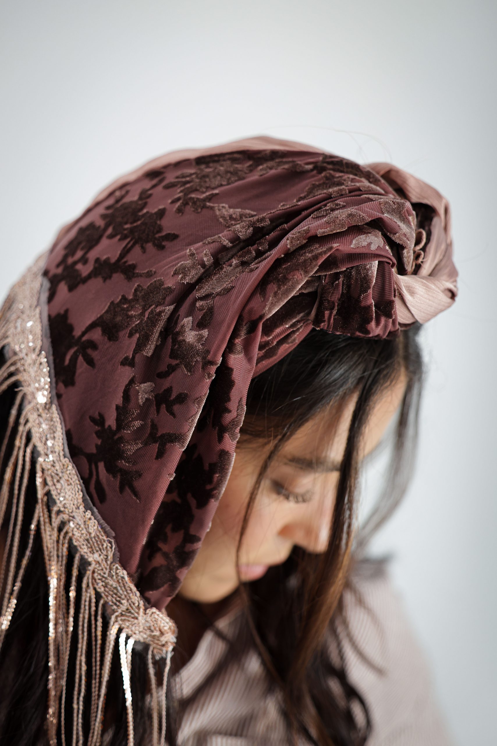 מטפחת לשיער עם חוט ברזל תפור בפנים ליצירת קשירות מגוונות ופשוטות. מקטיפה צרובה בטקסטורת עלים בגוון בורדו סגול כהה ומבד סאטן בגוון בורדו ורוד וסרט פייטים בקצה