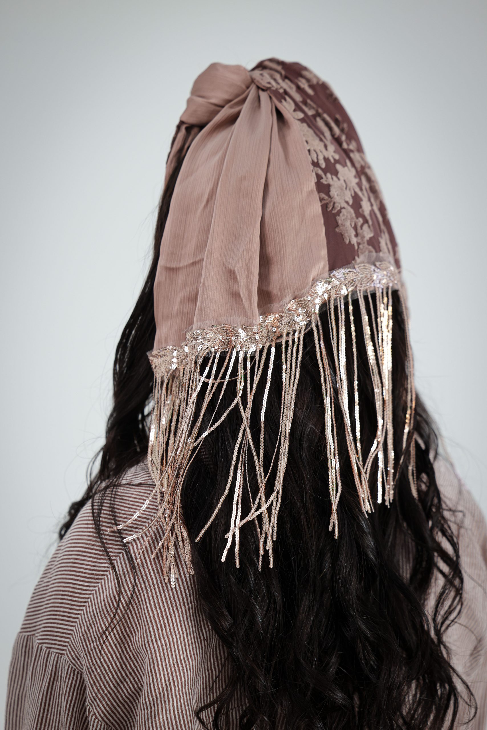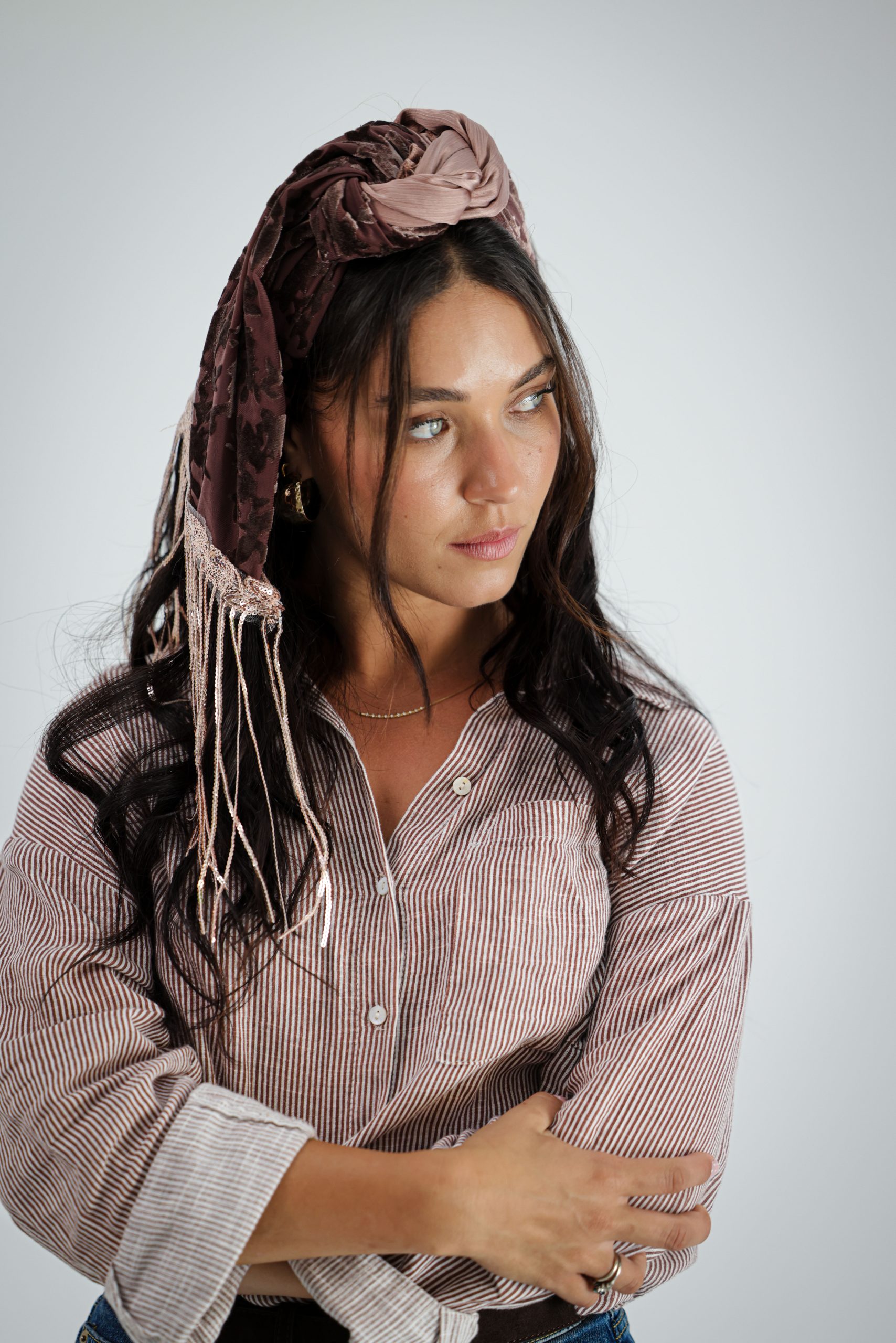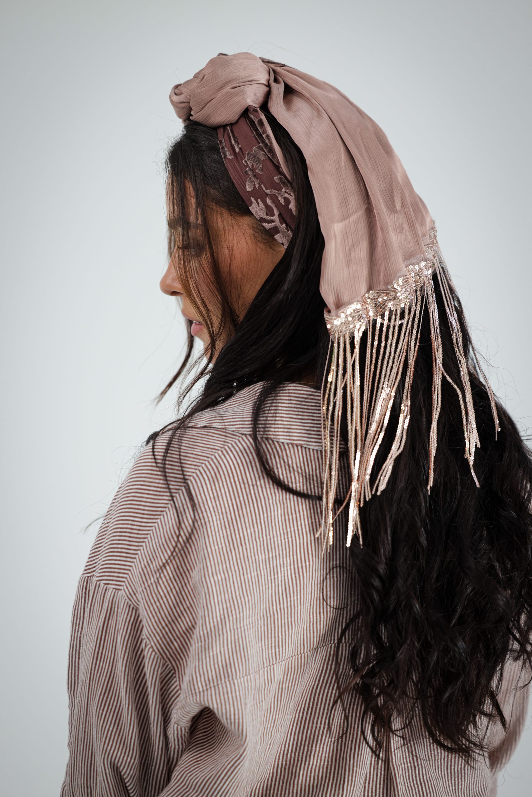 מטפחת לשיער עם חוט ברזל תפור בפנים ליצירת קשירות מגוונות ופשוטות. מקטיפה צרובה בטקסטורת עלים בגוון בורדו סגול כהה ומבד סאטן בגוון בורדו ורוד וסרט פייטים בקצה