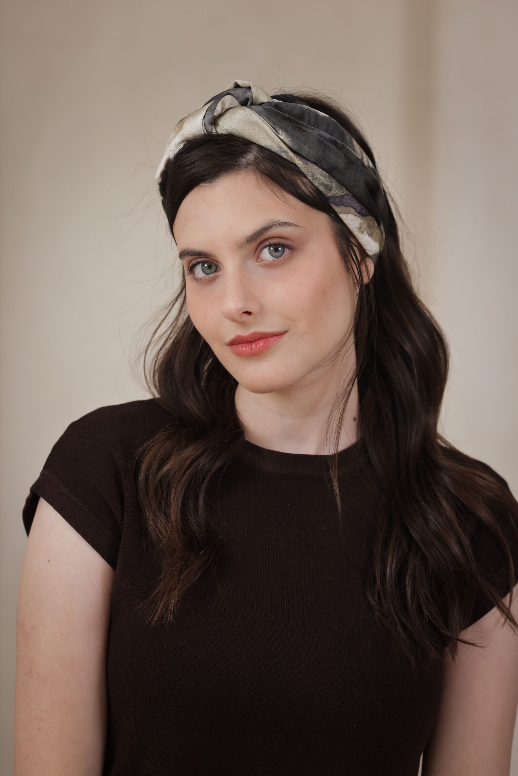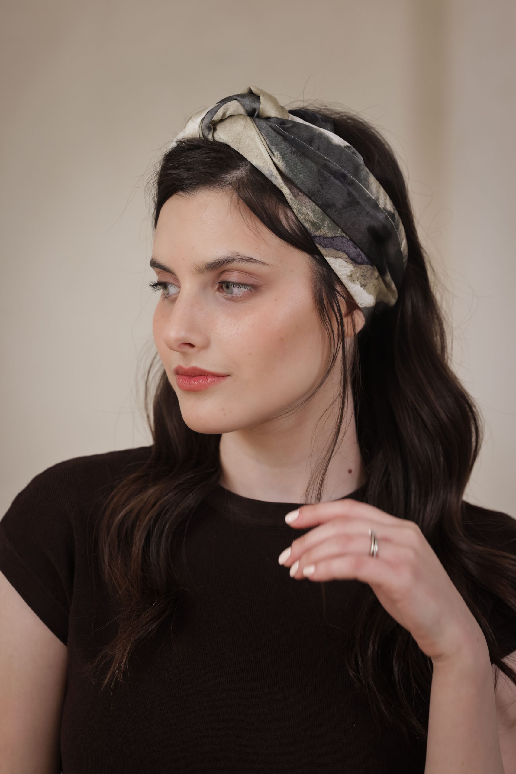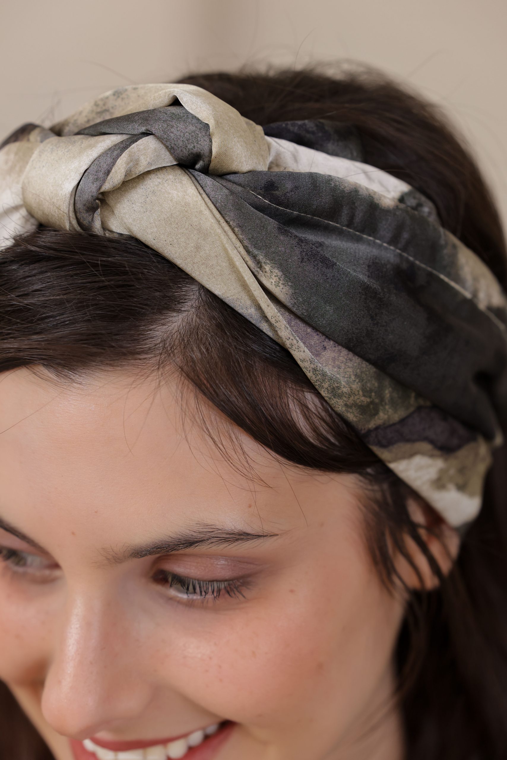 סרט לשיער עם חוט ברזל תפור בפנים ליצירת קשירות מגוונות ופשוטות, מבד סאטן עם הדפס בגוונים ירוק, כחול, אפור ולבן