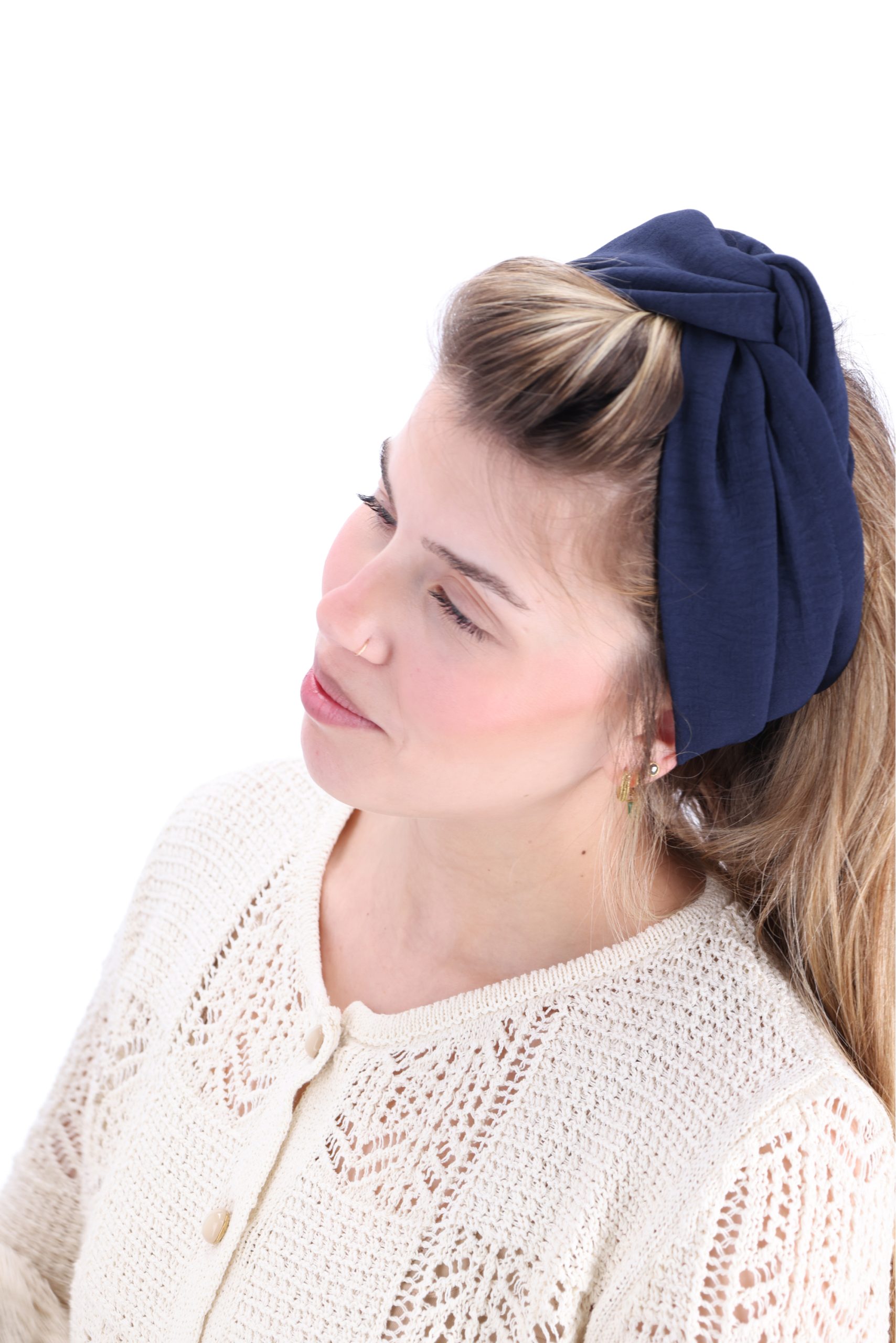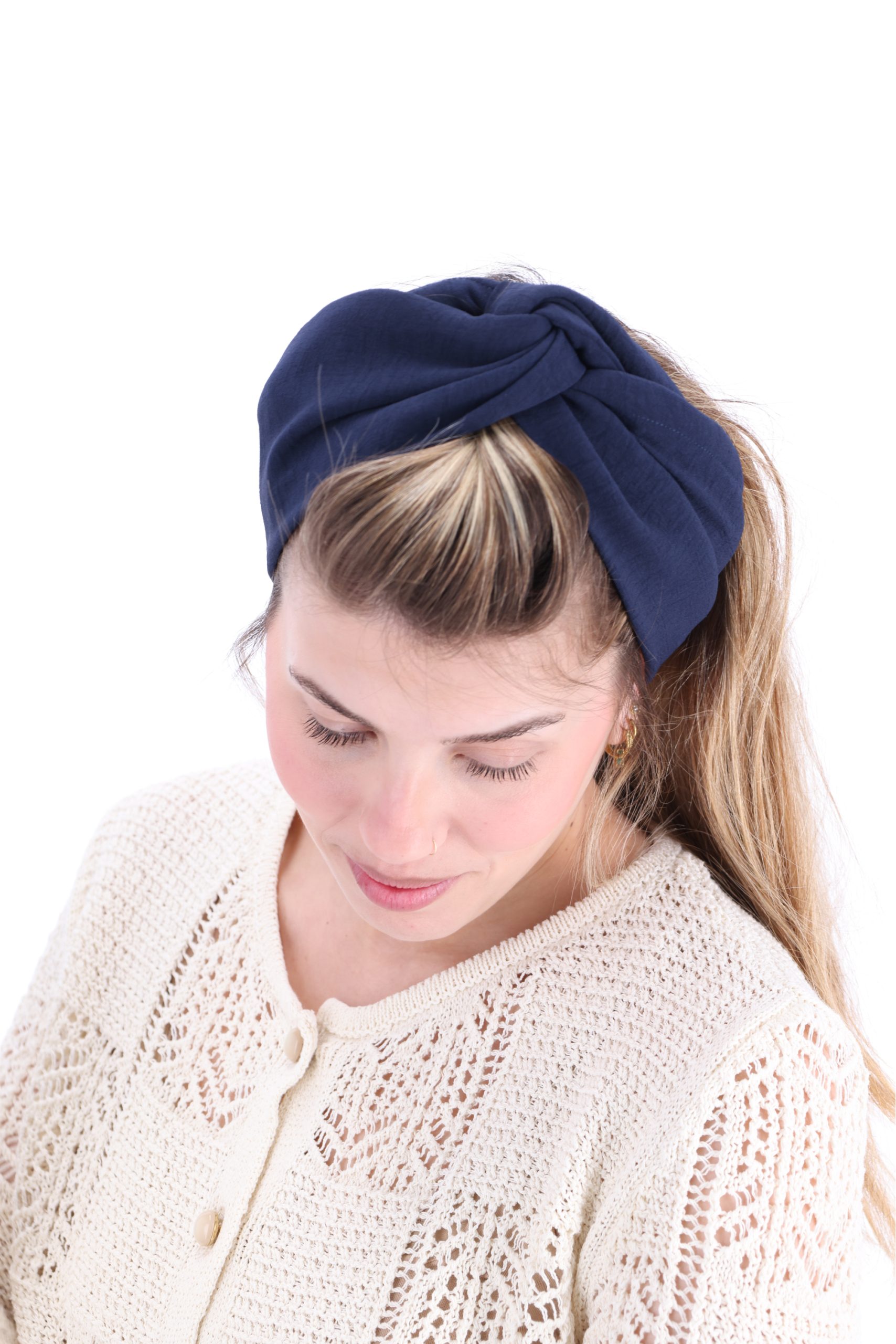 סרט לשיער עם חוט ברזל תפור בפנים ליצירת קשירות מגוונות ופשוטות, מבד כותנה איכותי בצבע כחול נייבי