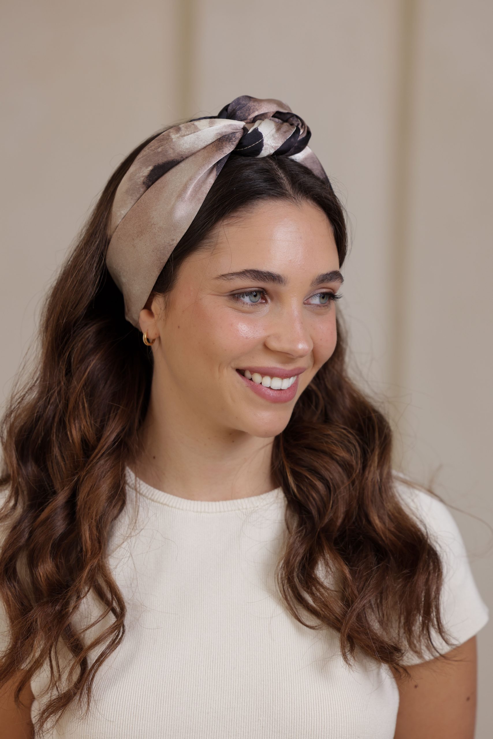 סרט לשיער עם חוט ברזל תפור בפנים ליצירת קשירות מגוונות ופשוטות, מבד סאטן עם הדפס בגוונים סגול וורוד לבן