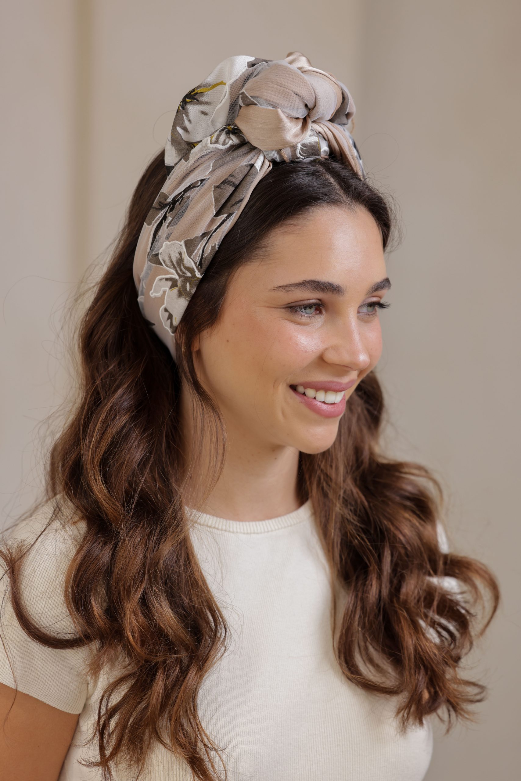 מטפחת לשיער עם חוט ברזל תפור בפנים ליצירת קשירות מגוונות ופשוטות, צד אחד מבד טול עדין עם הדפס פרחוני בגווני אבן, חום, בז׳ ועד ומהצד השני בד שיפון מעורב סאטן בגוון חום.