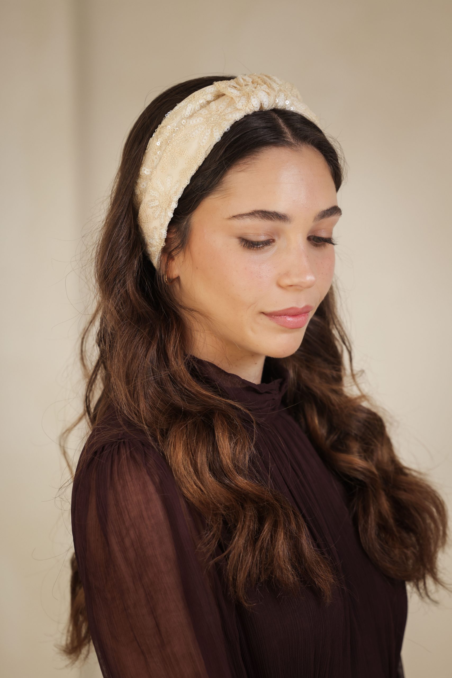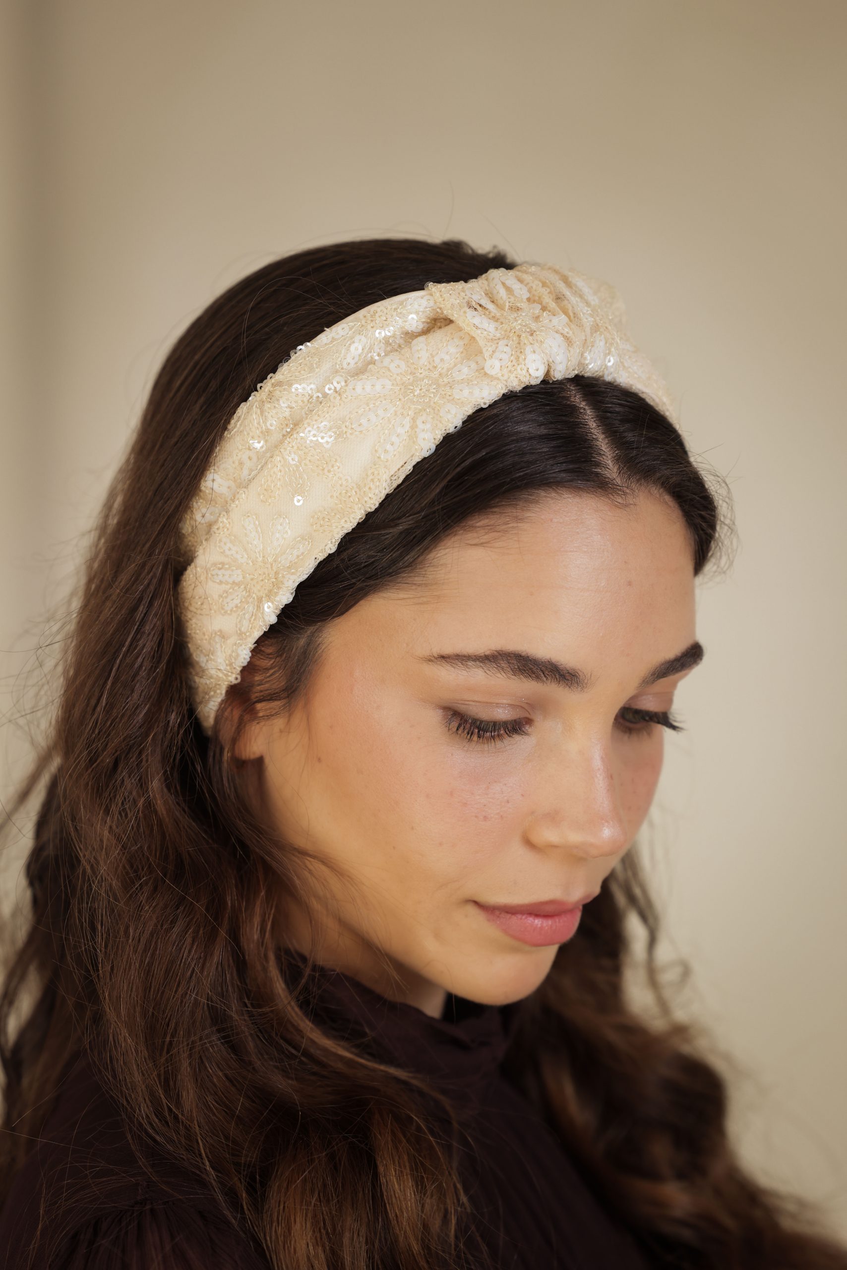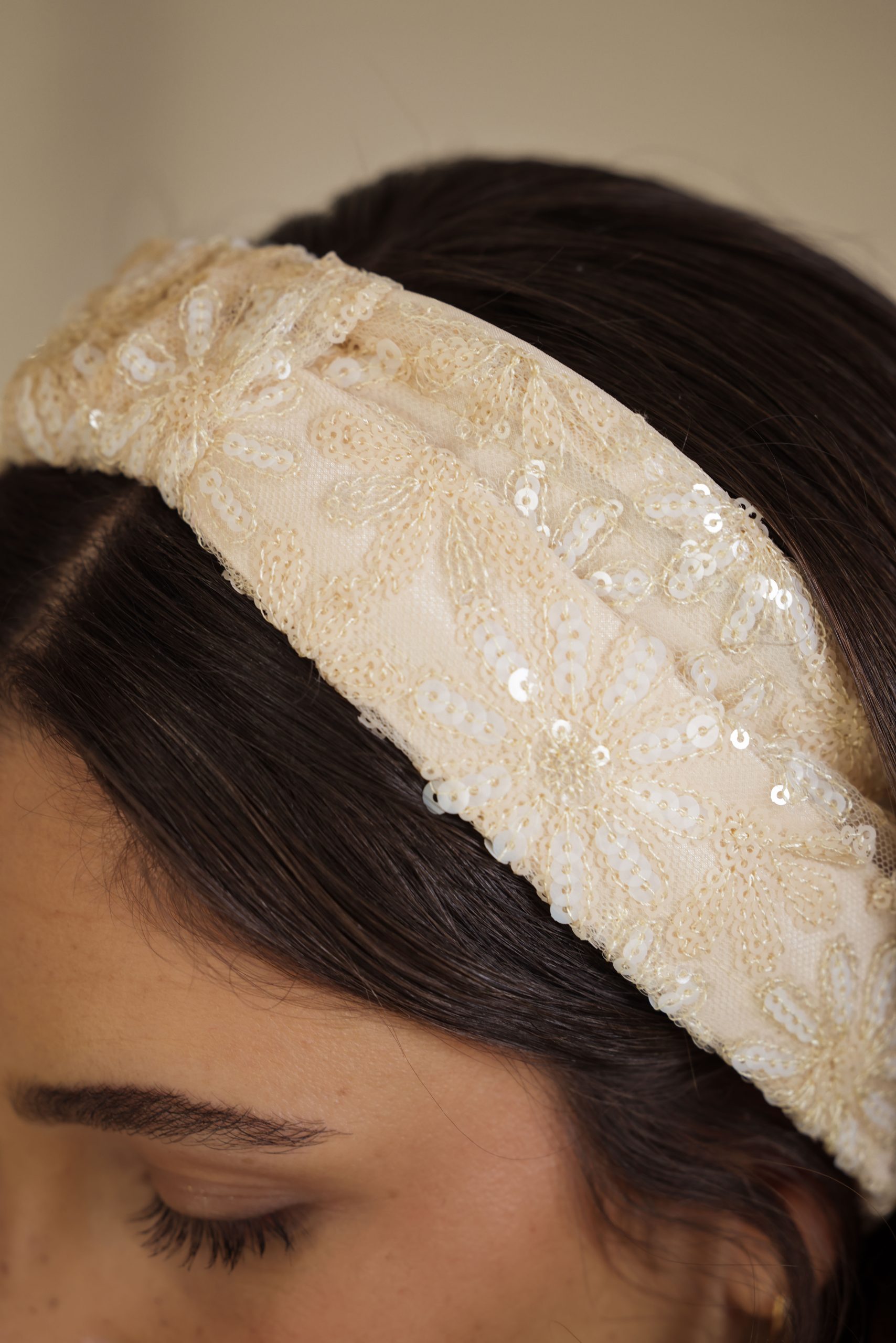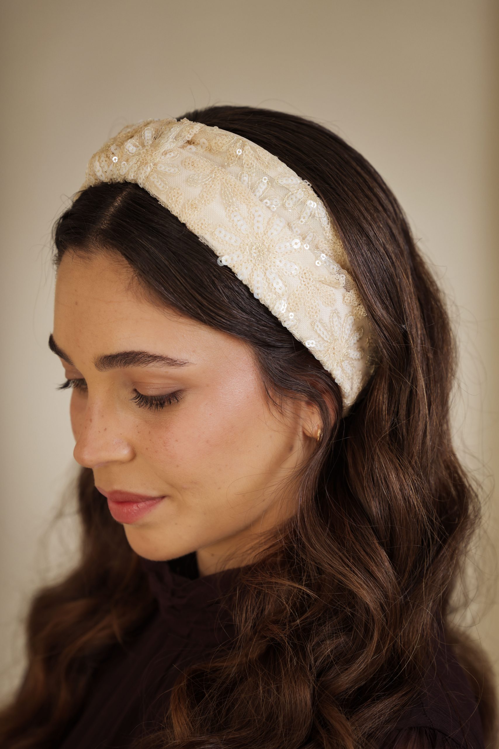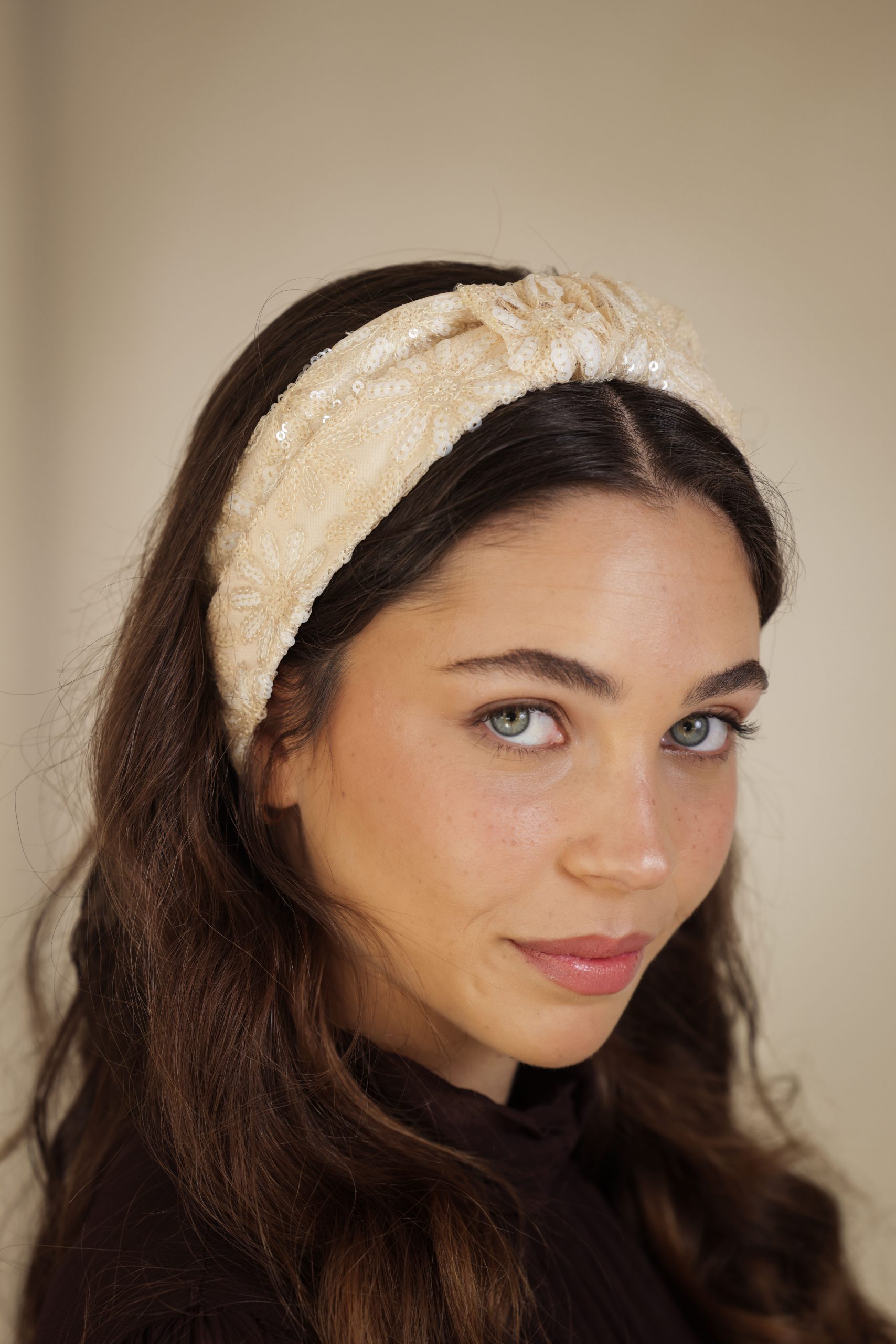 סרט לשיער עם חוט ברזל תפור בפנים עם שתי חוטי גומי בקצה לקשירה קלה, בד טול שמנת ברקמת פייטים חגיגית בטקסטורת פרחים בגווני שמנת