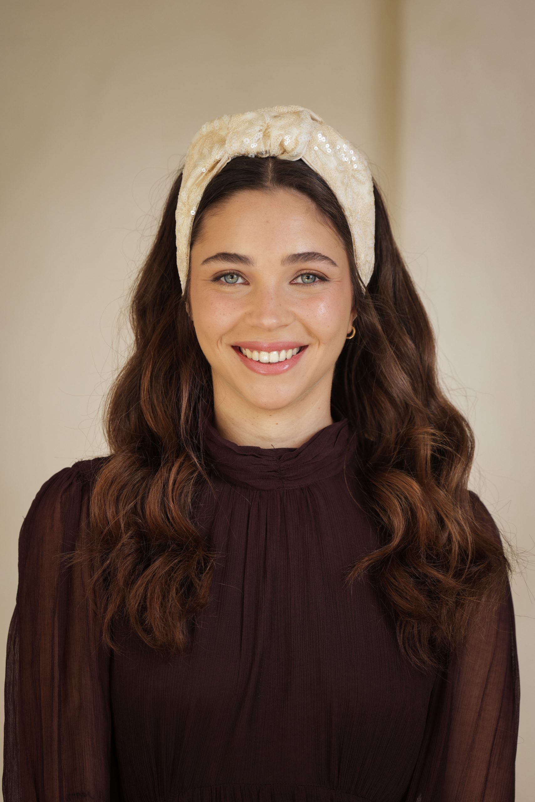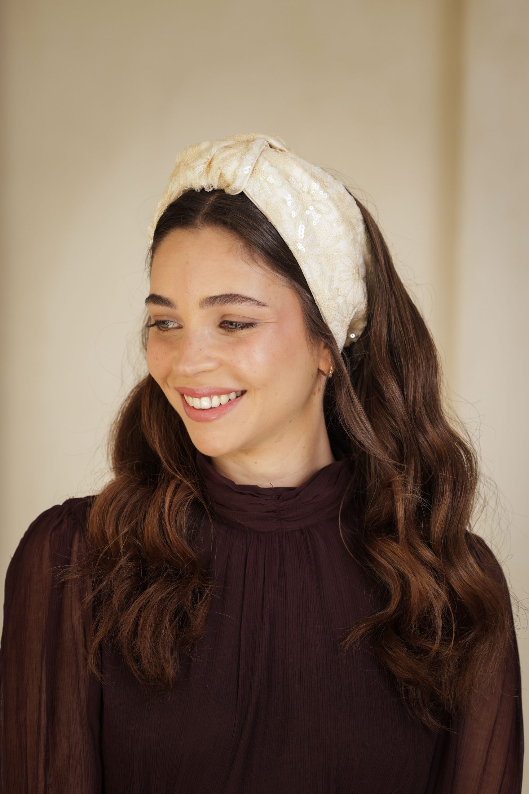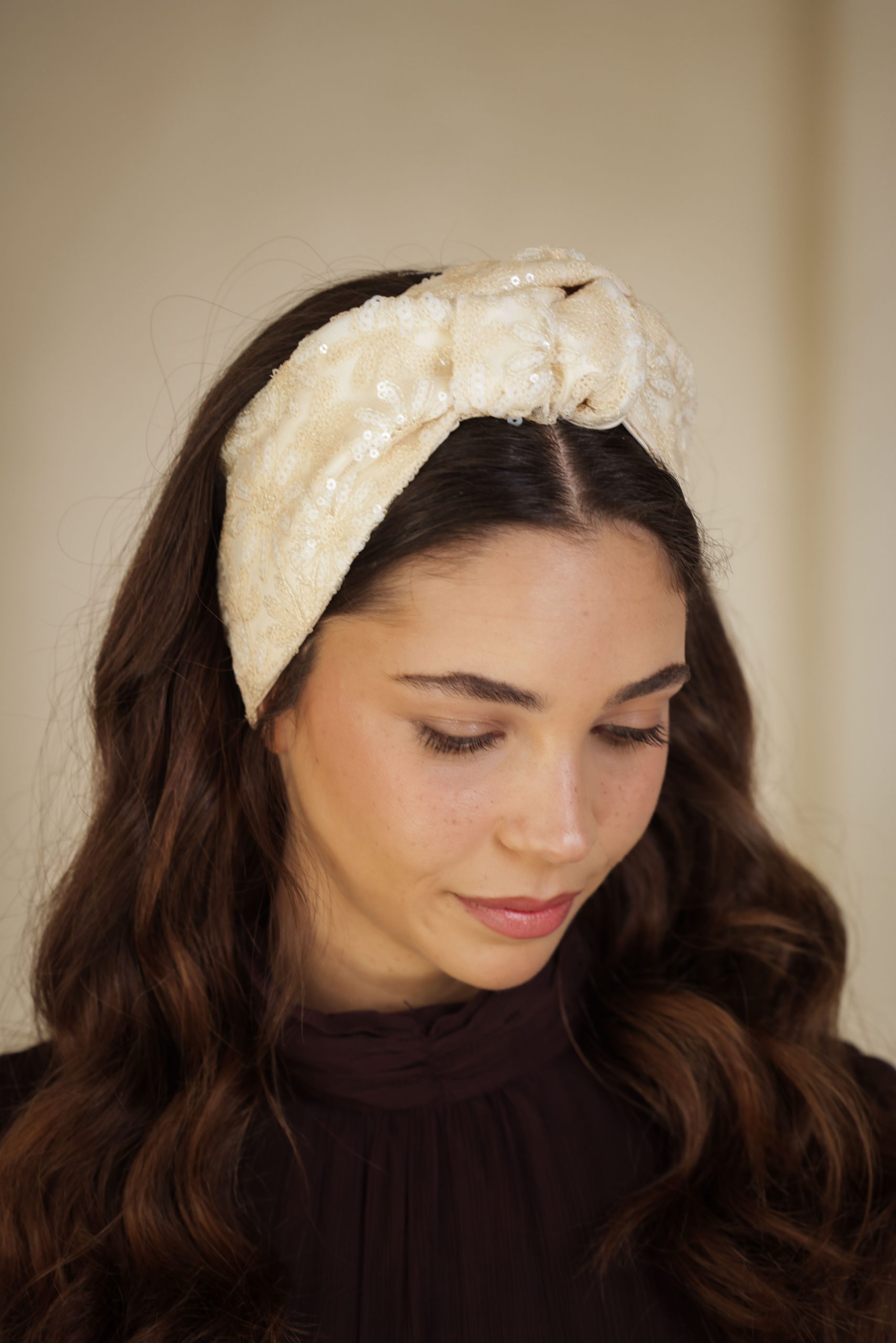 סרט לשיער עם חוט ברזל תפור בפנים ליצירת קשירות מגוונות ופשוטות, בד טול שמנת ברקמת פייטים חגיגית בטקסטורת פרחים בגווני שמנת
