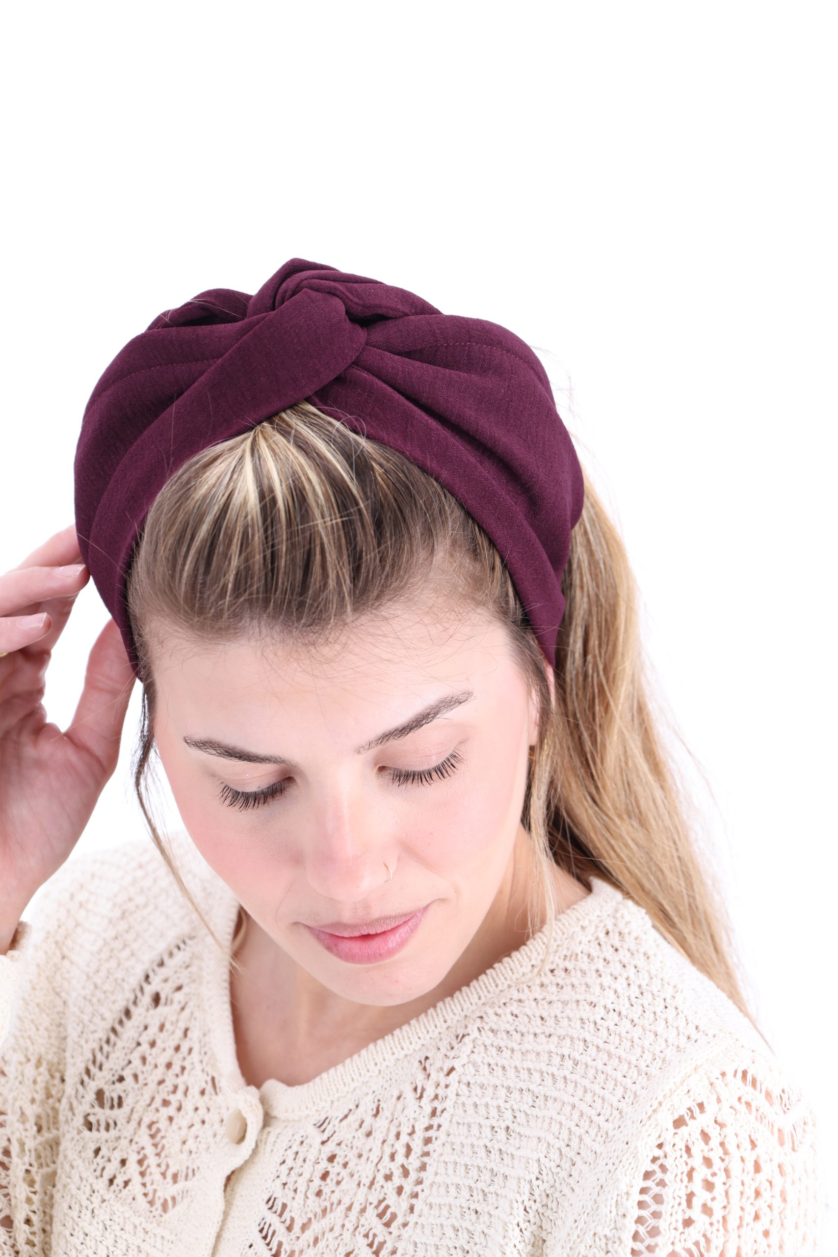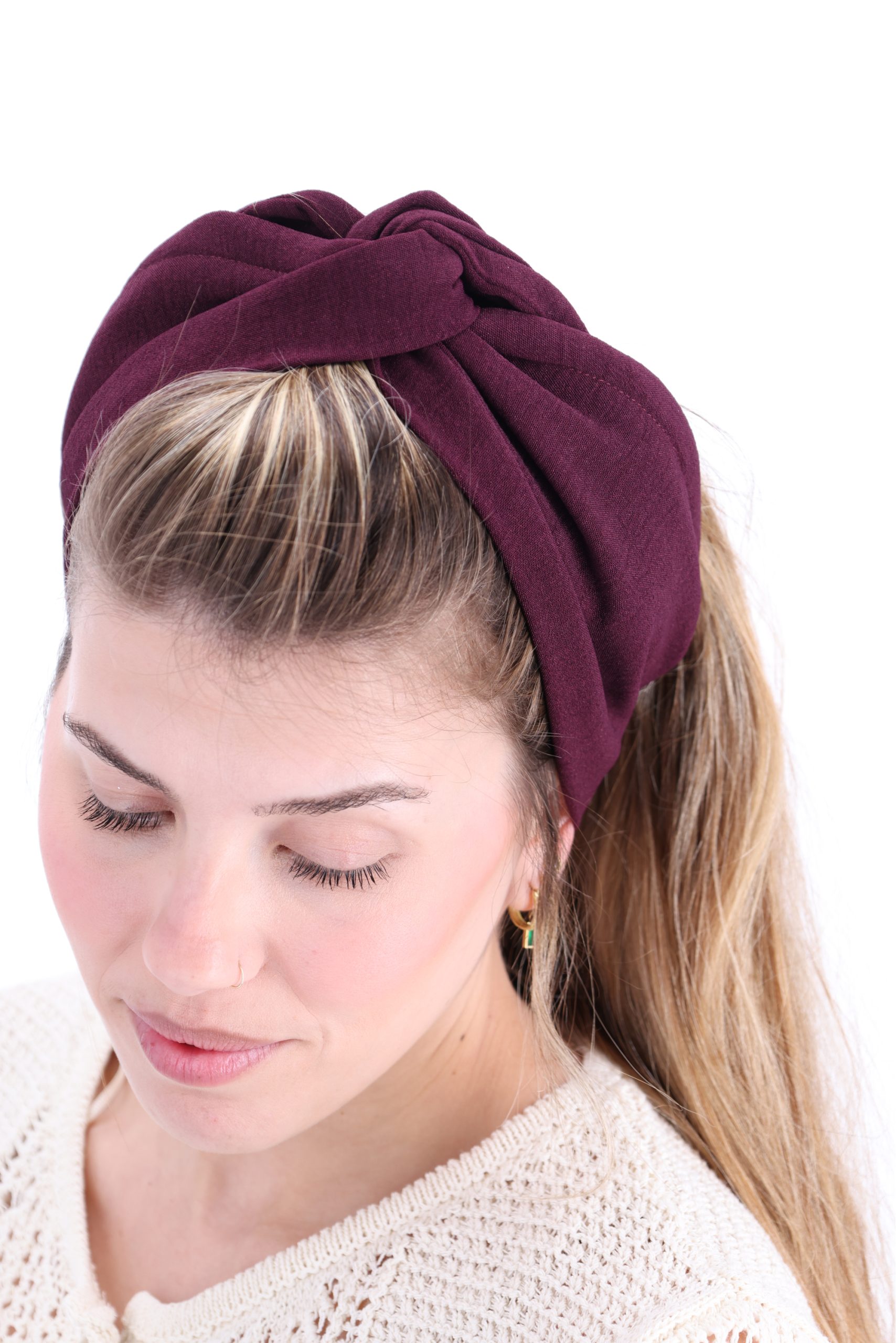 סרט לשיער עם חוט ברזל תפור בפנים ליצירת קשירות מגוונות ופשוטות, מבד כותנה איכותי בצבע סגול בורדו