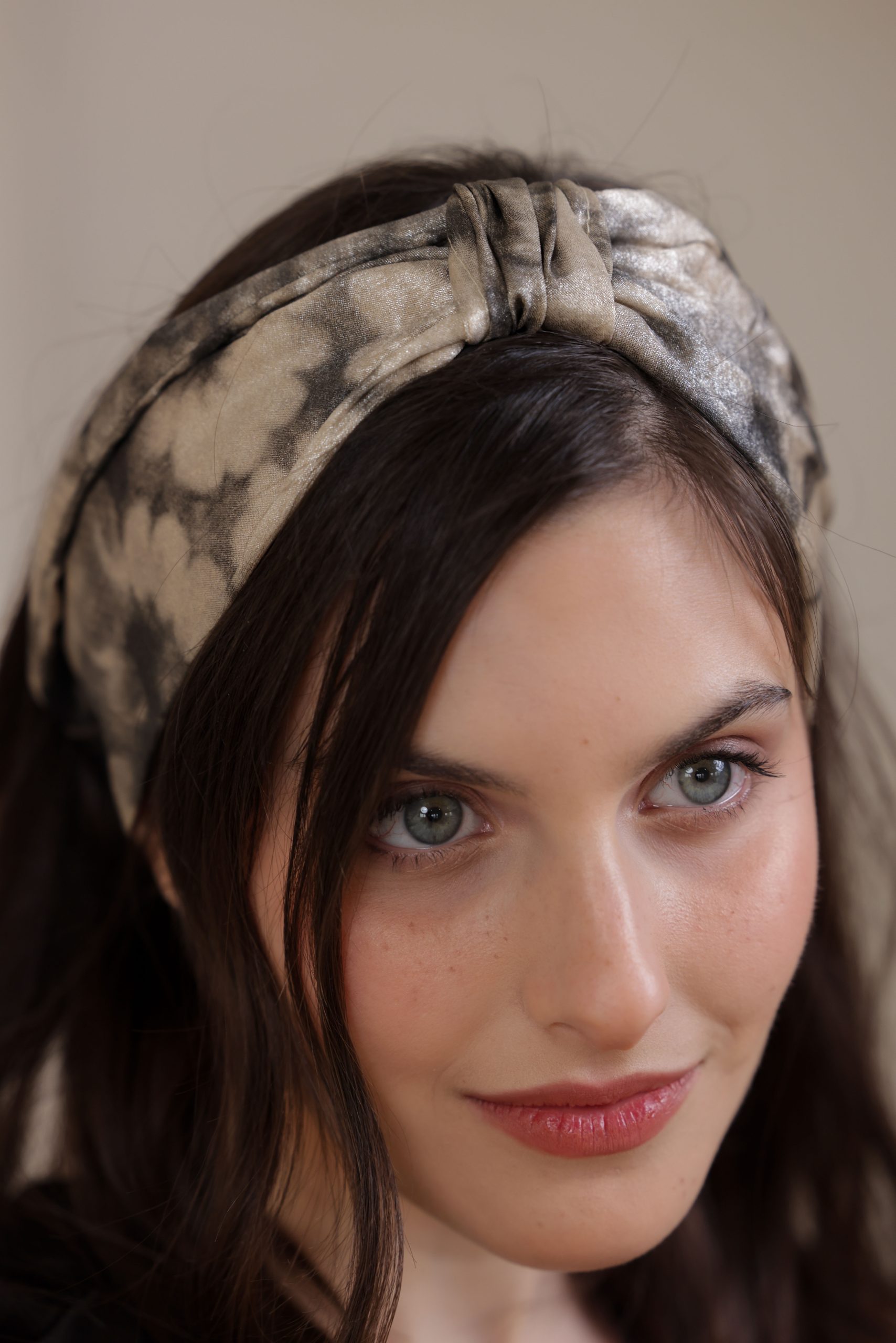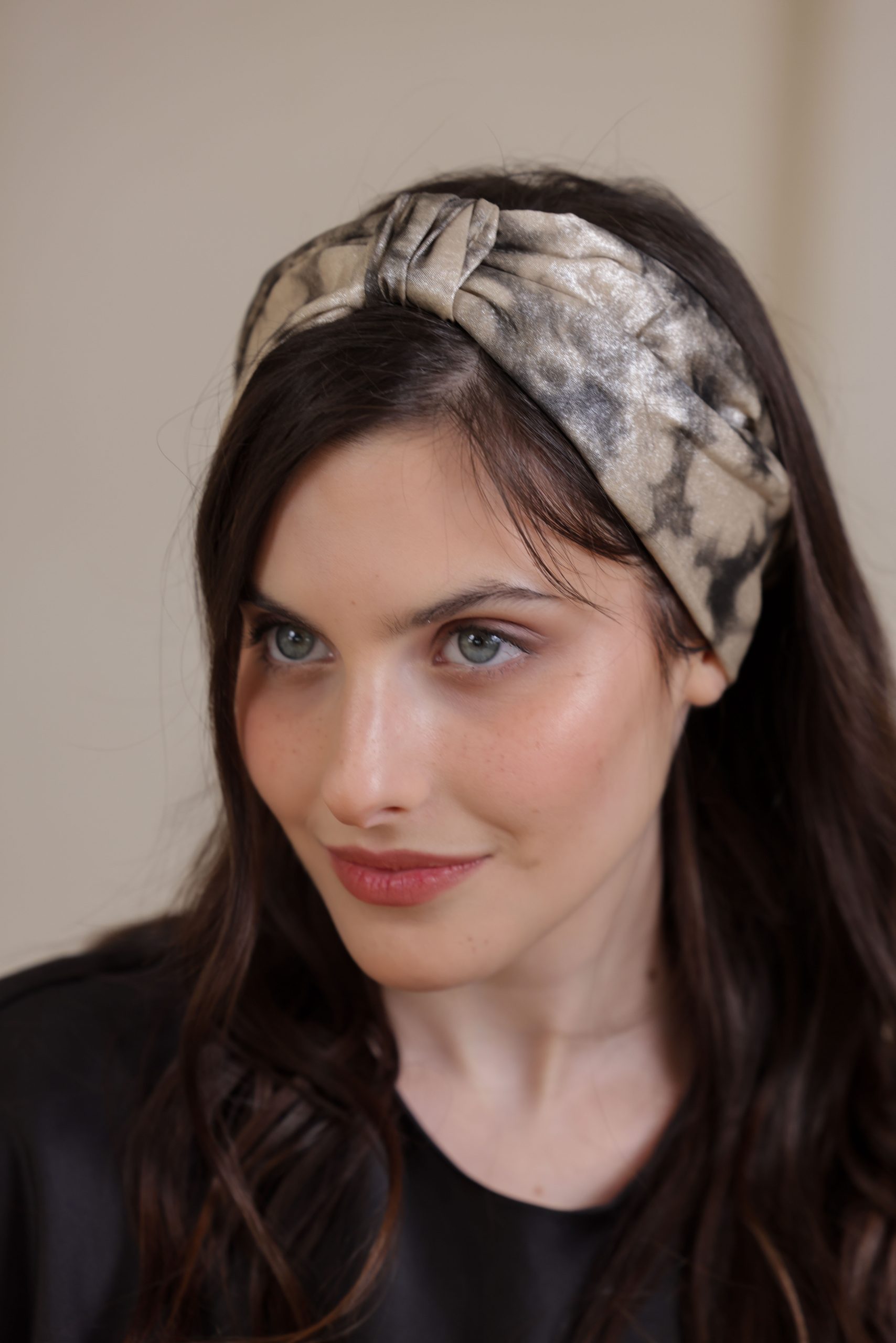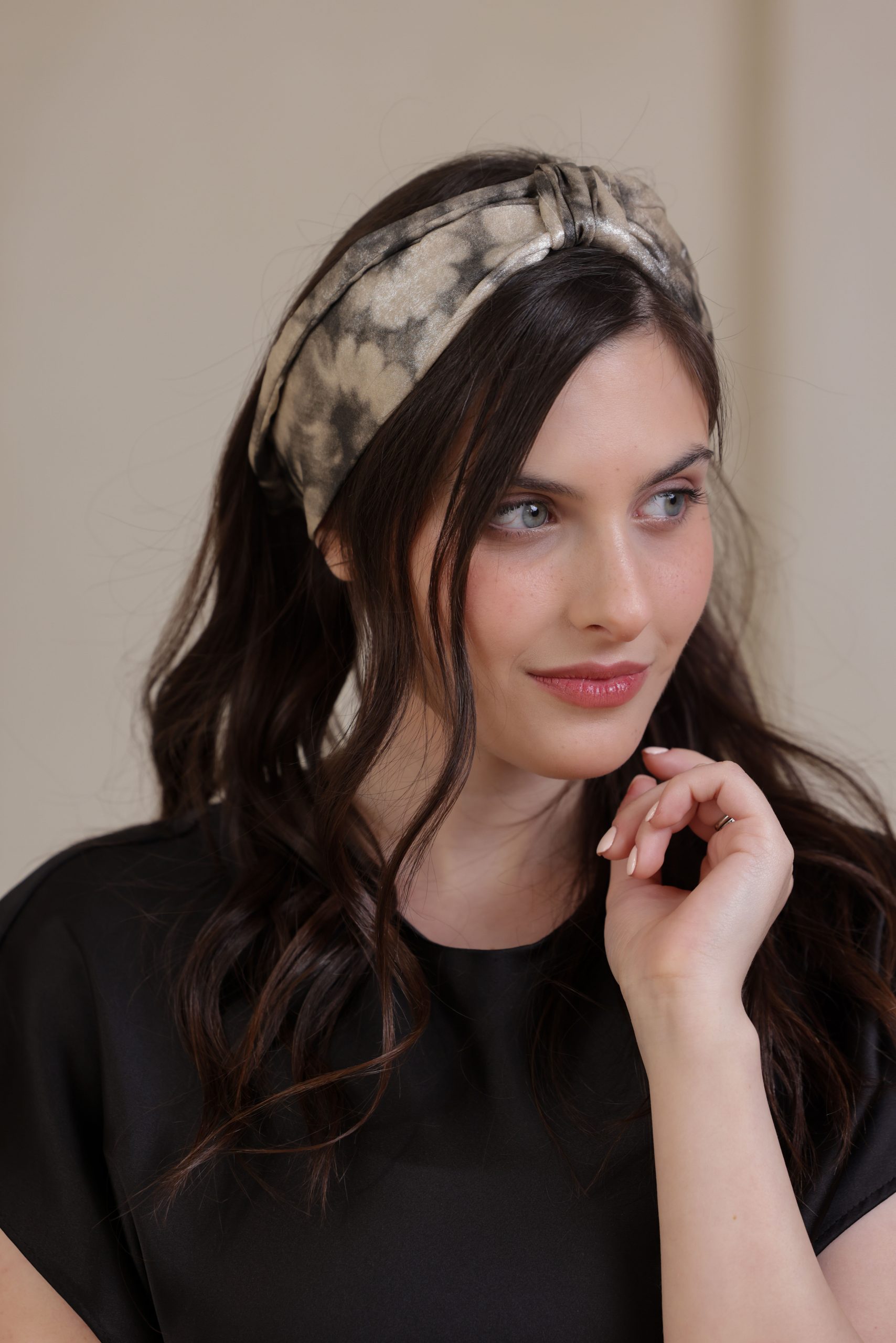 סרט לשיער עם חוט ברזל תפור בפנים עם שתי חוטי גומי בקצה לקשירה קלה, בהדפס פרחוני בגווני כסף וזהב עדינים