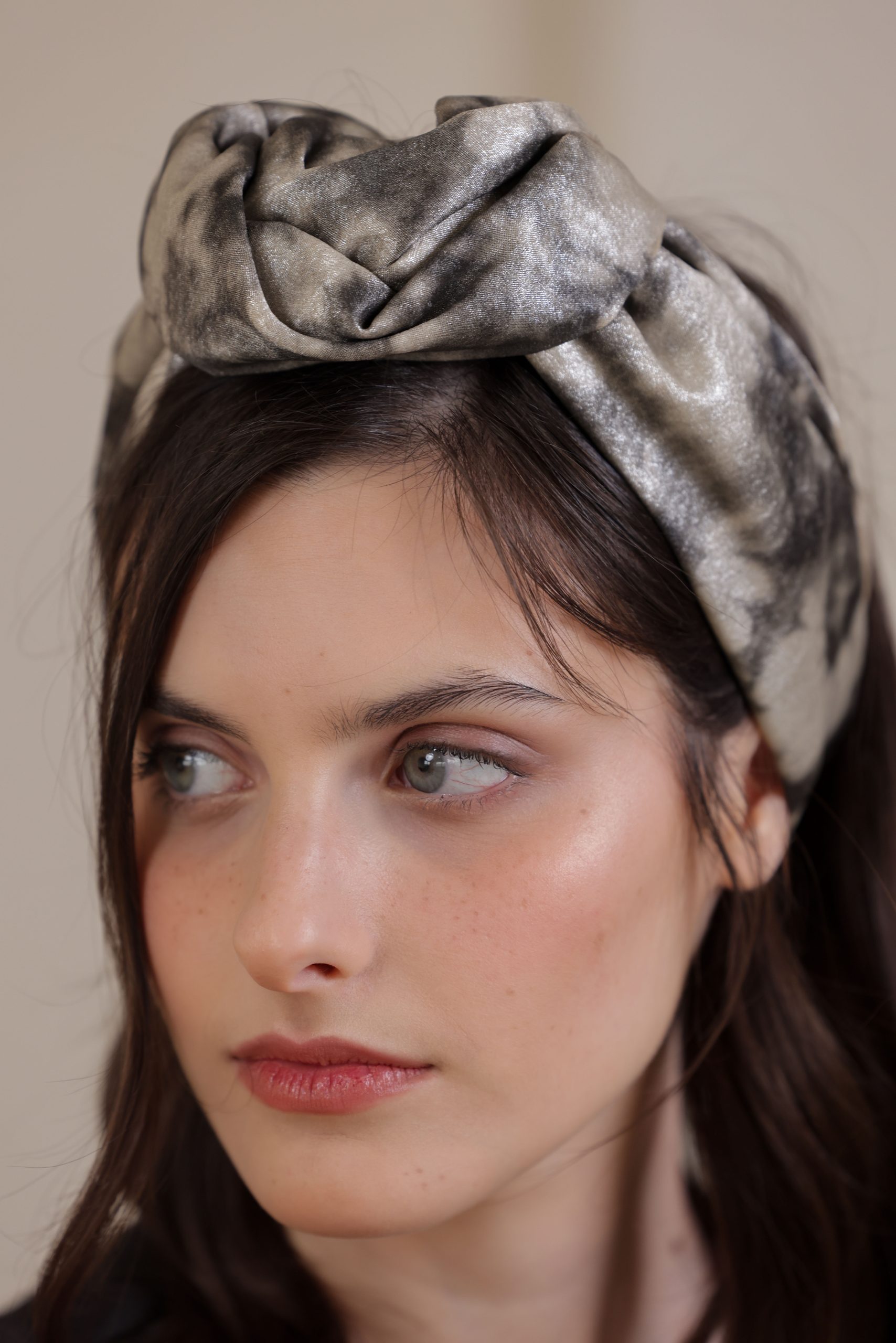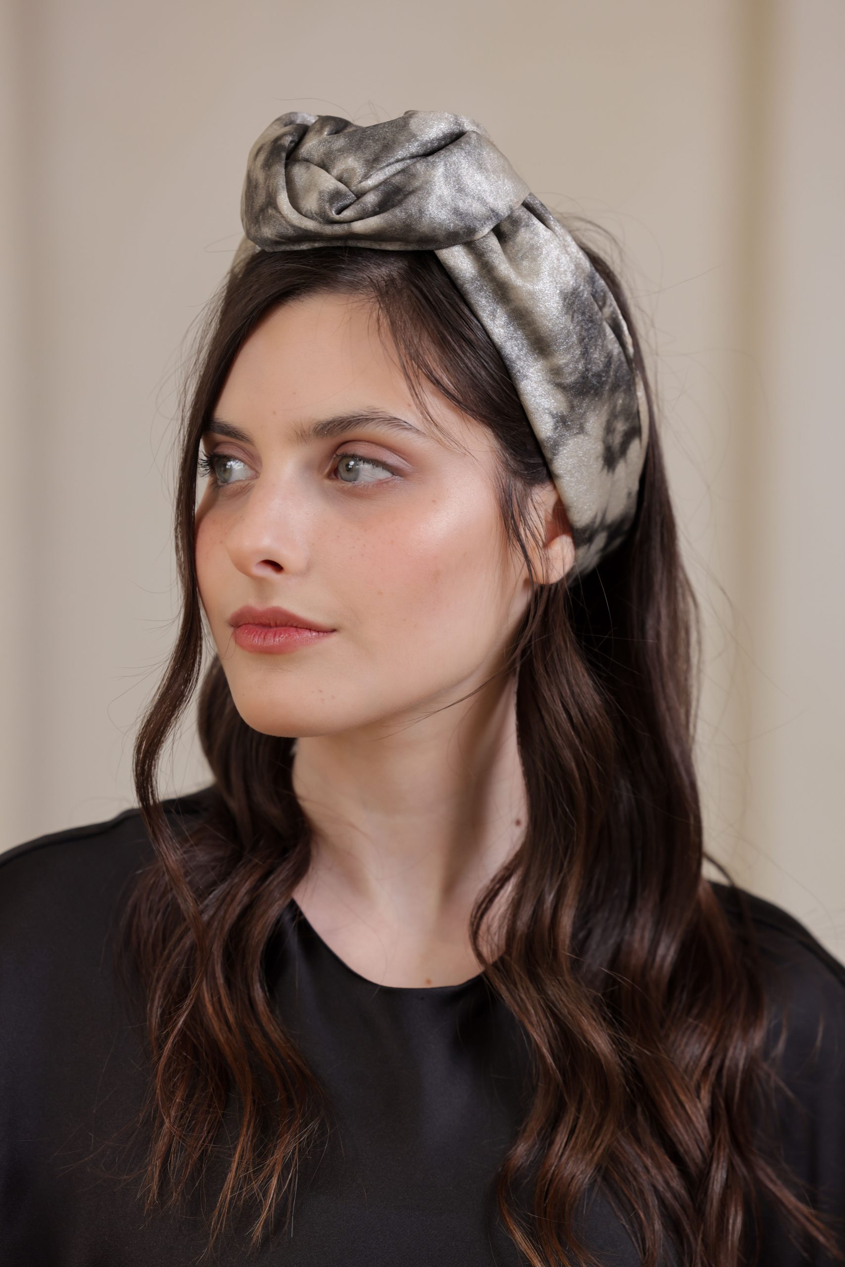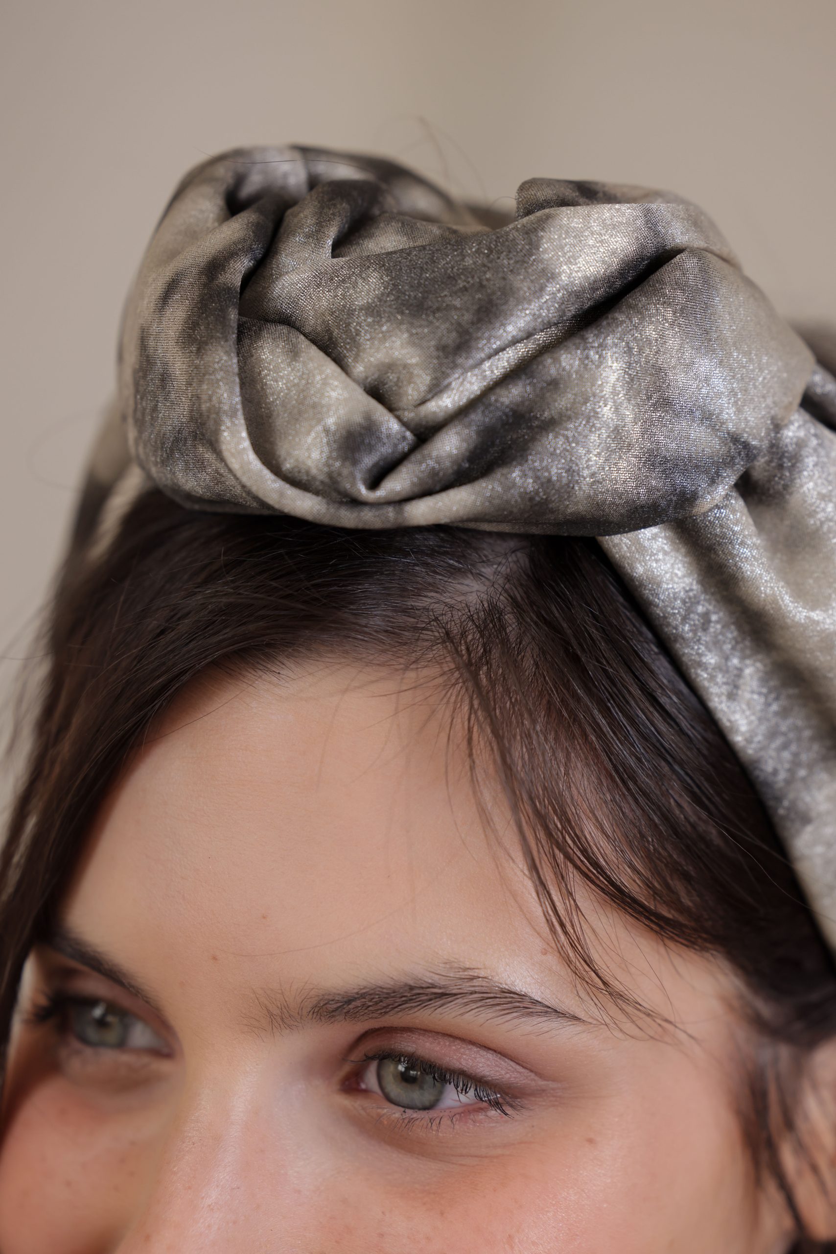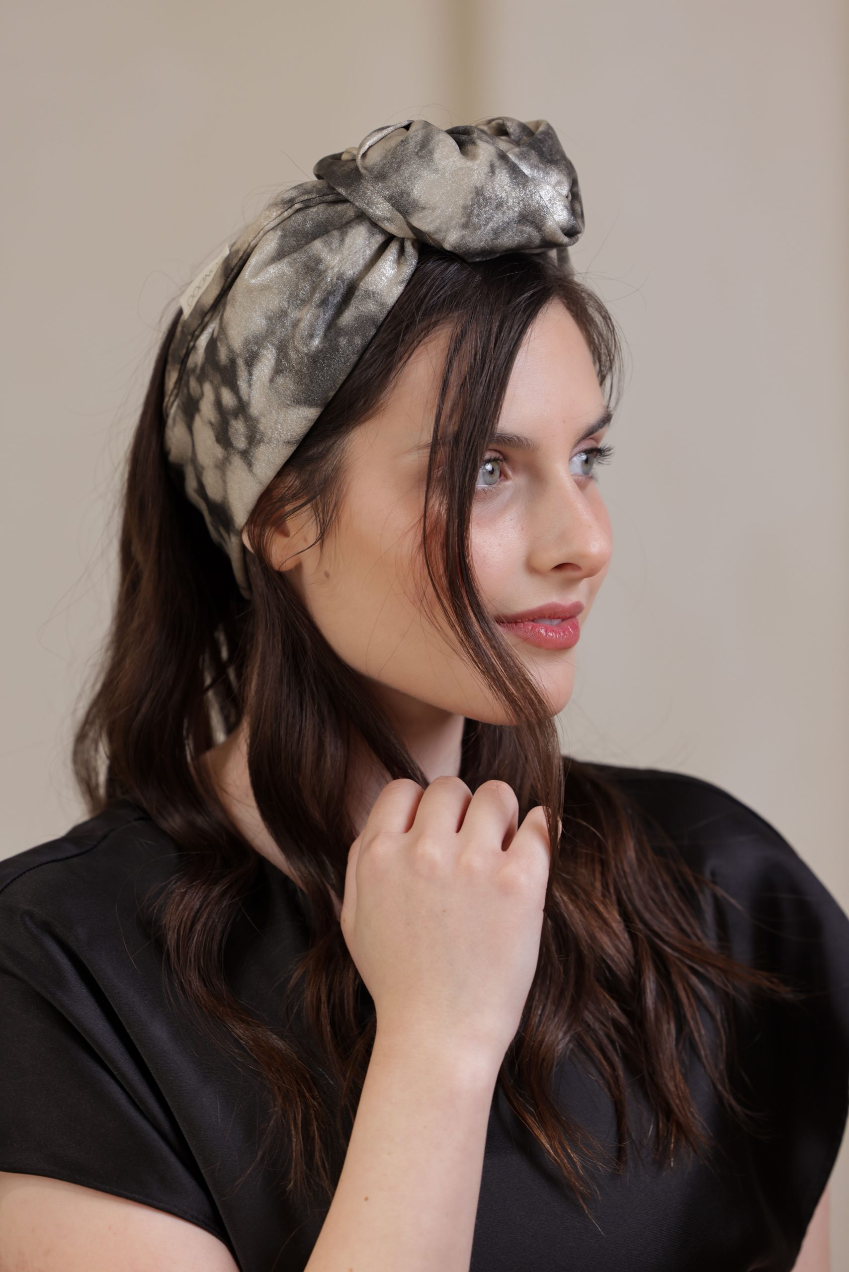 סרט לשיער עם חוט ברזל תפור בפנים ליצירת קשירות מגוונות ופשוטות, בהדפס פרחוני בגווני כסף וזהב עדינים
